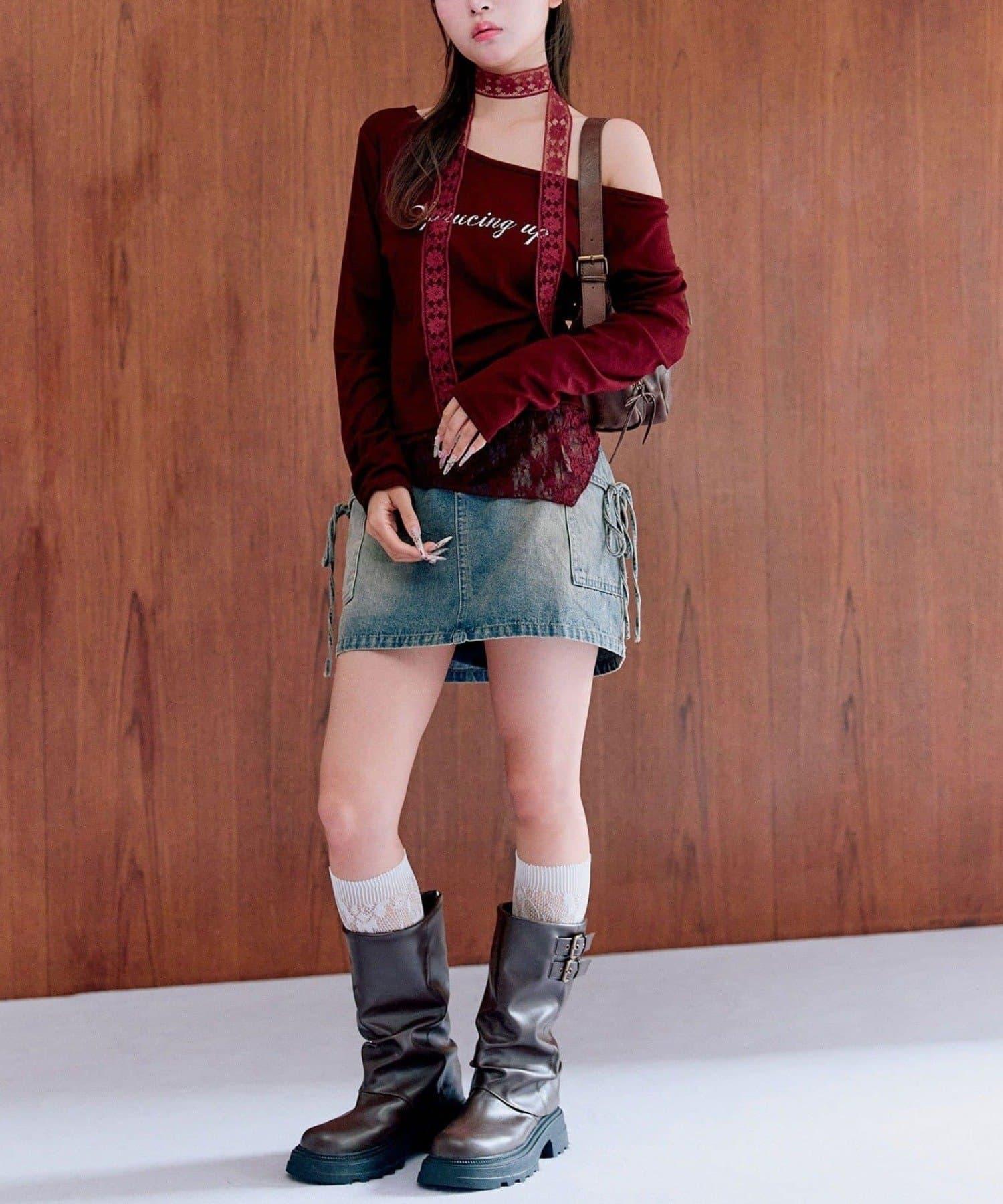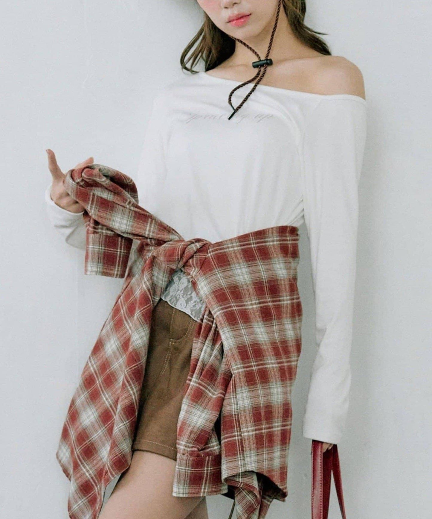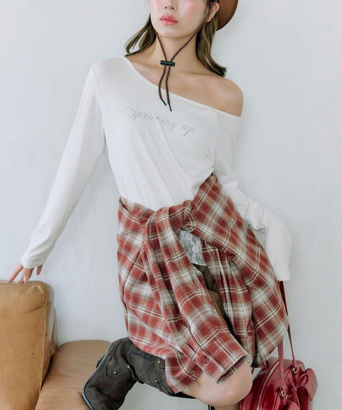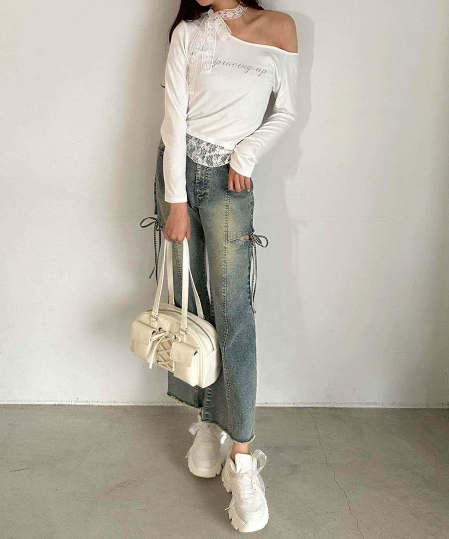 蕾絲繫帶可自由擺放!單肩上衣,露出肌膚,打造氣質!