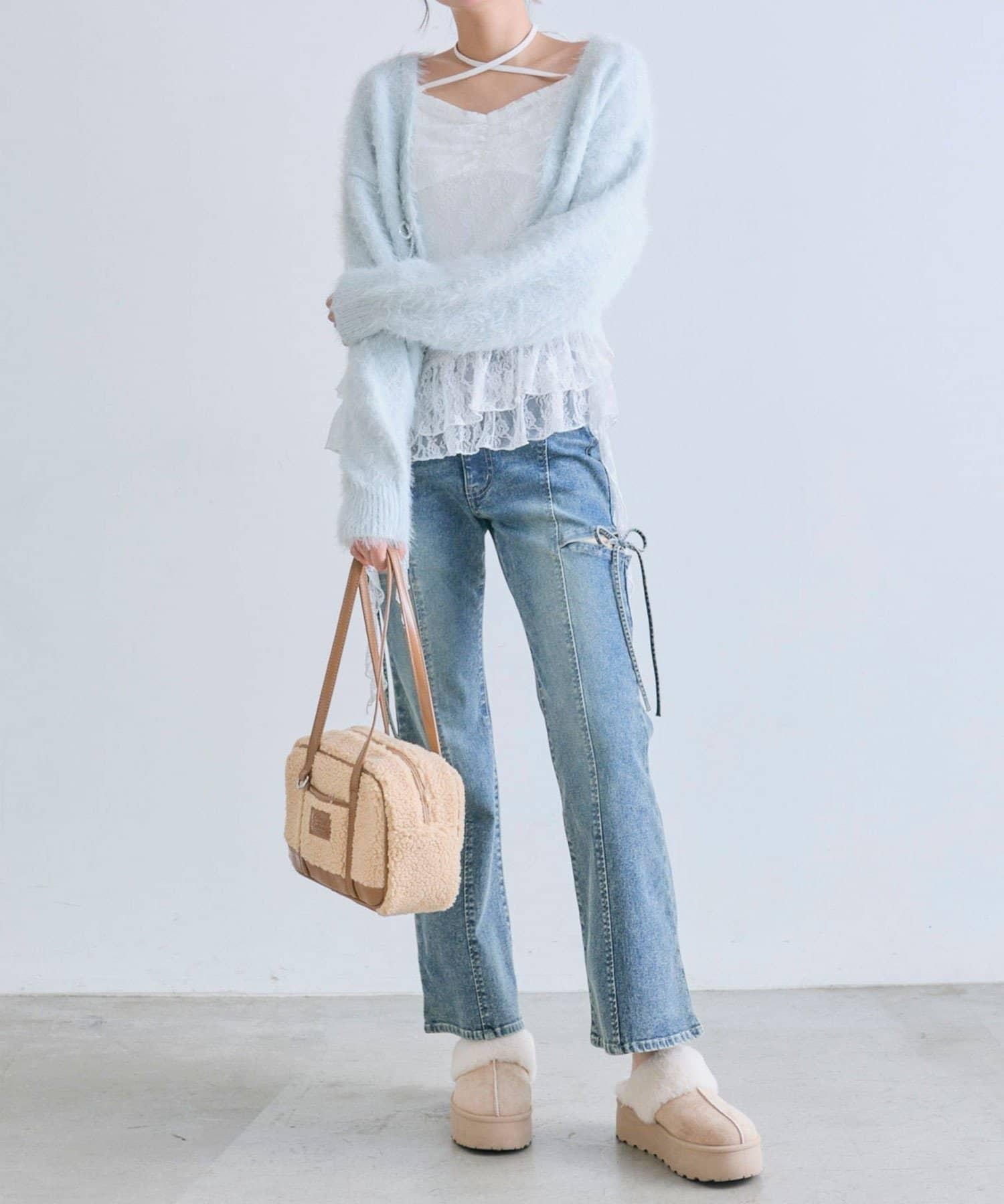 搭配喇叭牛仔褲,打造簡潔休閒的造型。