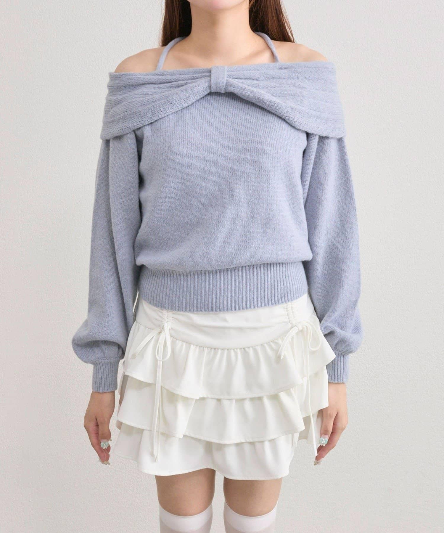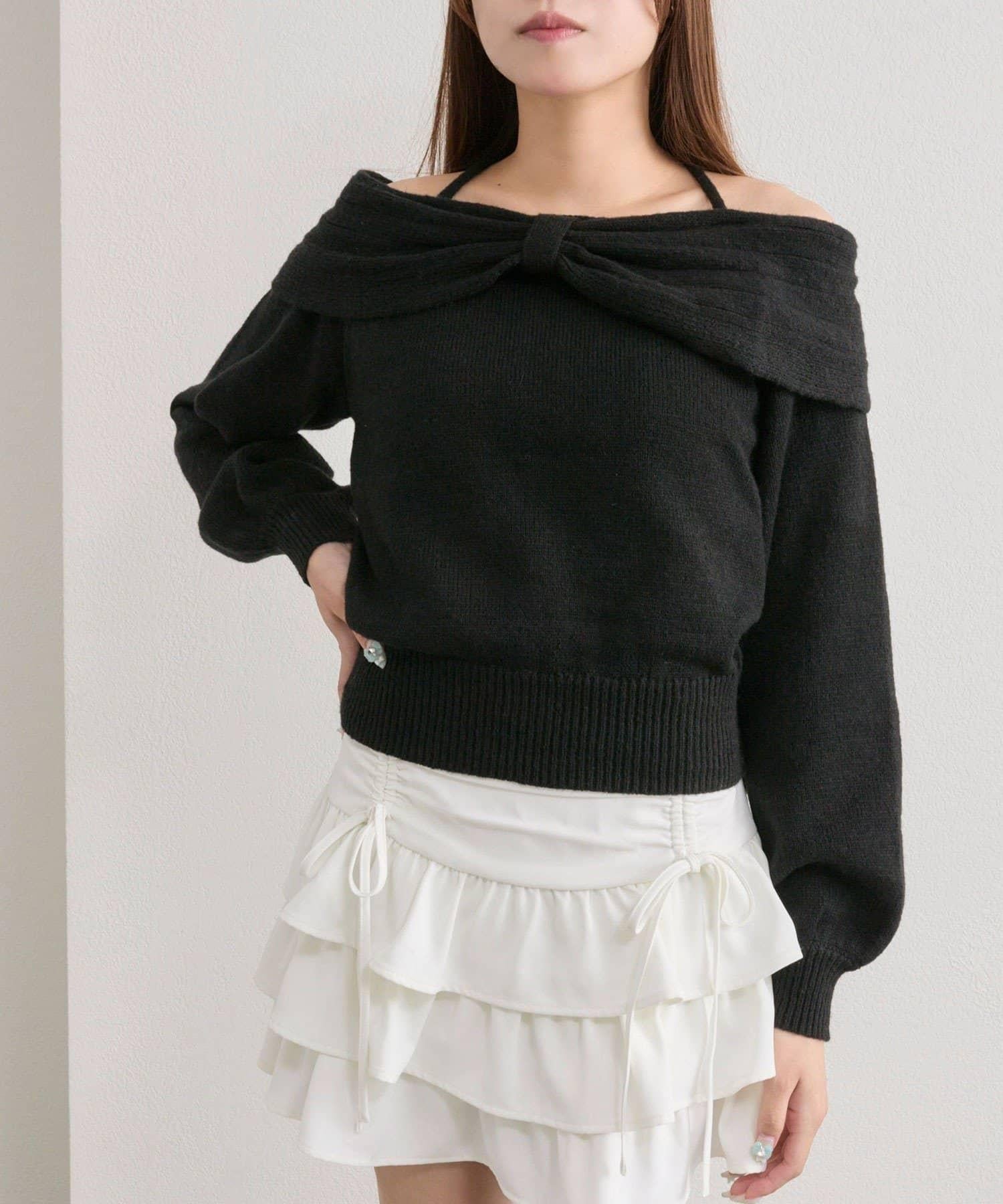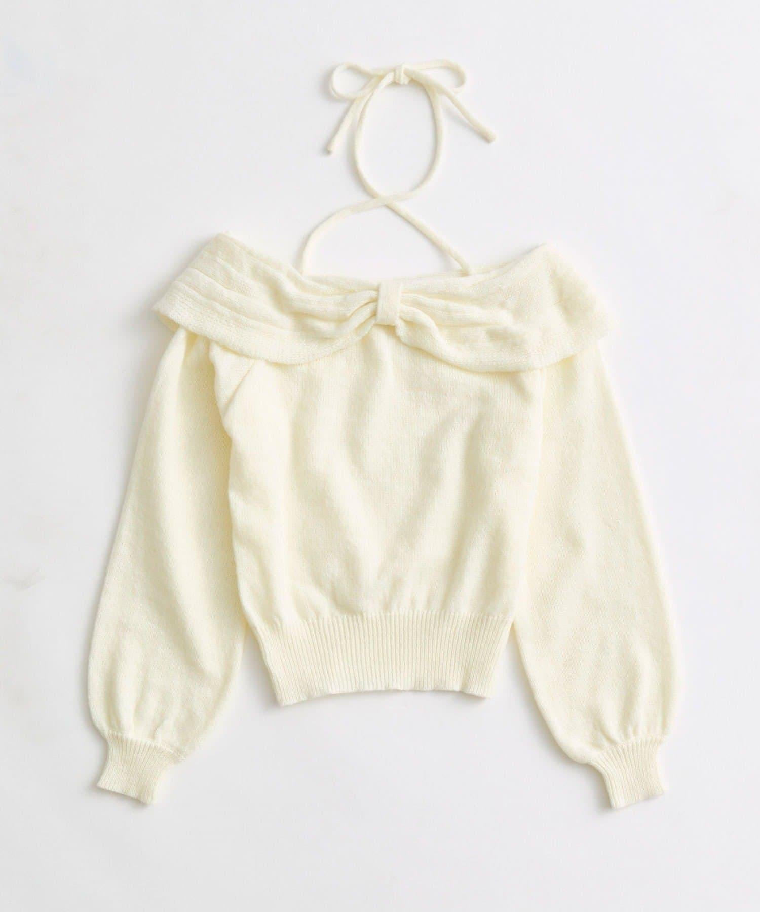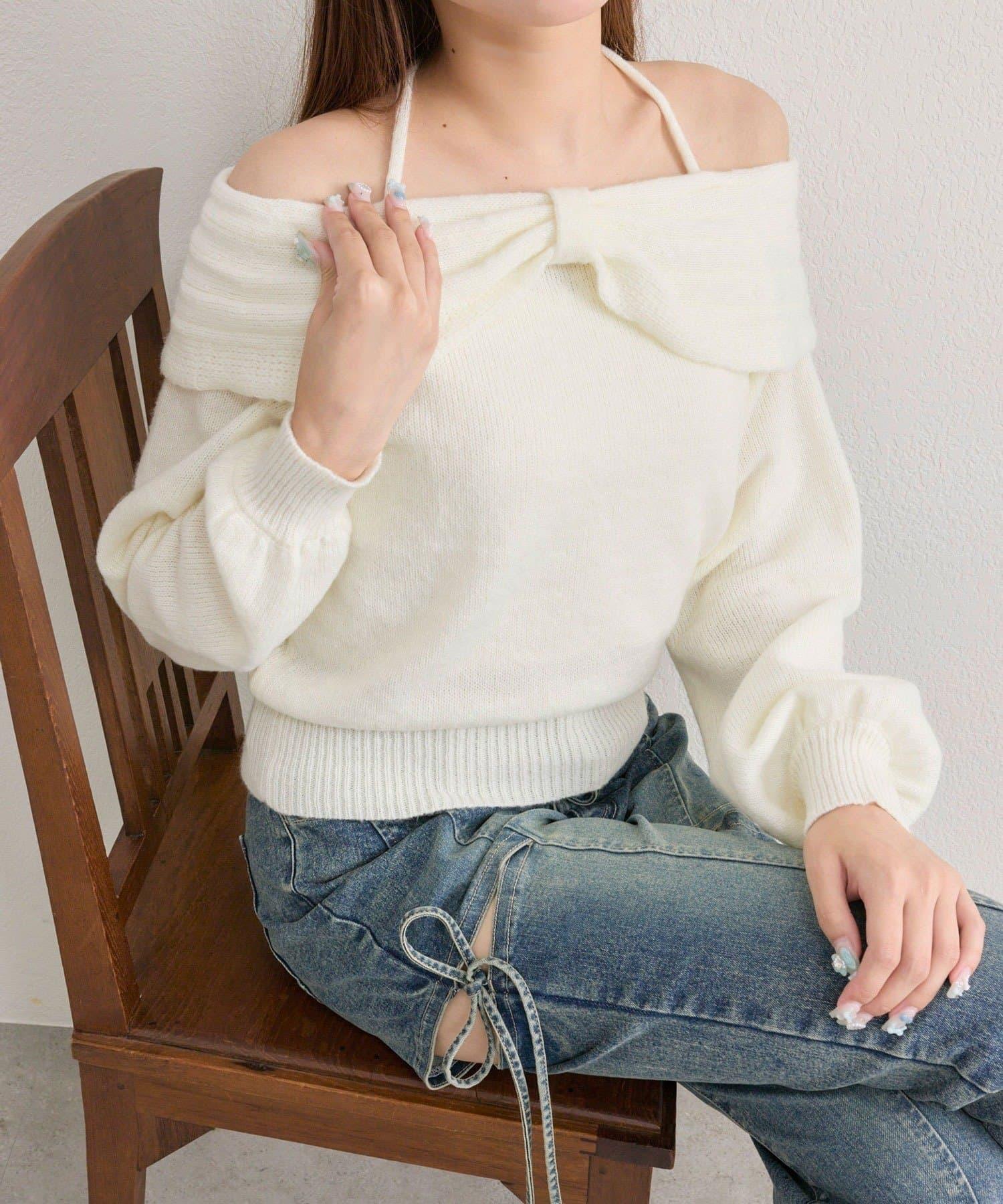 這款針織衫採用露肩設計,展現出美麗的肩部線條,胸前的絲帶設計給人可愛成熟的印象。