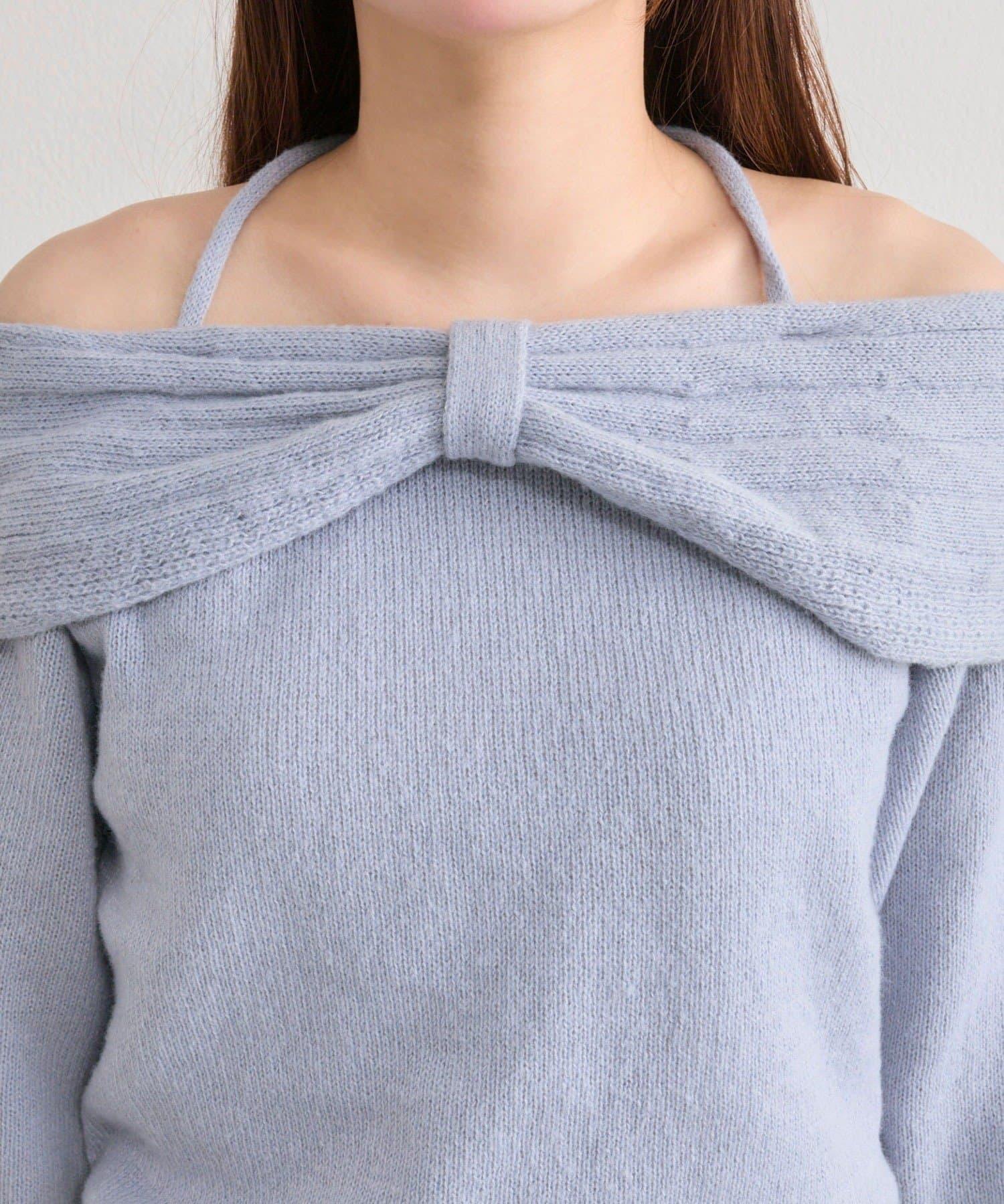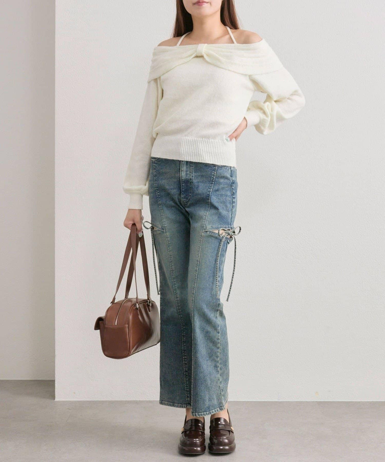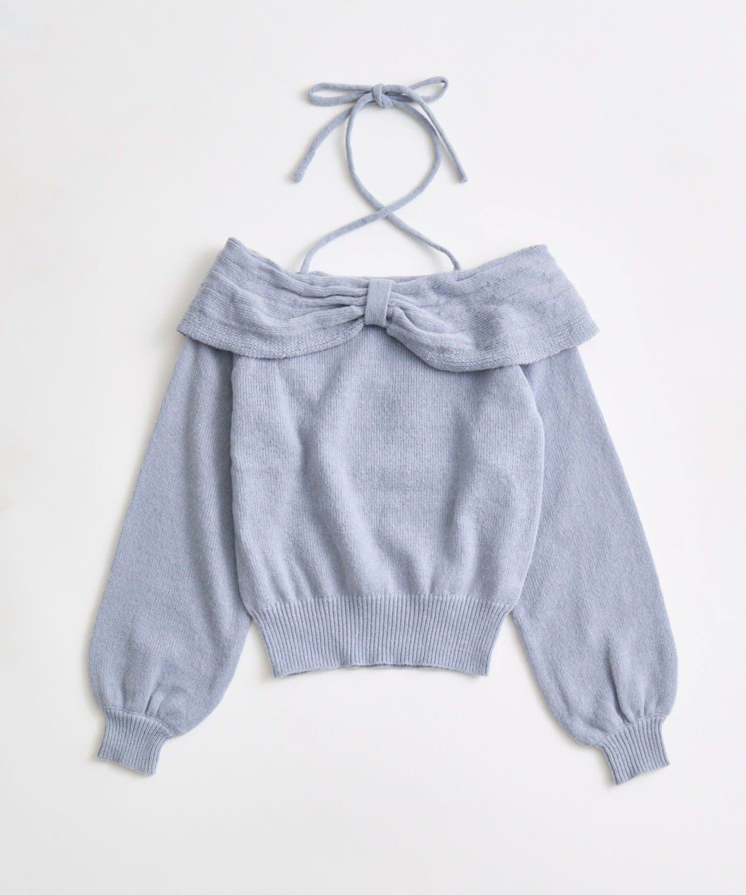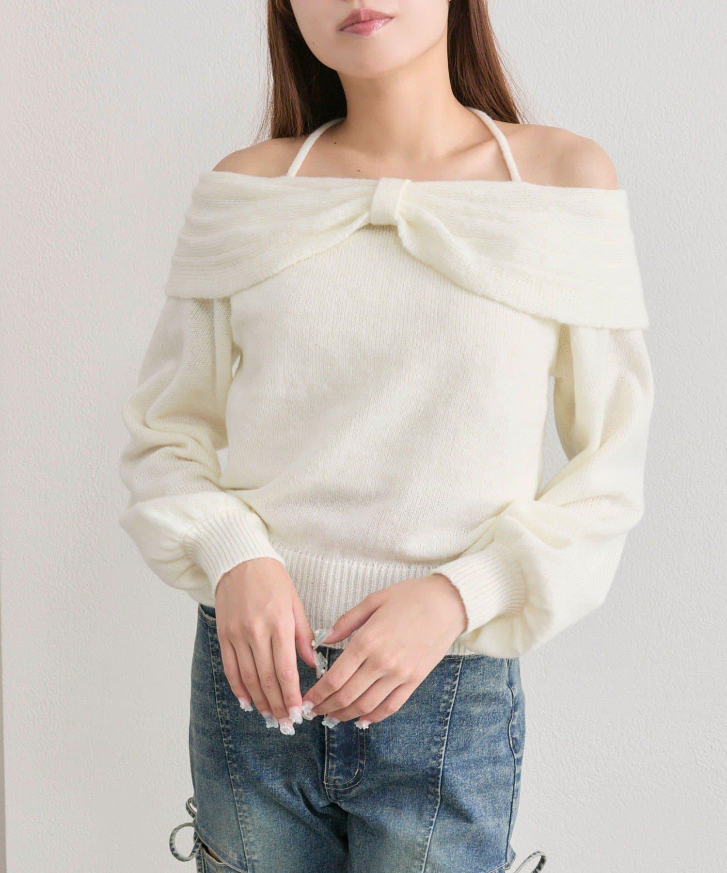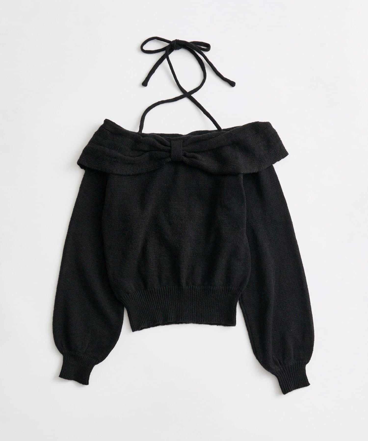 這款針織衫採用露肩設計,展現出美麗的肩部線條,胸前的絲帶設計給人可愛成熟的印象。