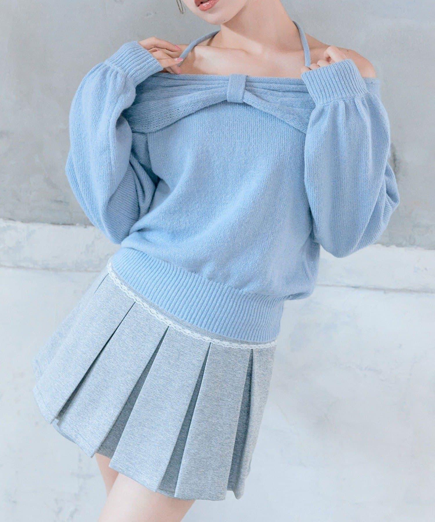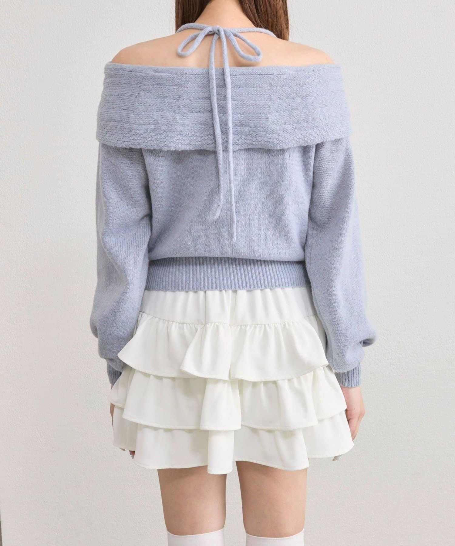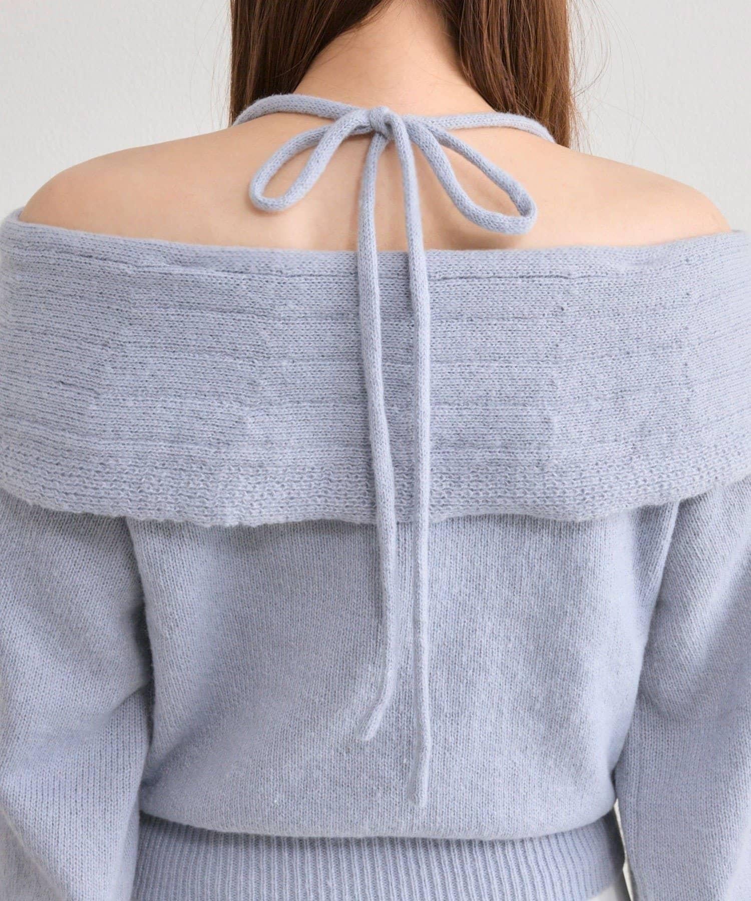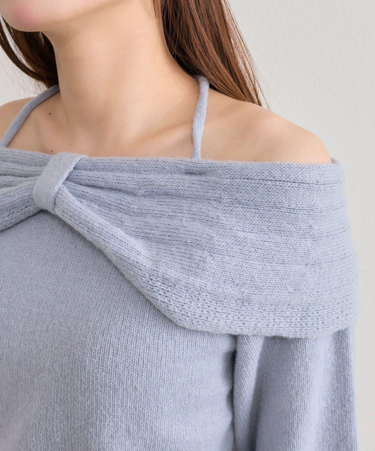 這款針織衫採用露肩設計,展現出美麗的肩部線條,胸前的絲帶設計給人可愛成熟的印象。