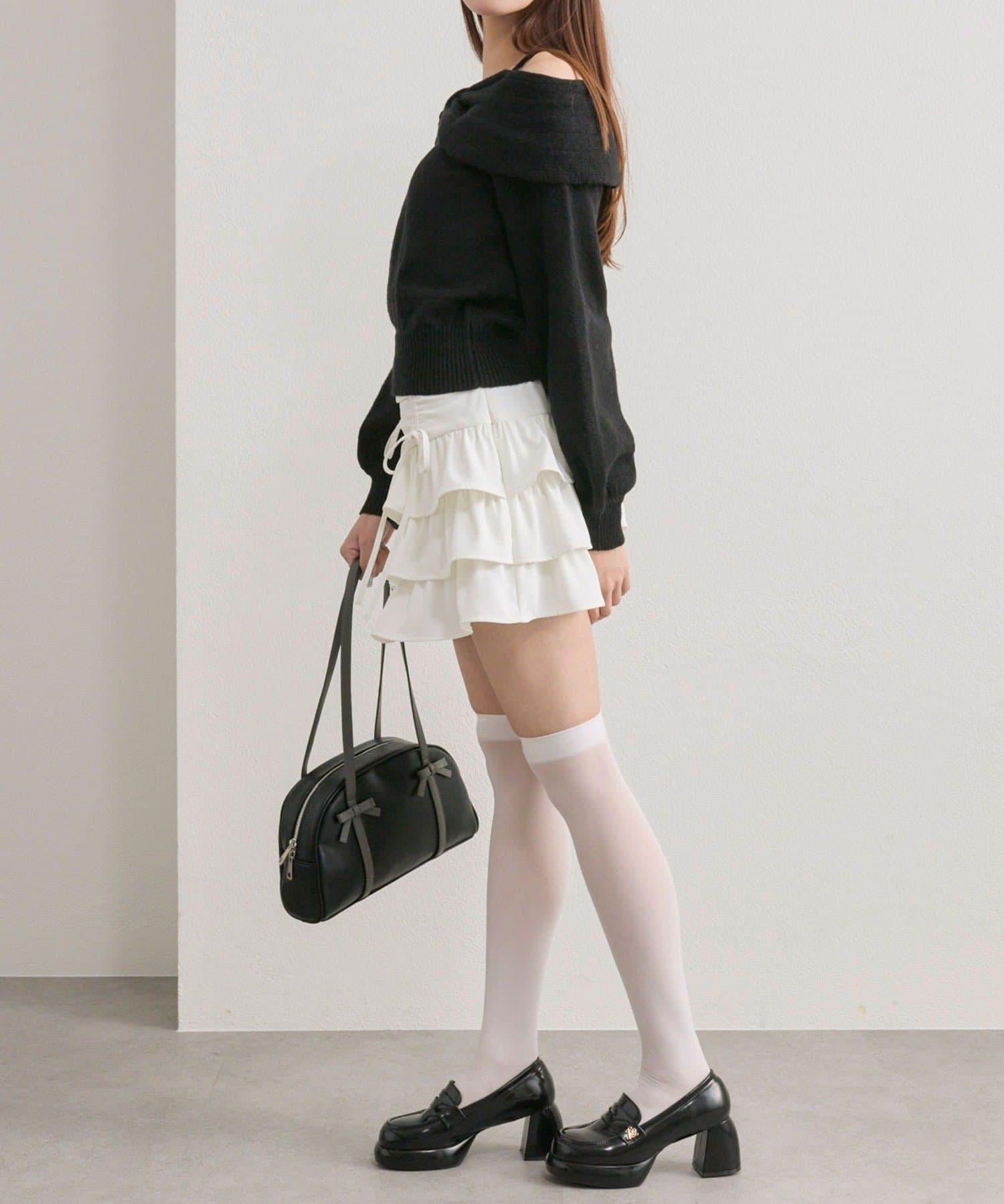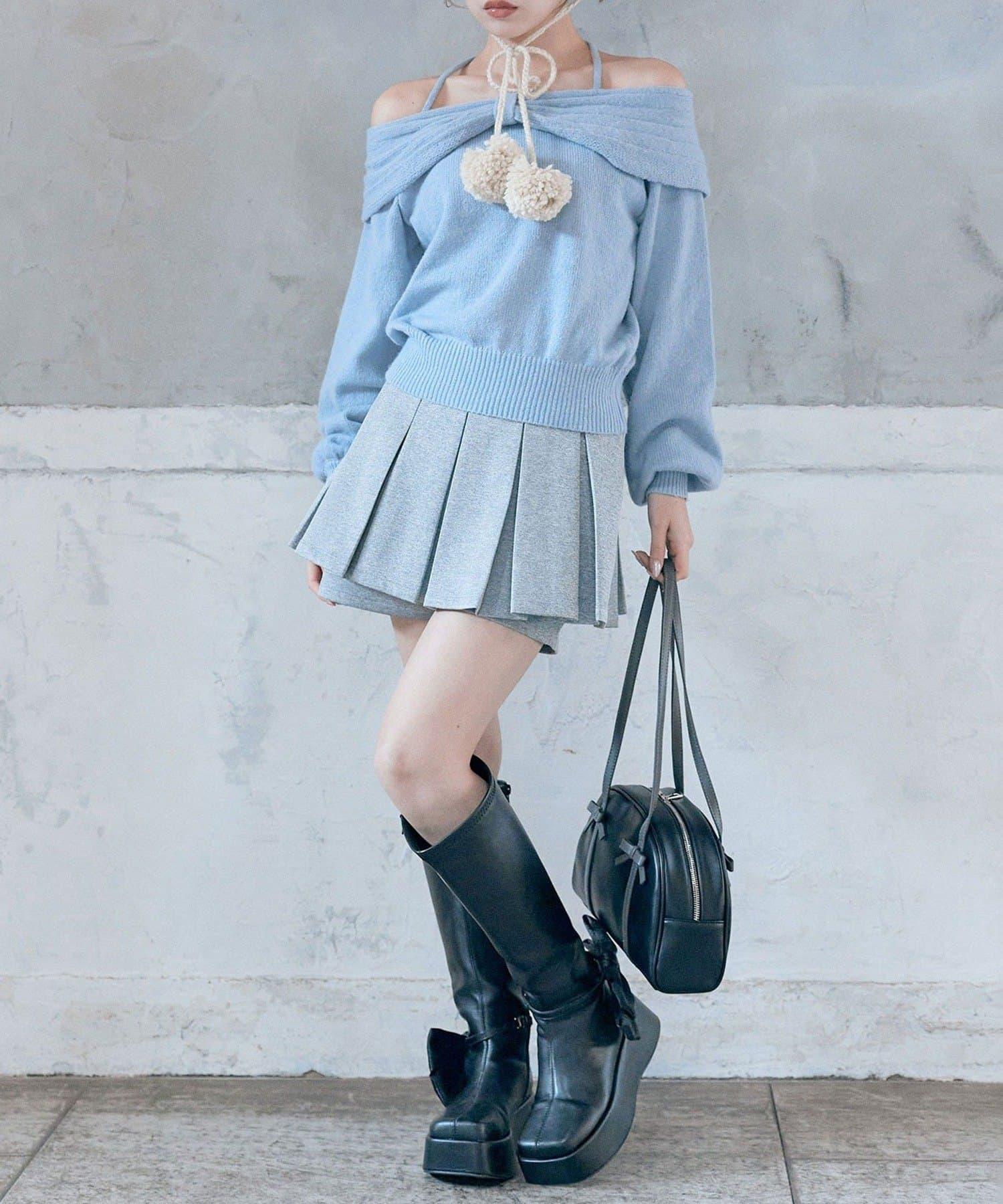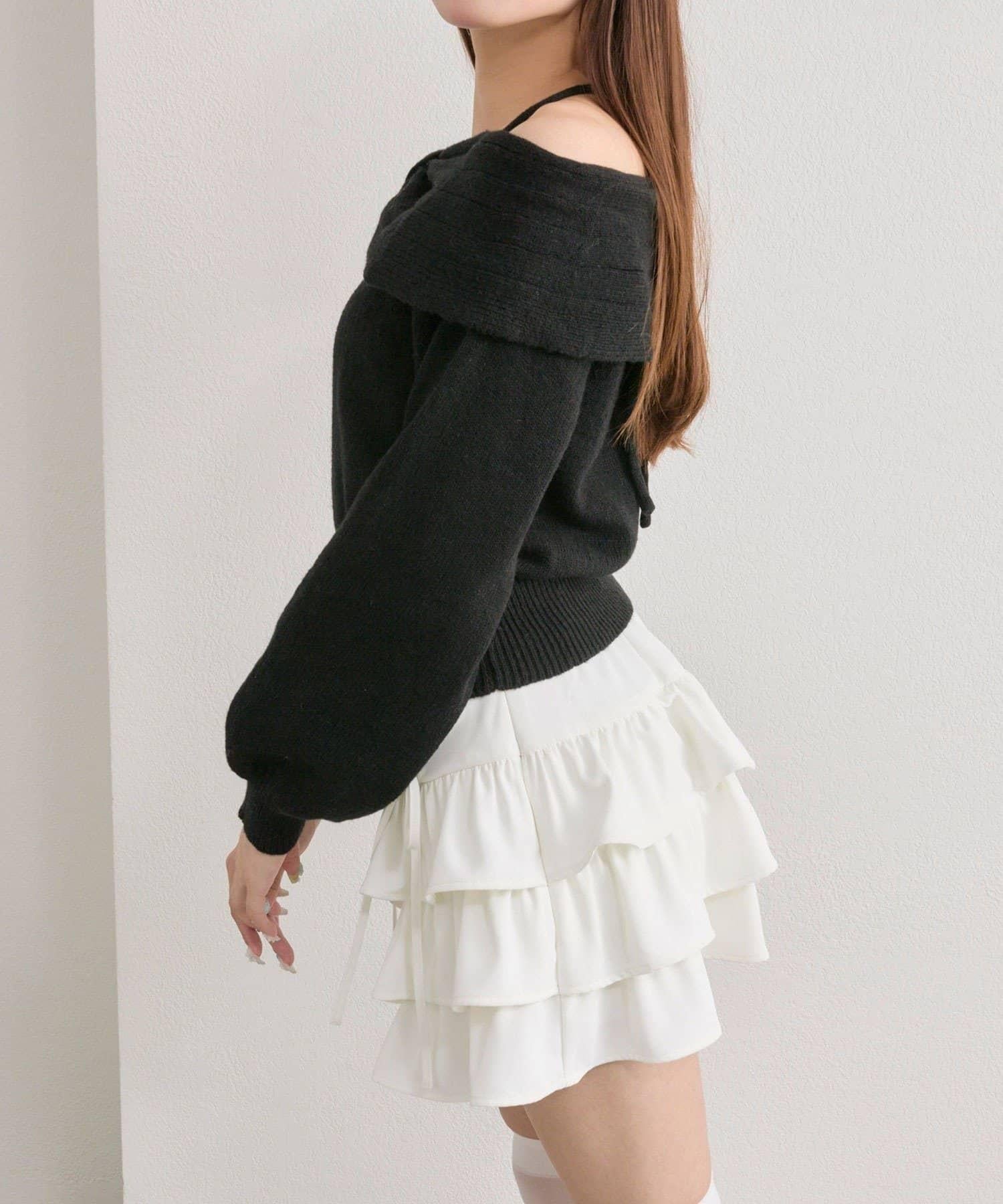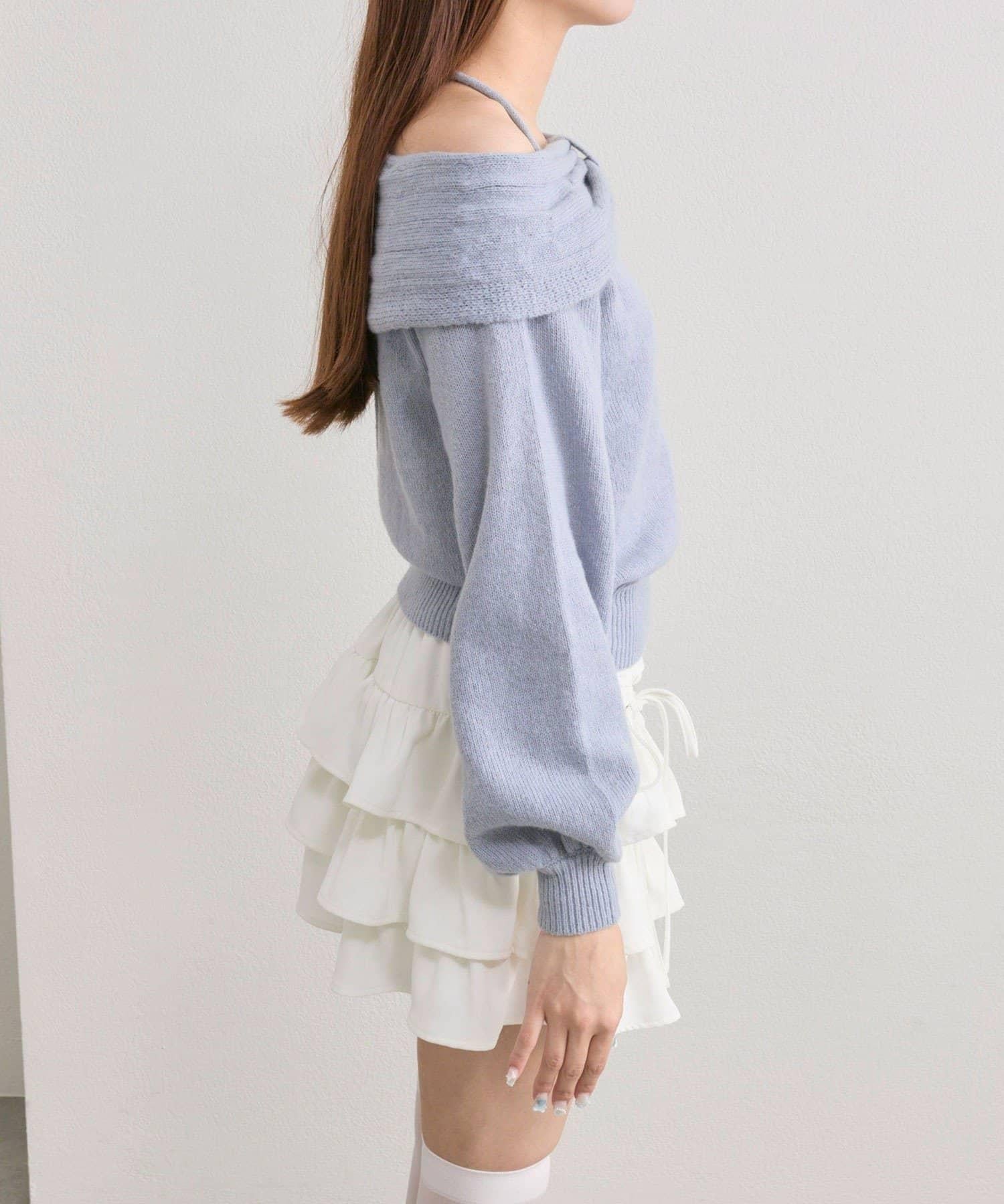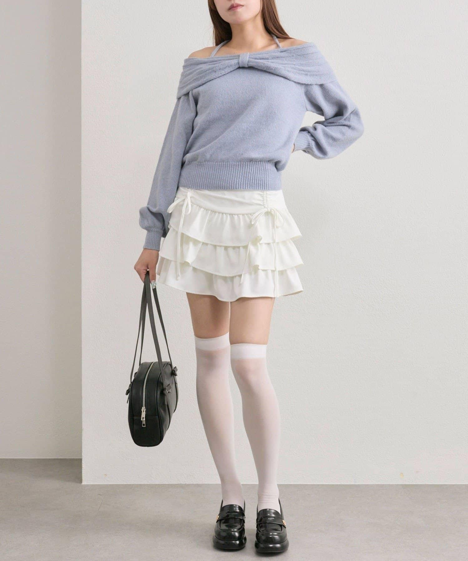 這款針織衫採用露肩設計,展現出美麗的肩部線條,胸前的絲帶設計給人可愛成熟的印象。