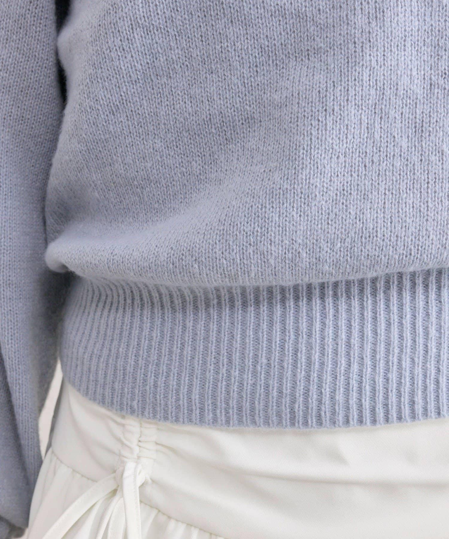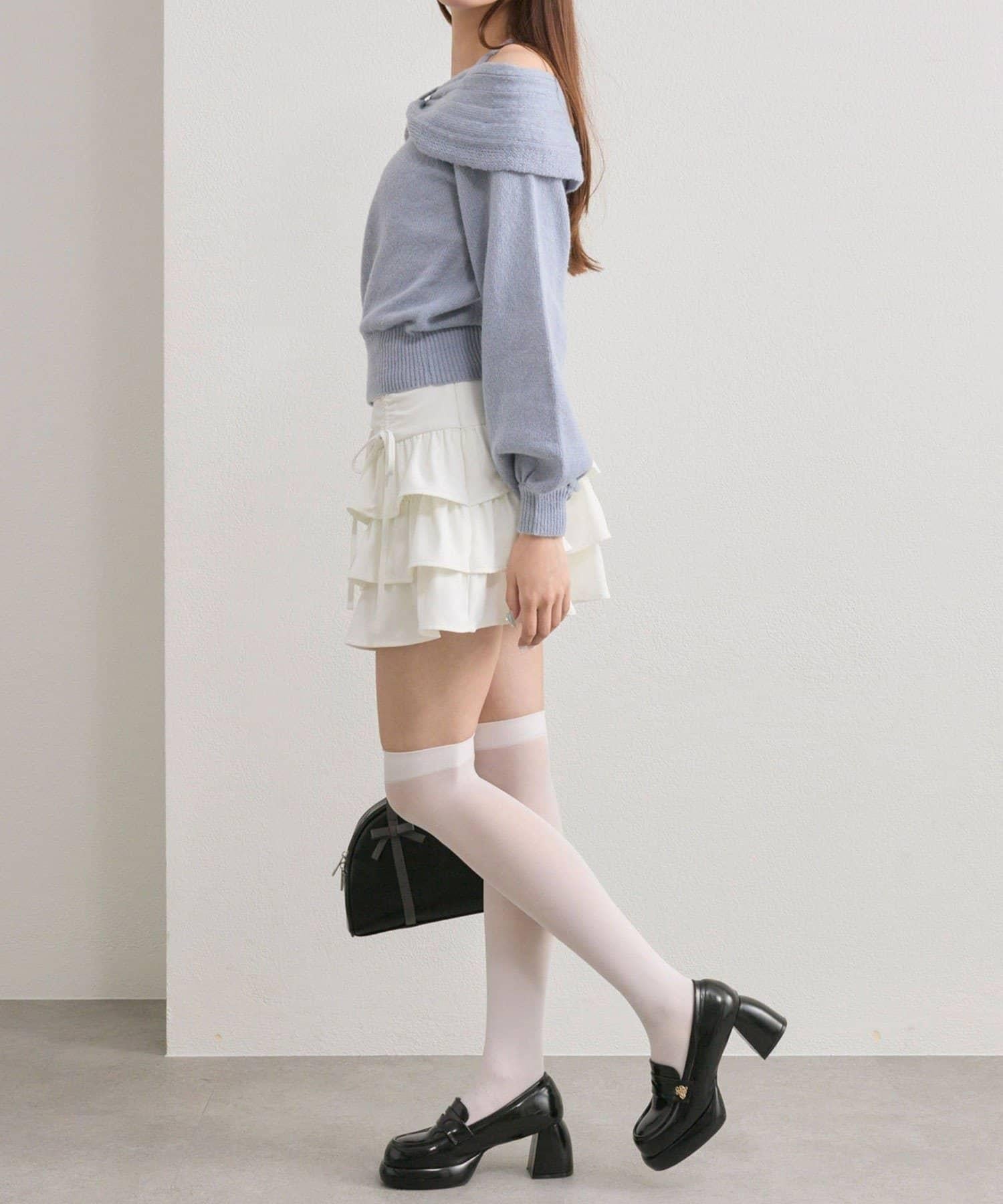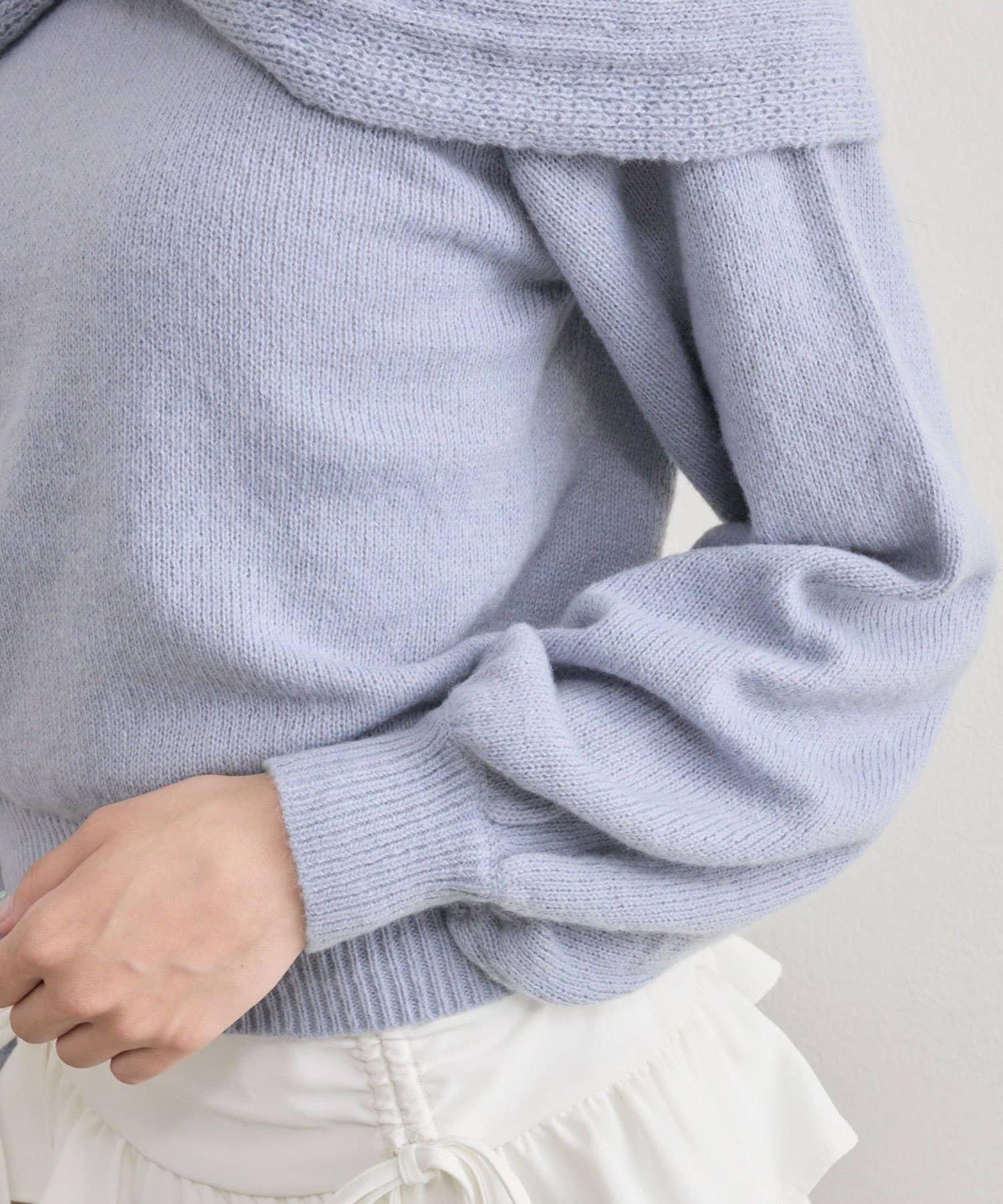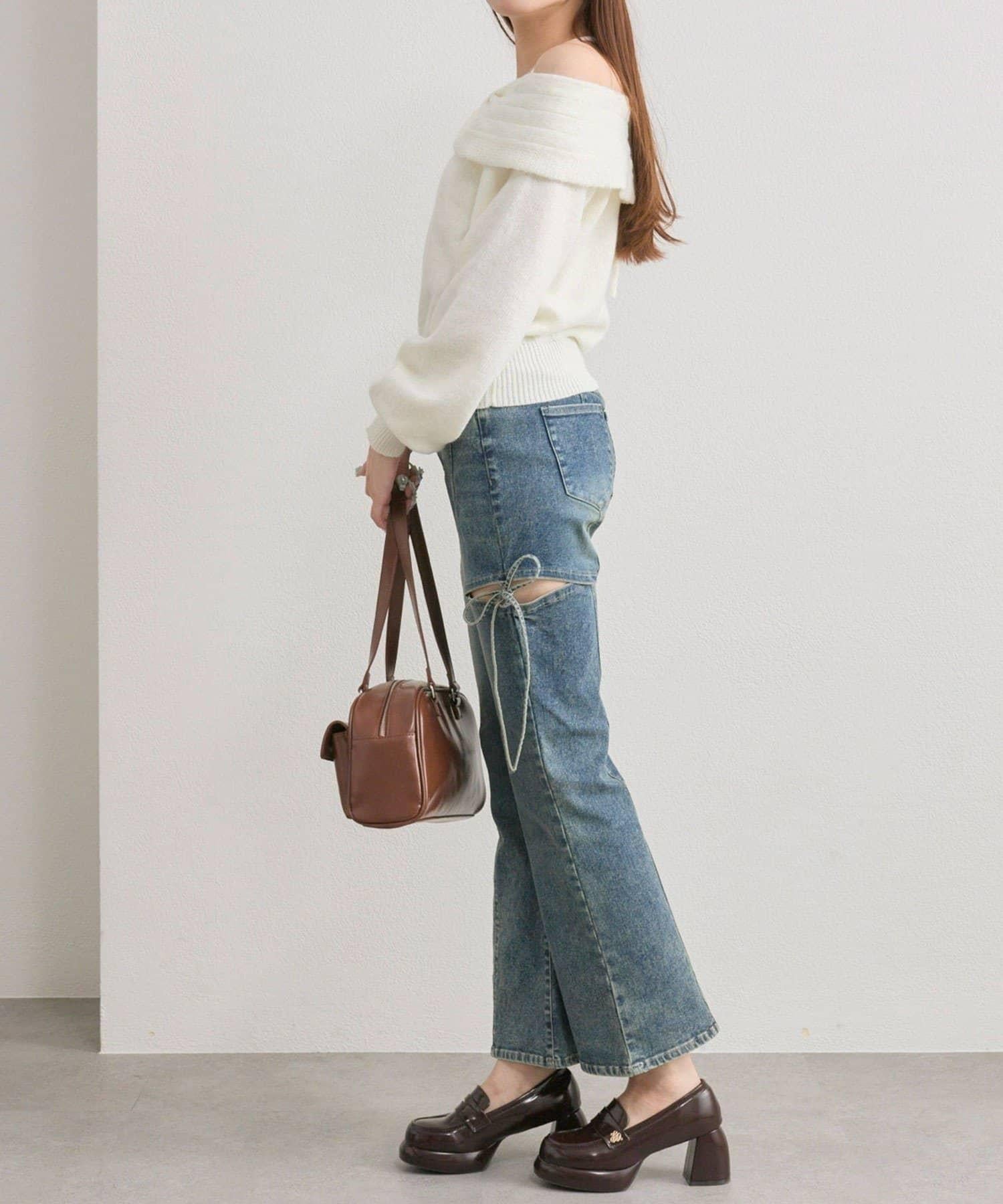 這款針織衫採用露肩設計,展現出美麗的肩部線條,胸前的絲帶設計給人可愛成熟的印象。