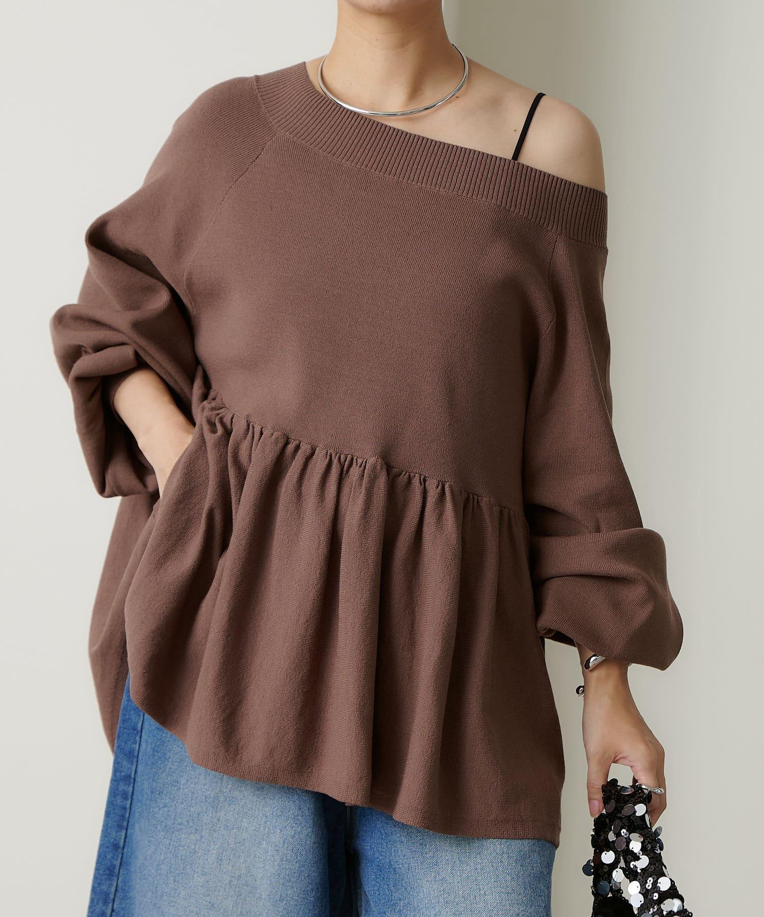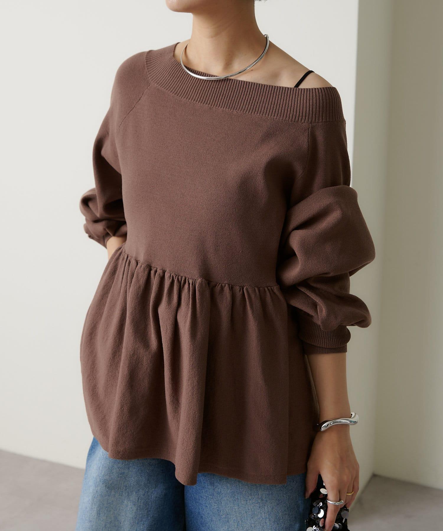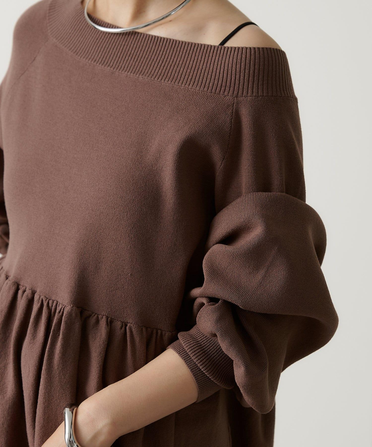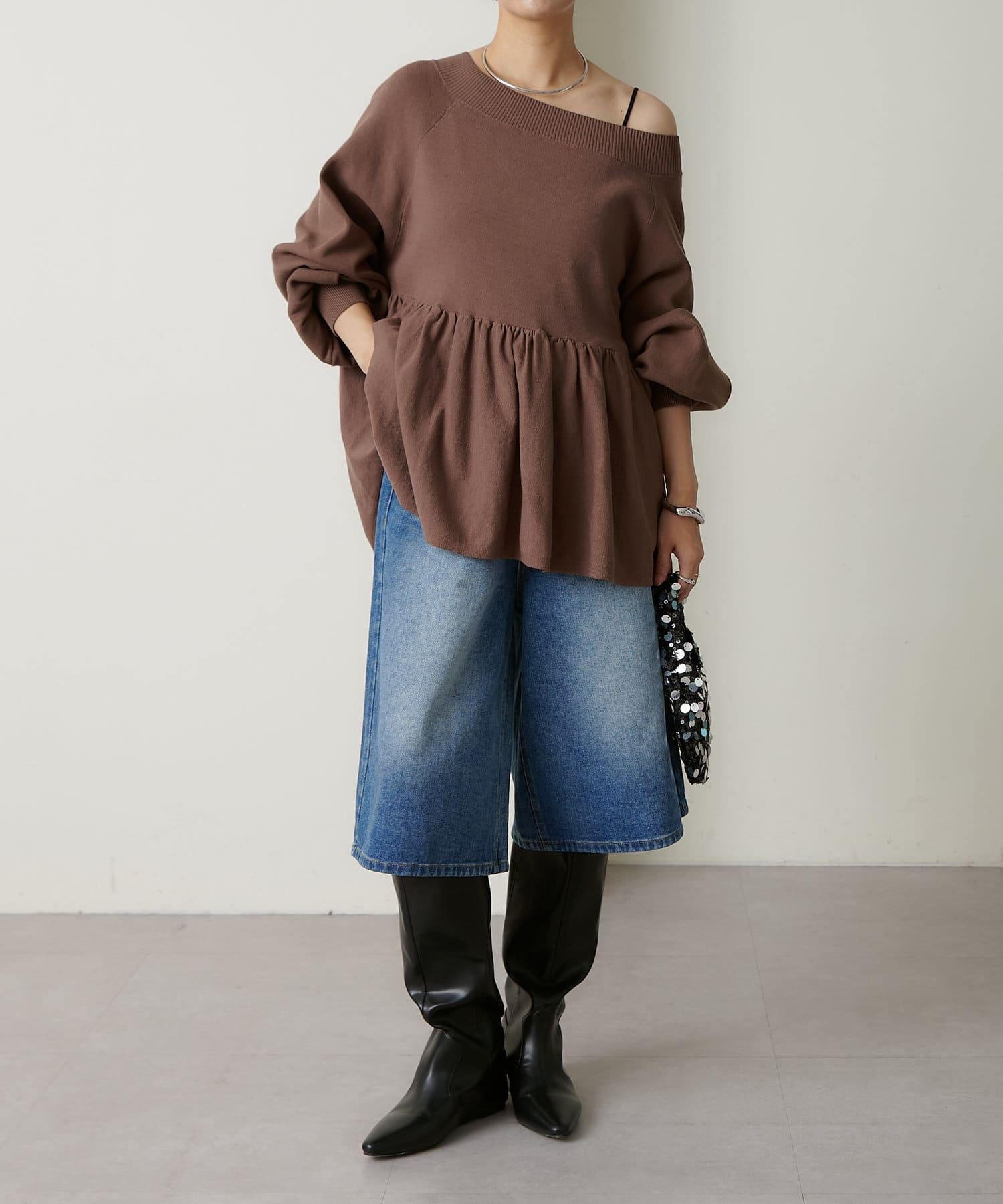 【Omekashi】全針織一字肩荷葉邊針織衫