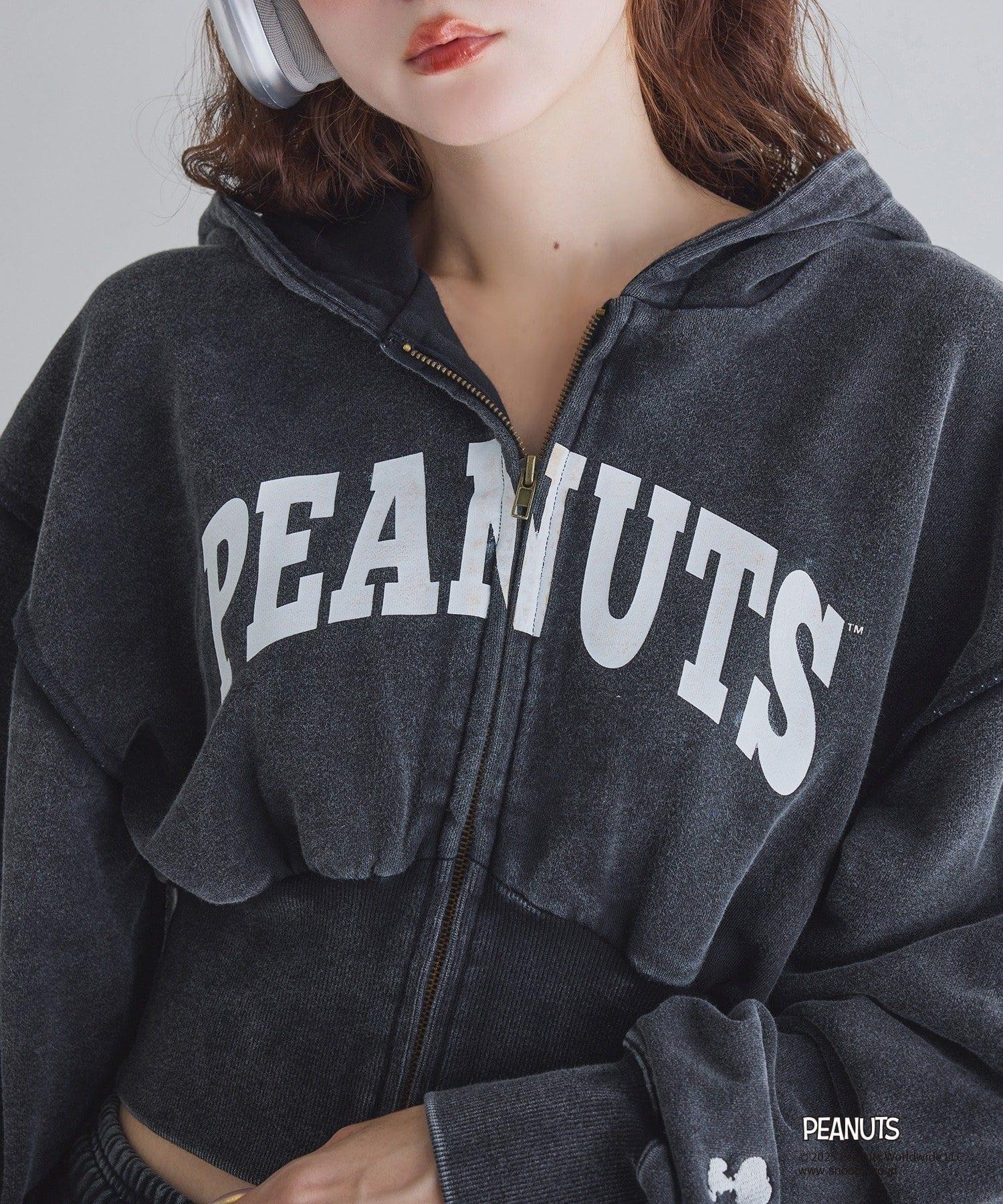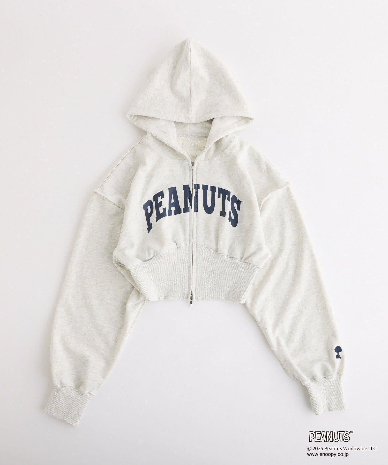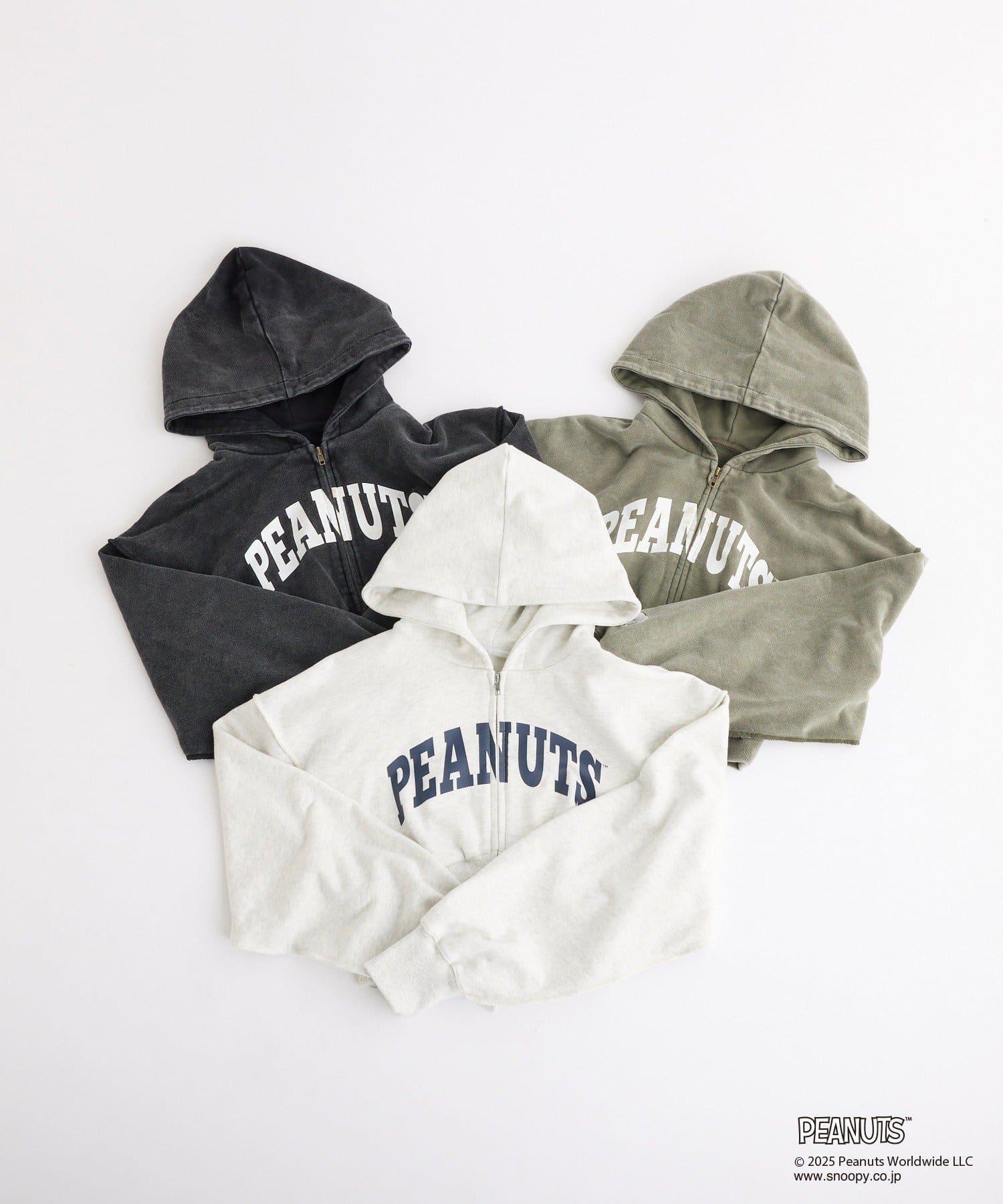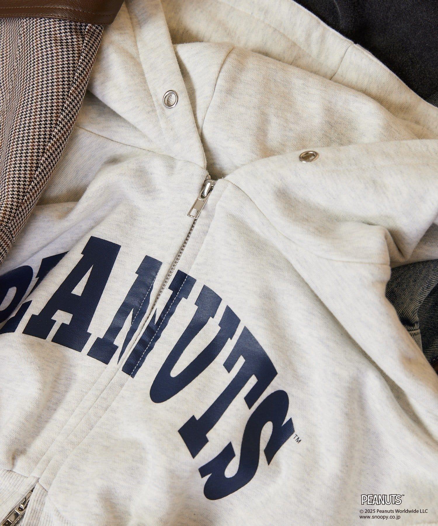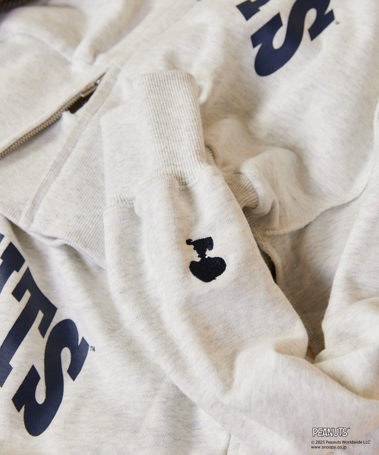 這款連帽衫的左袖上繡有史努比的圖案,正面印有 PEANUTS 的標誌。