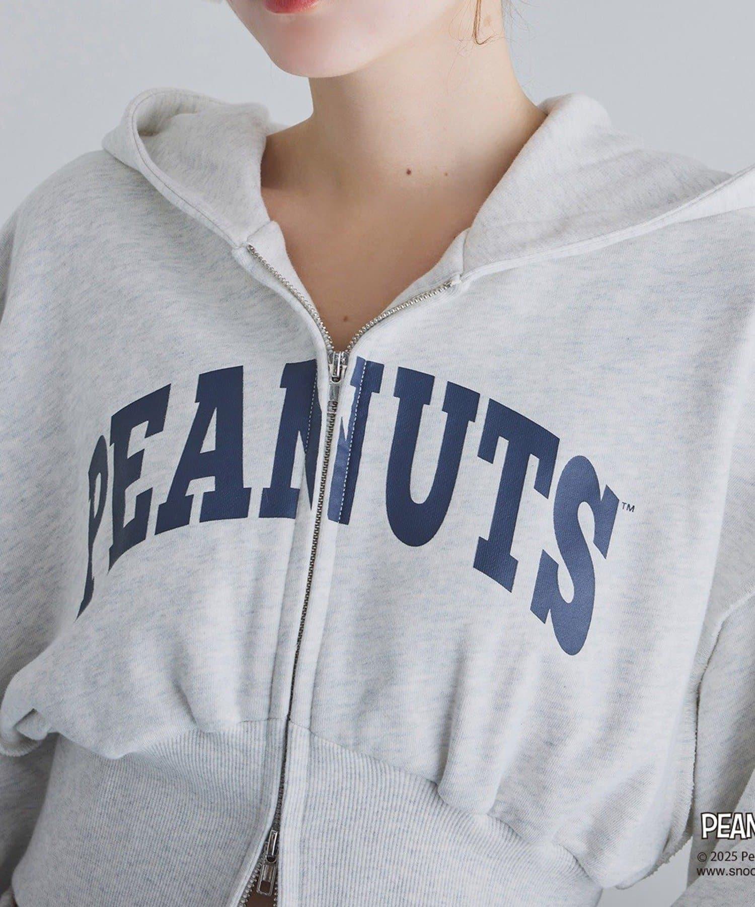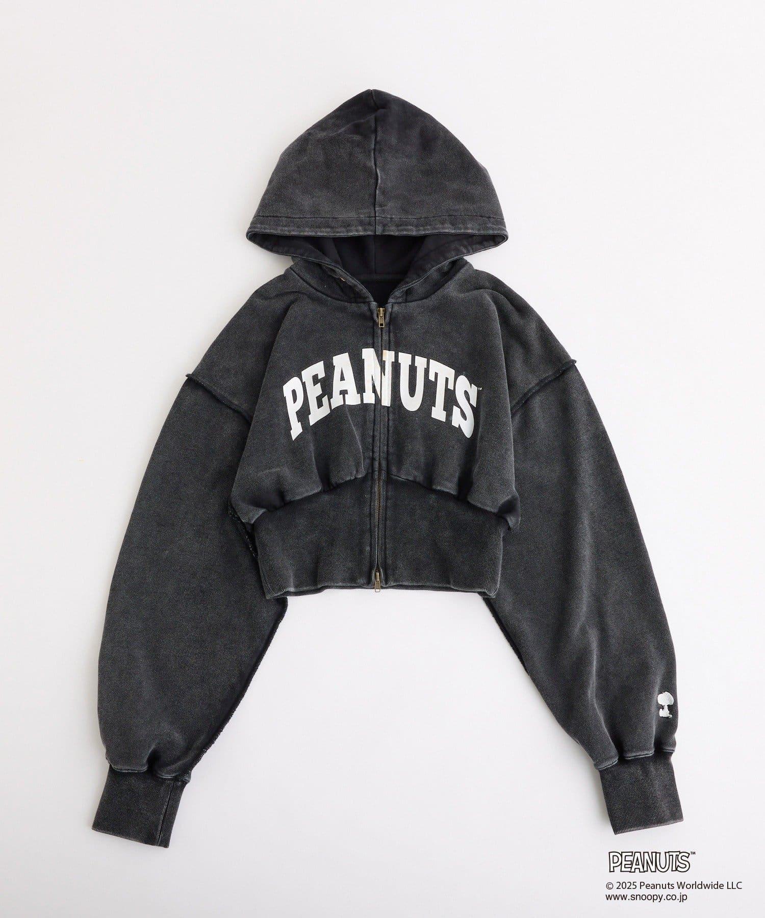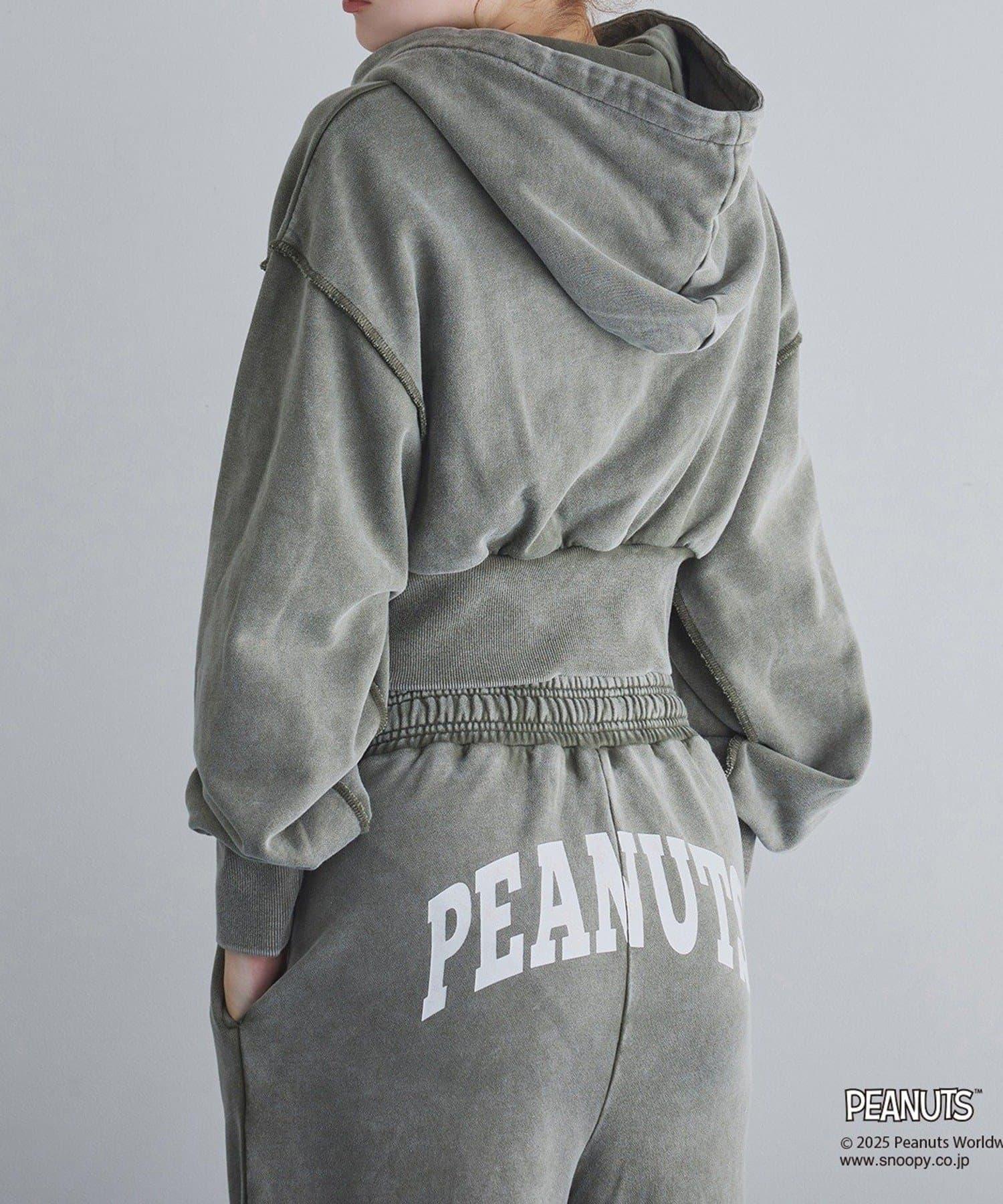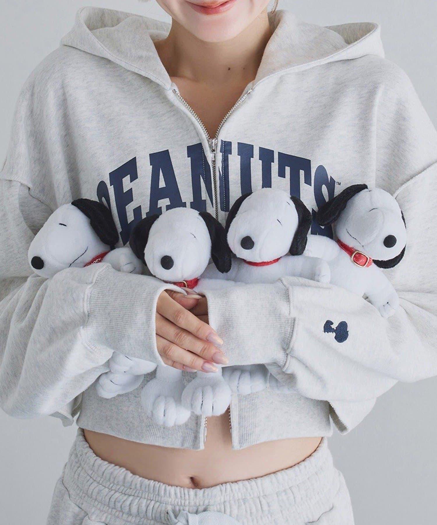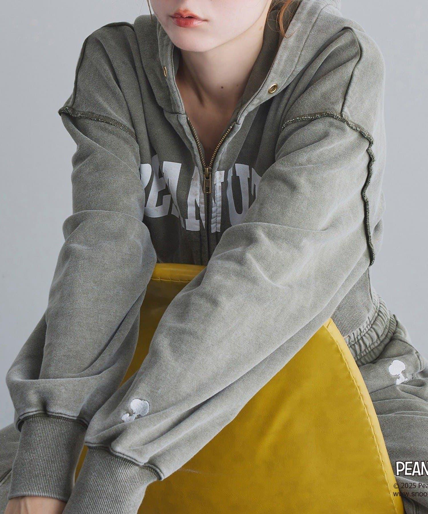 這款連帽衫的左袖上繡有史努比的圖案,正面印有 PEANUTS 的標誌。