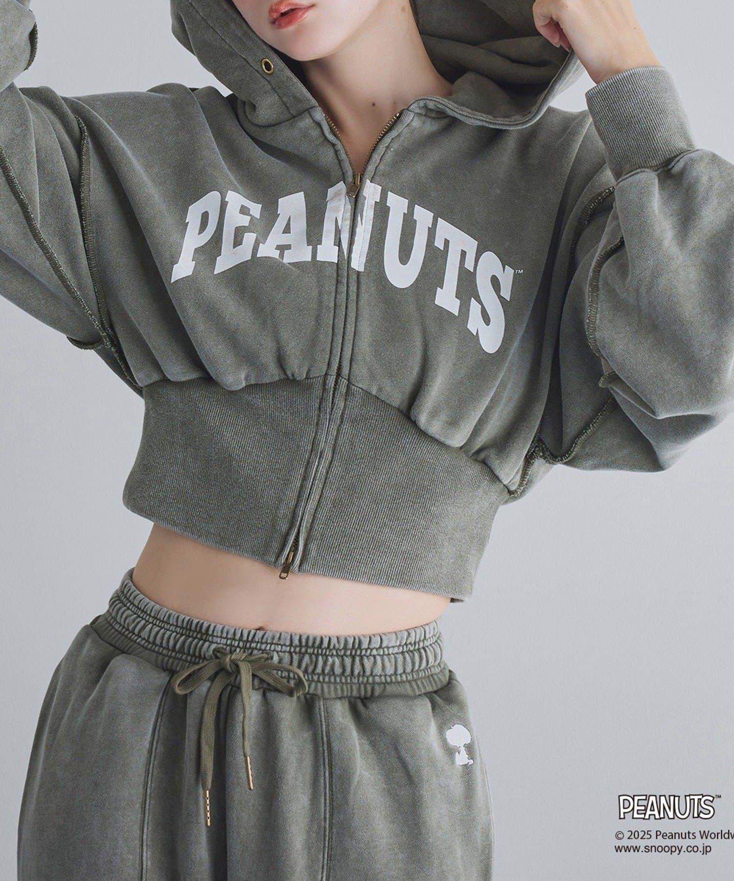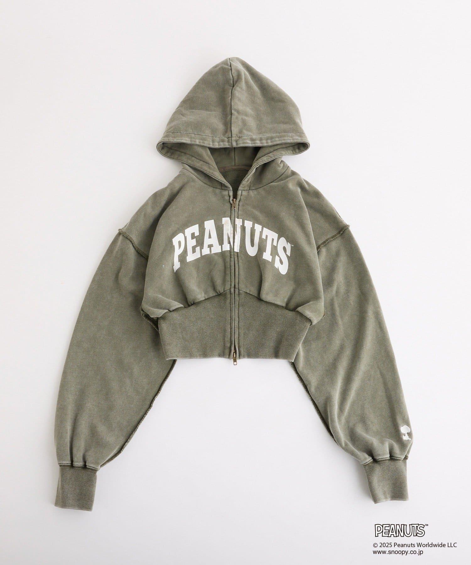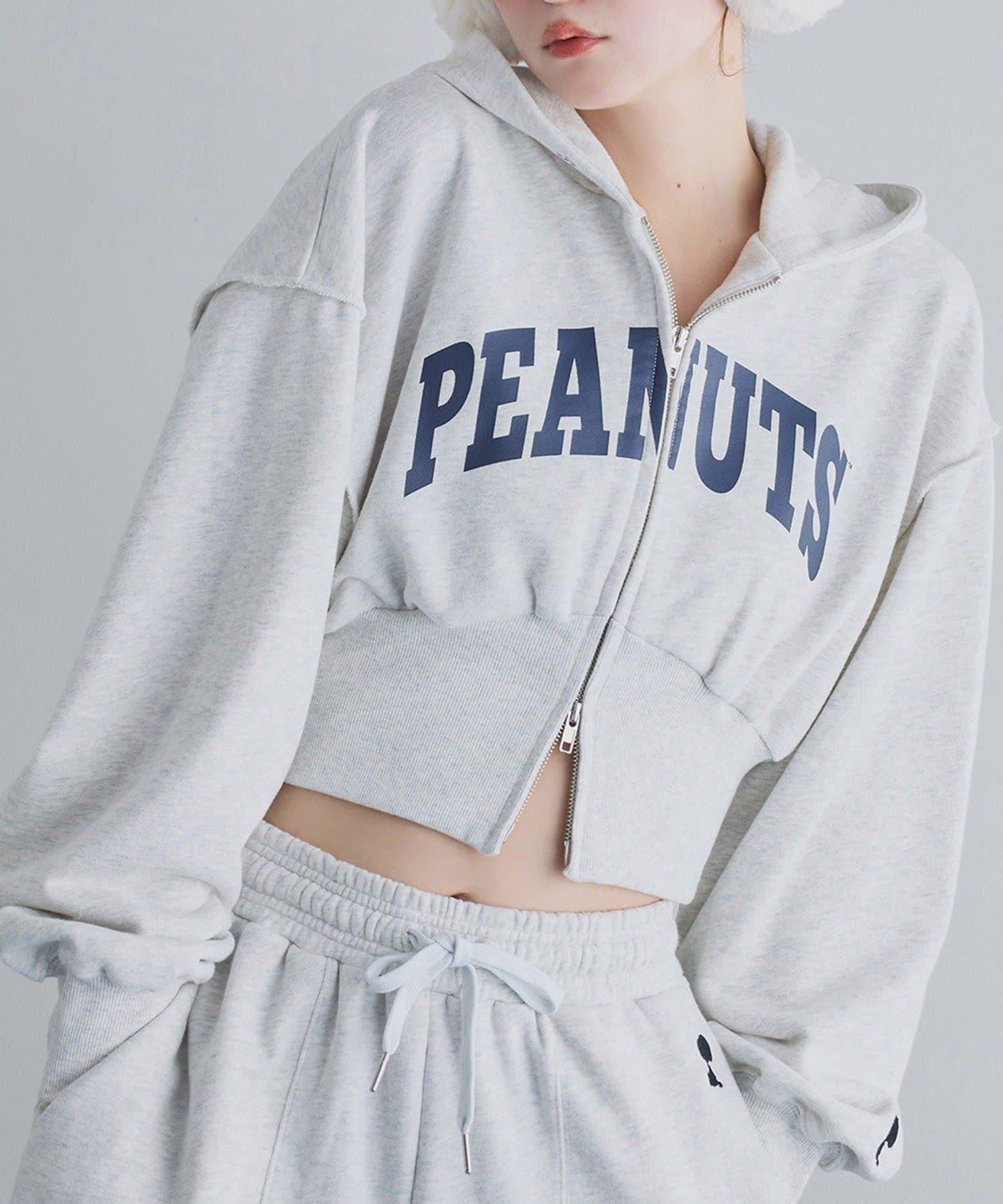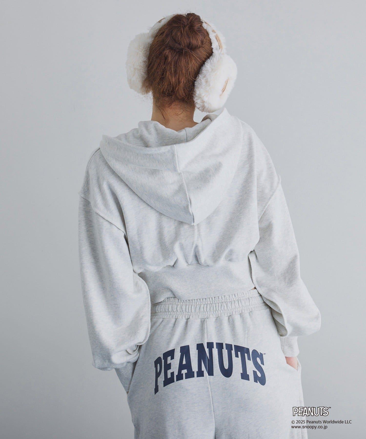 這款連帽衫的左袖上繡有史努比的圖案,正面印有 PEANUTS 的標誌。