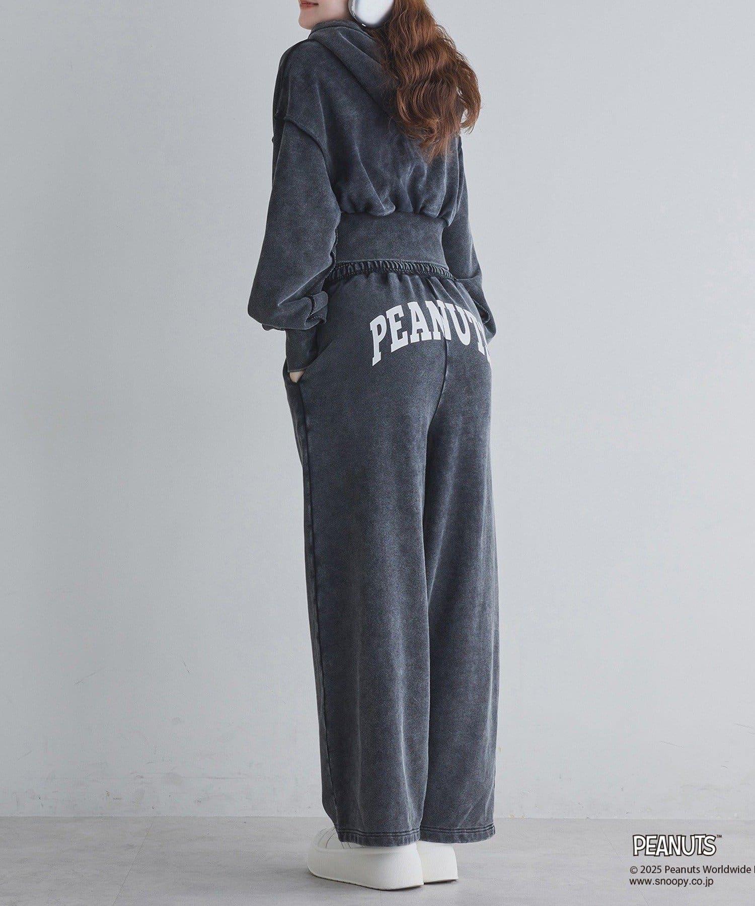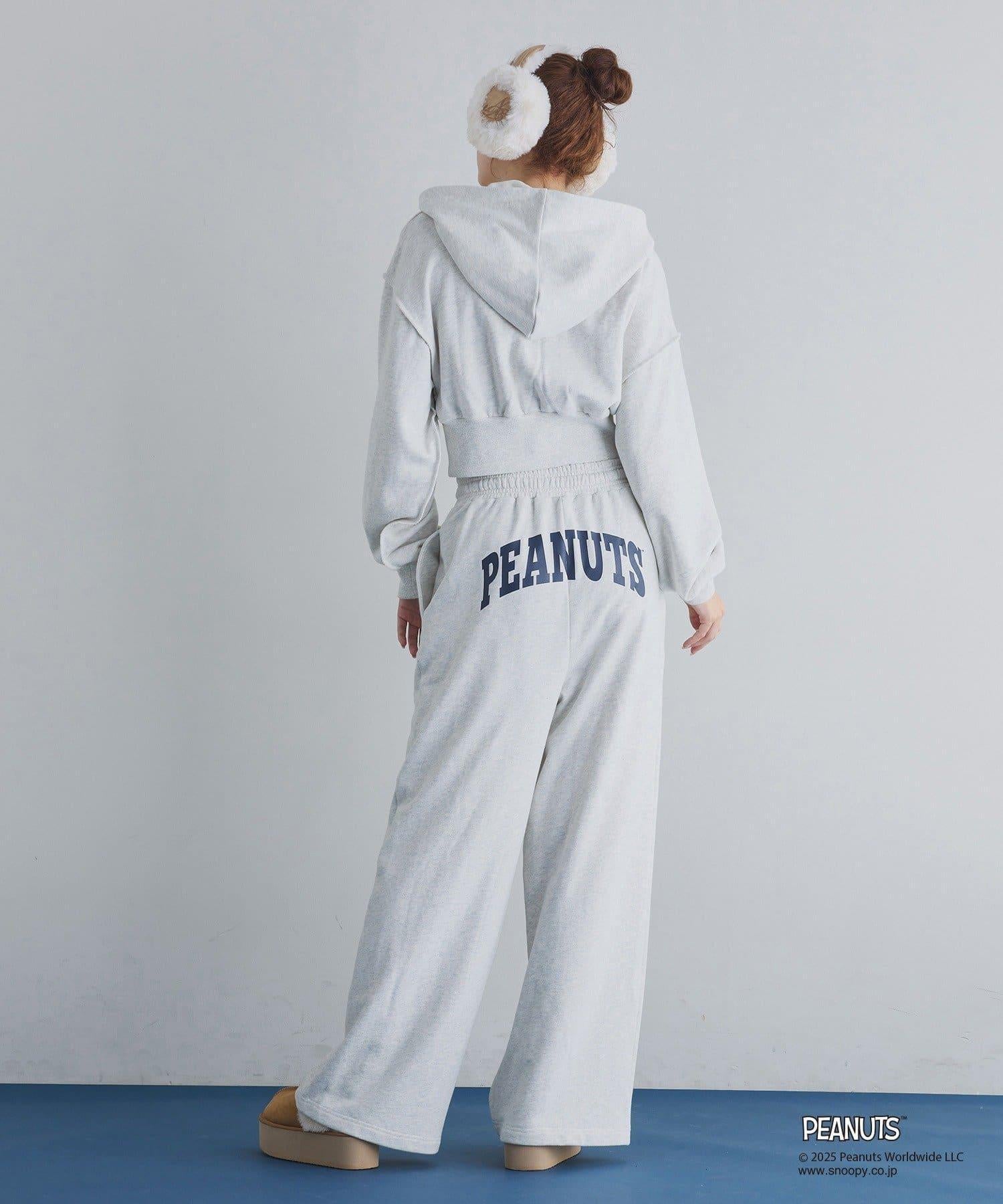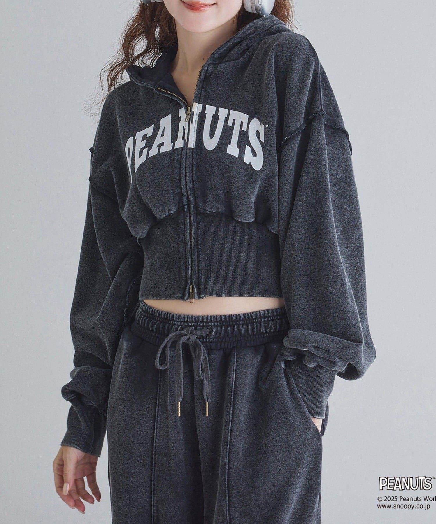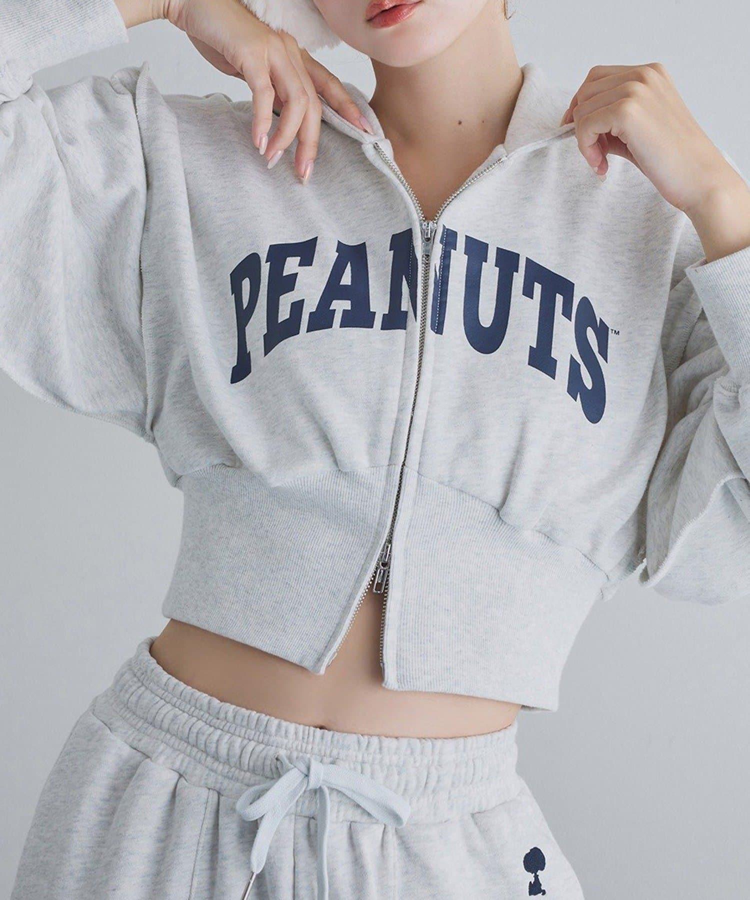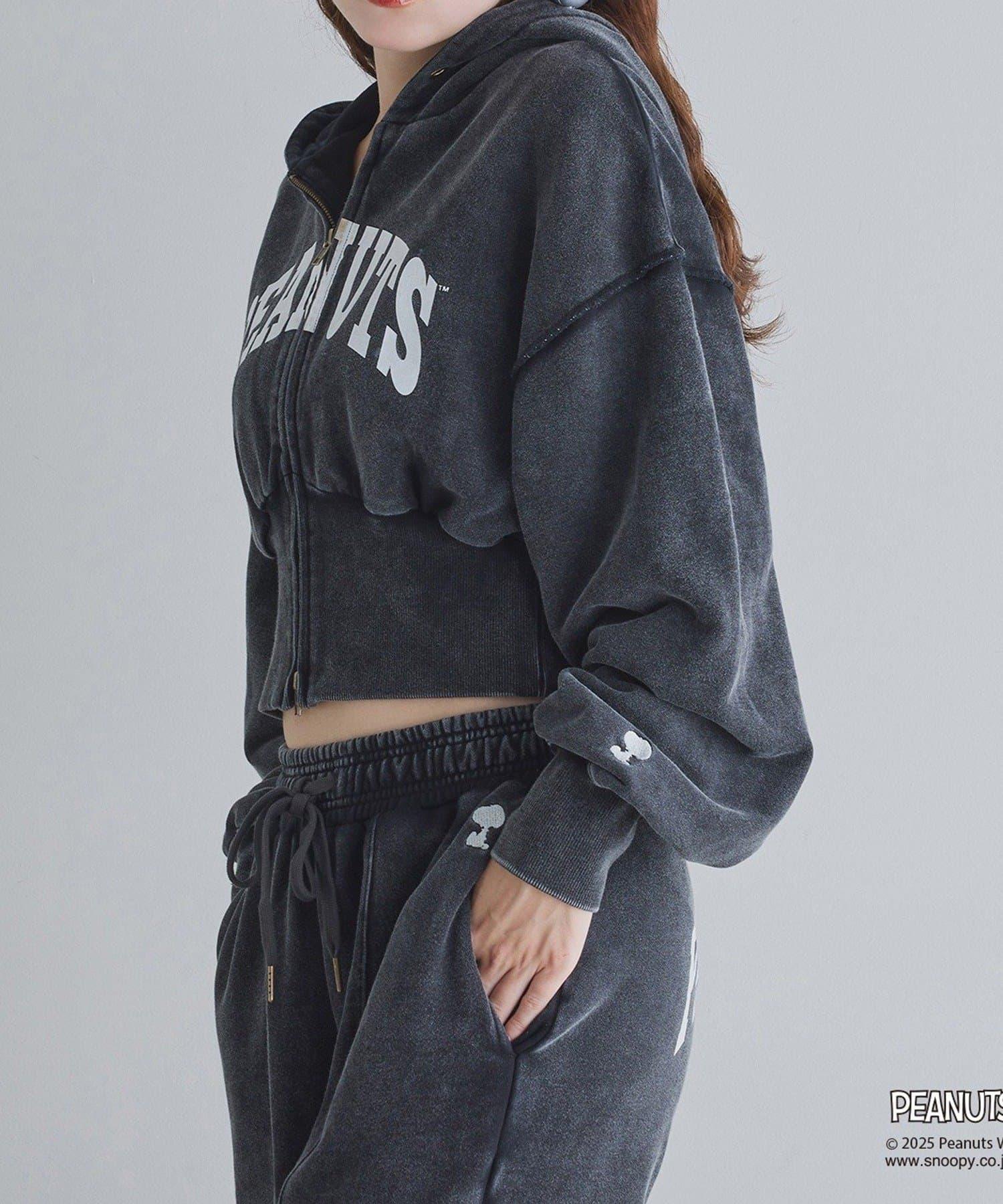 這款連帽衫的左袖上繡有史努比的圖案,正面印有 PEANUTS 的標誌。