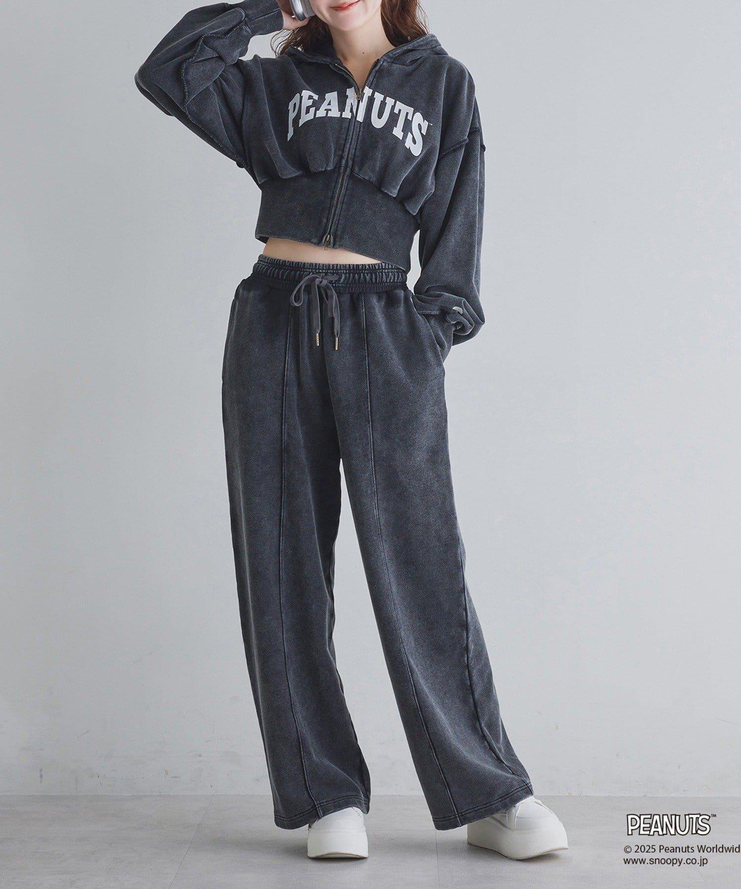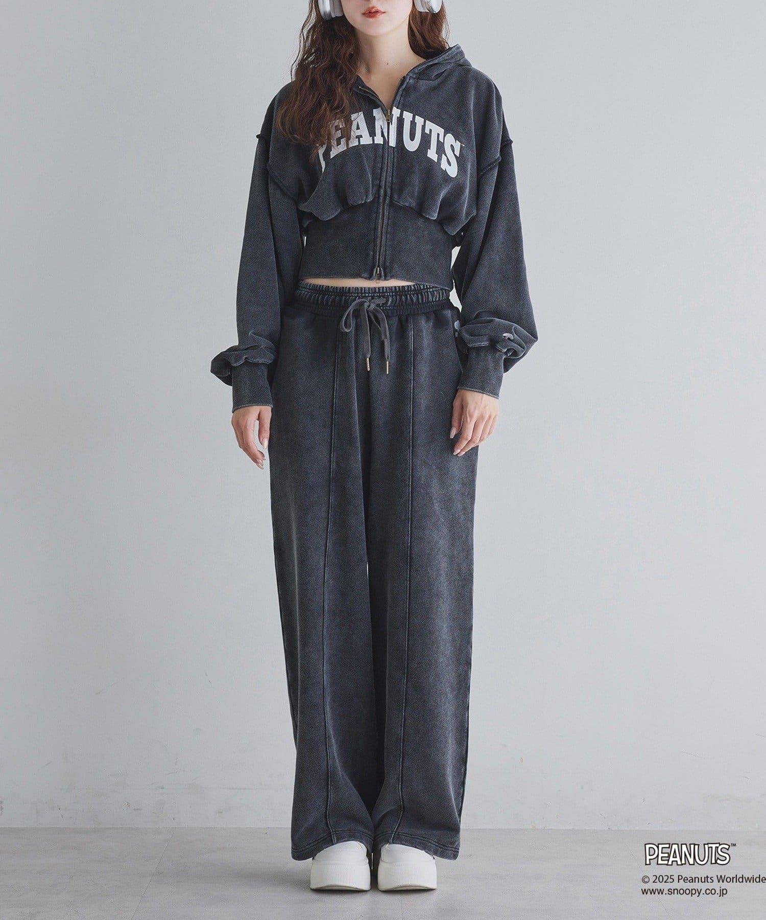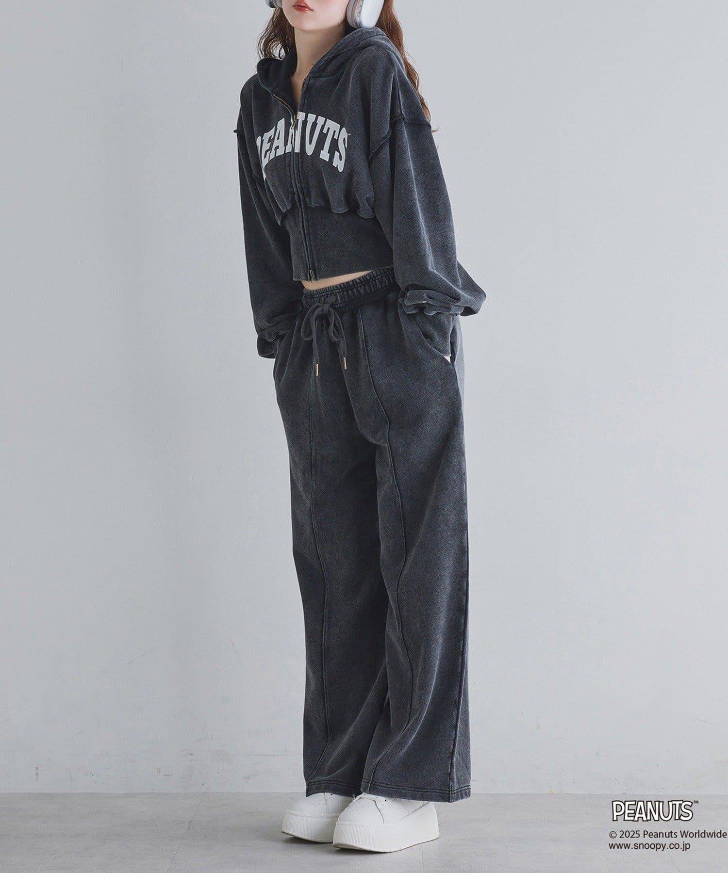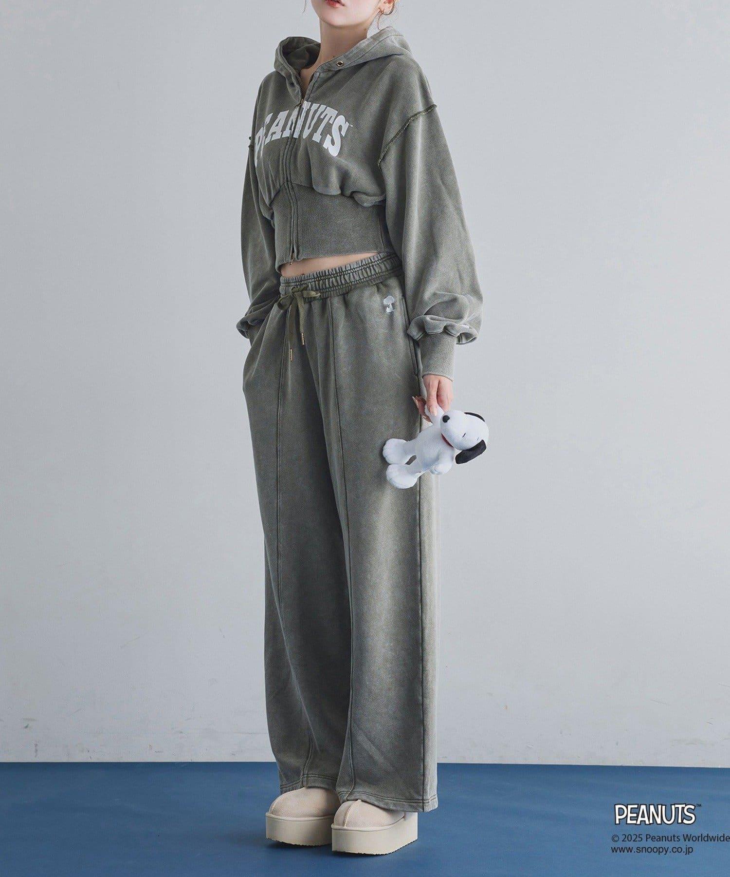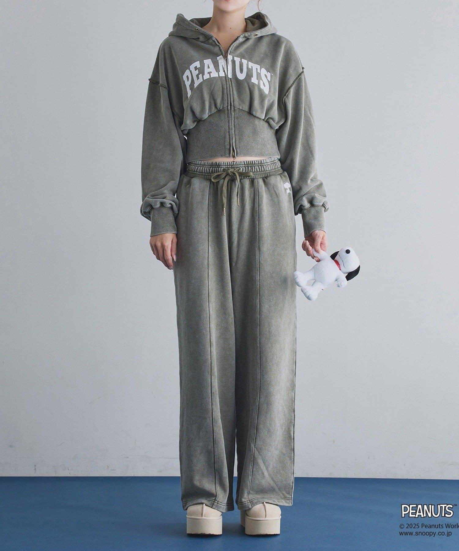這款連帽衫的左袖上繡有史努比的圖案,正面印有 PEANUTS 的標誌。