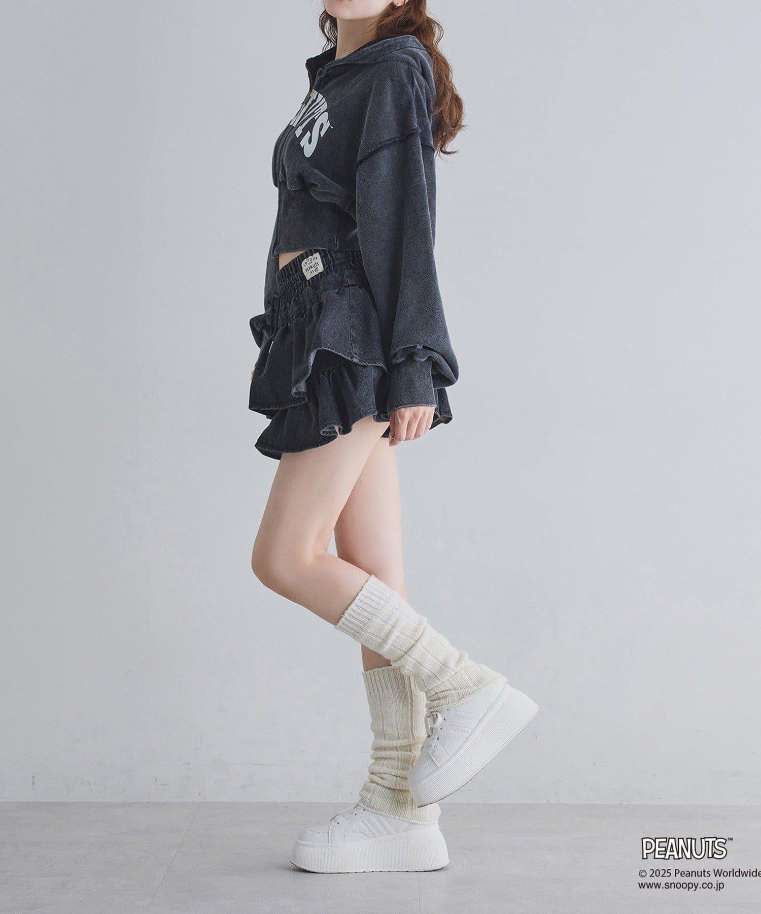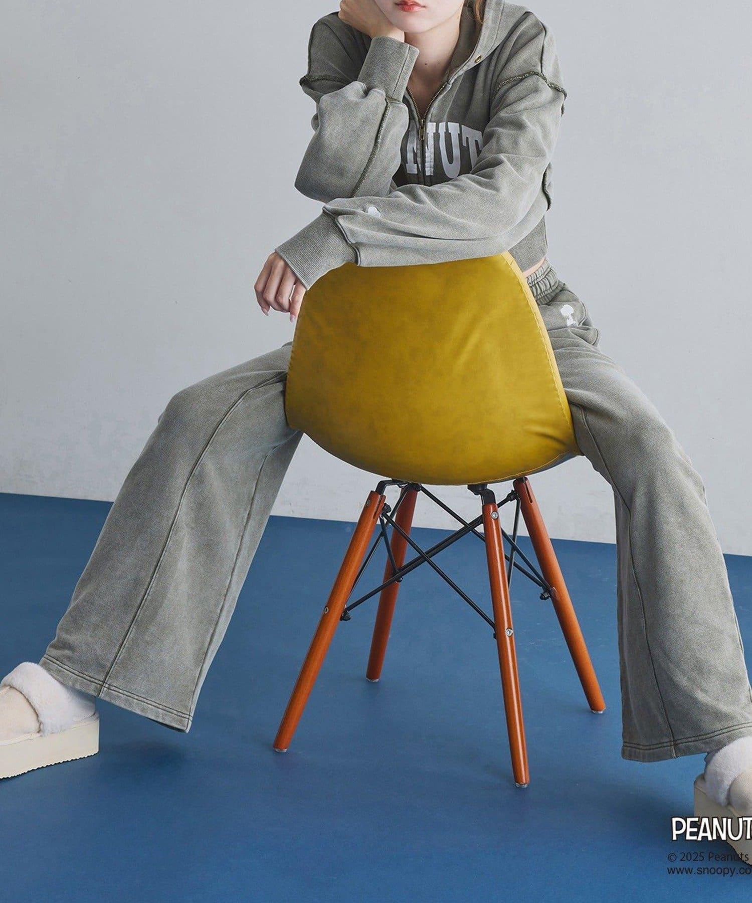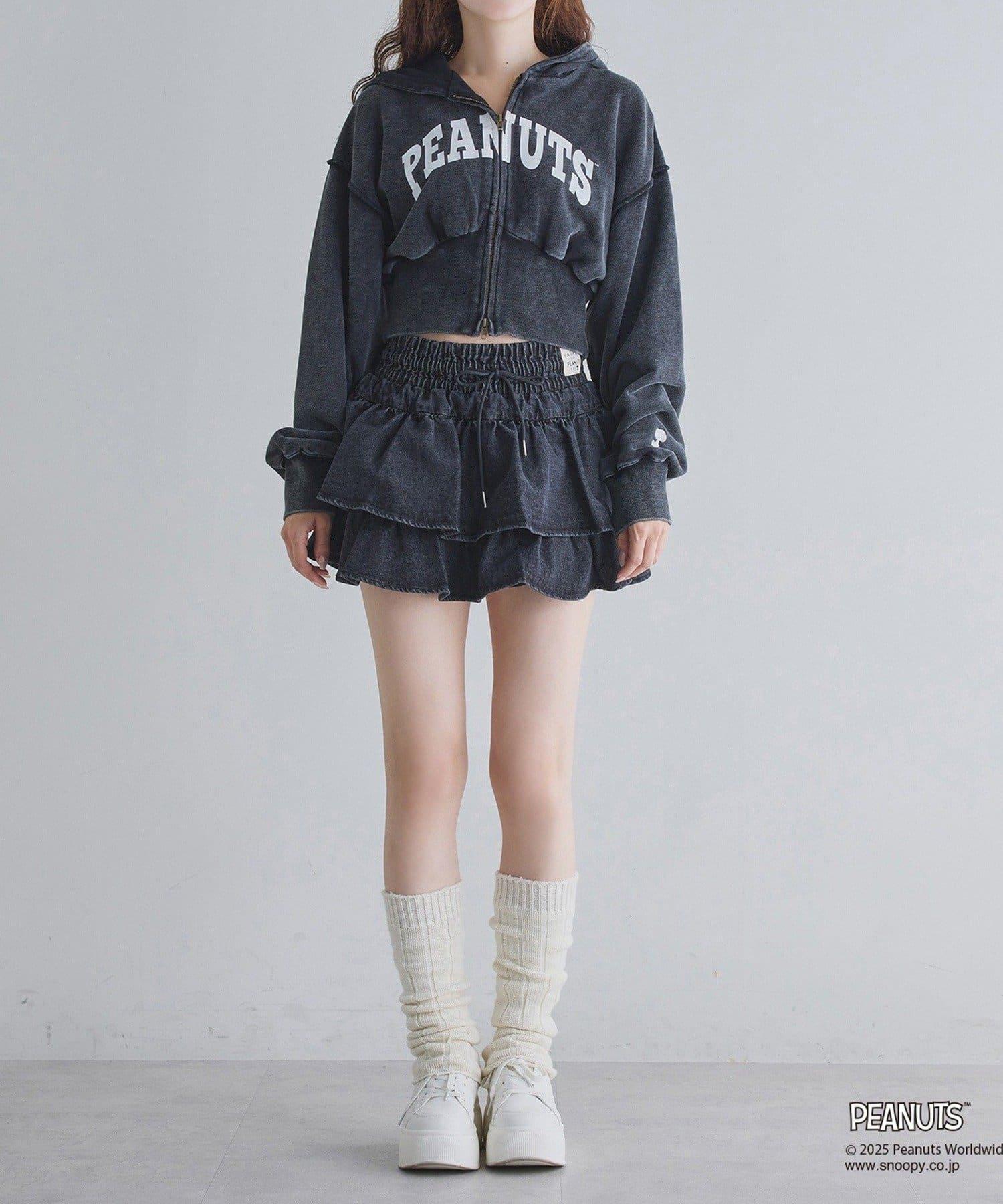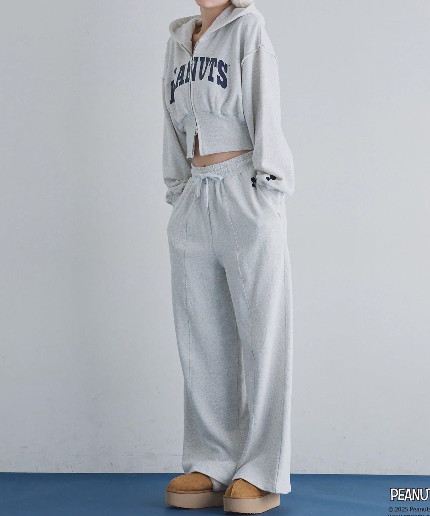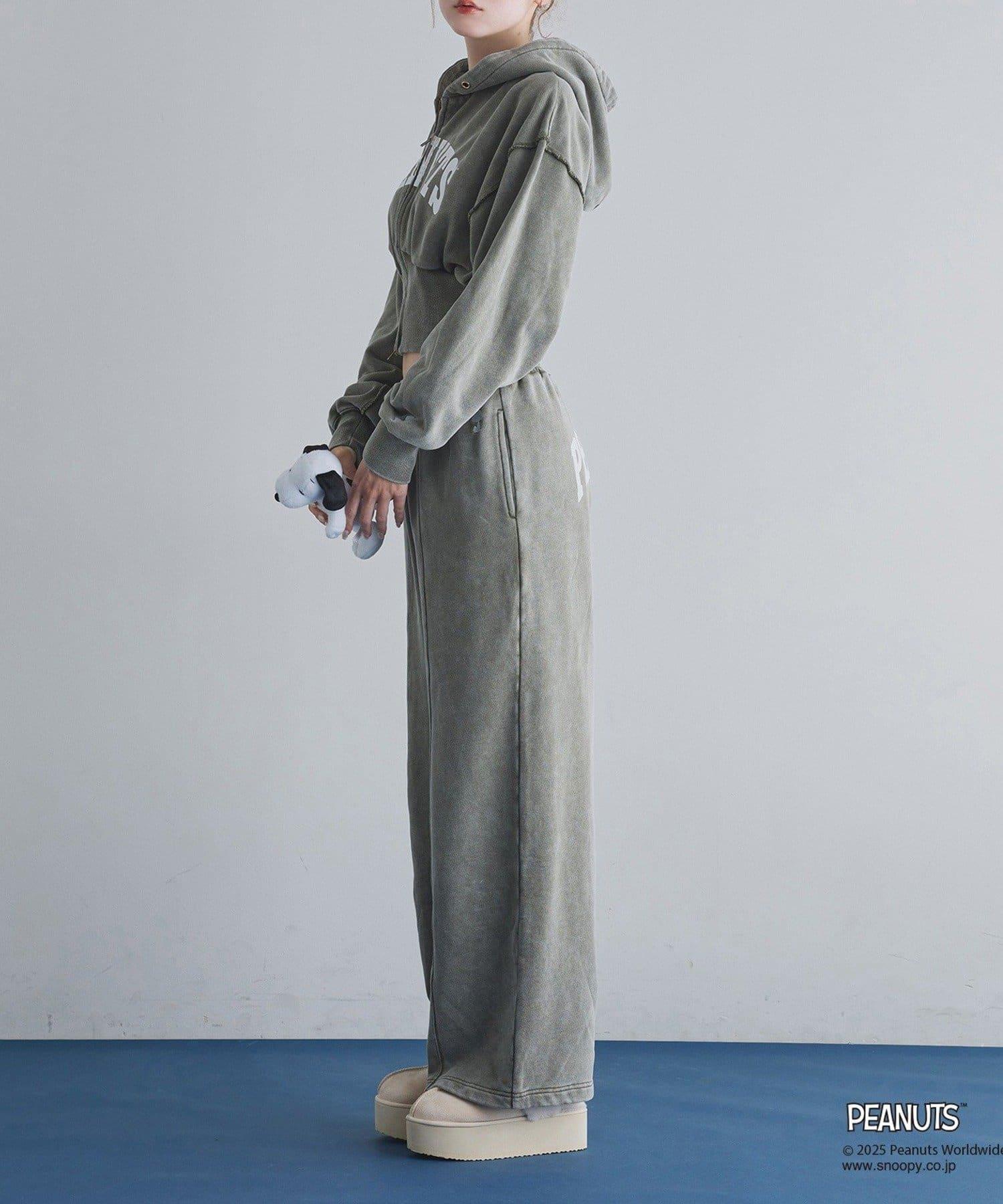這款連帽衫的左袖上繡有史努比的圖案,正面印有 PEANUTS 的標誌。