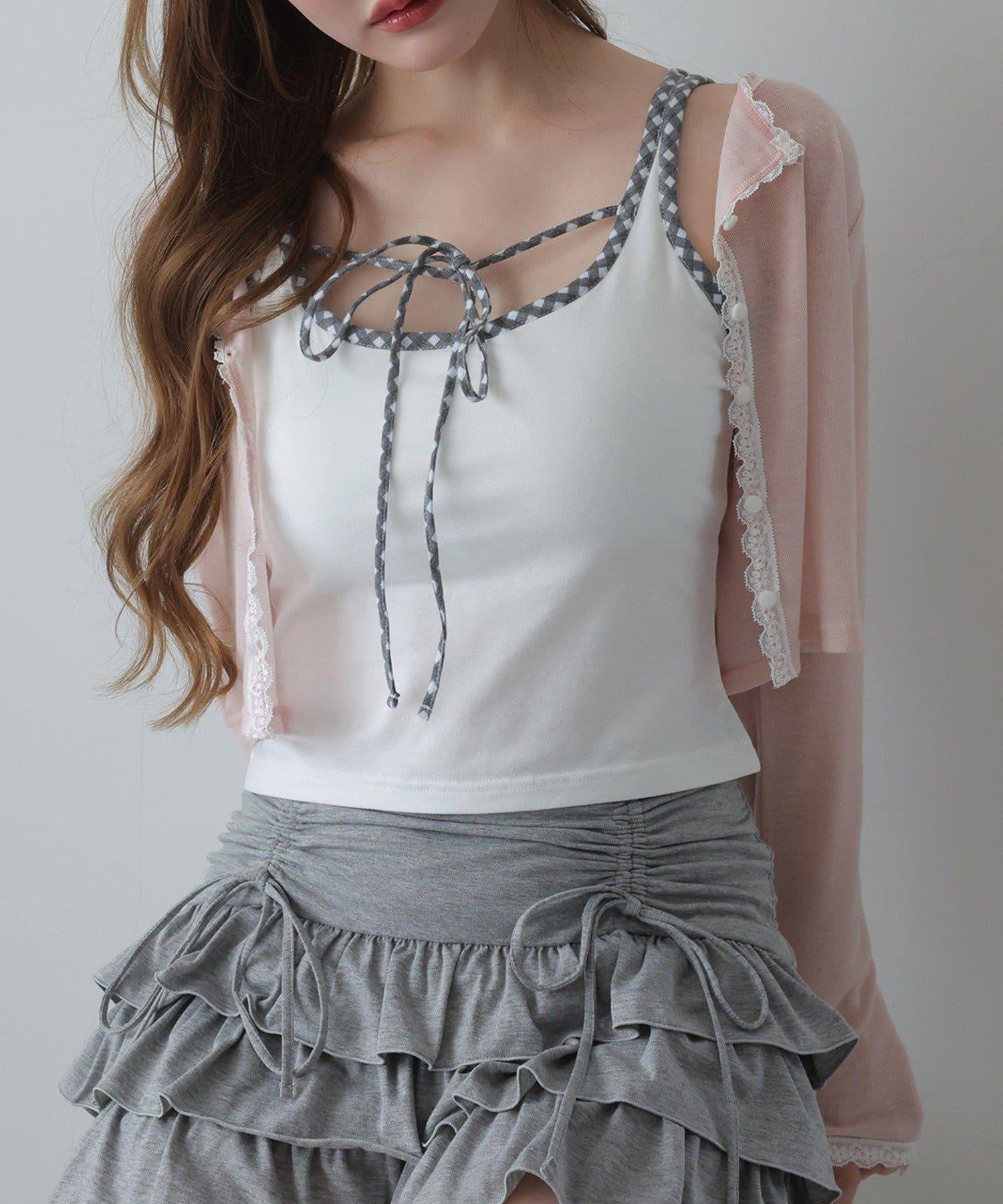 內搭薄上衣或開衫,胸前的緞帶會讓造型更加突出。