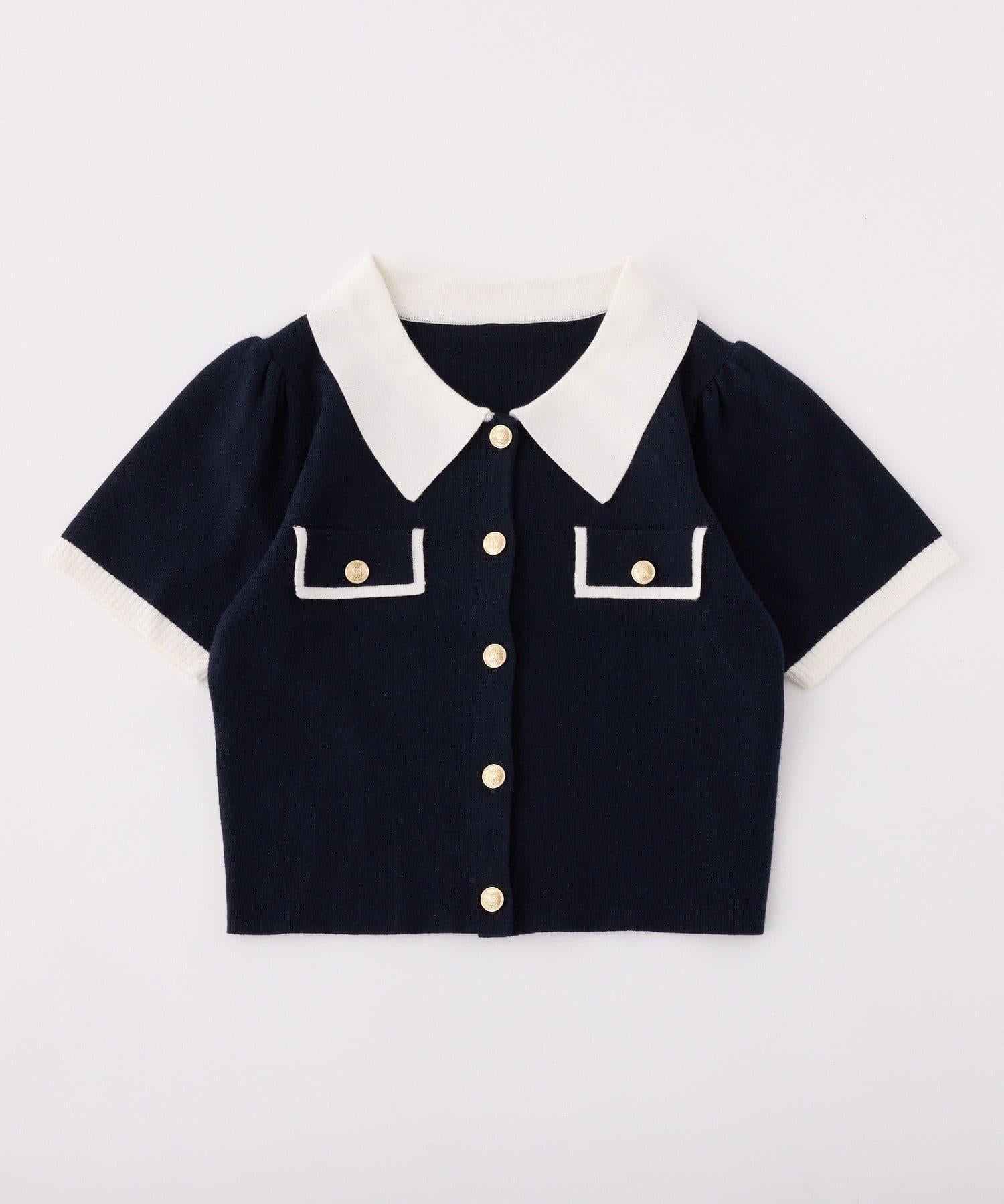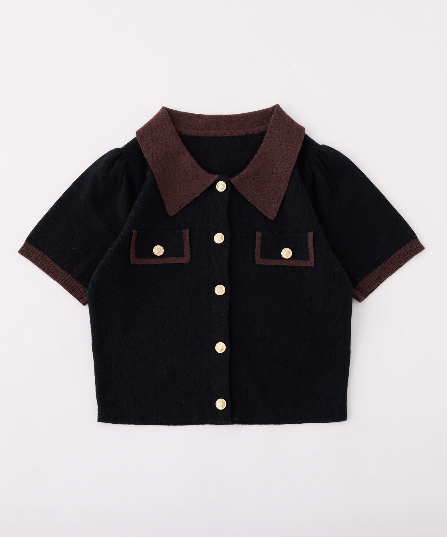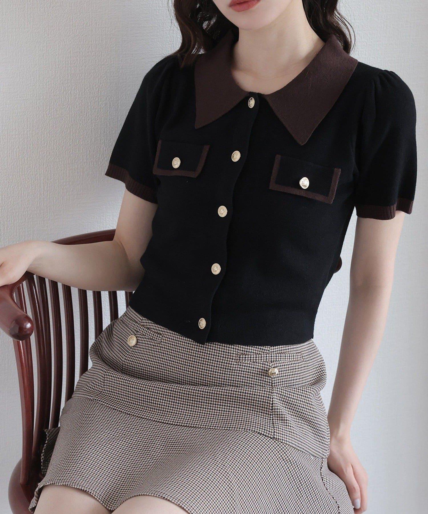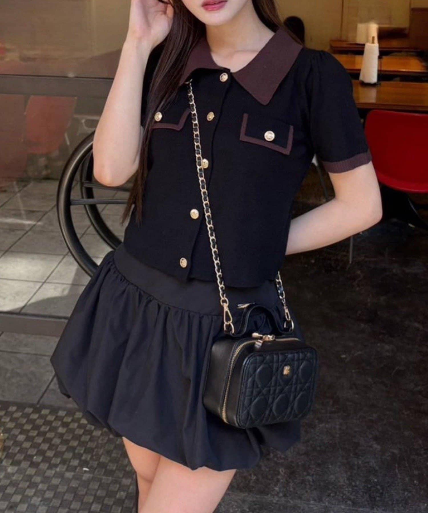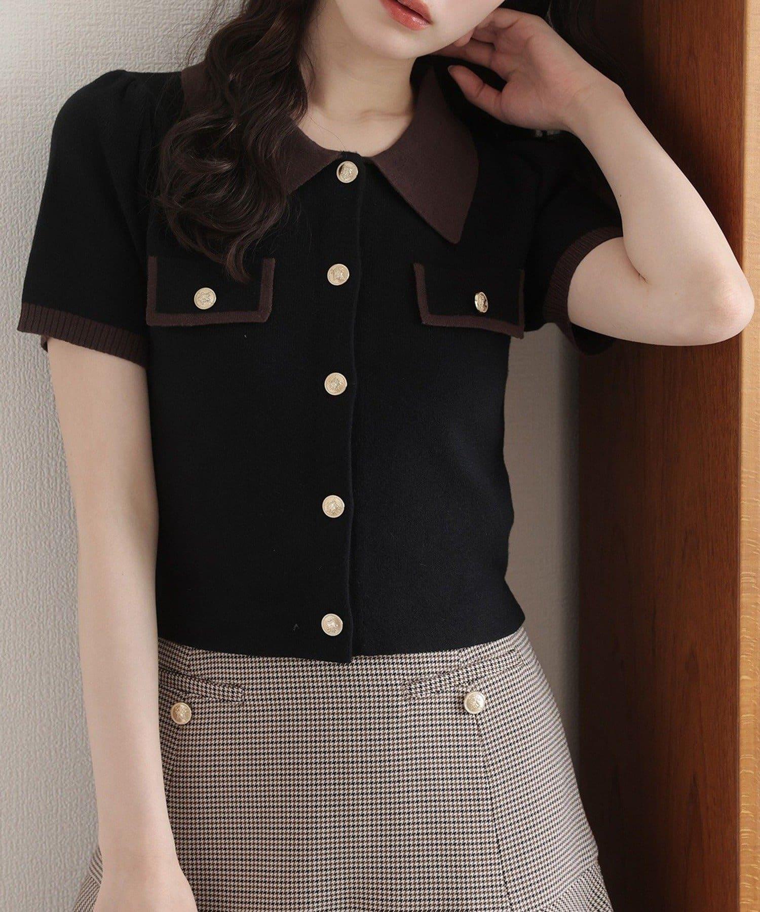 短袖針織上衣,領口設計,配色搶眼,彰顯經典氣質。
