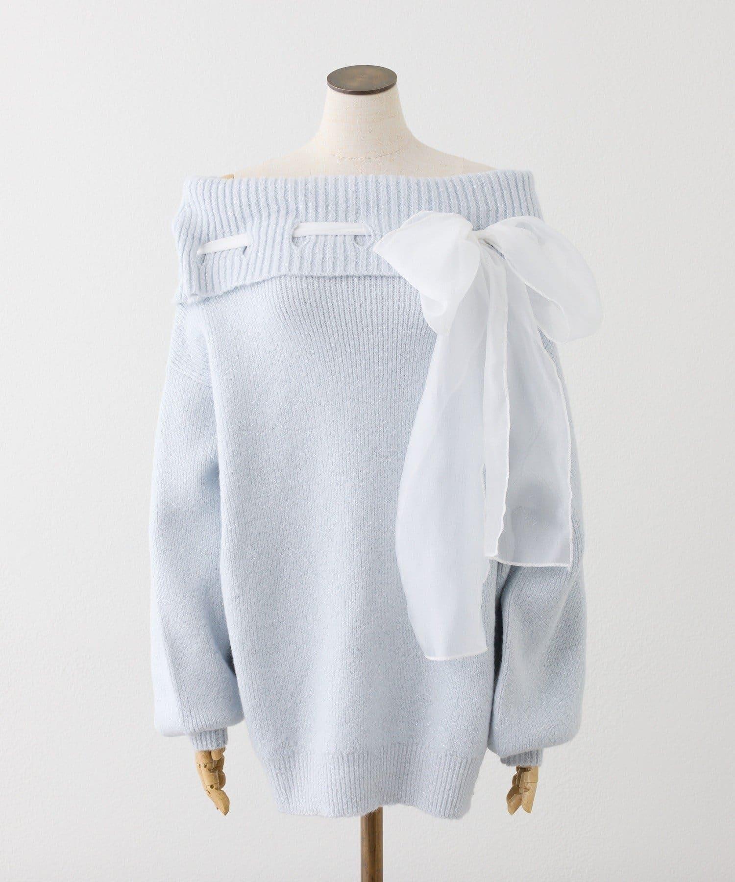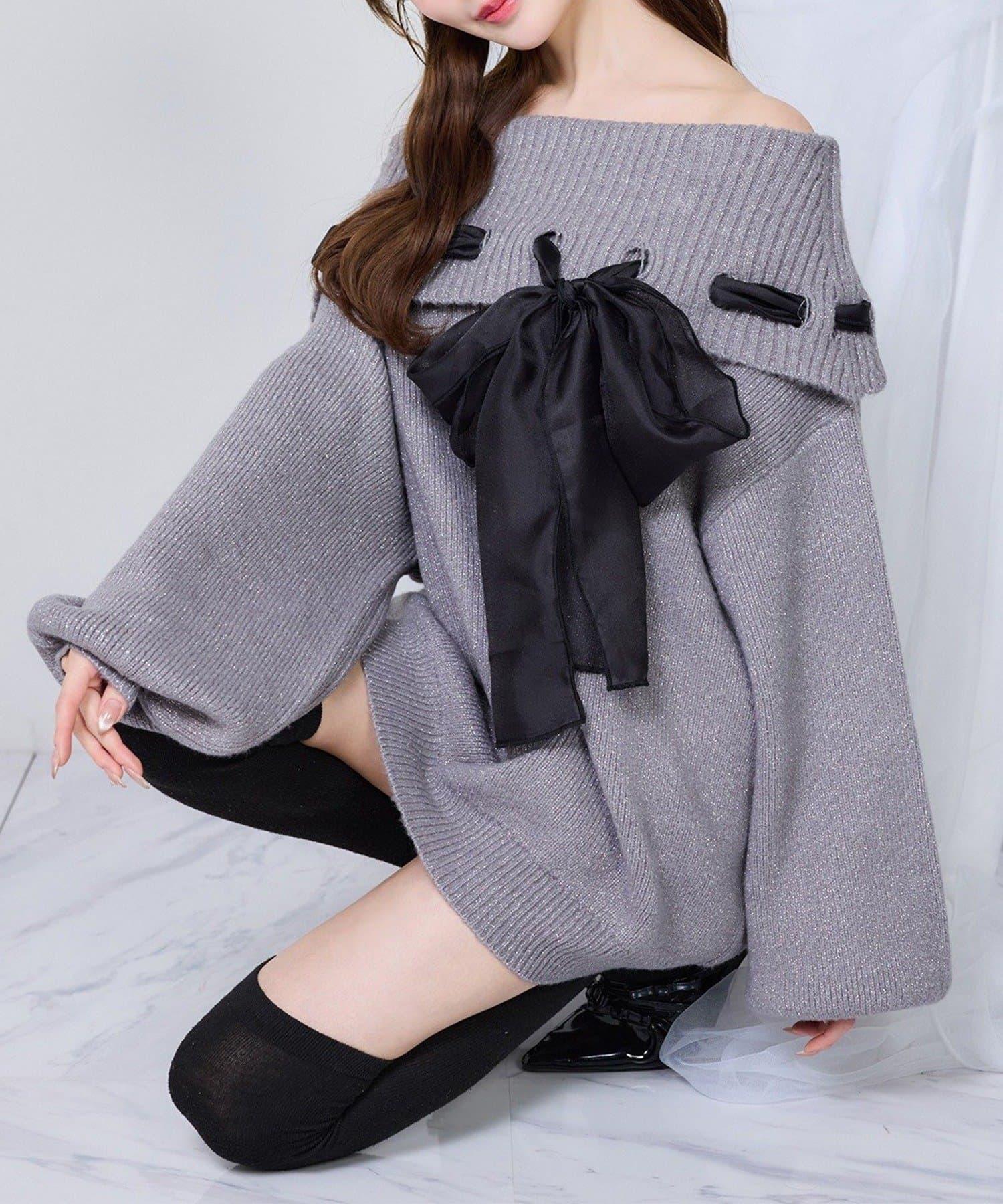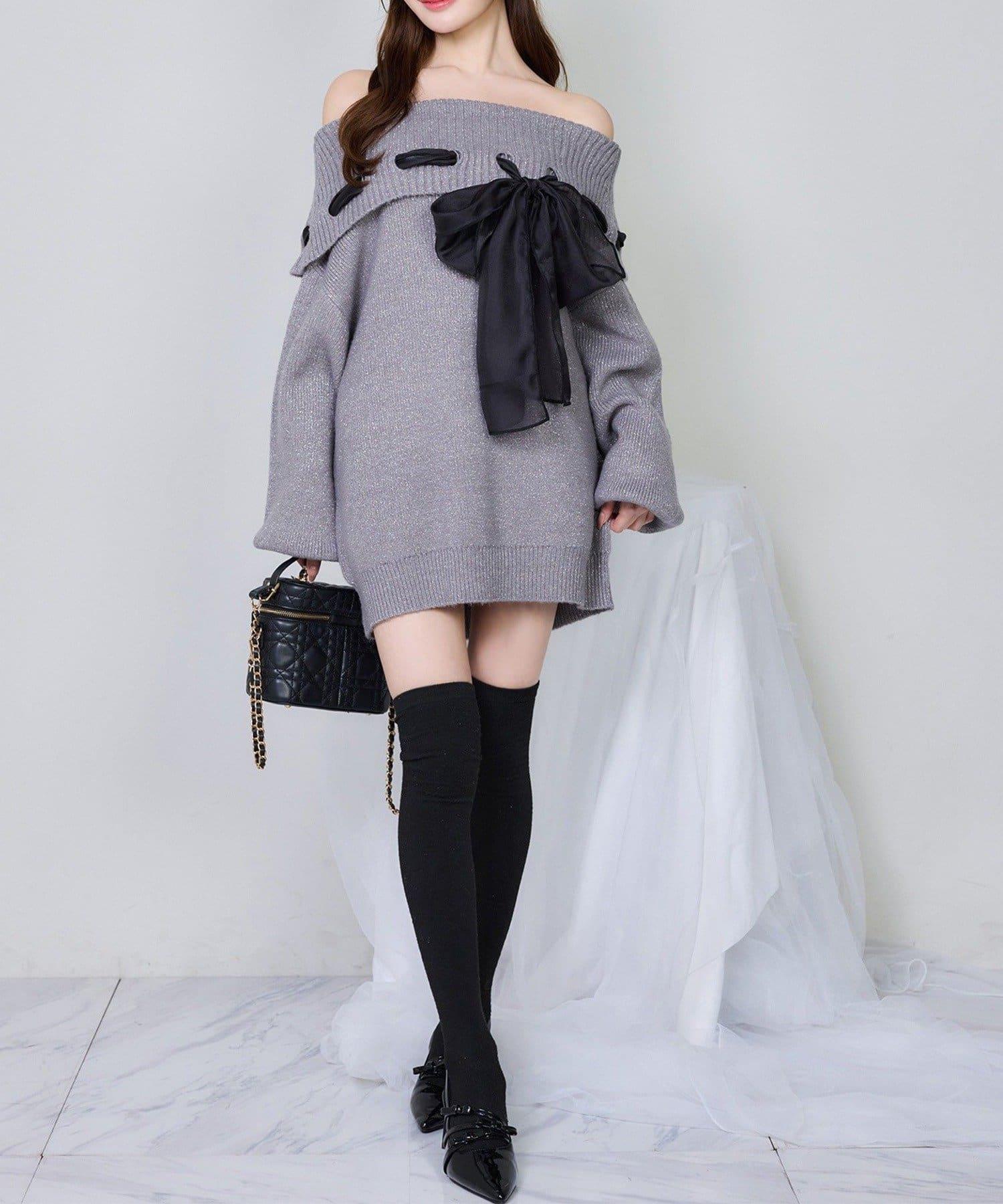 one after another 蝴蝶結裝飾 一字肩 針織連衣裙