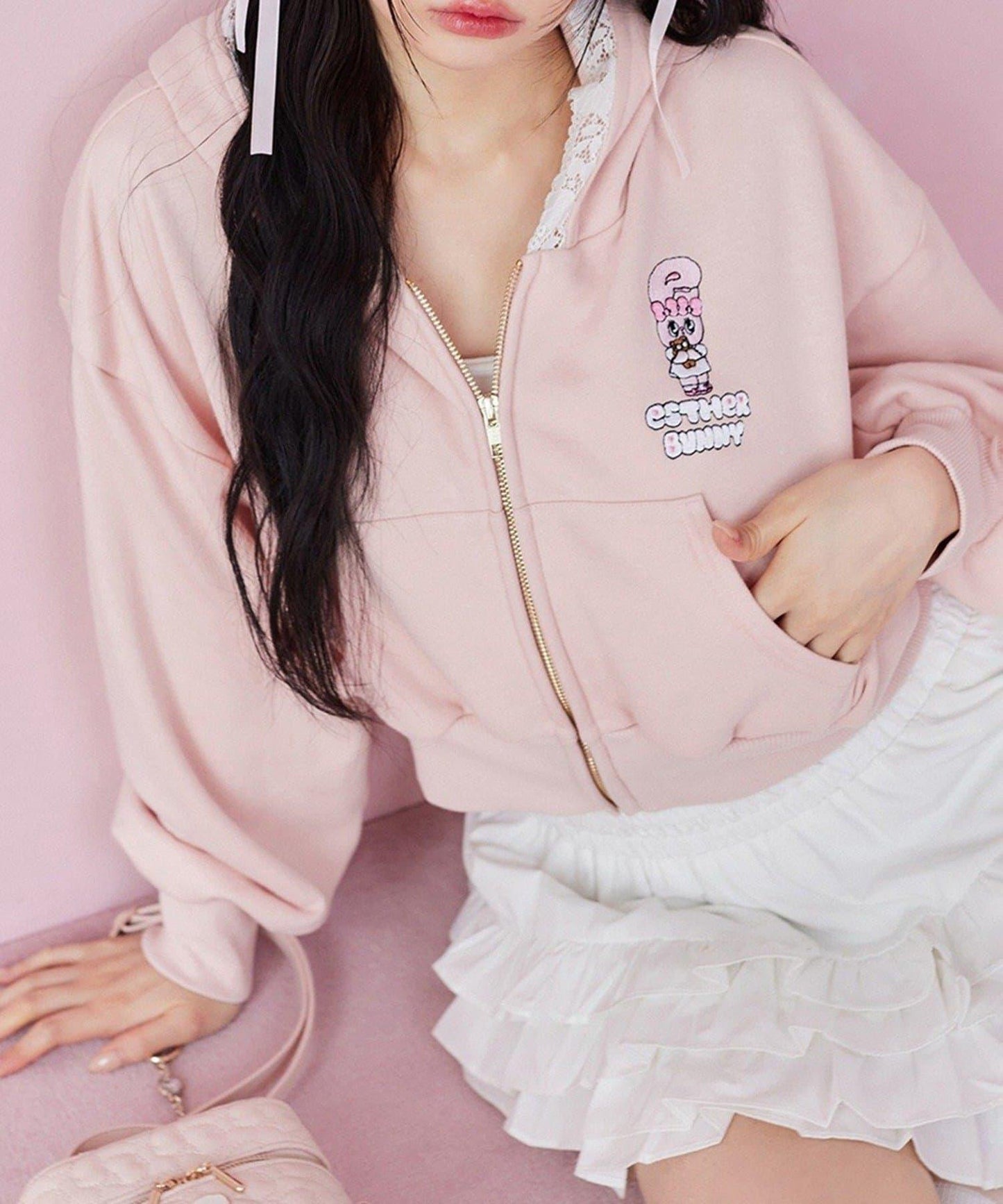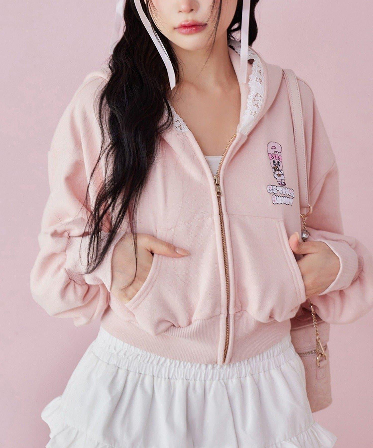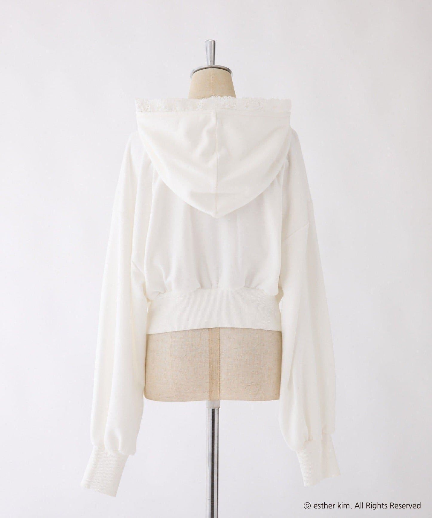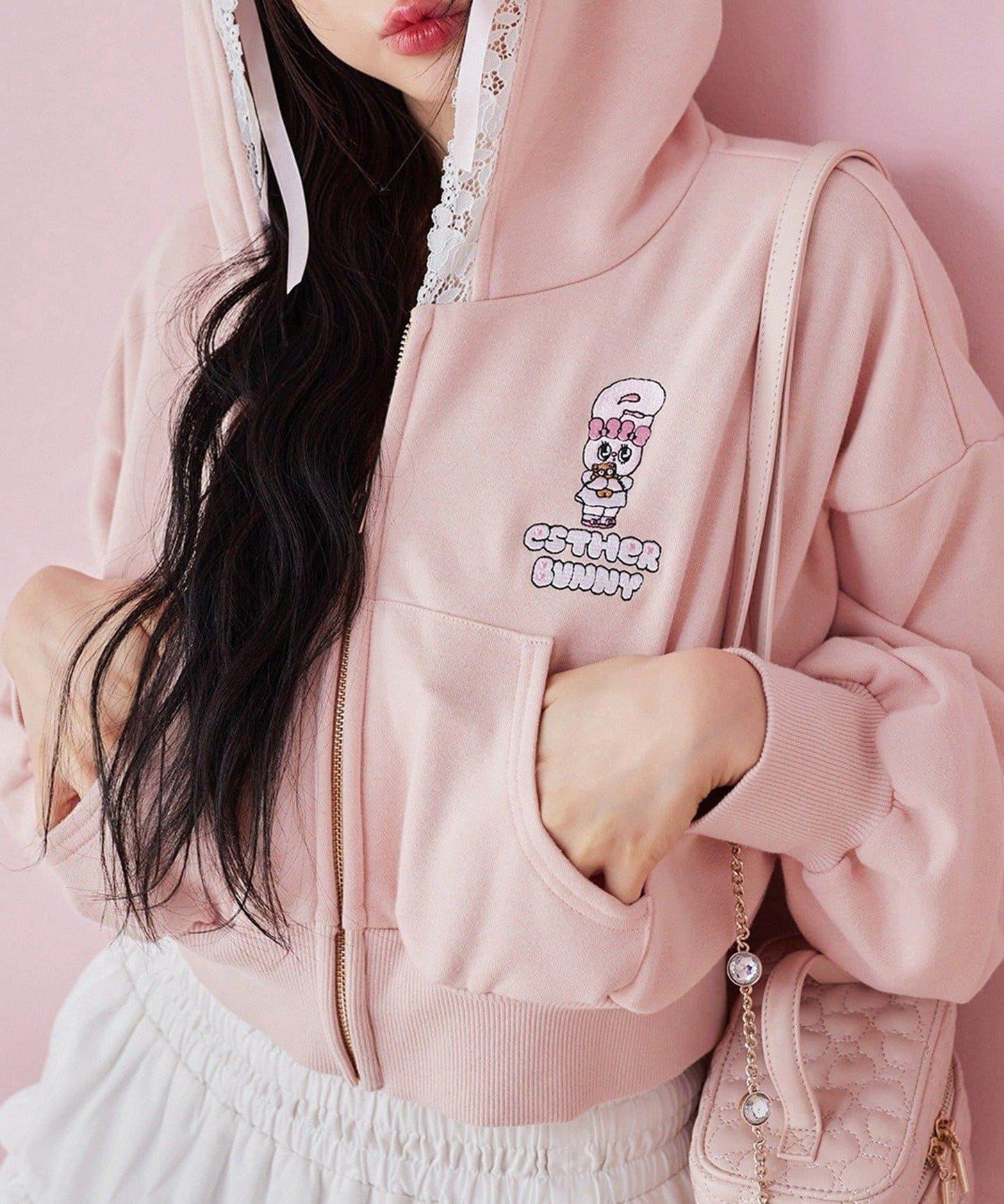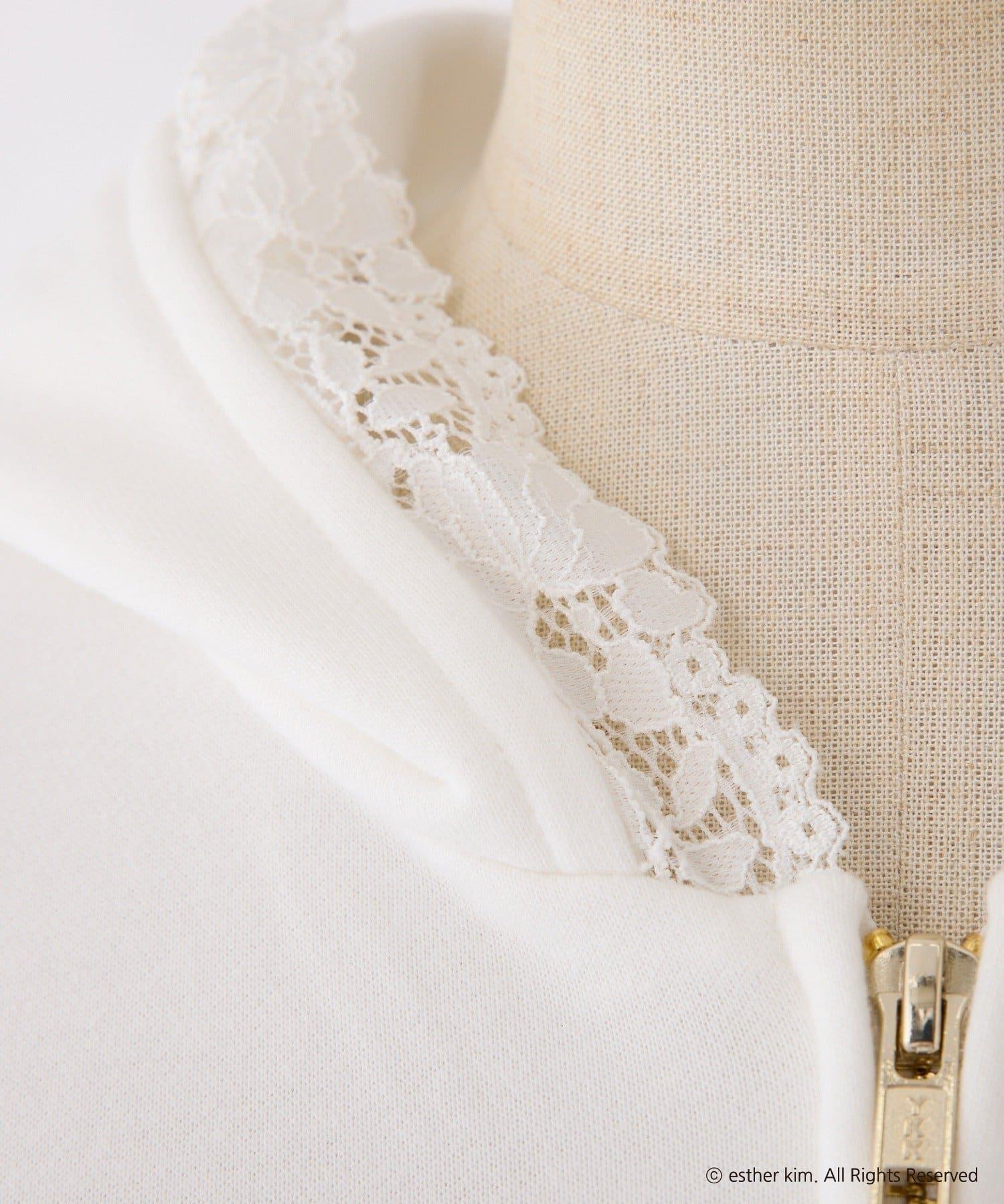 連帽上的蕾絲花邊為這款休閒單品增添了甜美氣息。