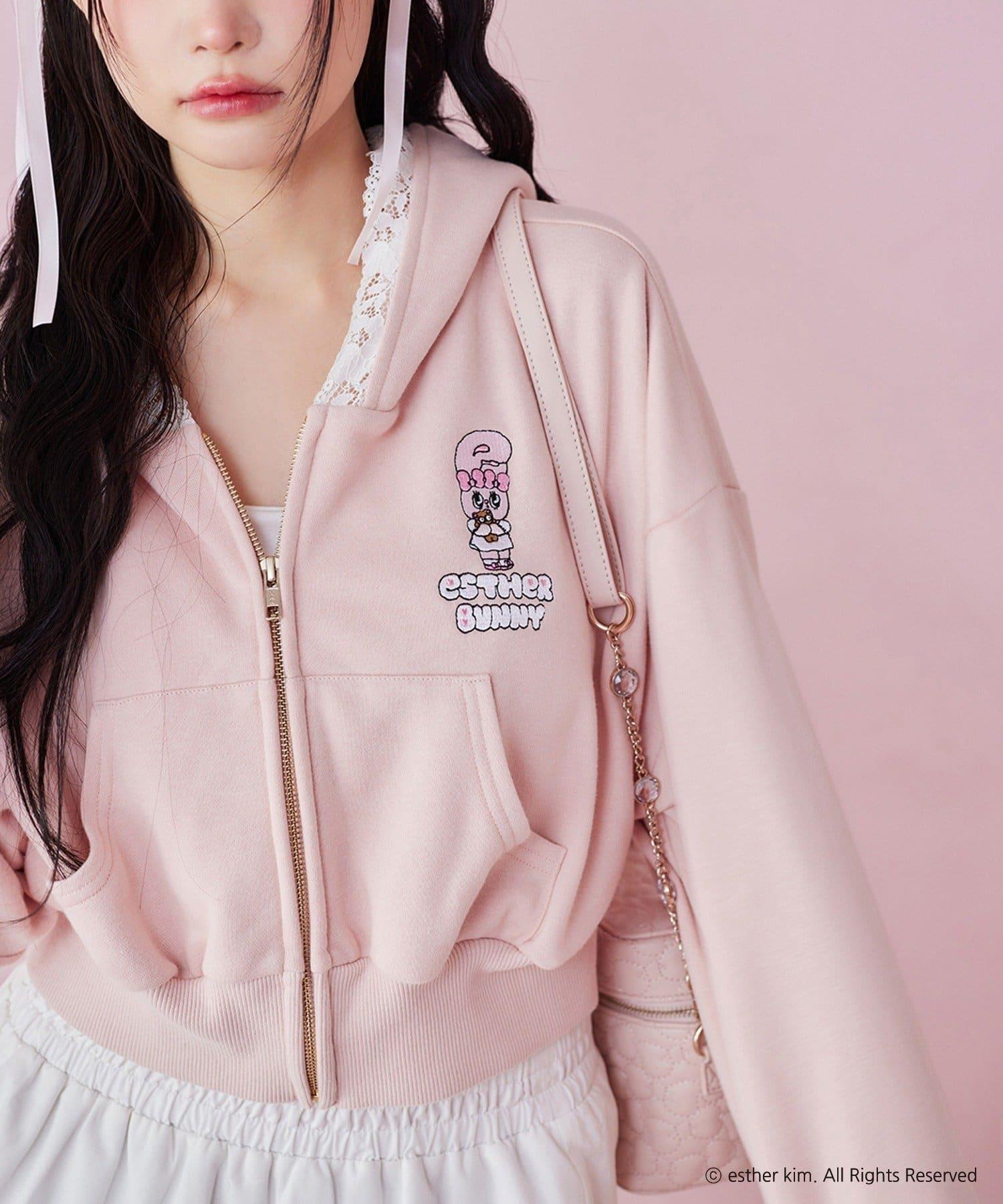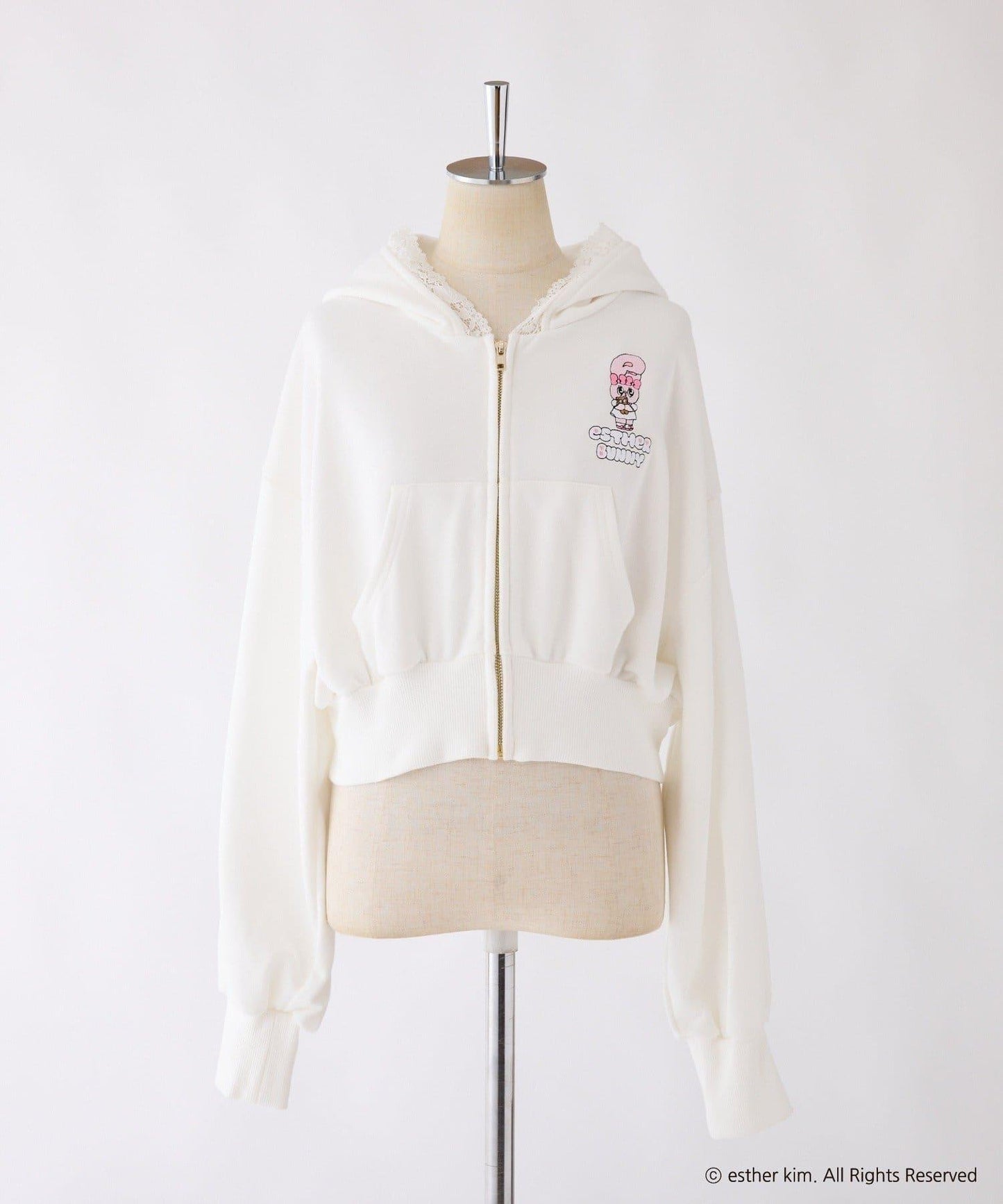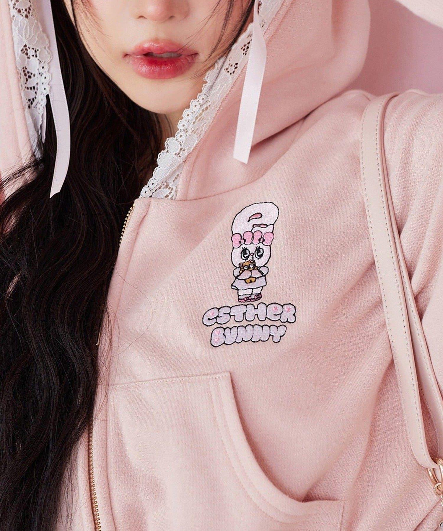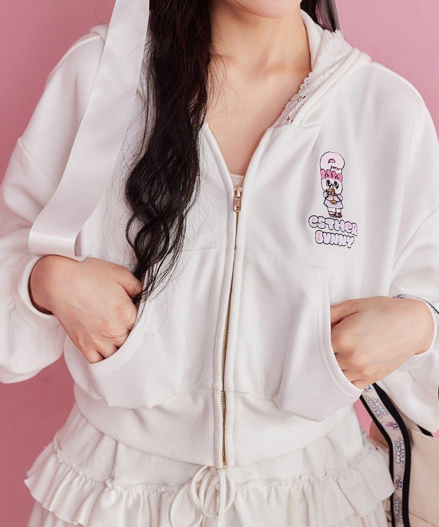 連帽上的蕾絲花邊為這款休閒單品增添了甜美氣息。