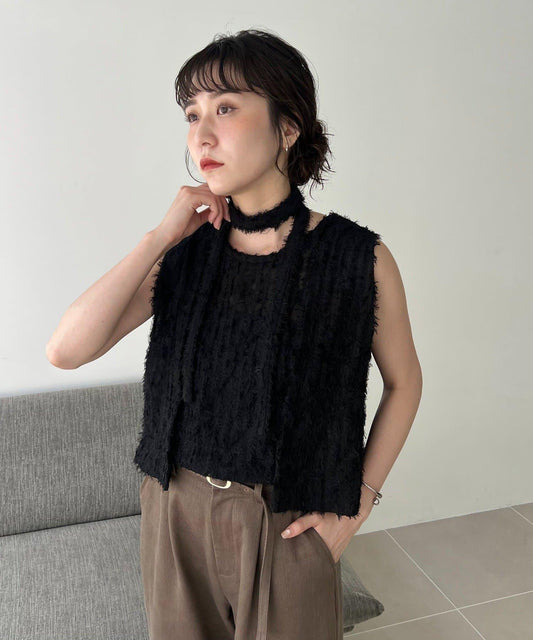 有兩種顏色可供選擇:別緻的黑色和棕色,因其通透性而引人注目。蝴蝶結領帶是套裝的一部分,既可以繞在脖子上,也可以用作腰間的緞帶,就像今年一樣。