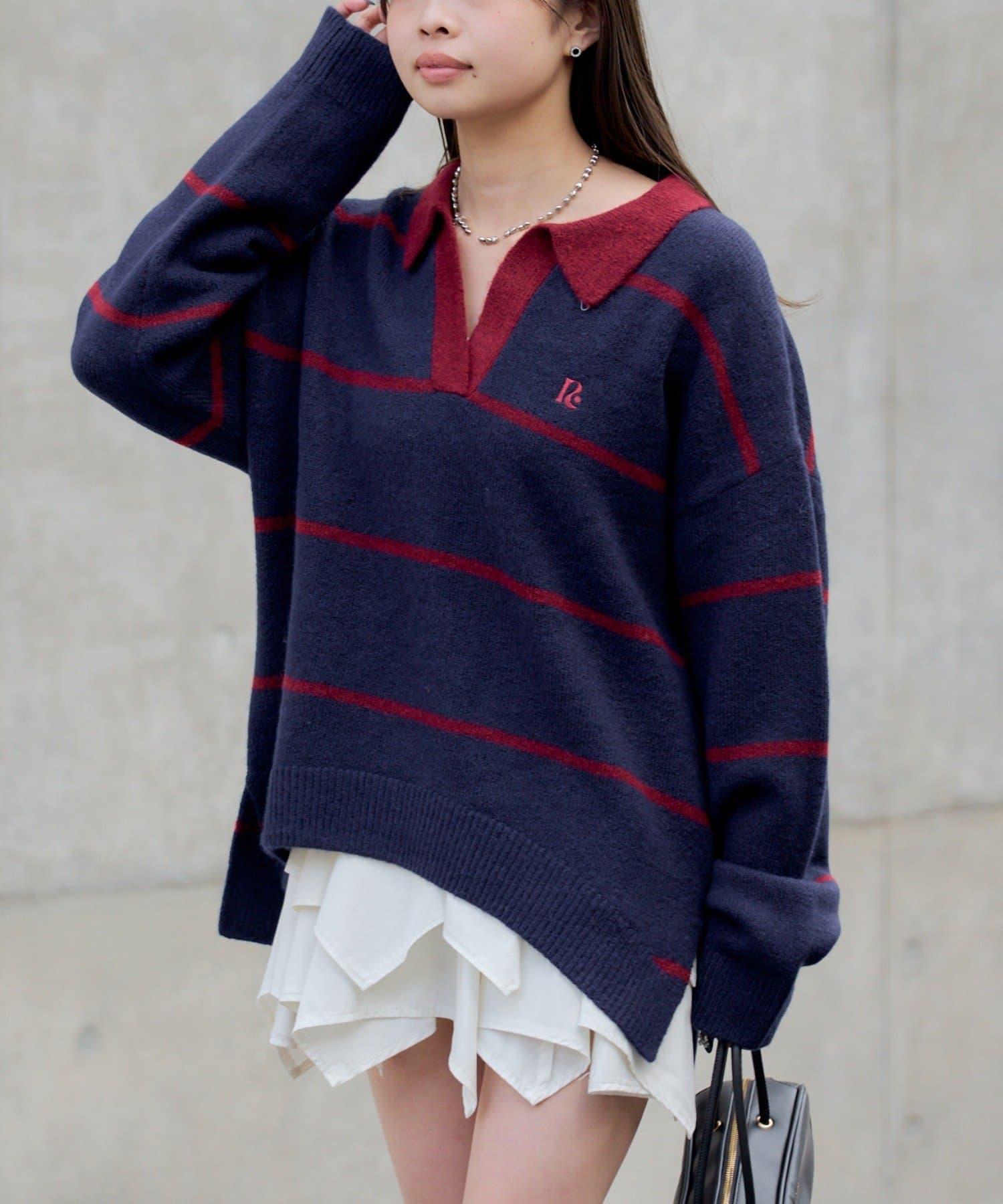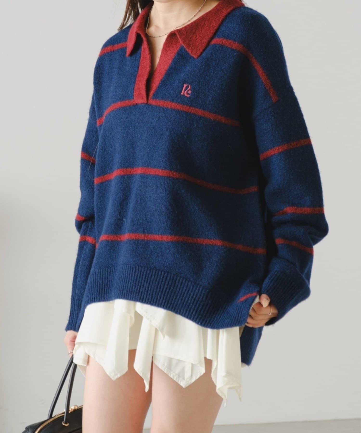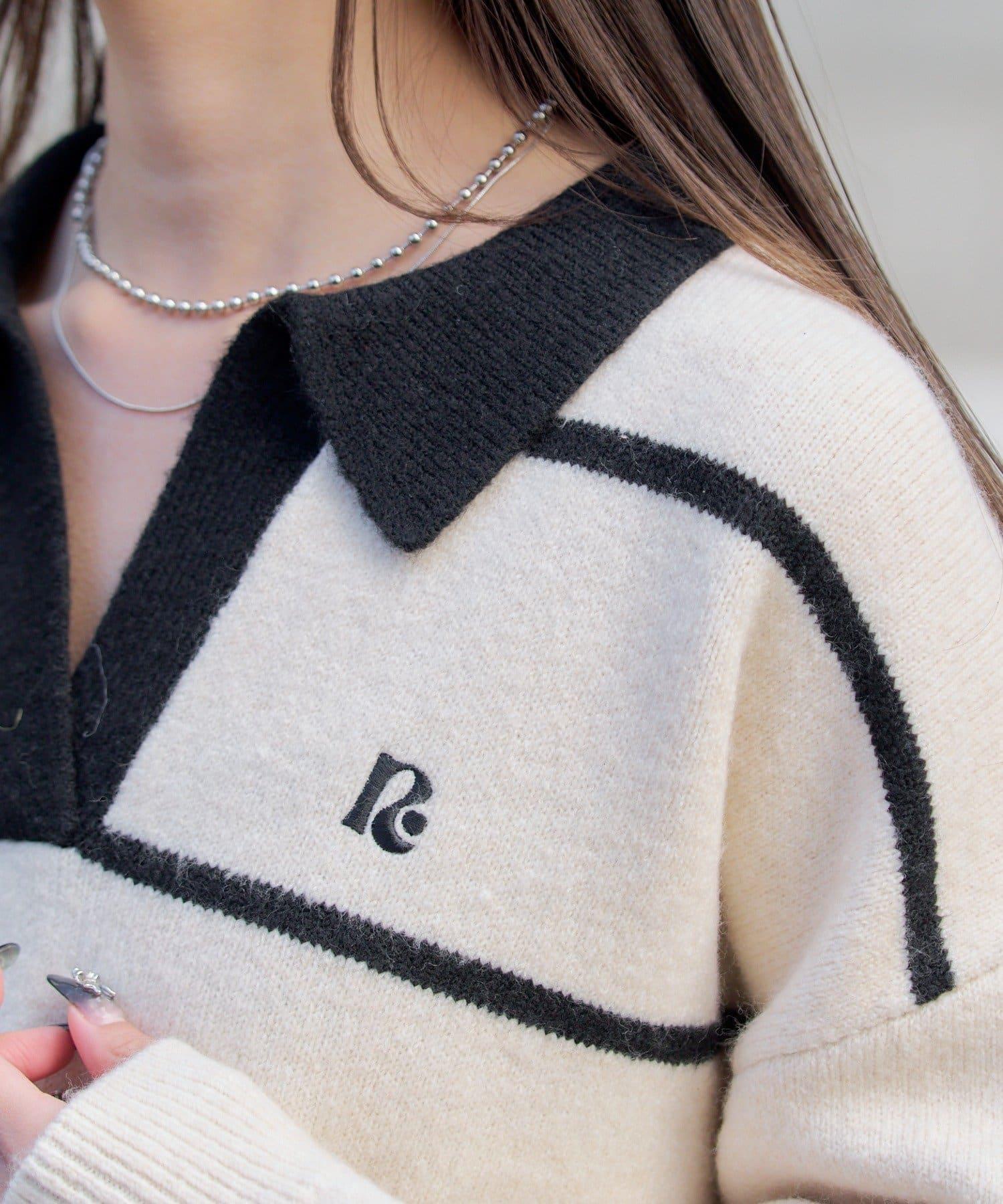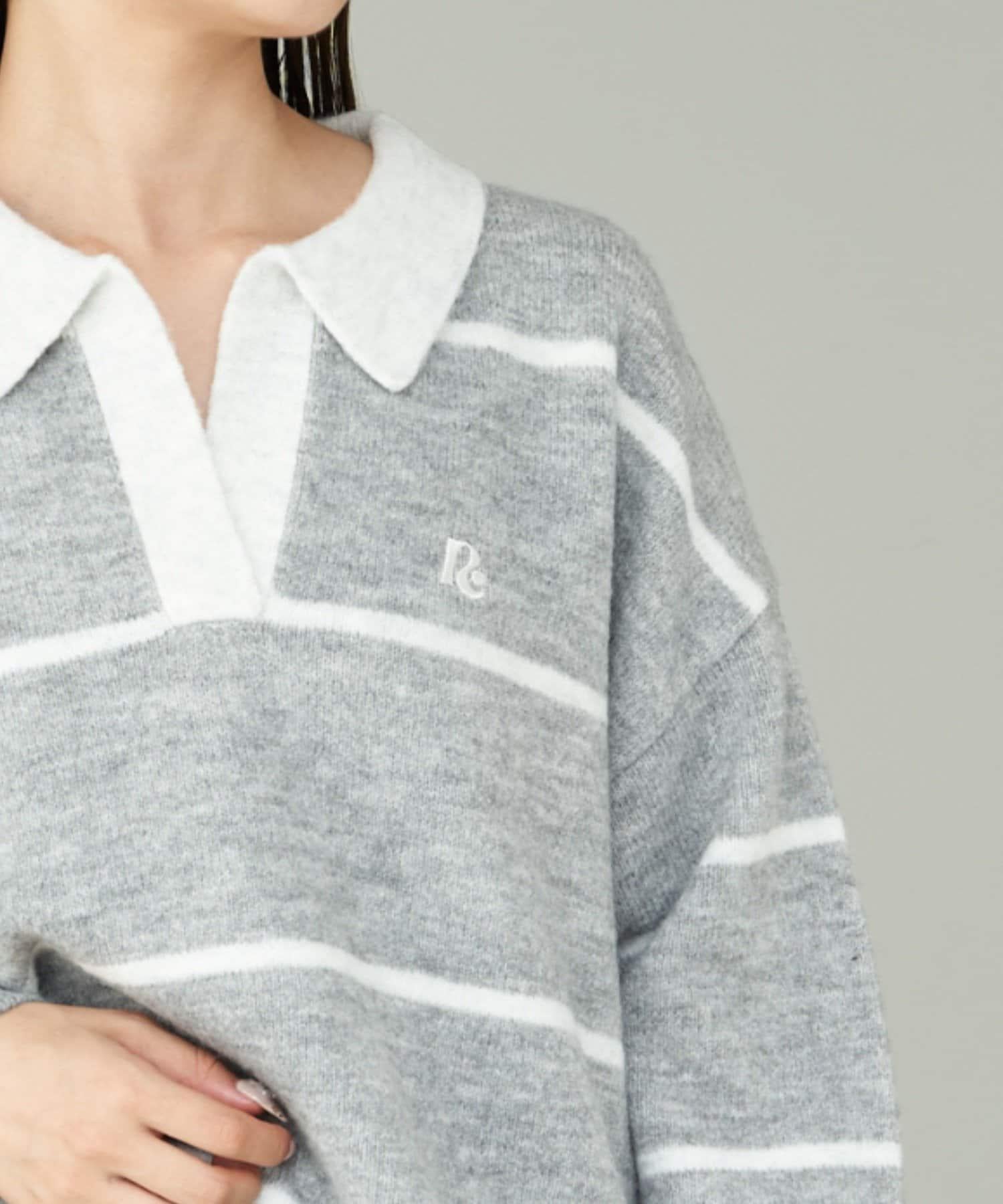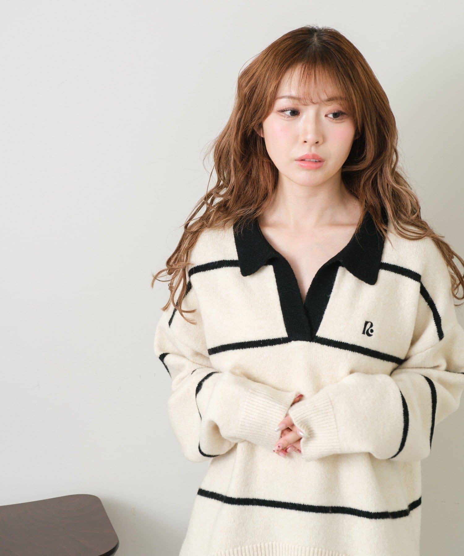 【RAY CASSIN】條紋V領POLO刺繡針織衫 / 翻領針織衫