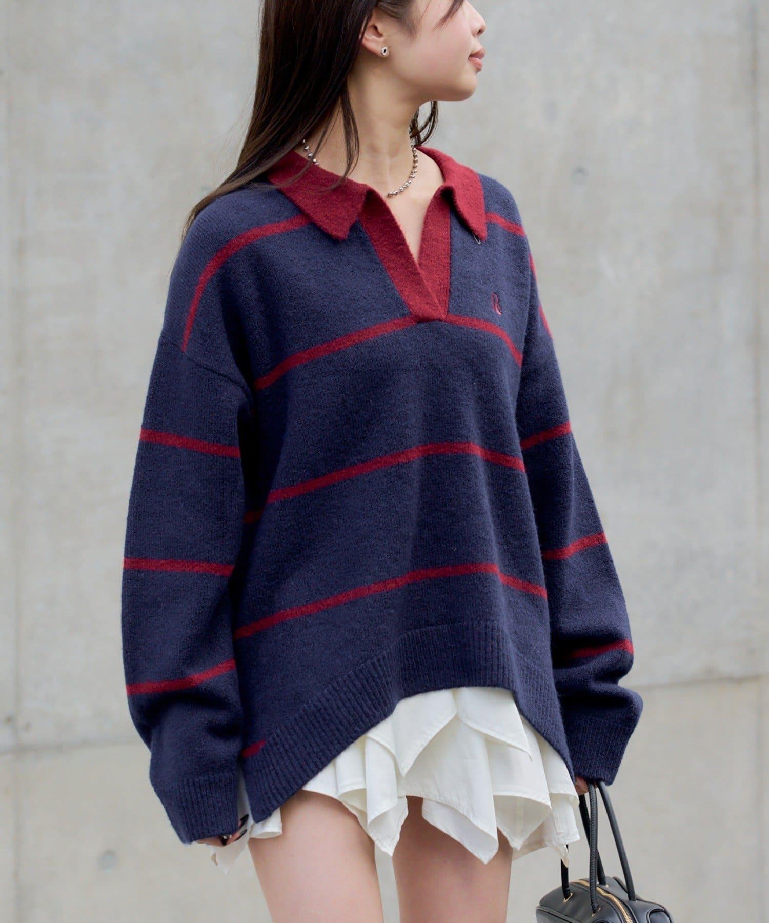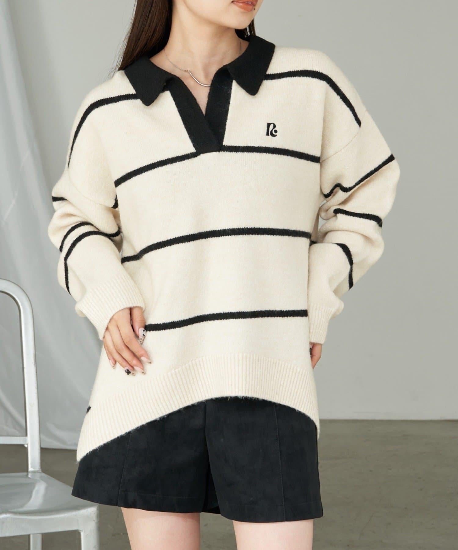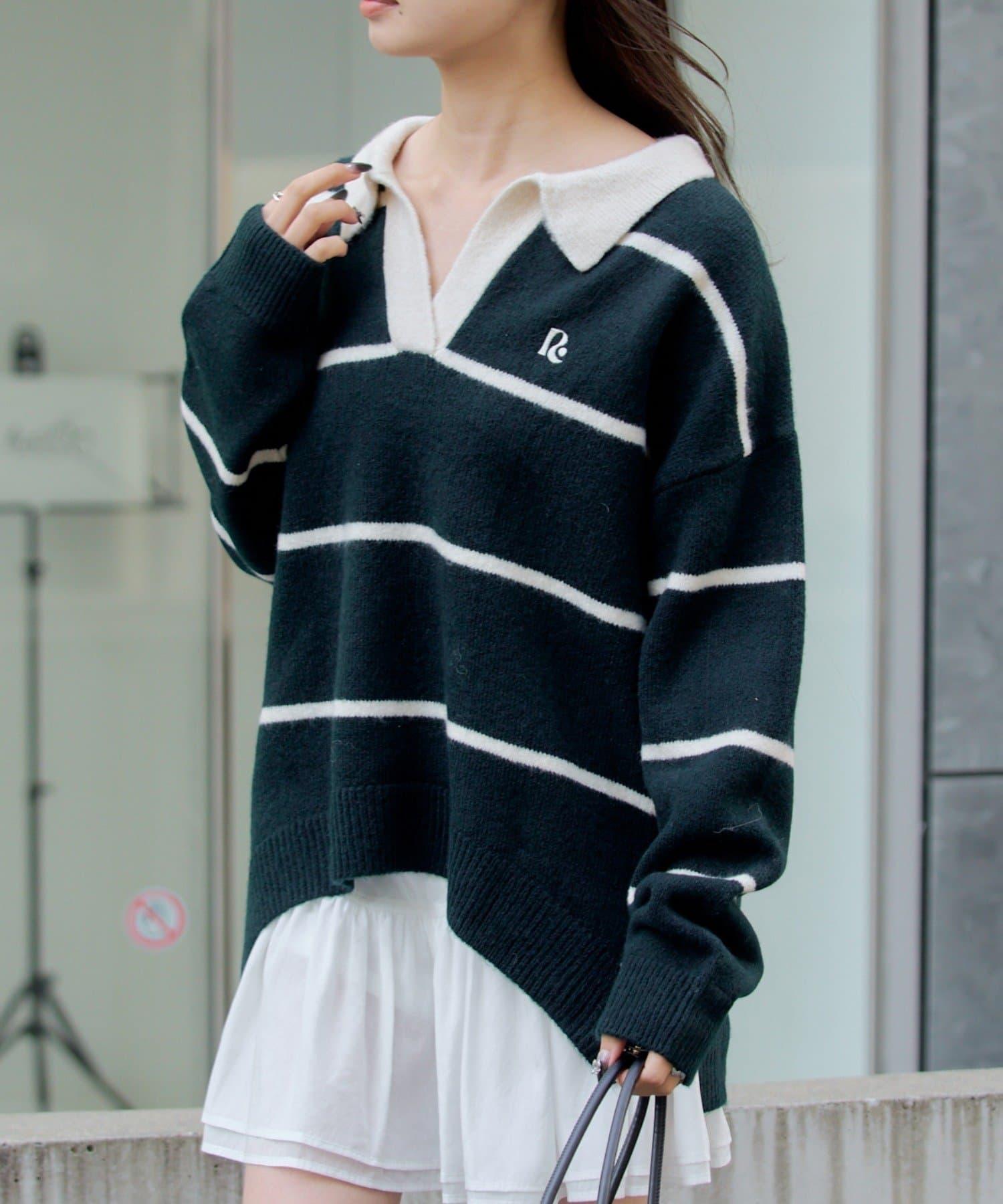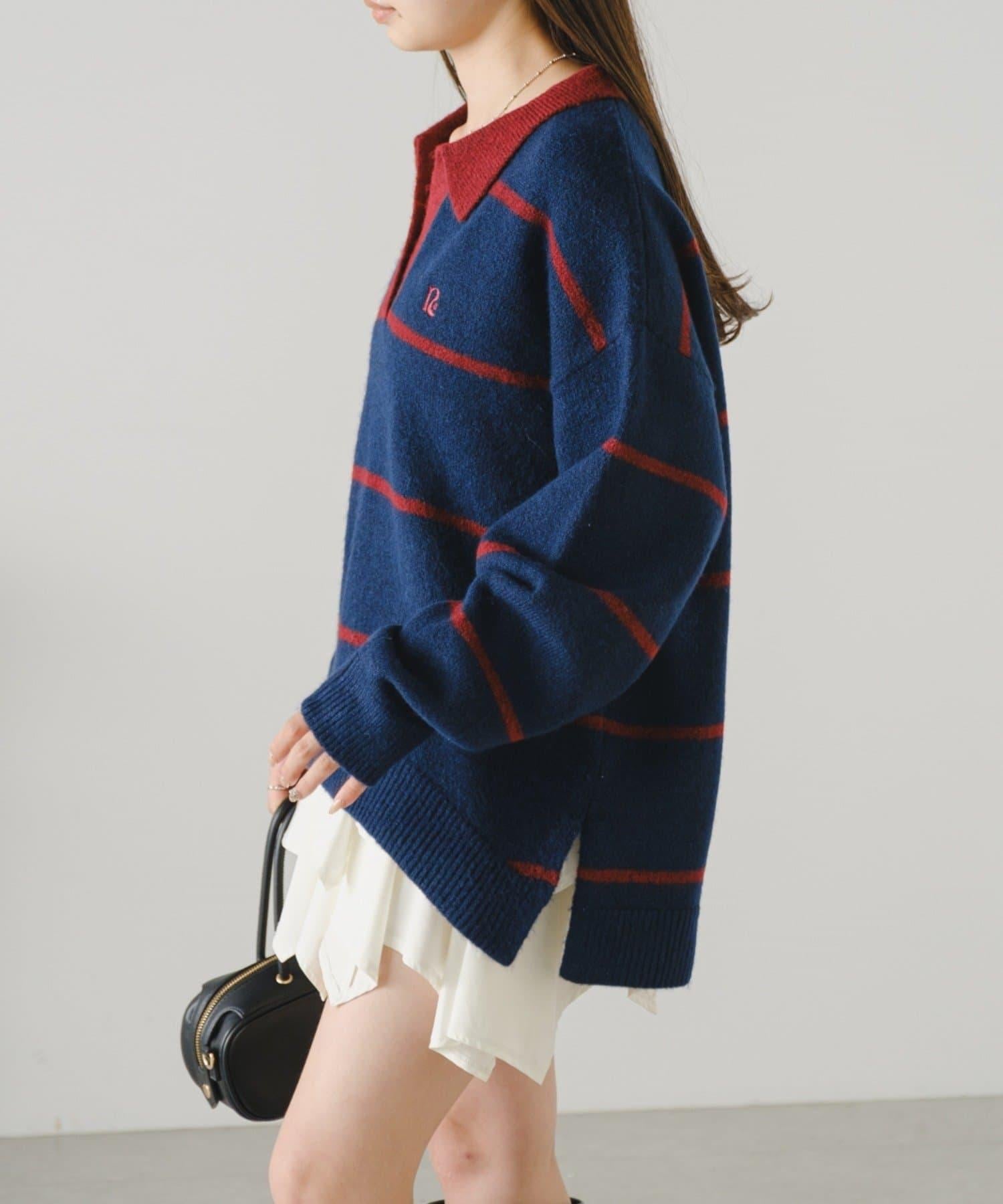 【RAY CASSIN】條紋V領POLO刺繡針織衫 / 翻領針織衫