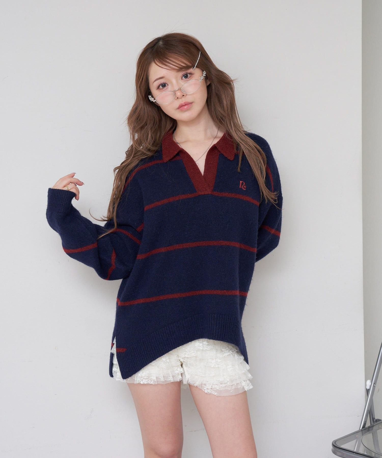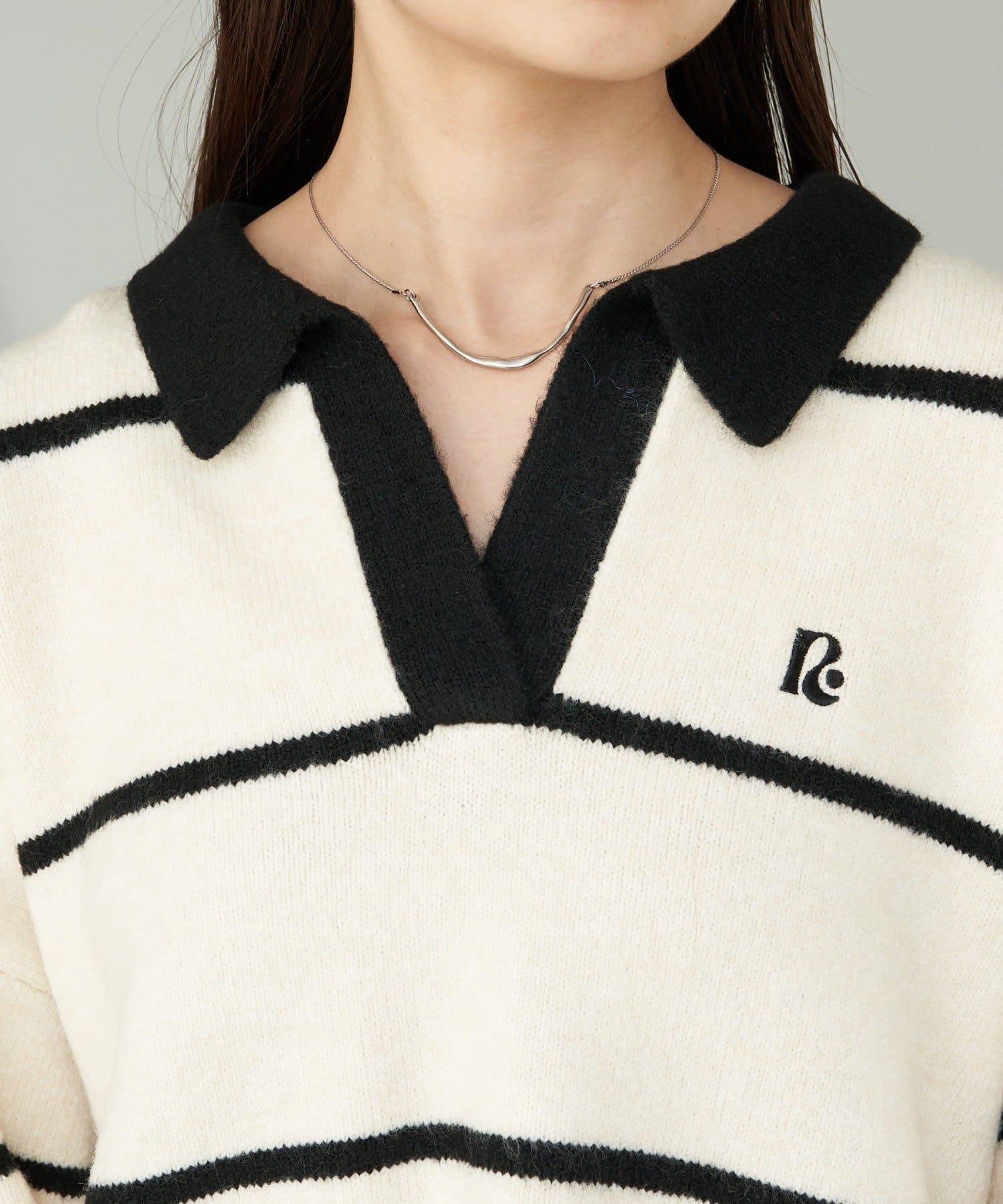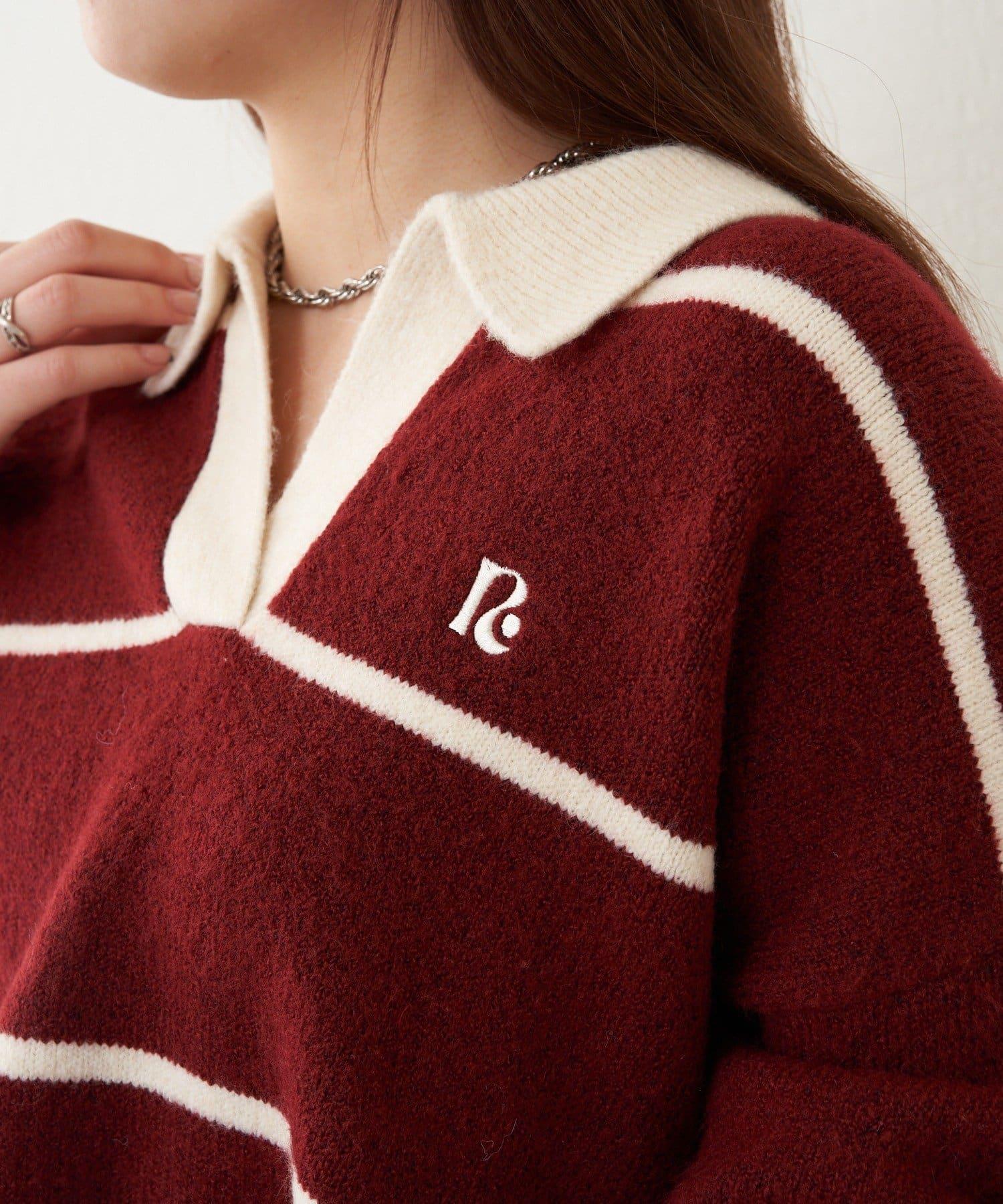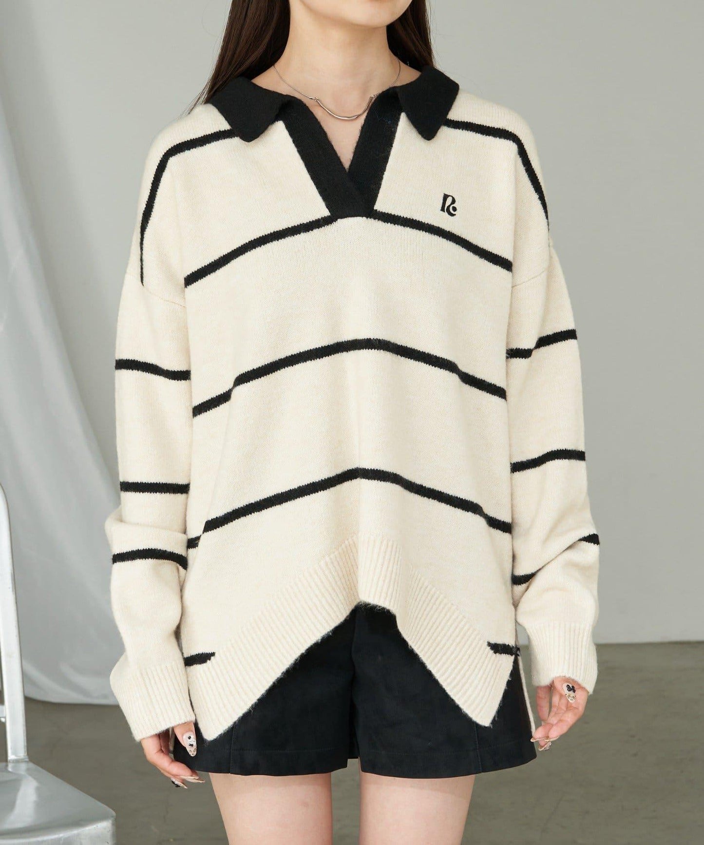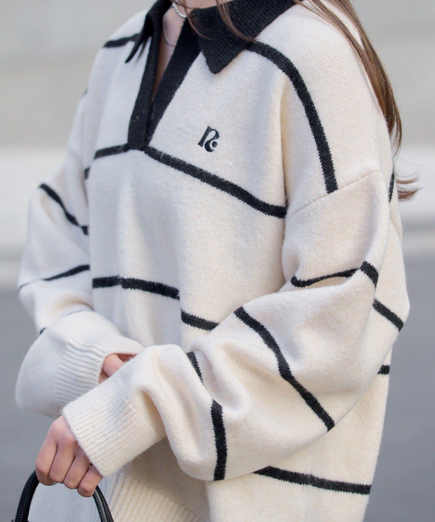【RAY CASSIN】條紋V領POLO刺繡針織衫 / 翻領針織衫