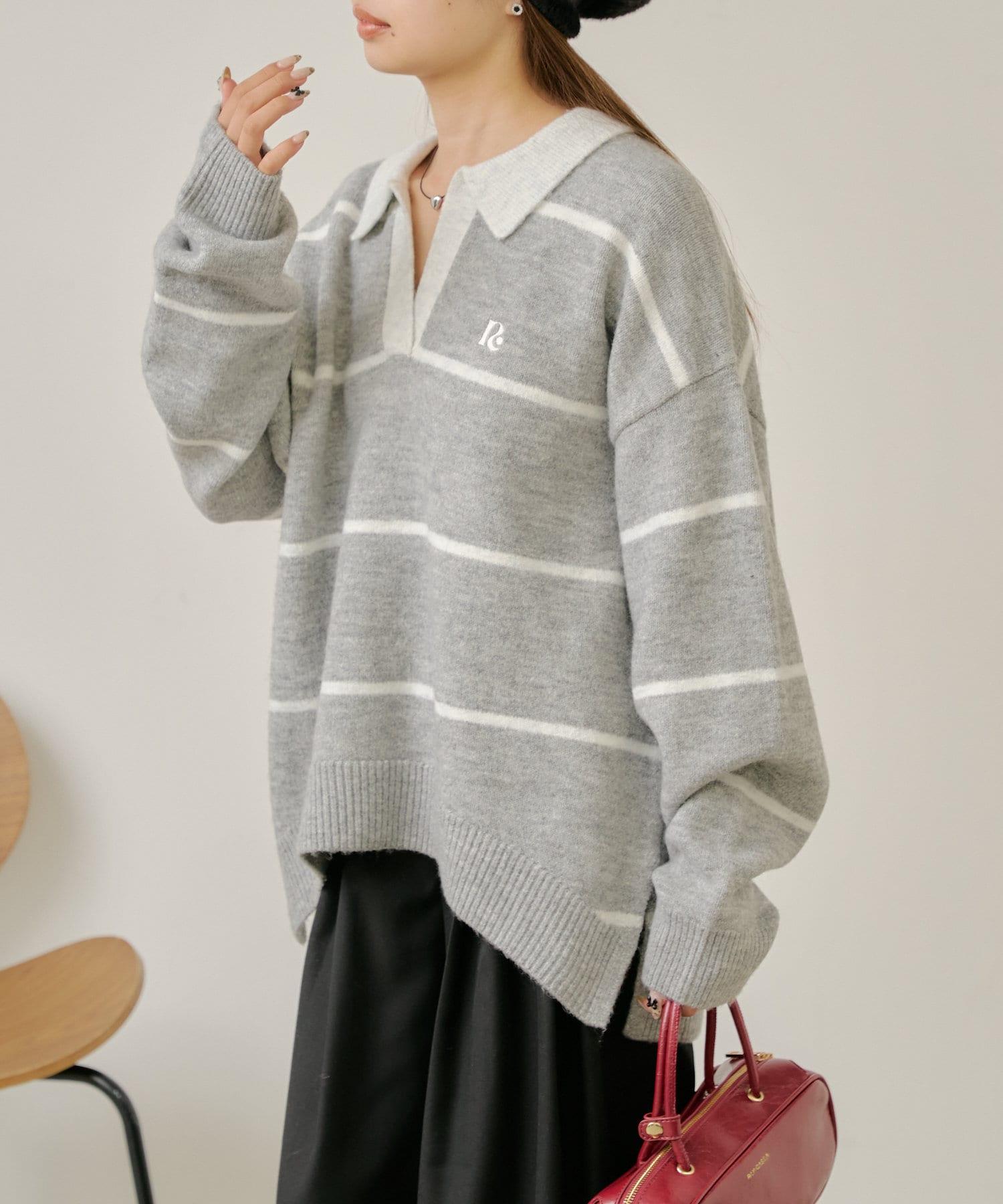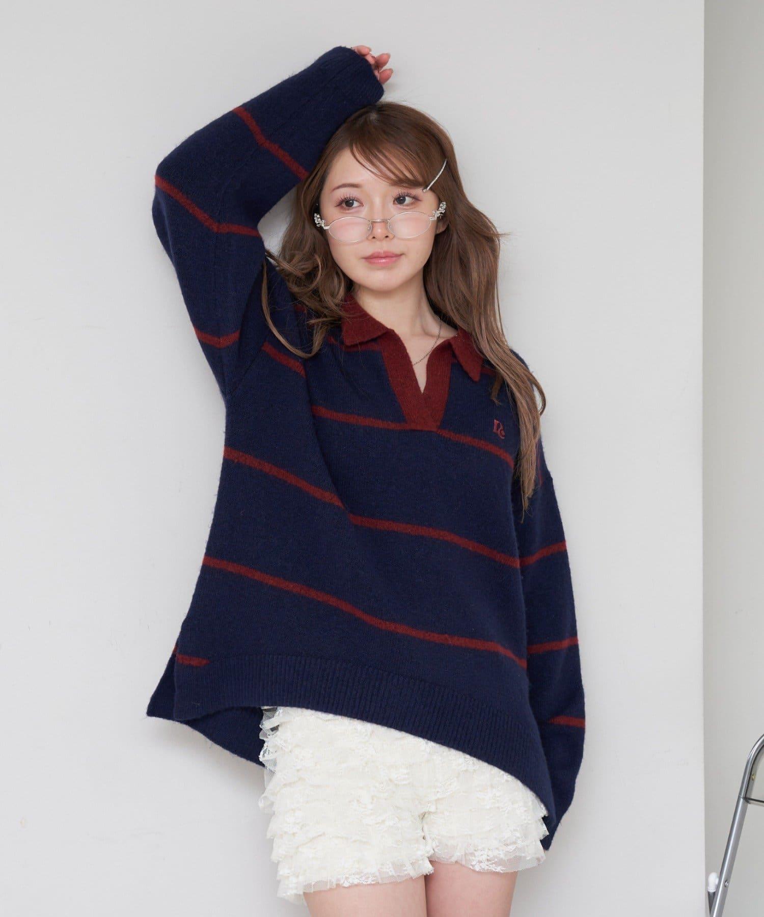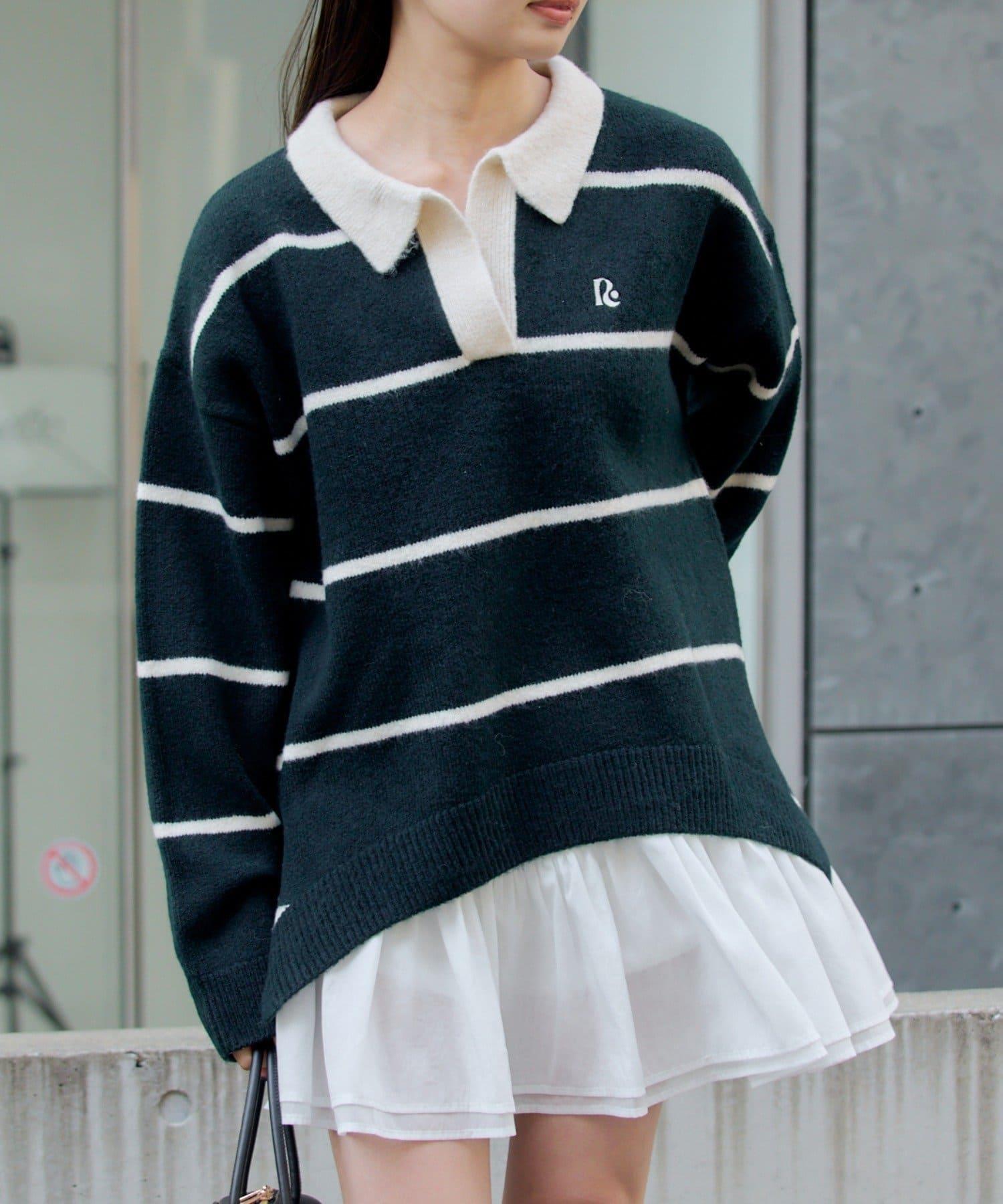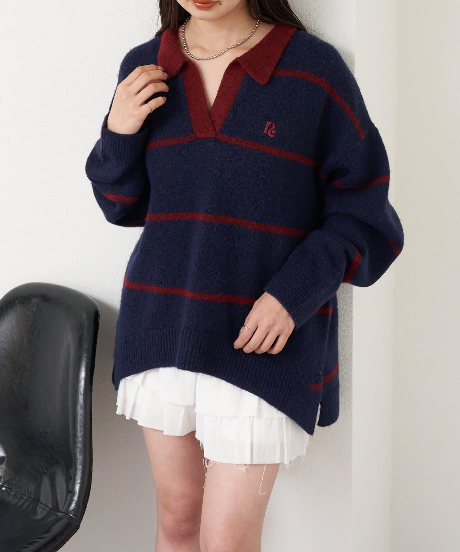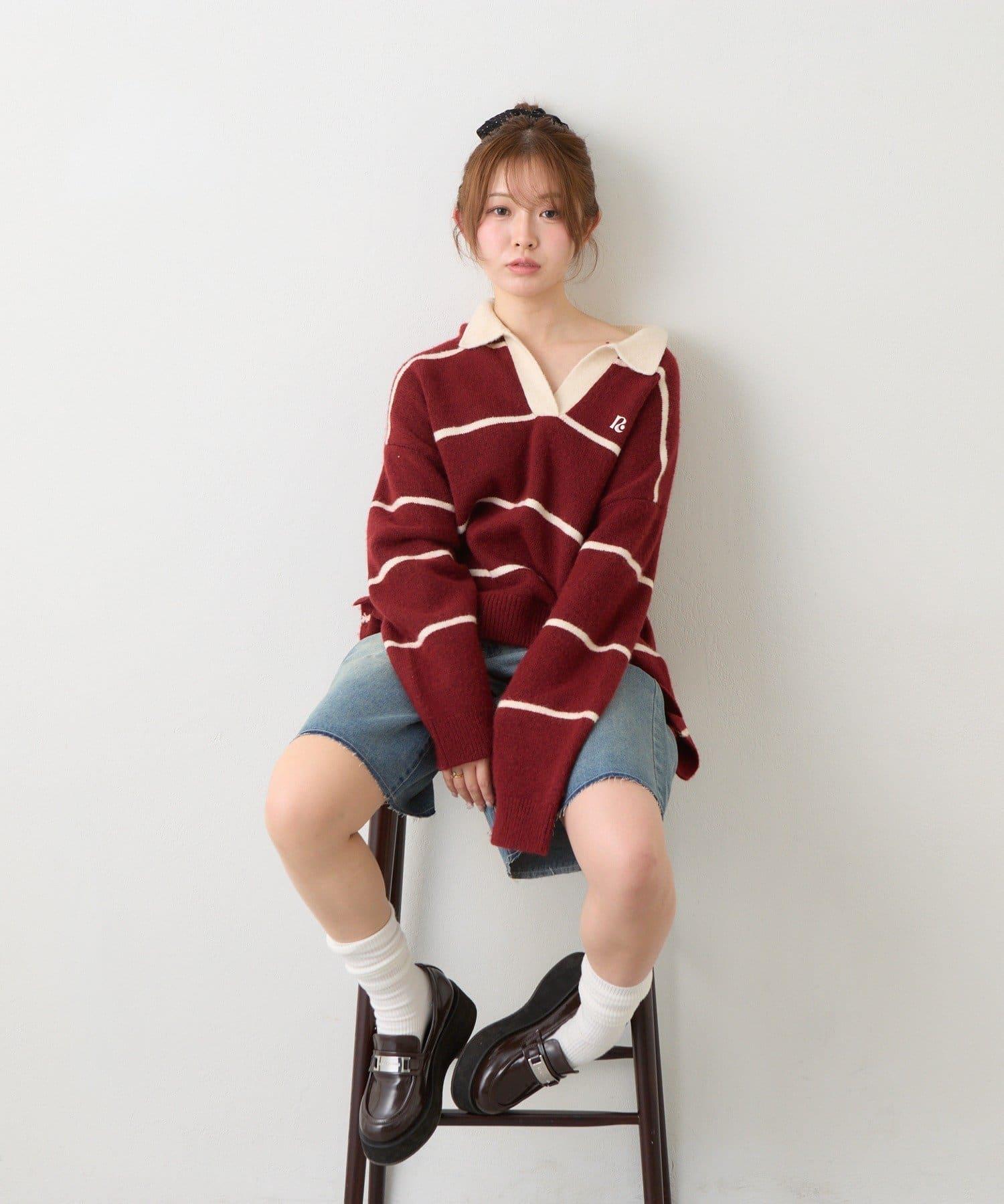 【RAY CASSIN】條紋V領POLO刺繡針織衫 / 翻領針織衫