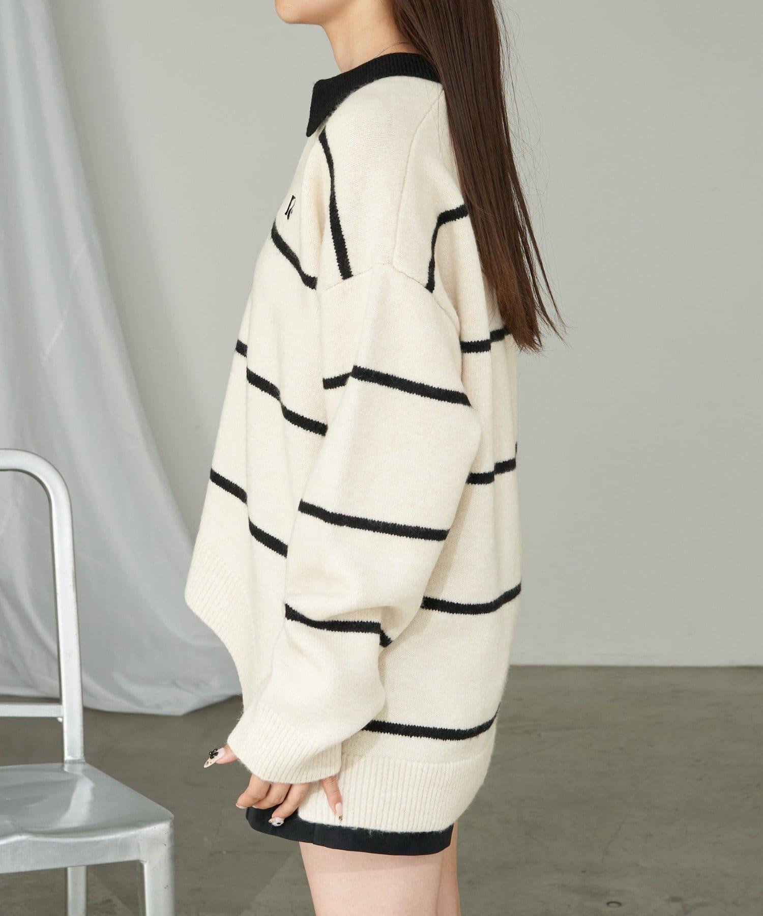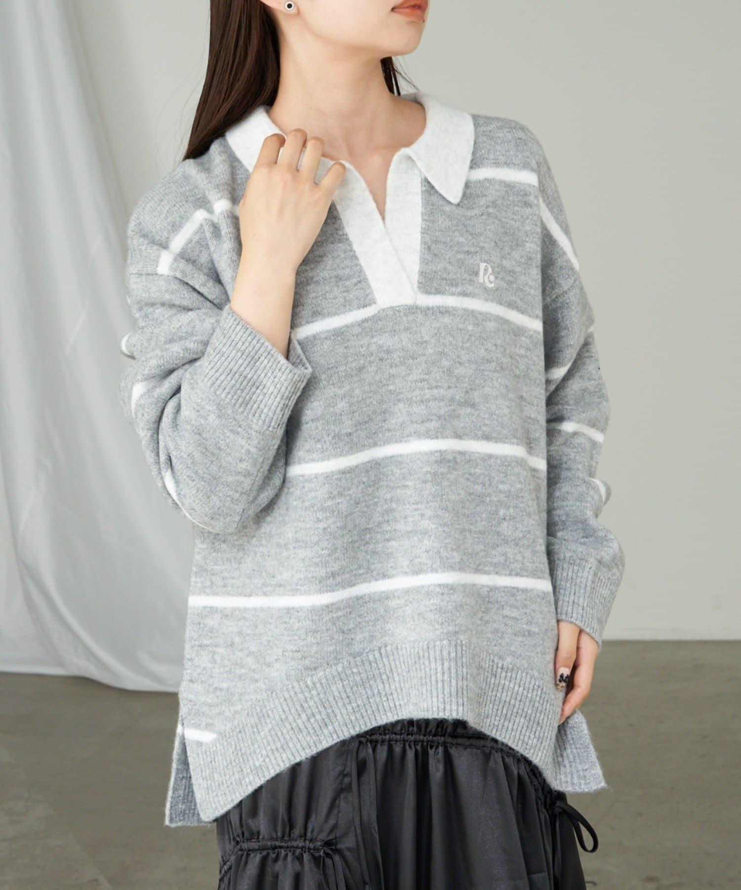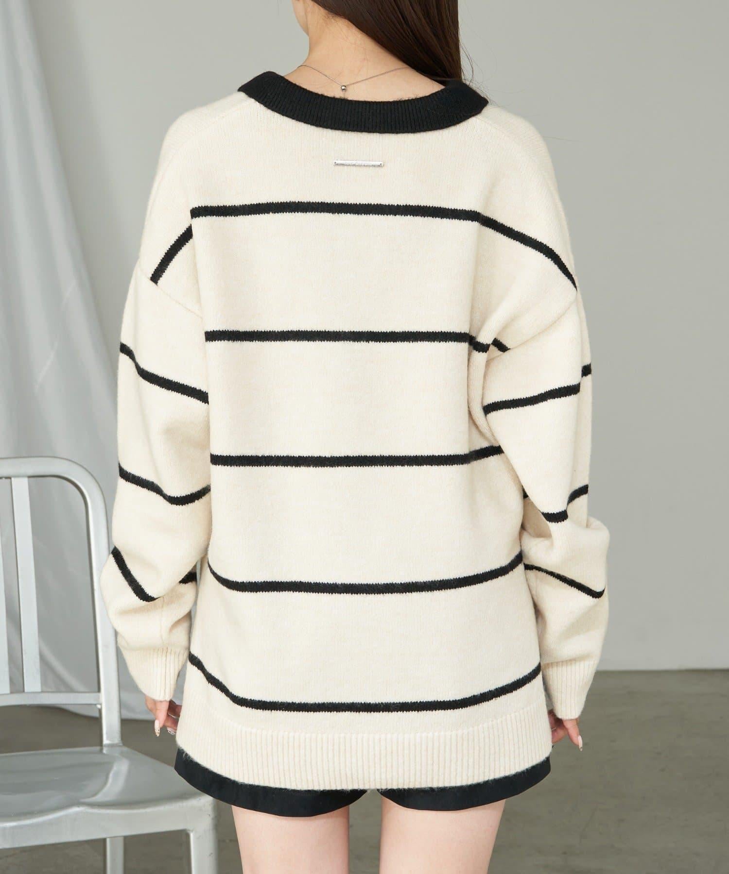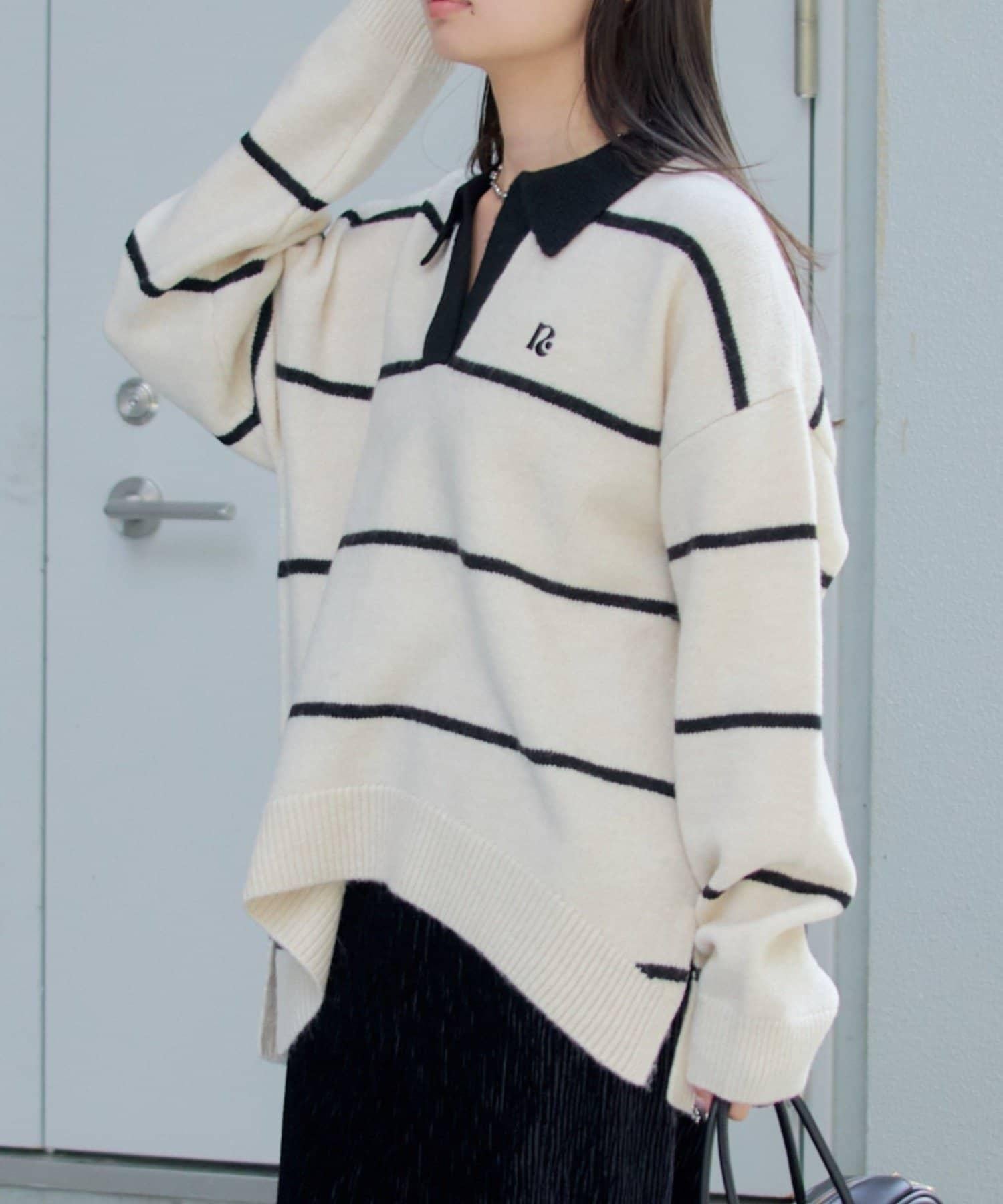 【RAY CASSIN】條紋V領POLO刺繡針織衫 / 翻領針織衫