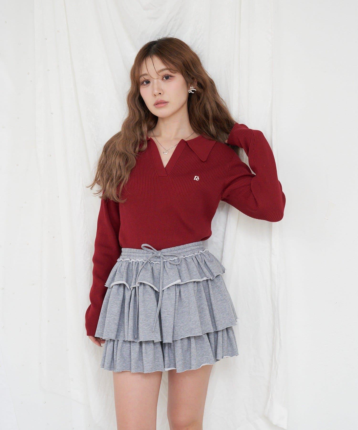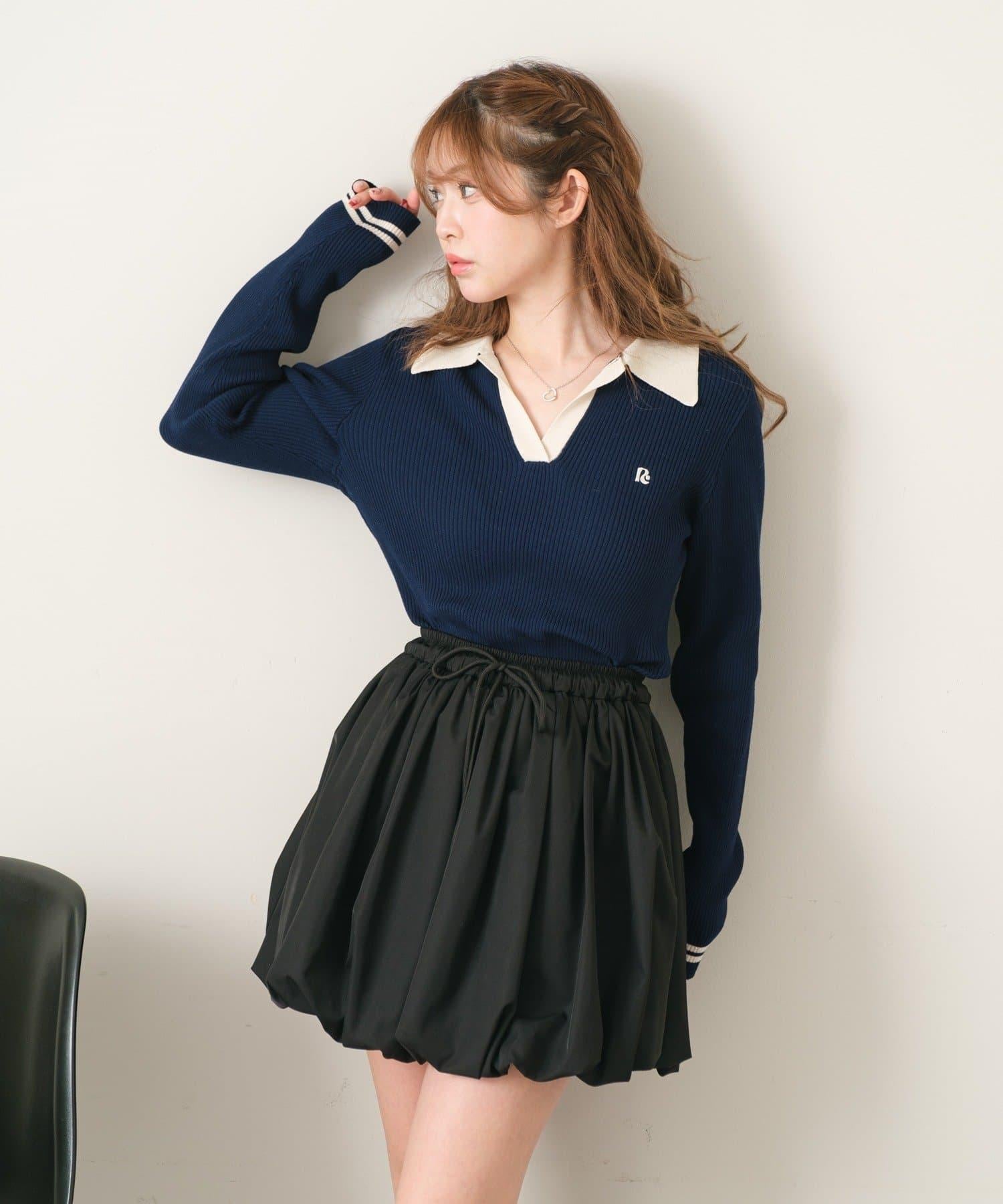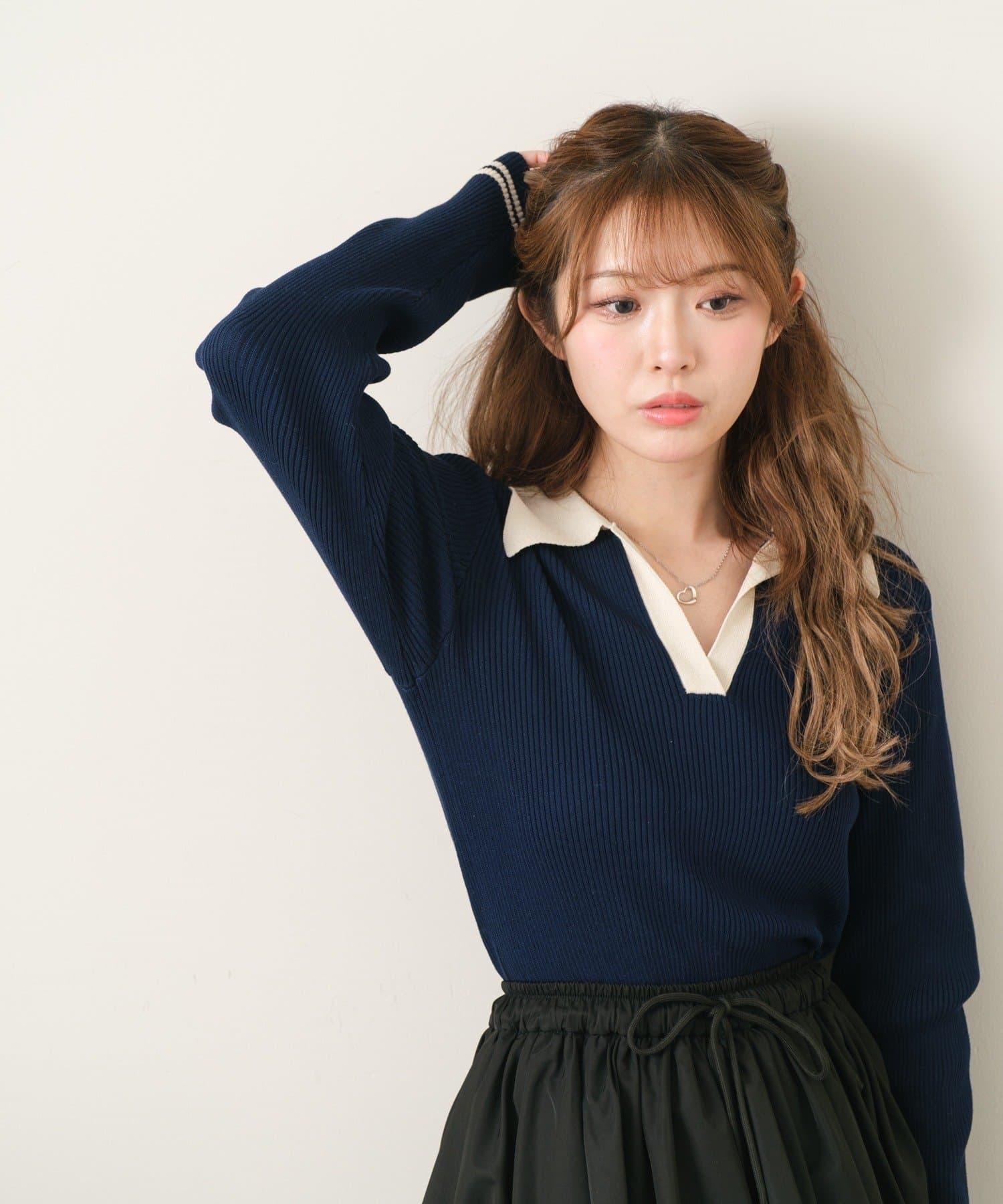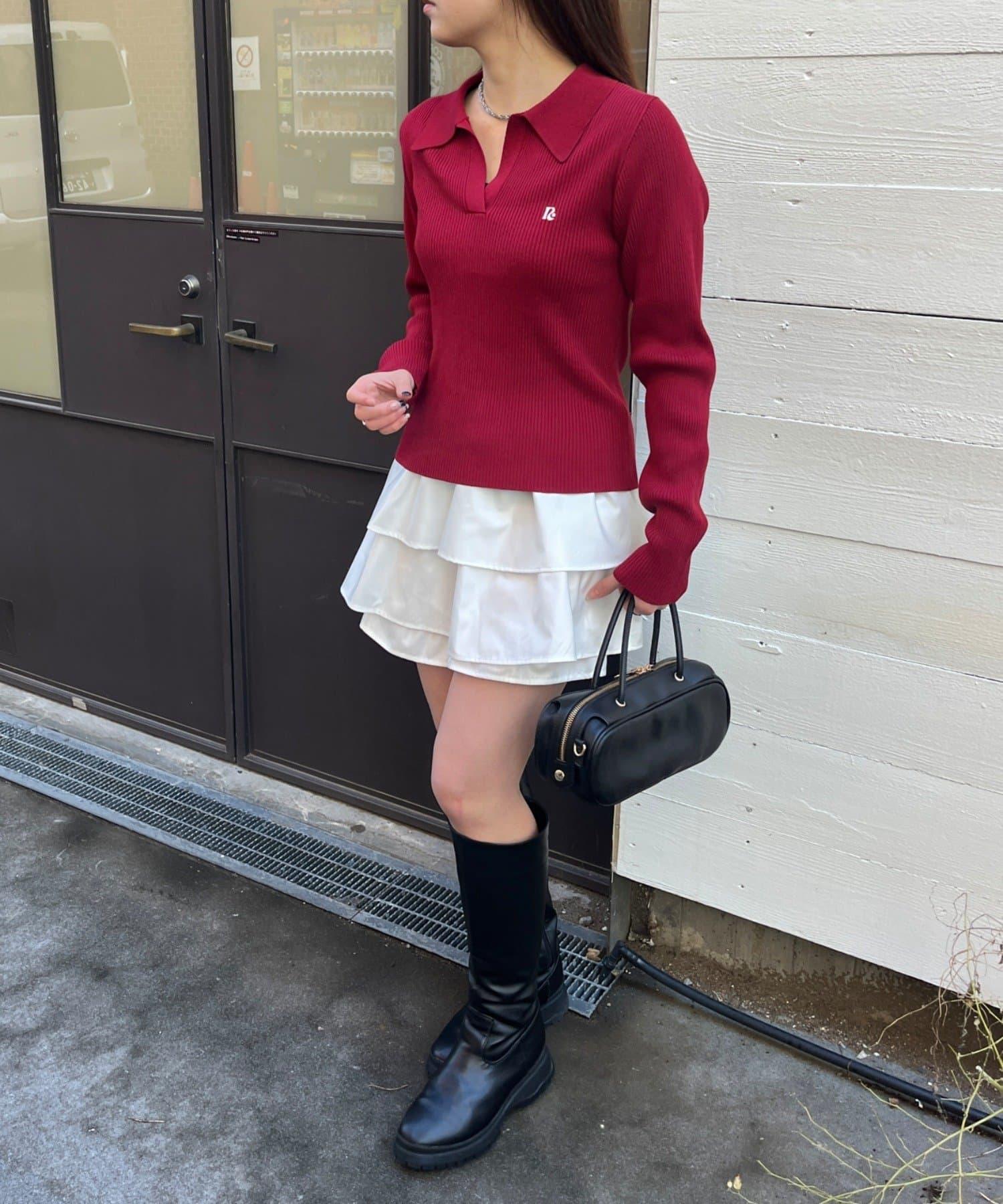 【RAY CASSIN】胸部刺繡V領翻領修身針織衫