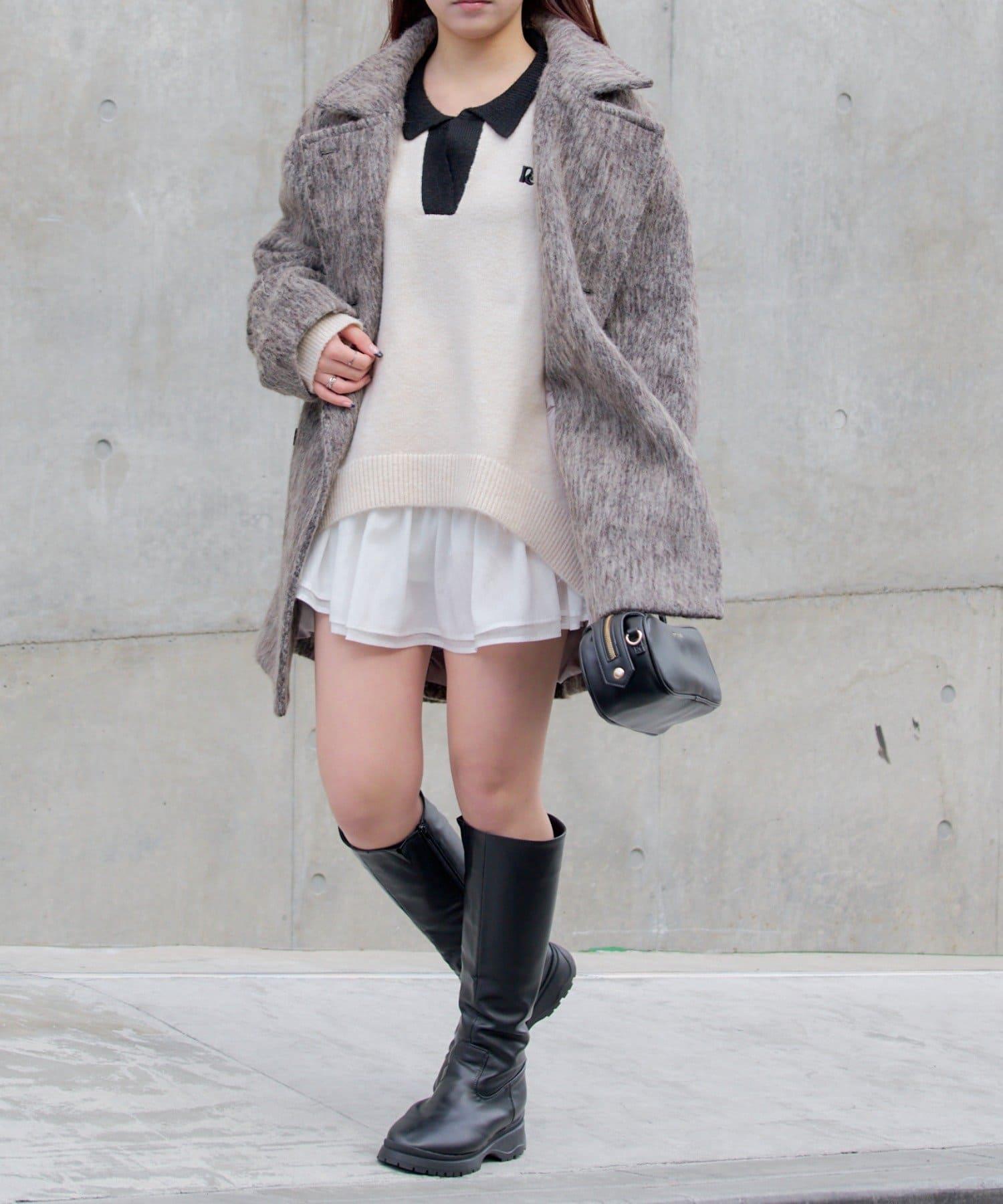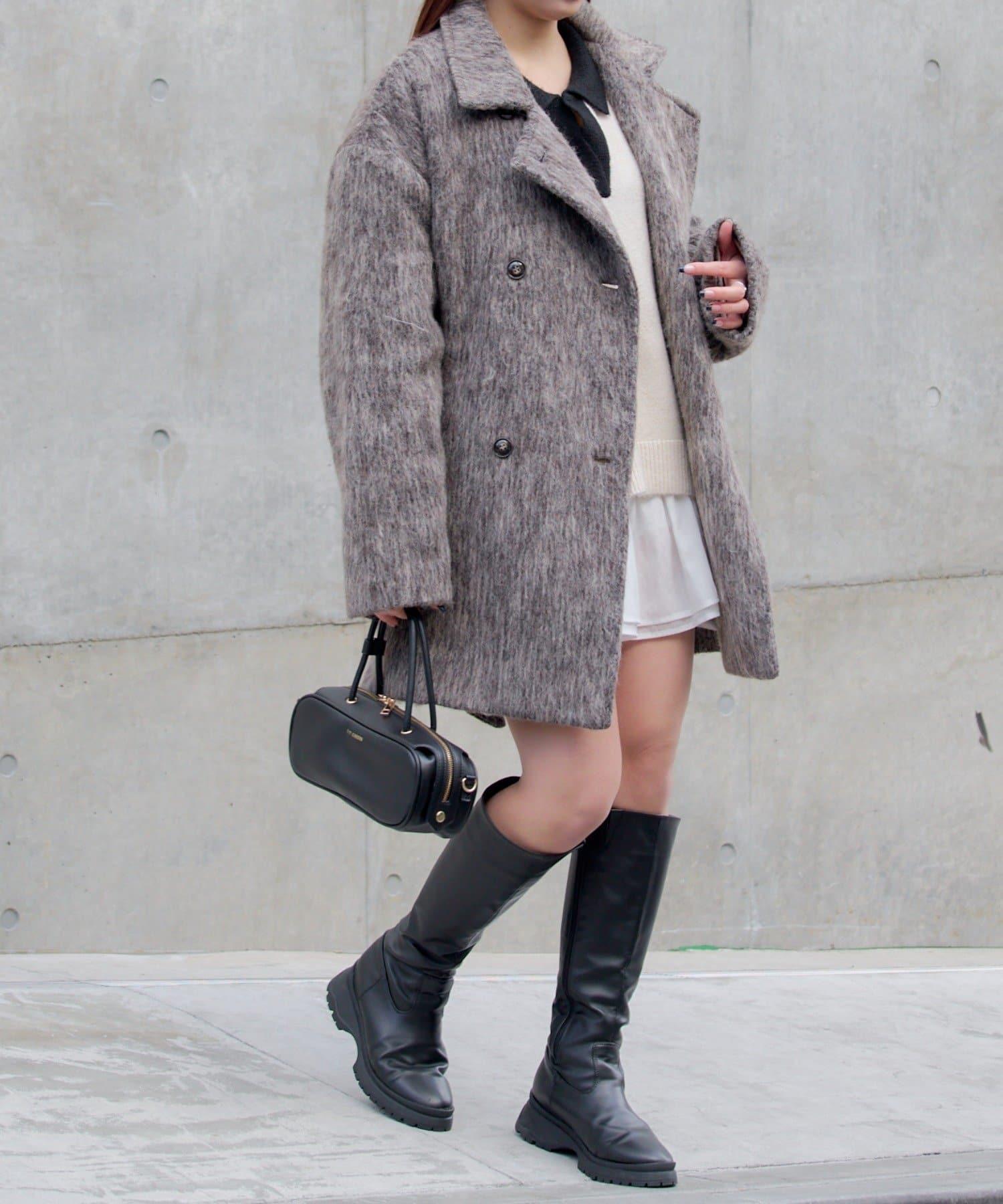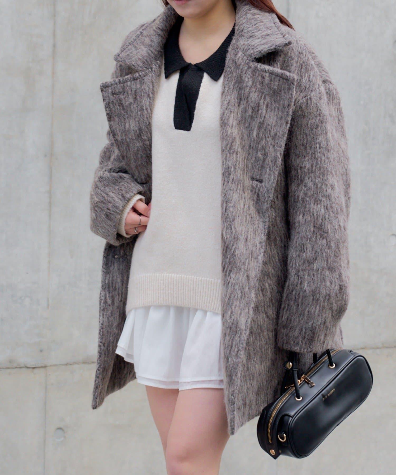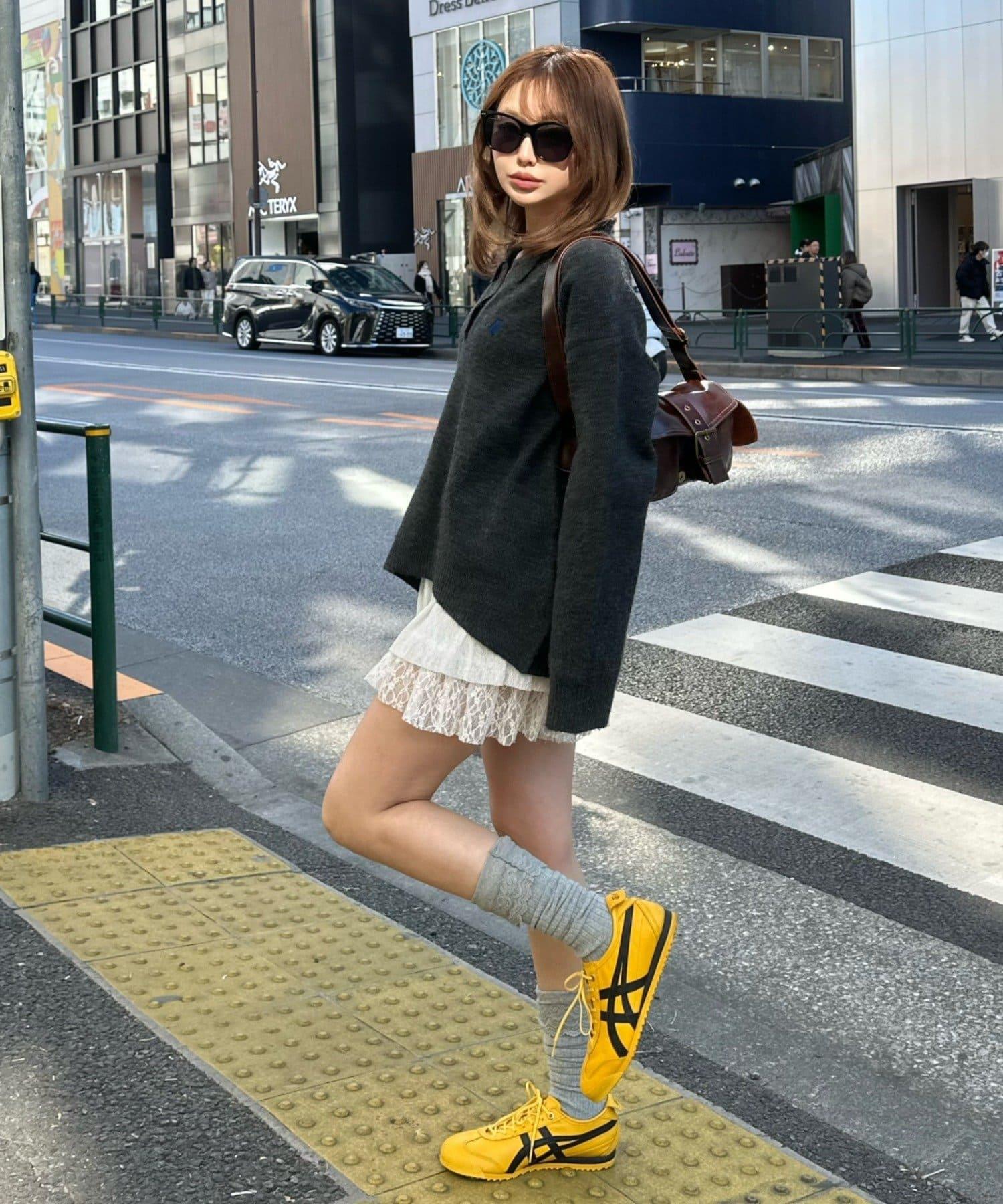 寬鬆的版型與迷你下裝搭配得恰到好處。
