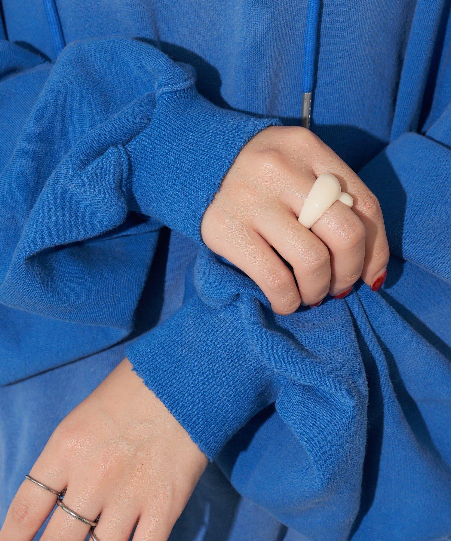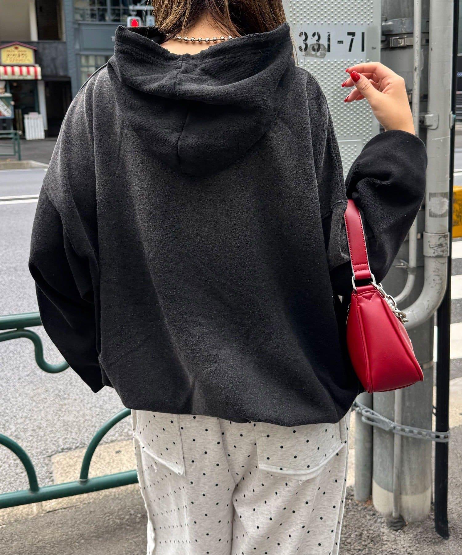 除了連帽帽衫的立體感外,頸部探出的標籤也成為造型點。