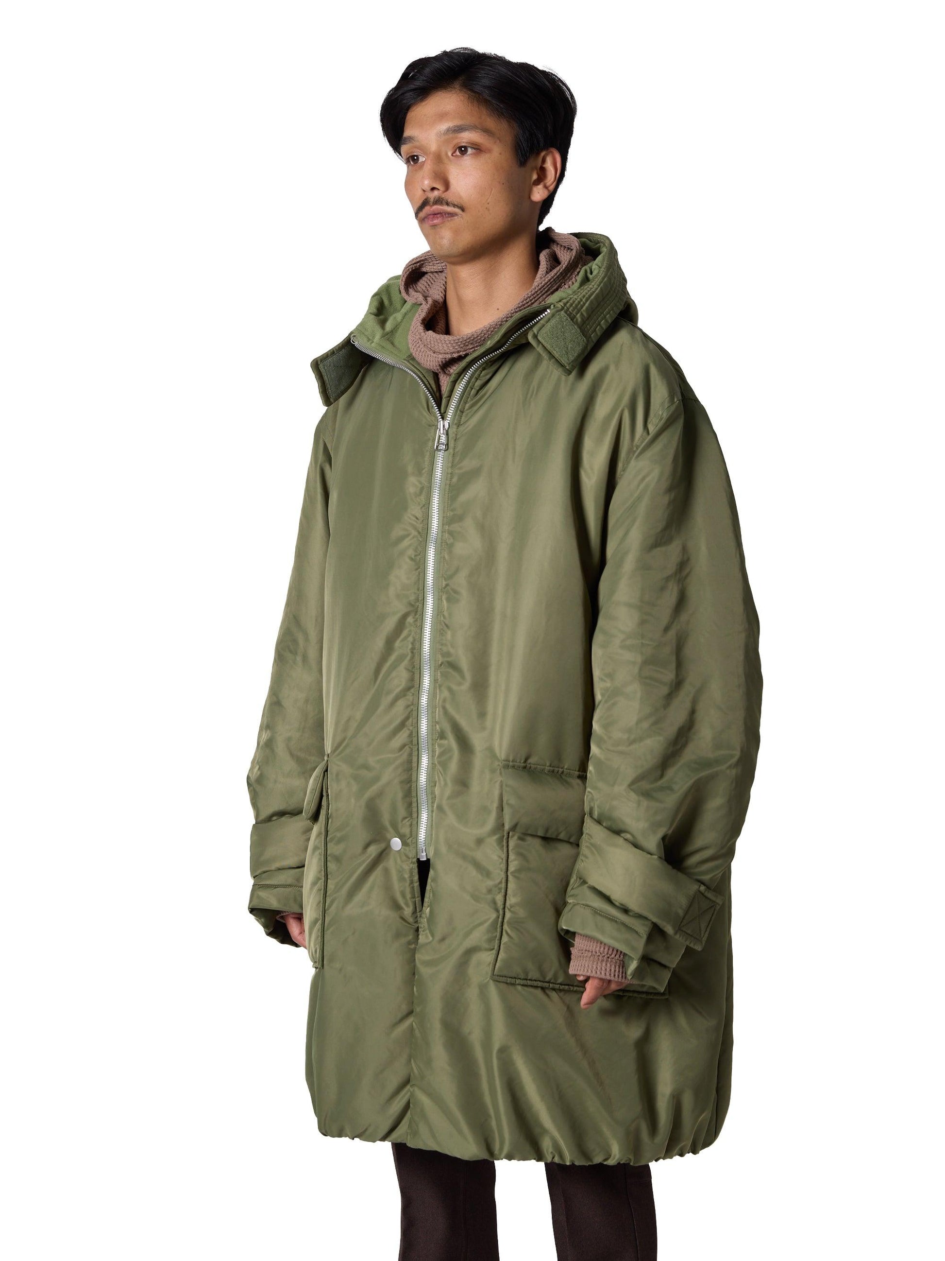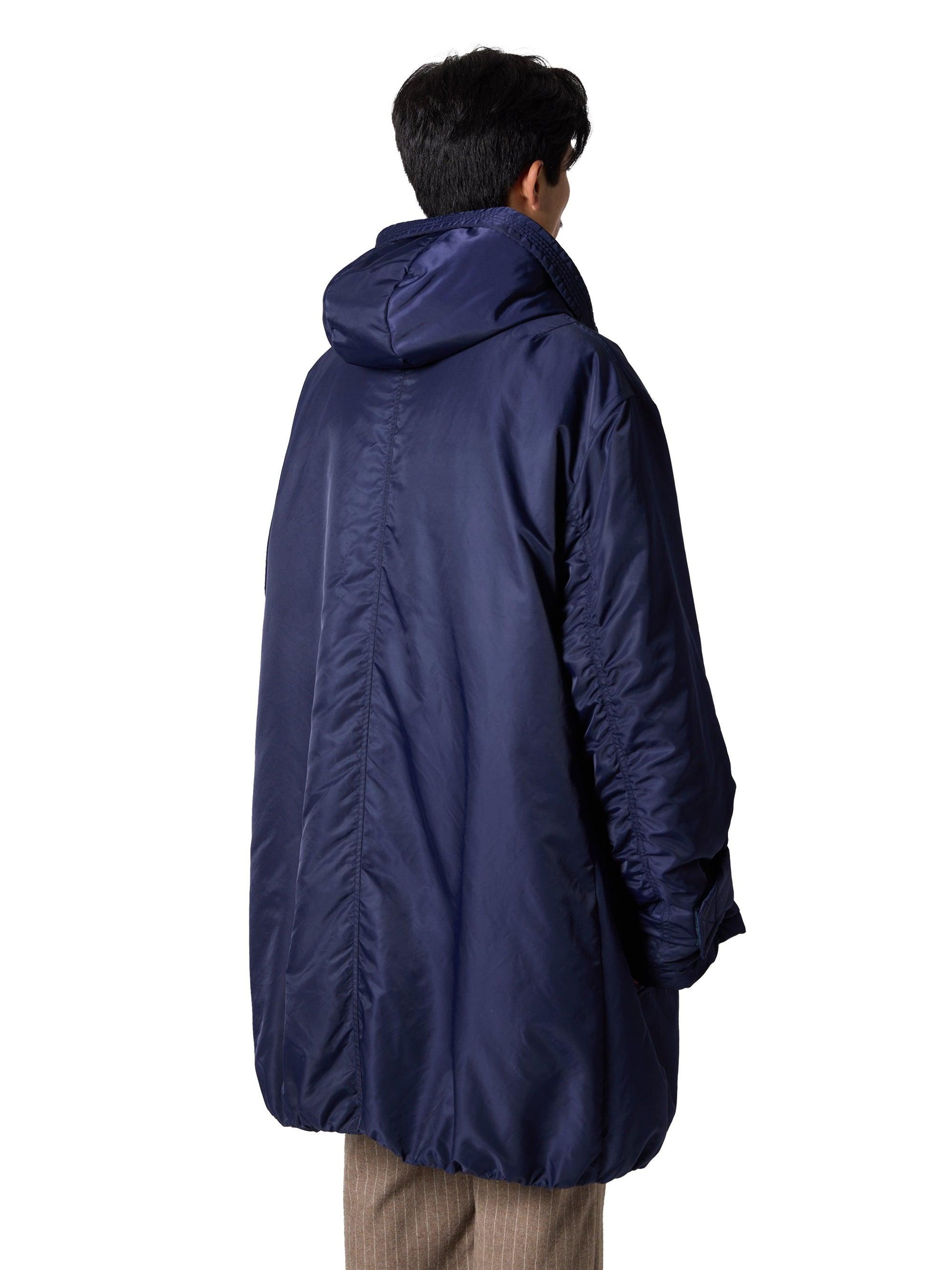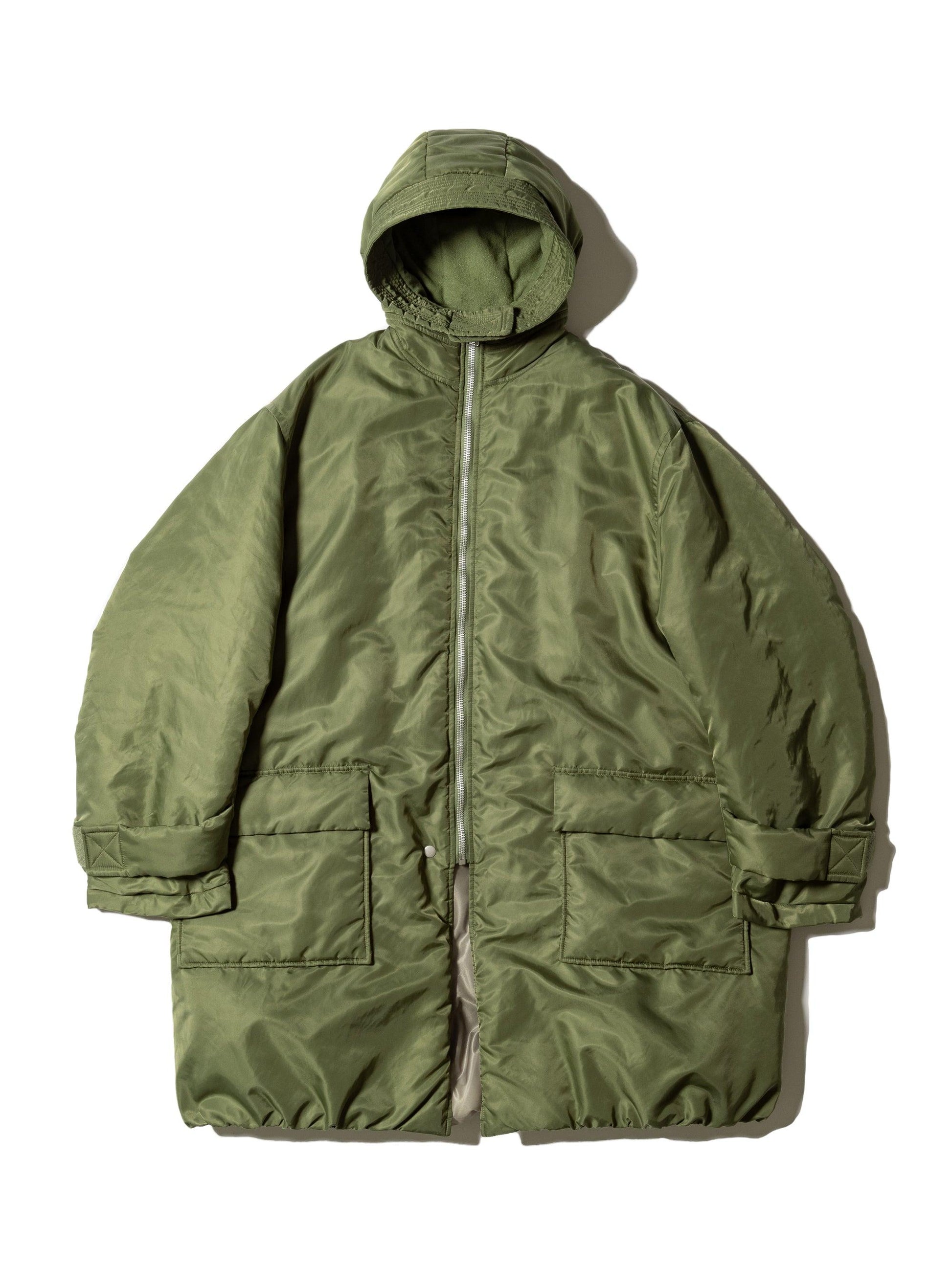 採用厚而堅韌的尼龍緞面織物製成,用於軍事和其他用途。它具有適度的光澤和復古的質感。風帽、外觀輪廓和袖子的設計靈感來自軍裝。由回收纖維織成的襯裡具有極佳的抗靜電和拉伸性能。經過一次水洗處理。
