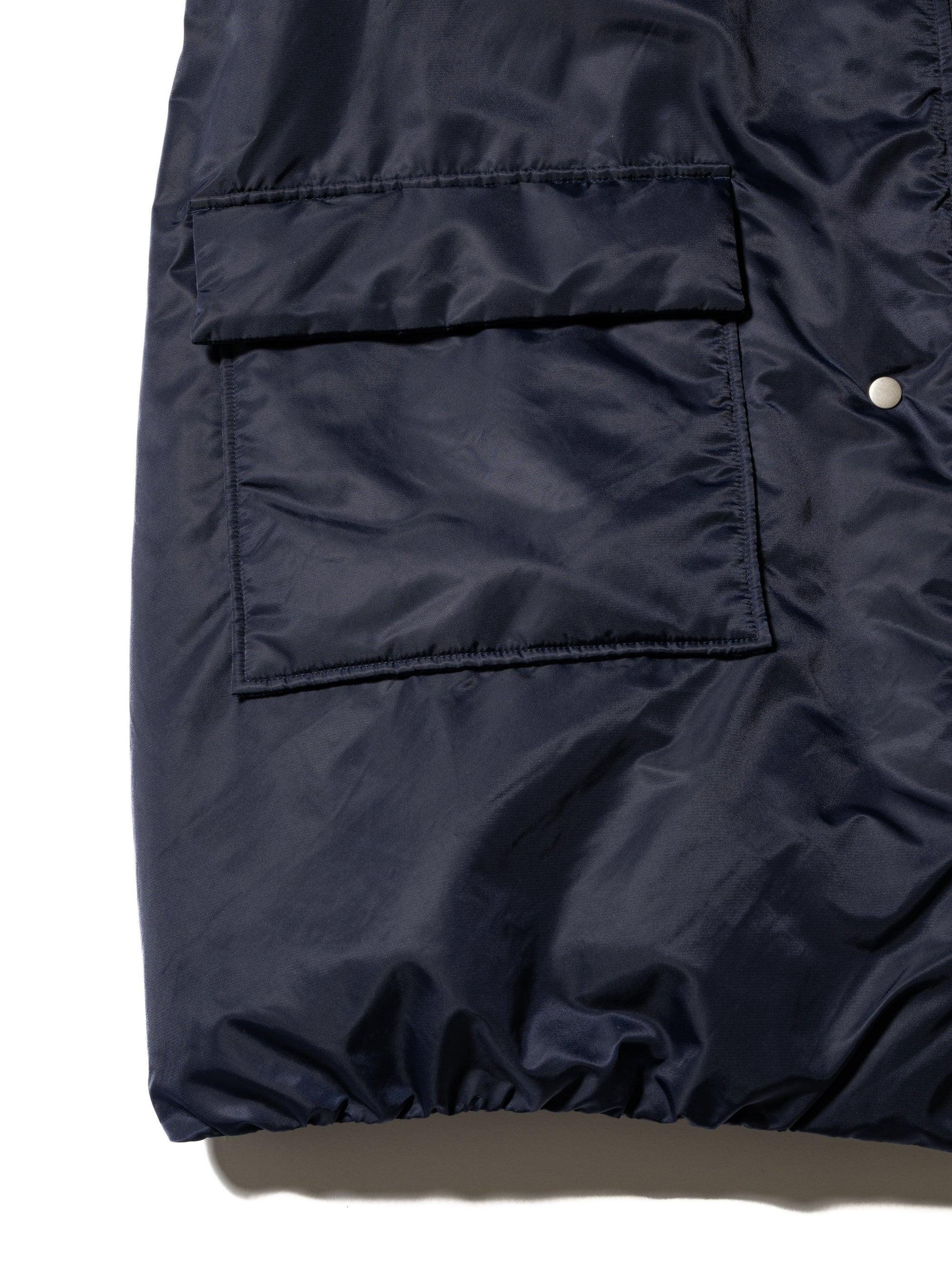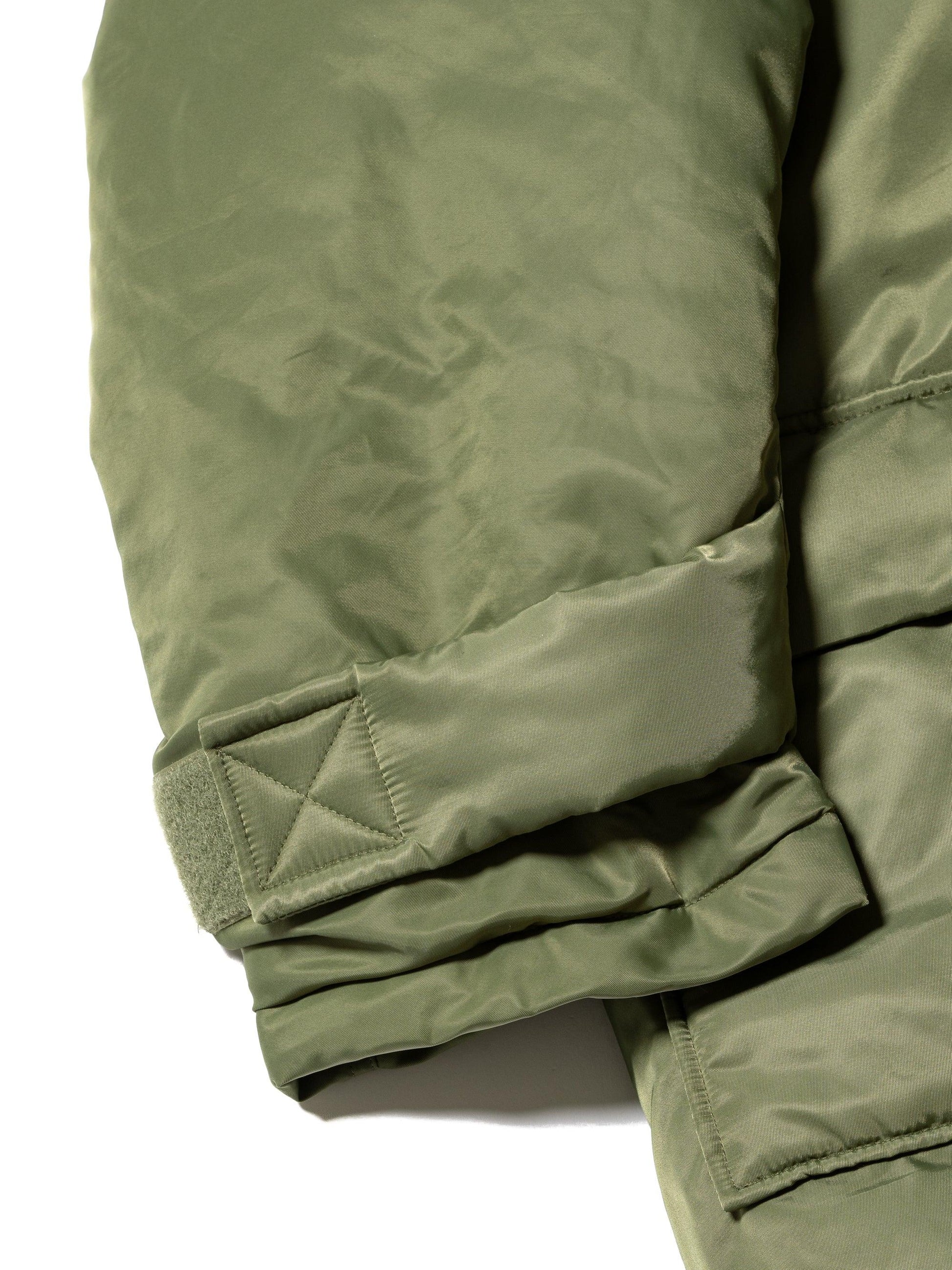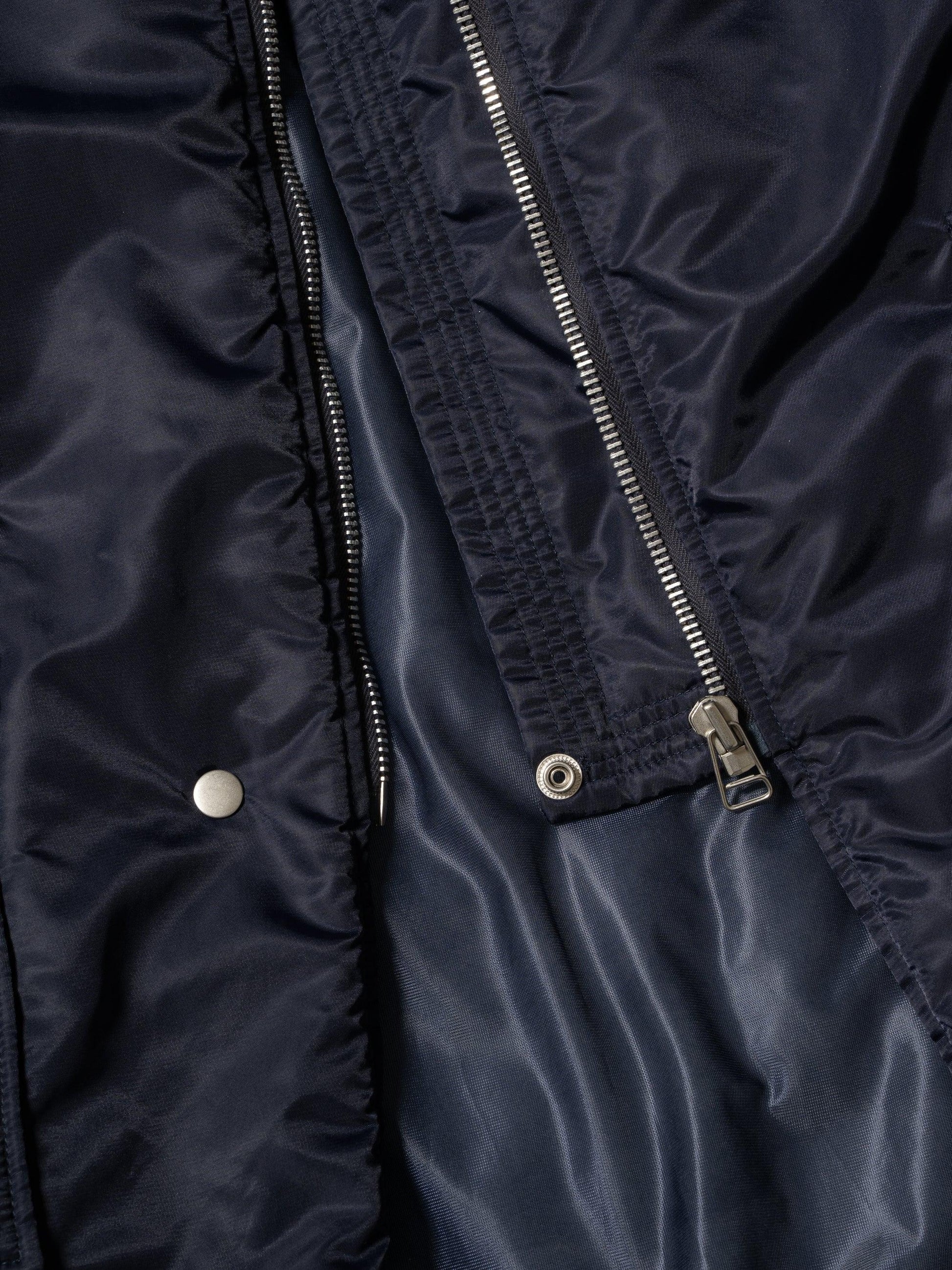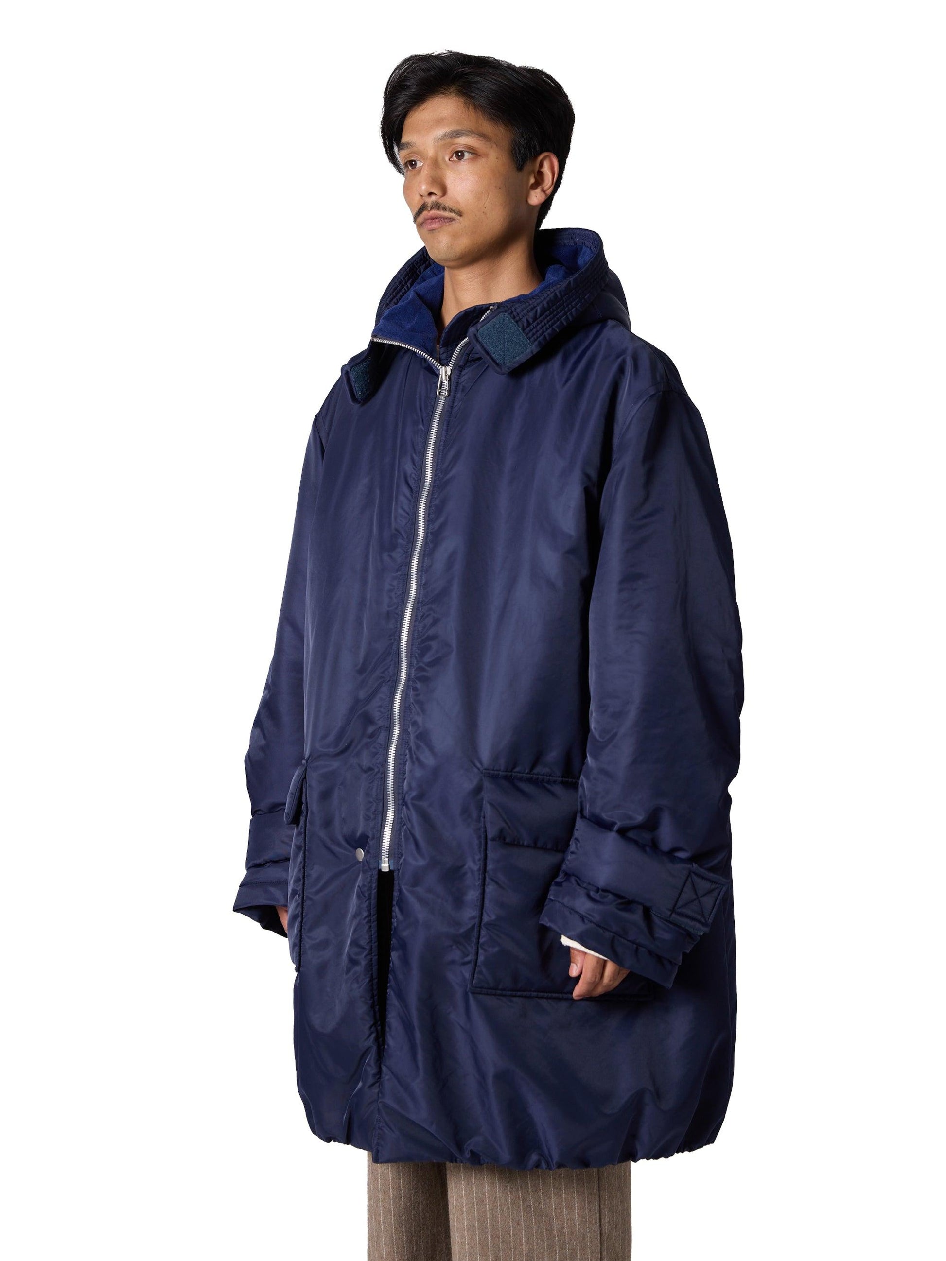 採用厚而堅韌的尼龍緞面織物製成,用於軍事和其他用途。它具有適度的光澤和復古的質感。風帽、外觀輪廓和袖子的設計靈感來自軍裝。由回收纖維織成的襯裡具有極佳的抗靜電和拉伸性能。經過一次水洗處理。