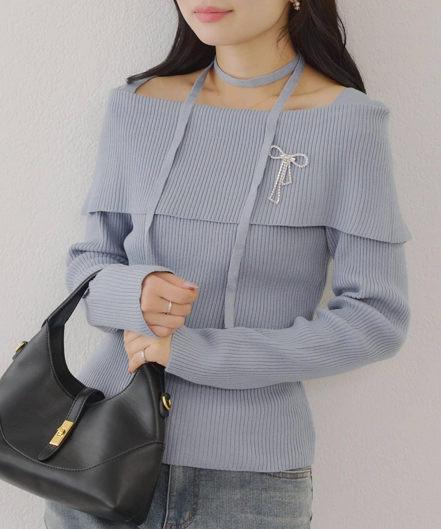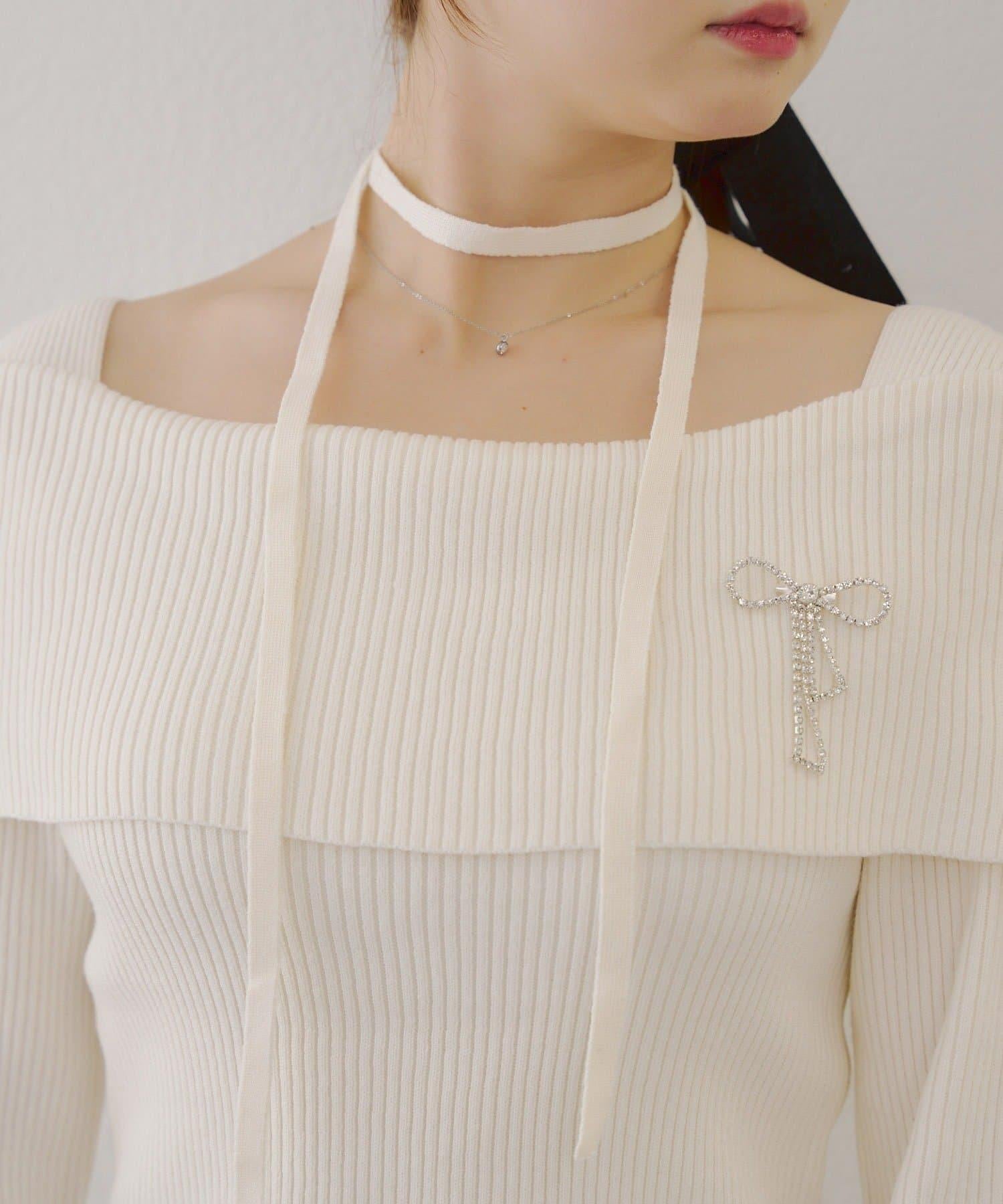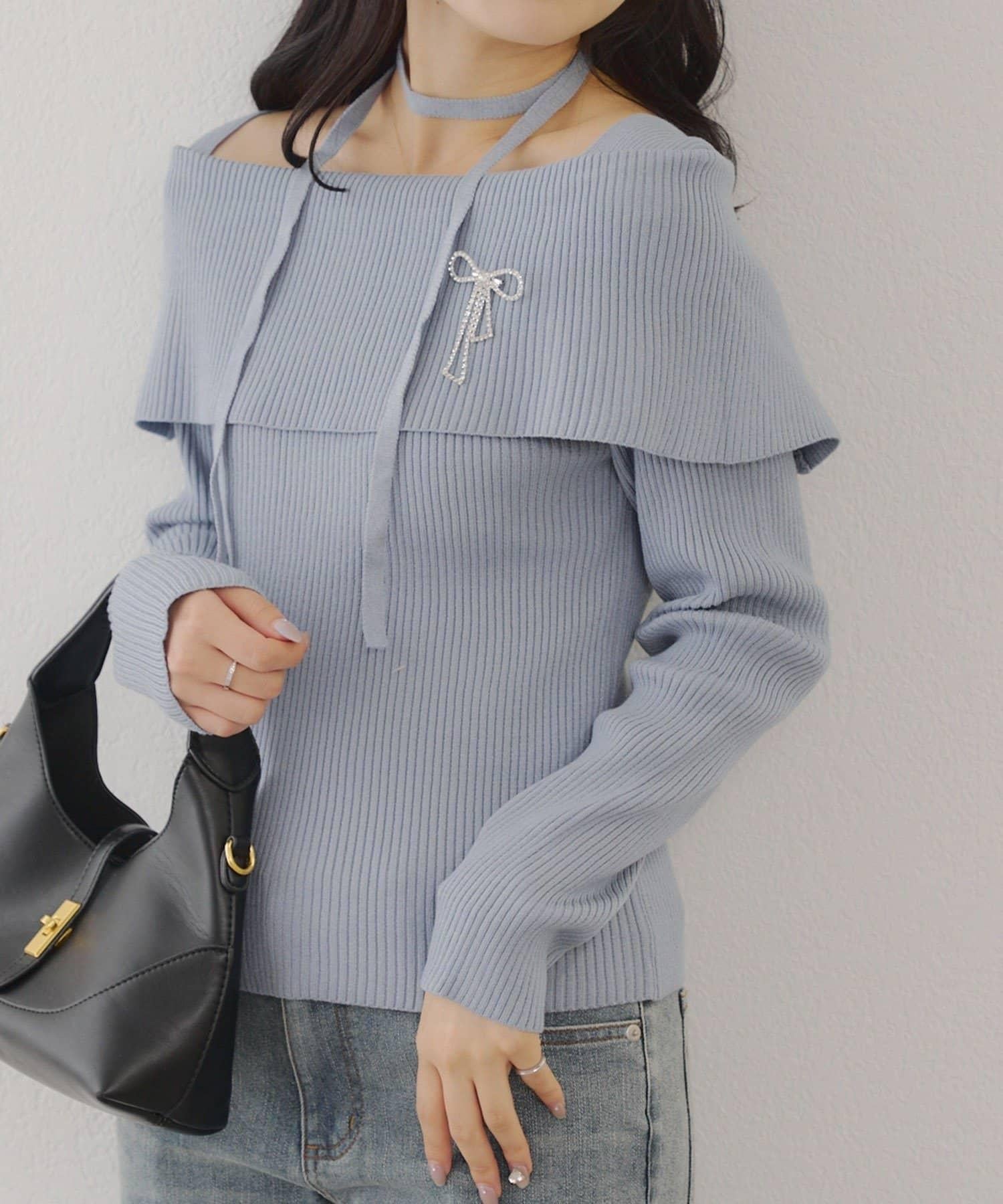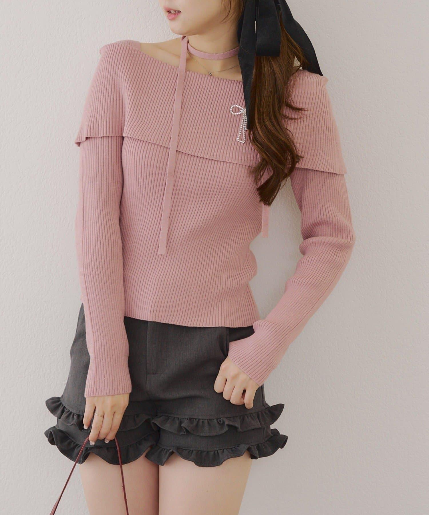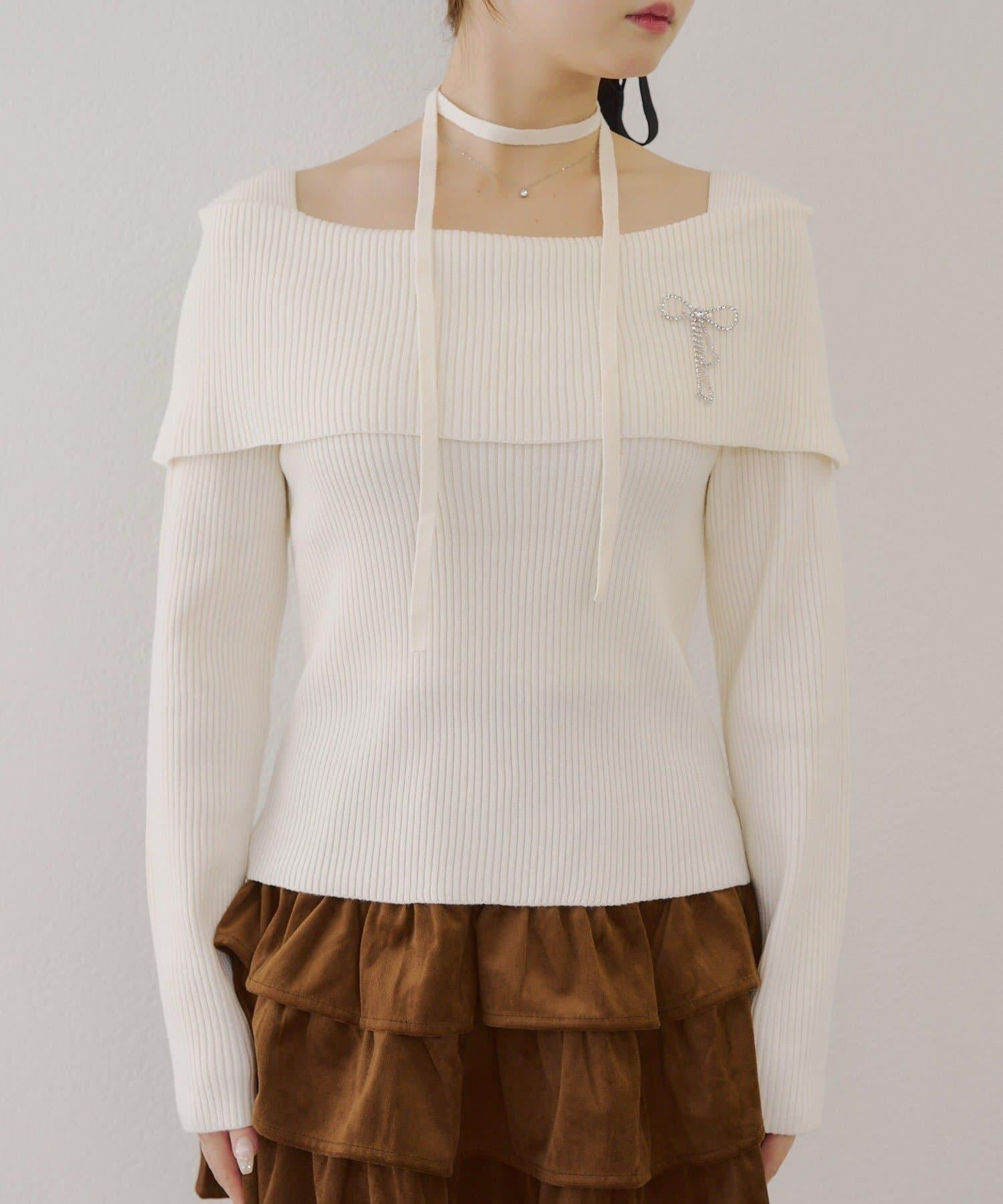 【RMAF】一字肩配胸針針織衫