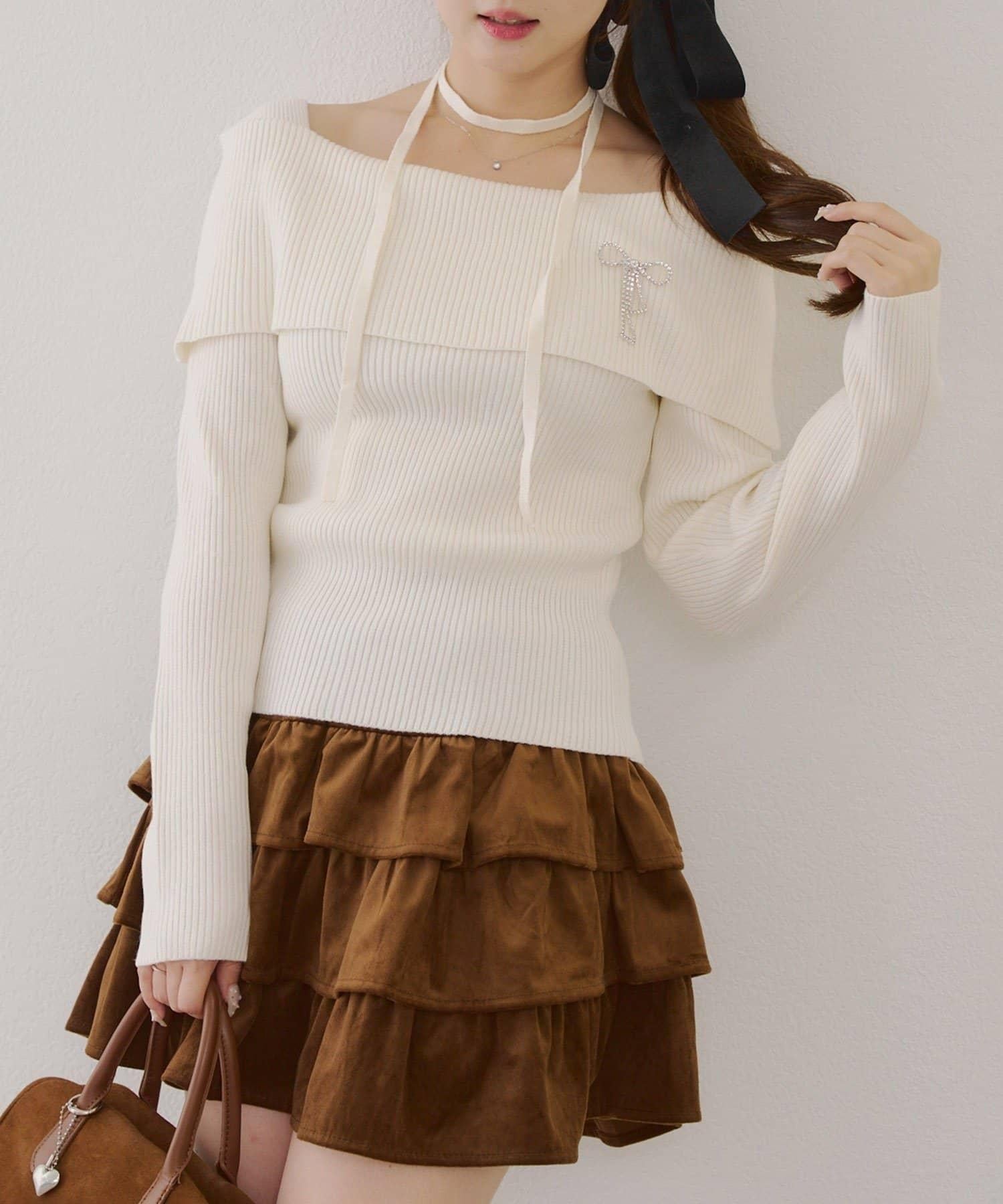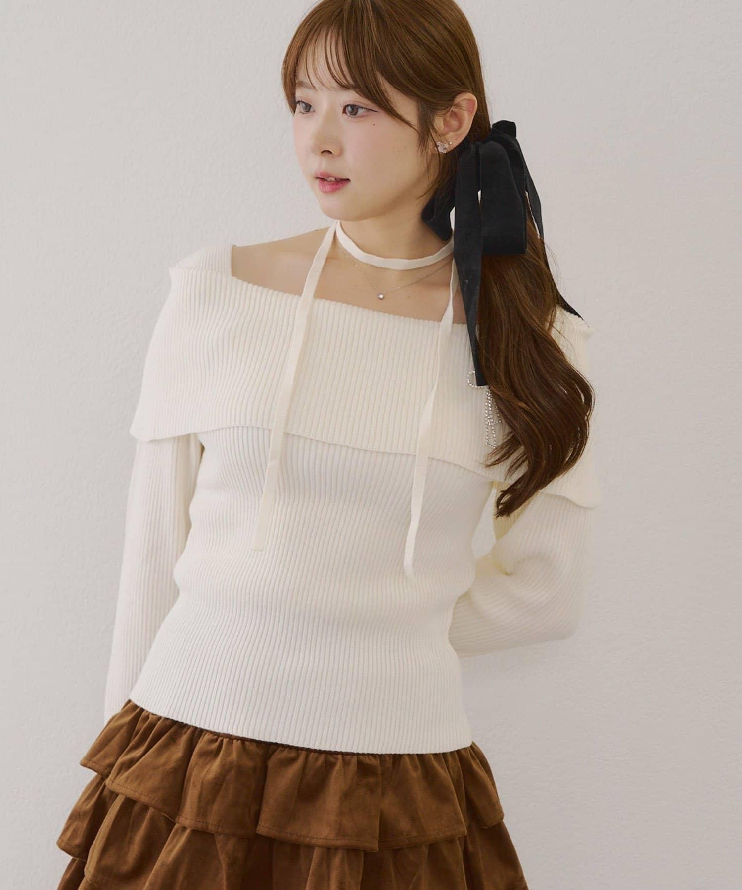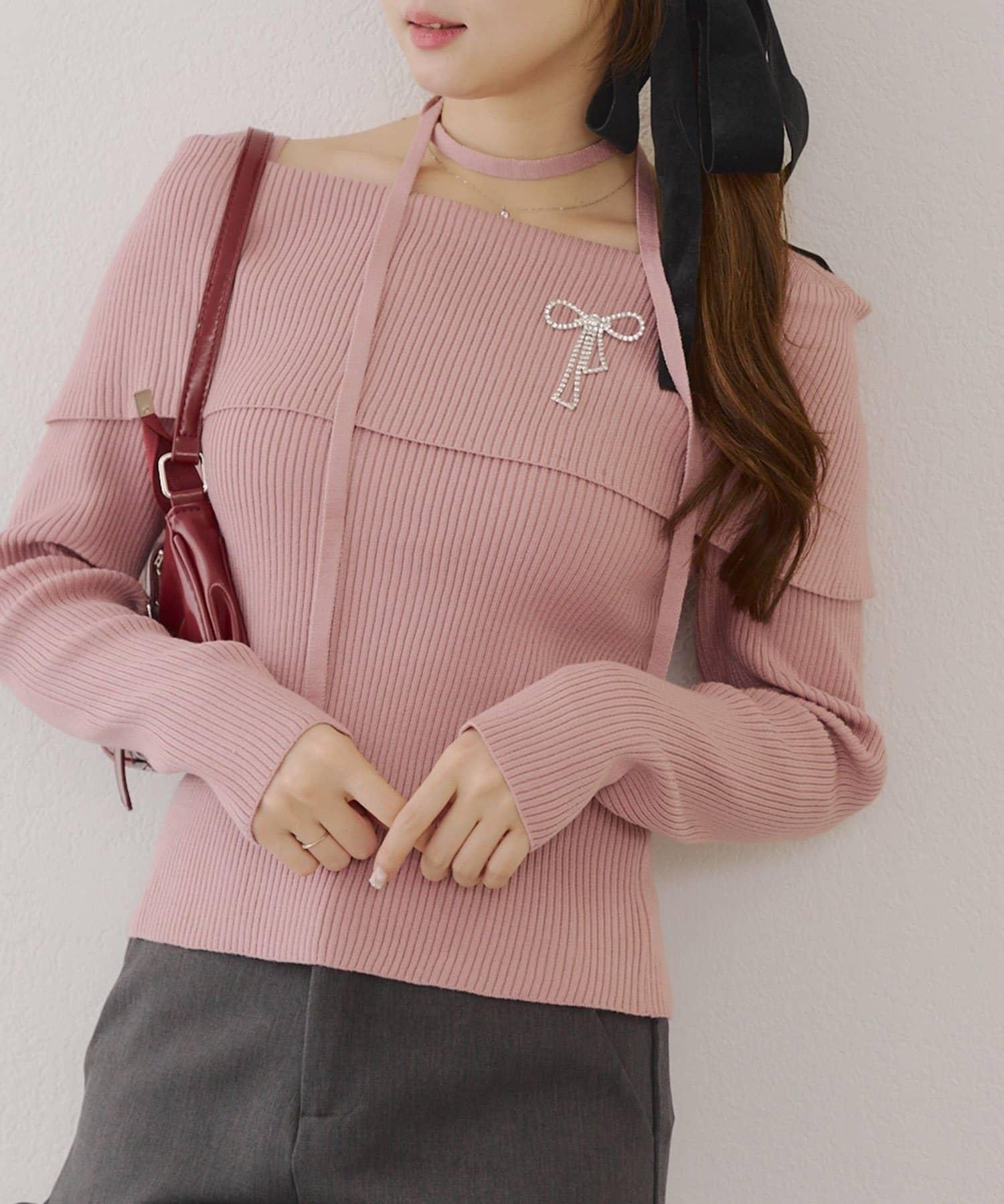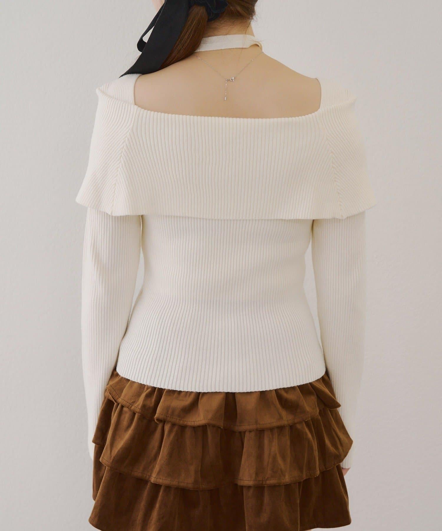 【RMAF】一字肩配胸針針織衫