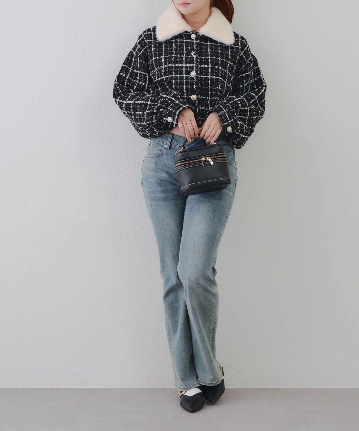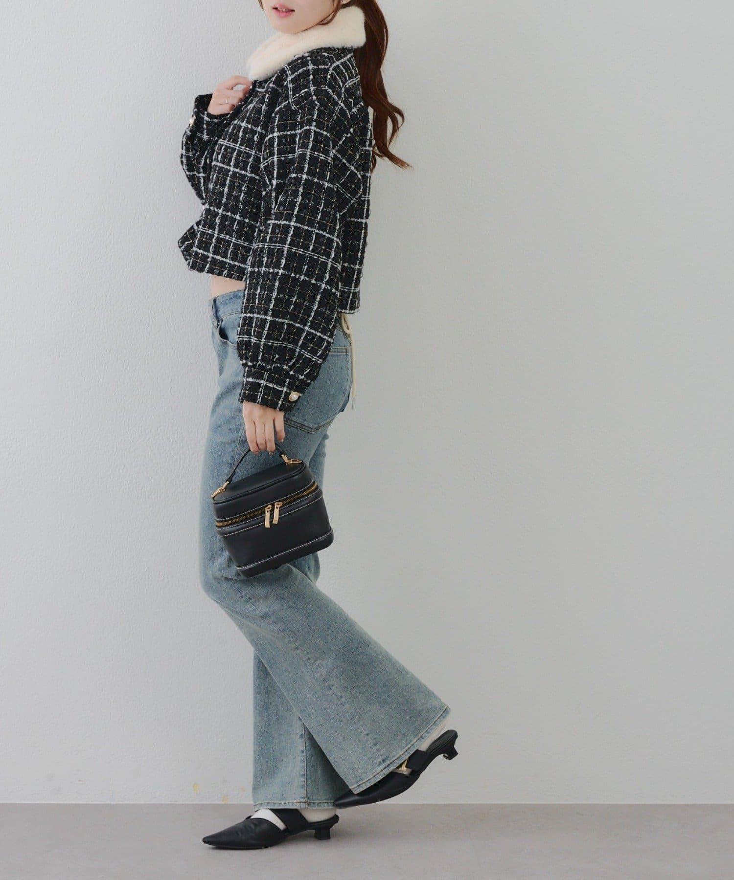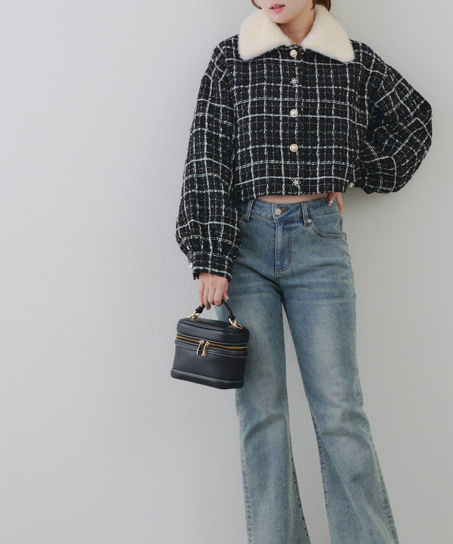 搭配喇叭牛仔褲和高跟鞋,打造韓式搭配。