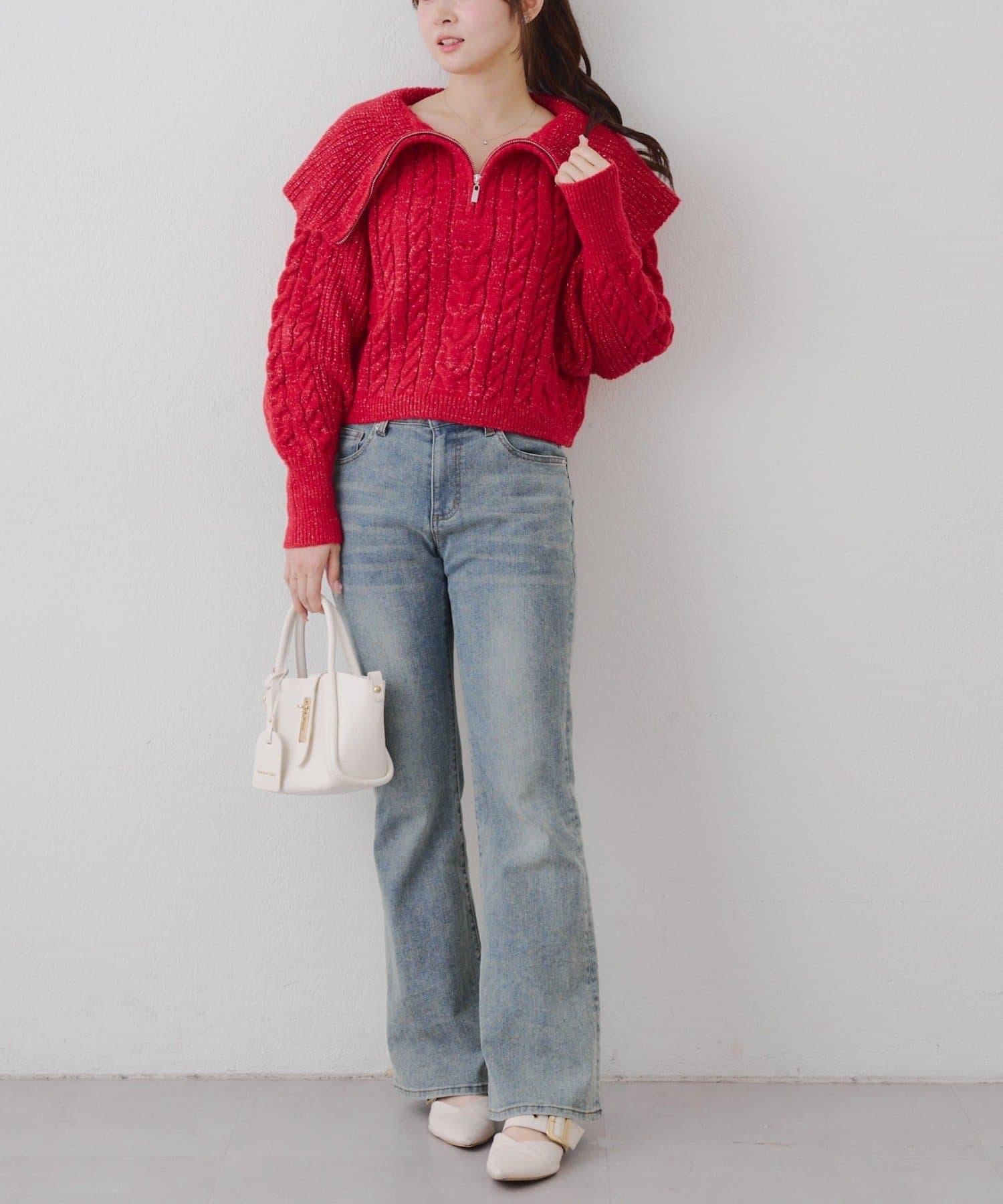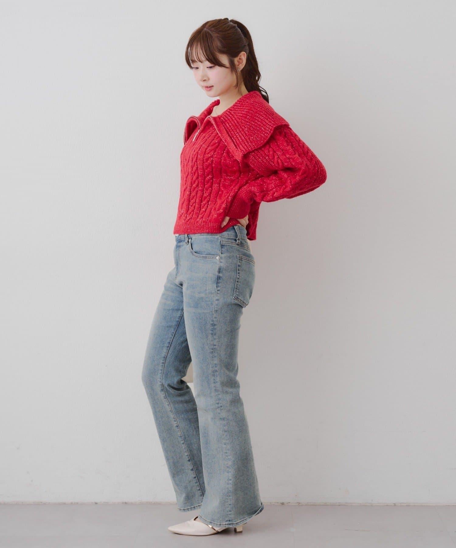 喇叭形牛仔布的搭配給人一種淑女的季節印象。