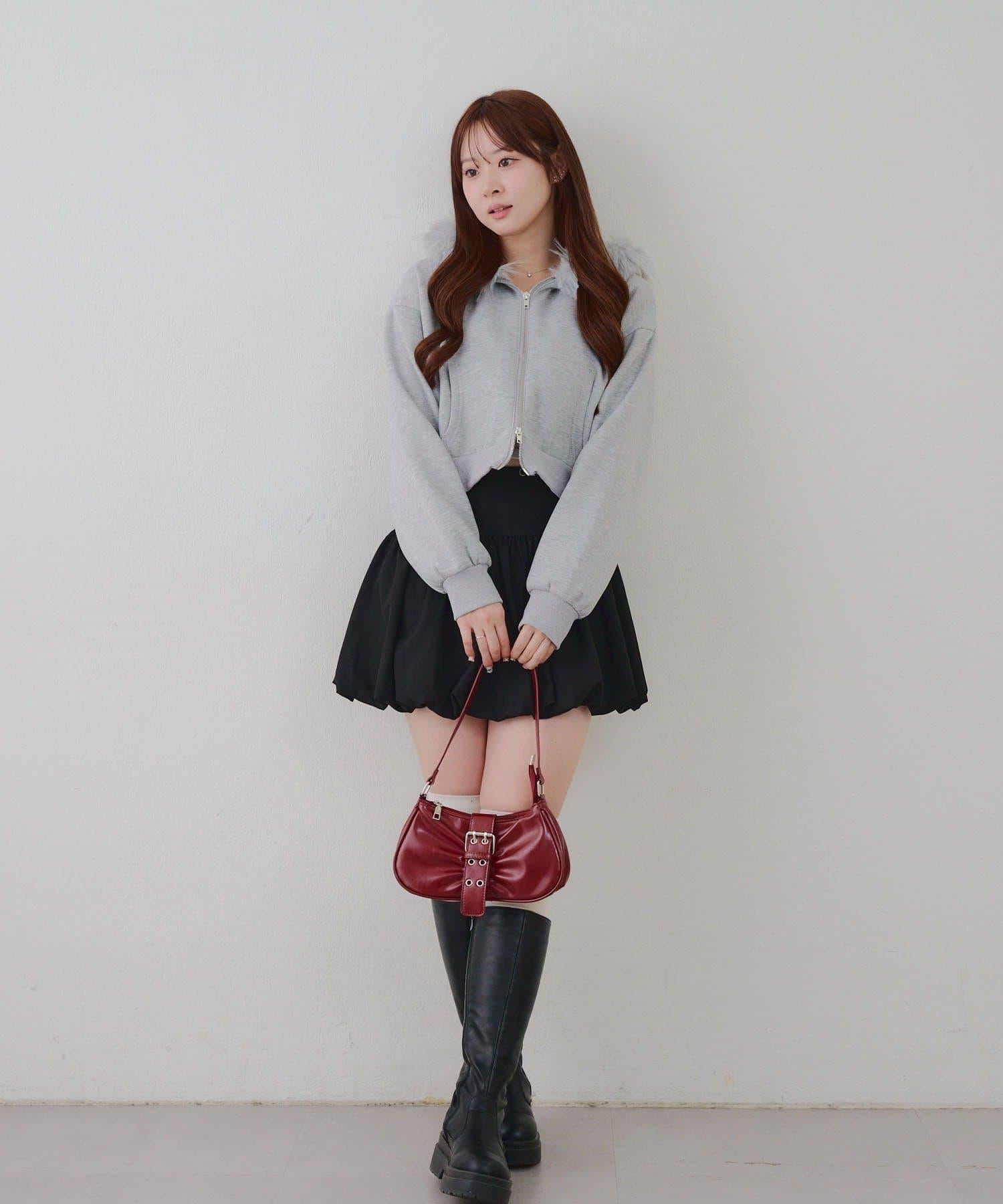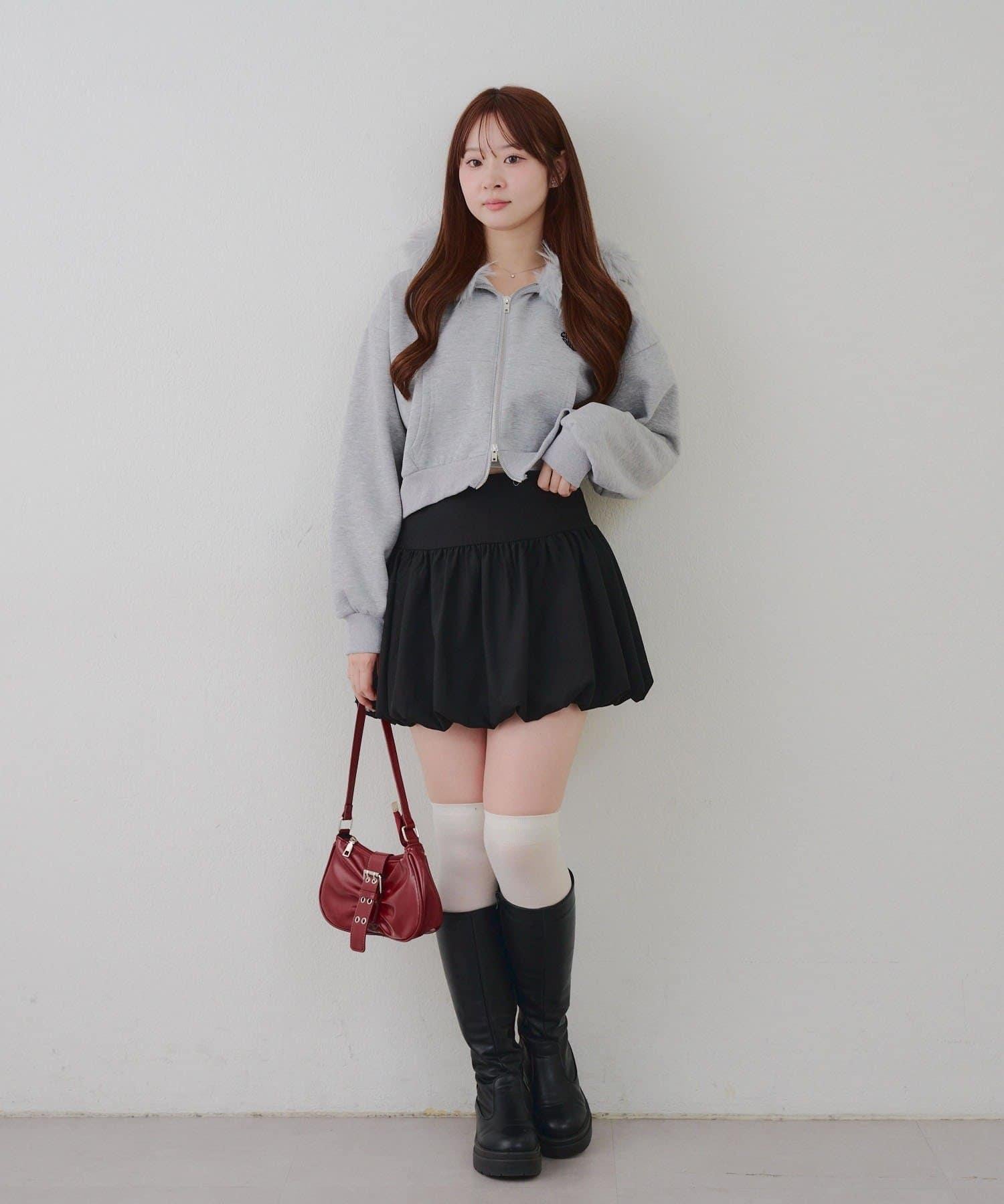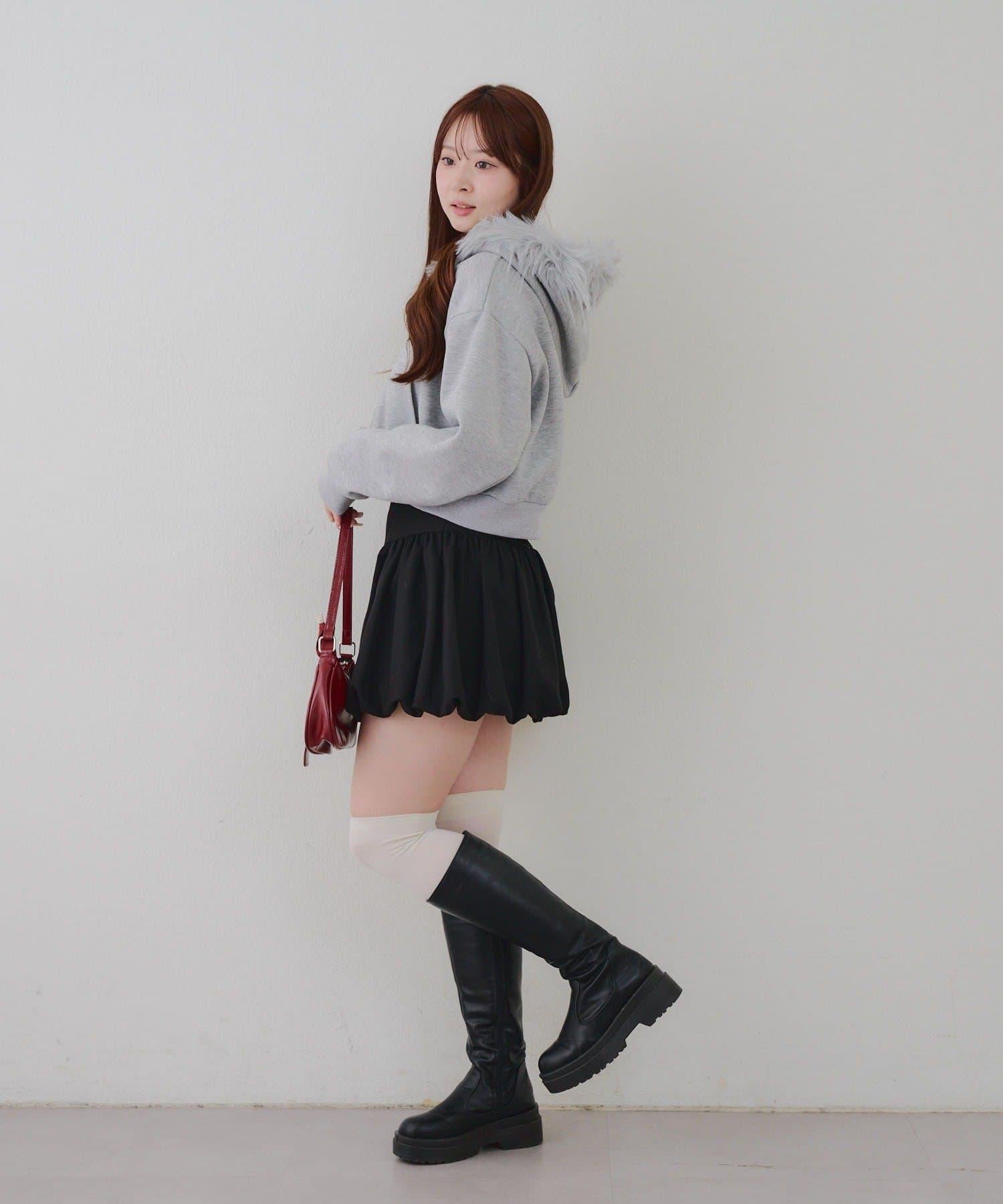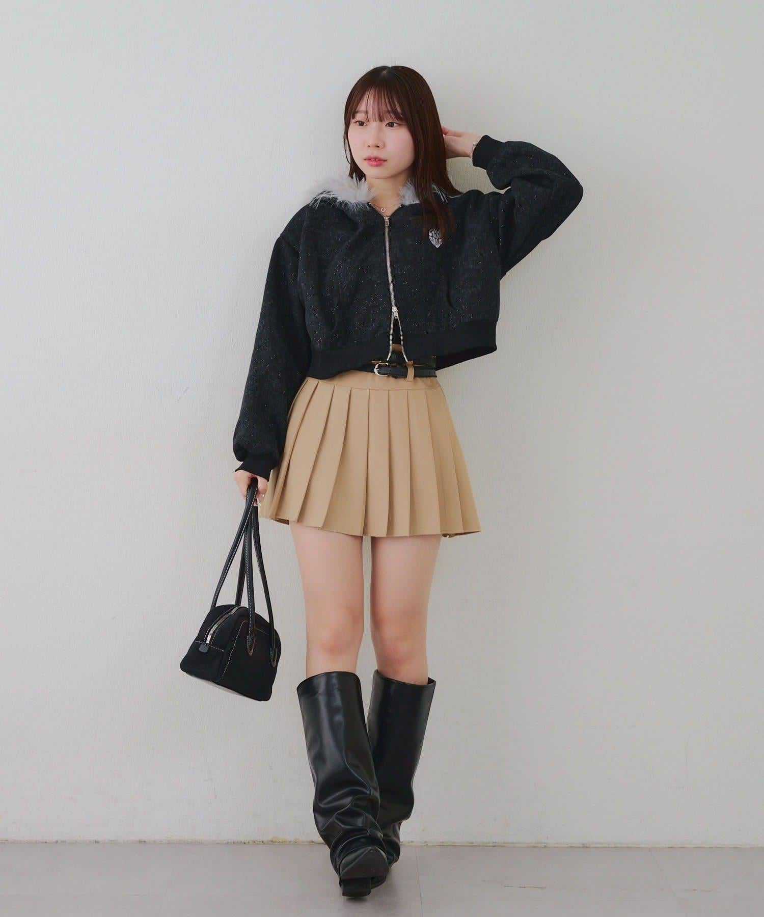 褶皺、層疊迷你裙和長筒靴的休閒少女搭配。