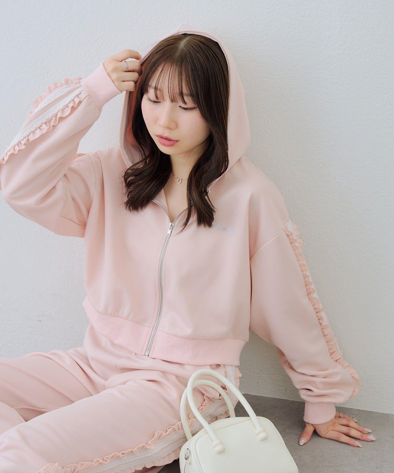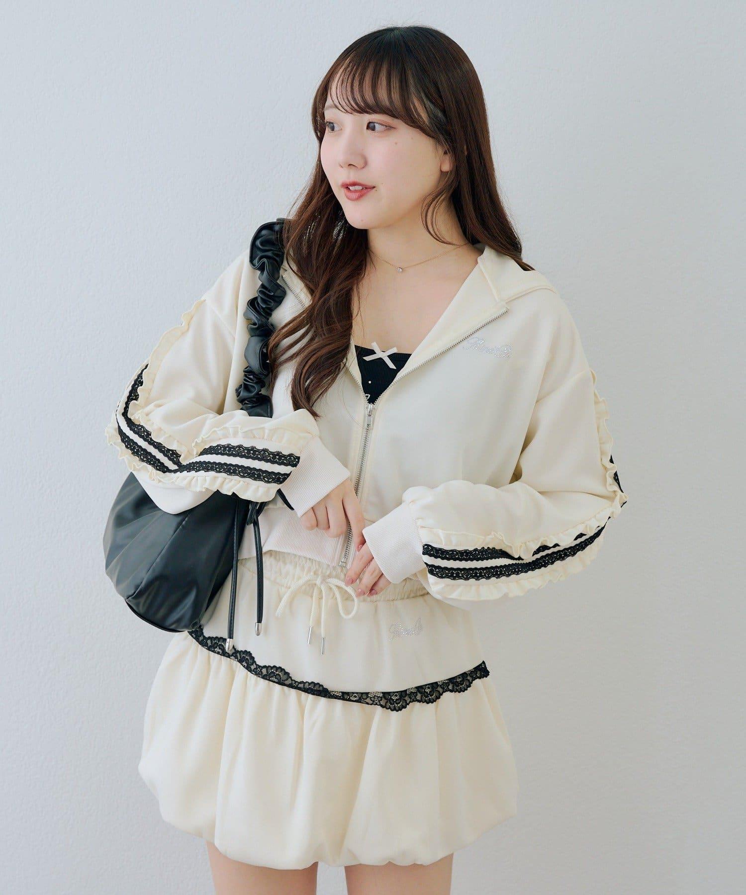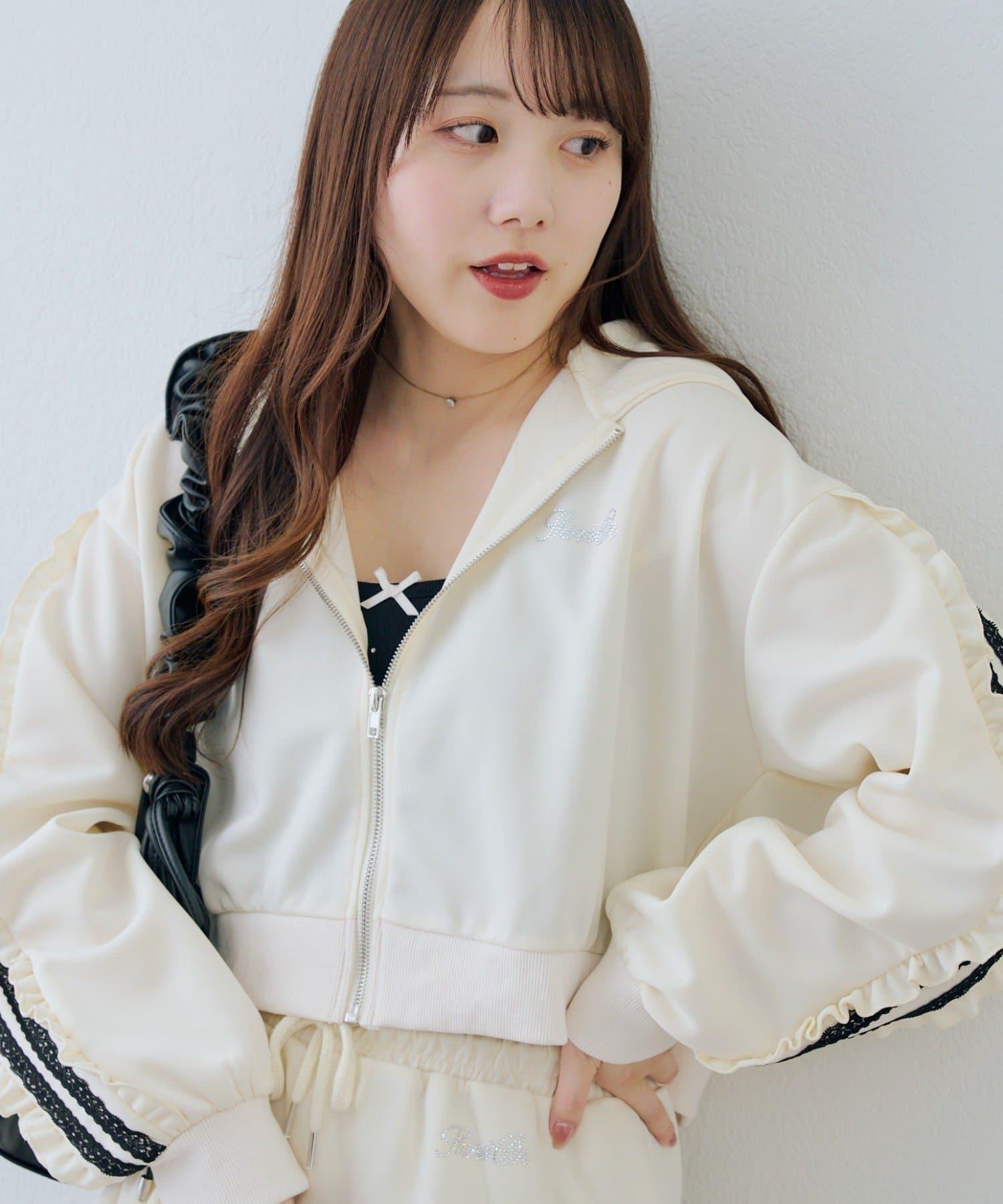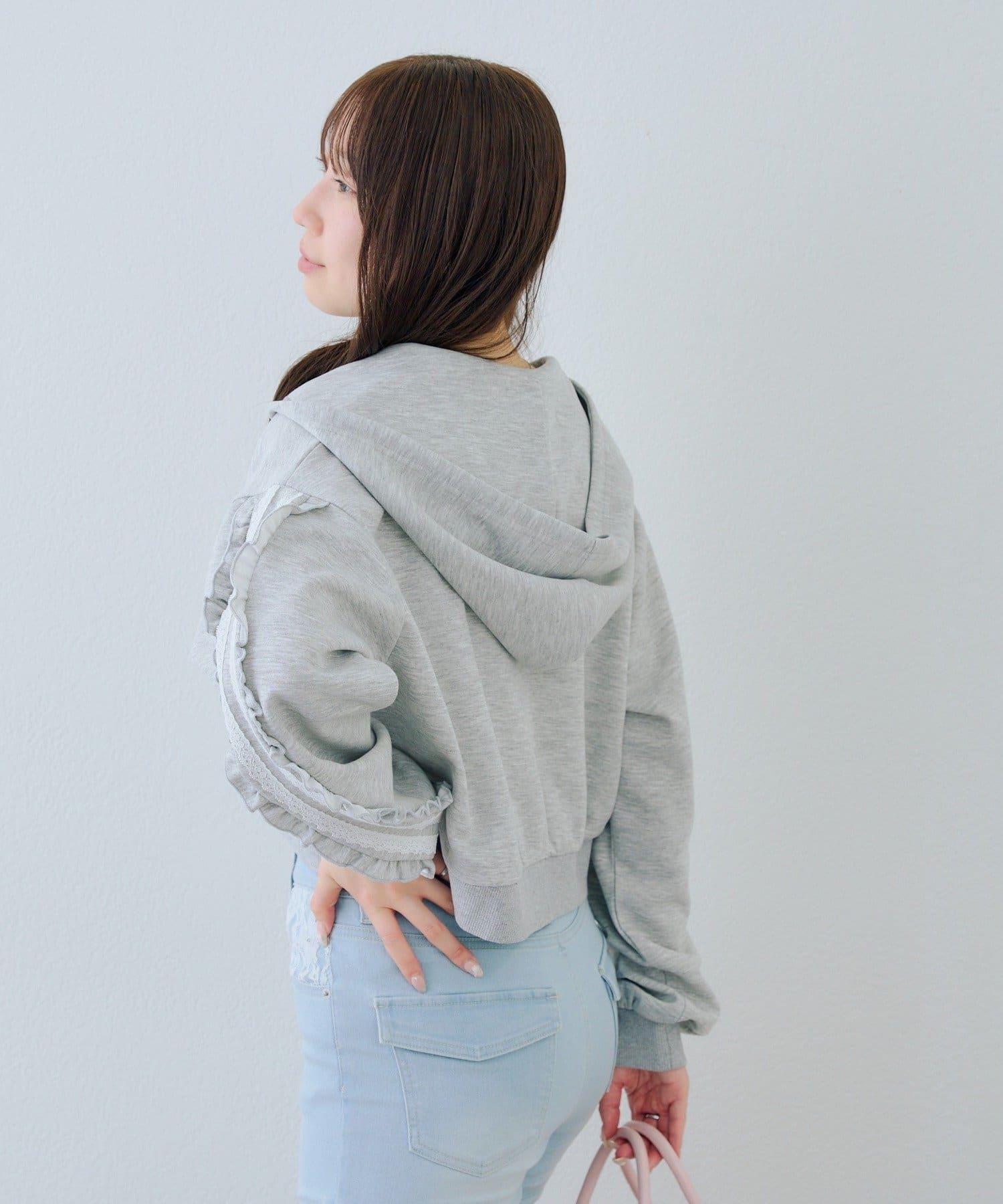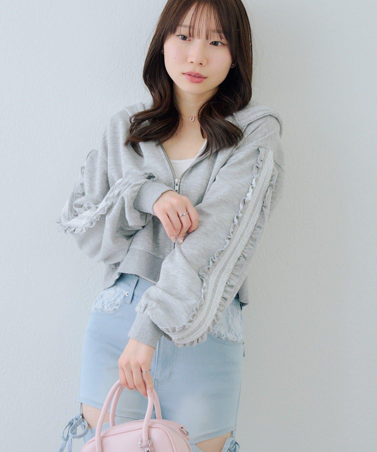 少女風格的休閒拉鍊連帽衫,袖子上有醒目的褶皺線條。
