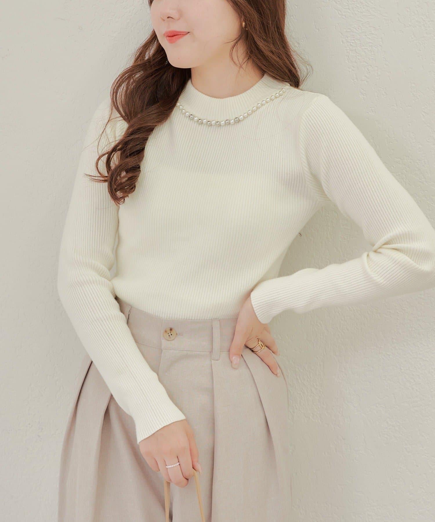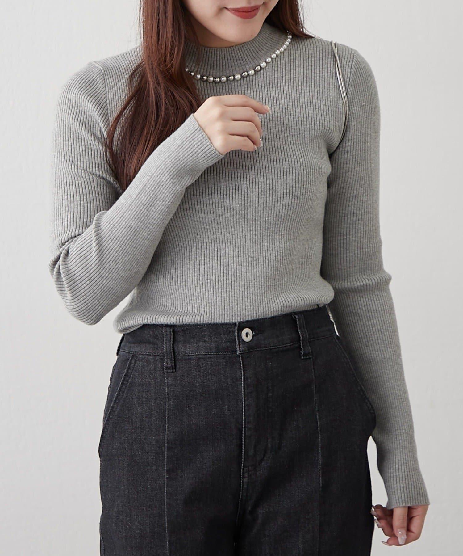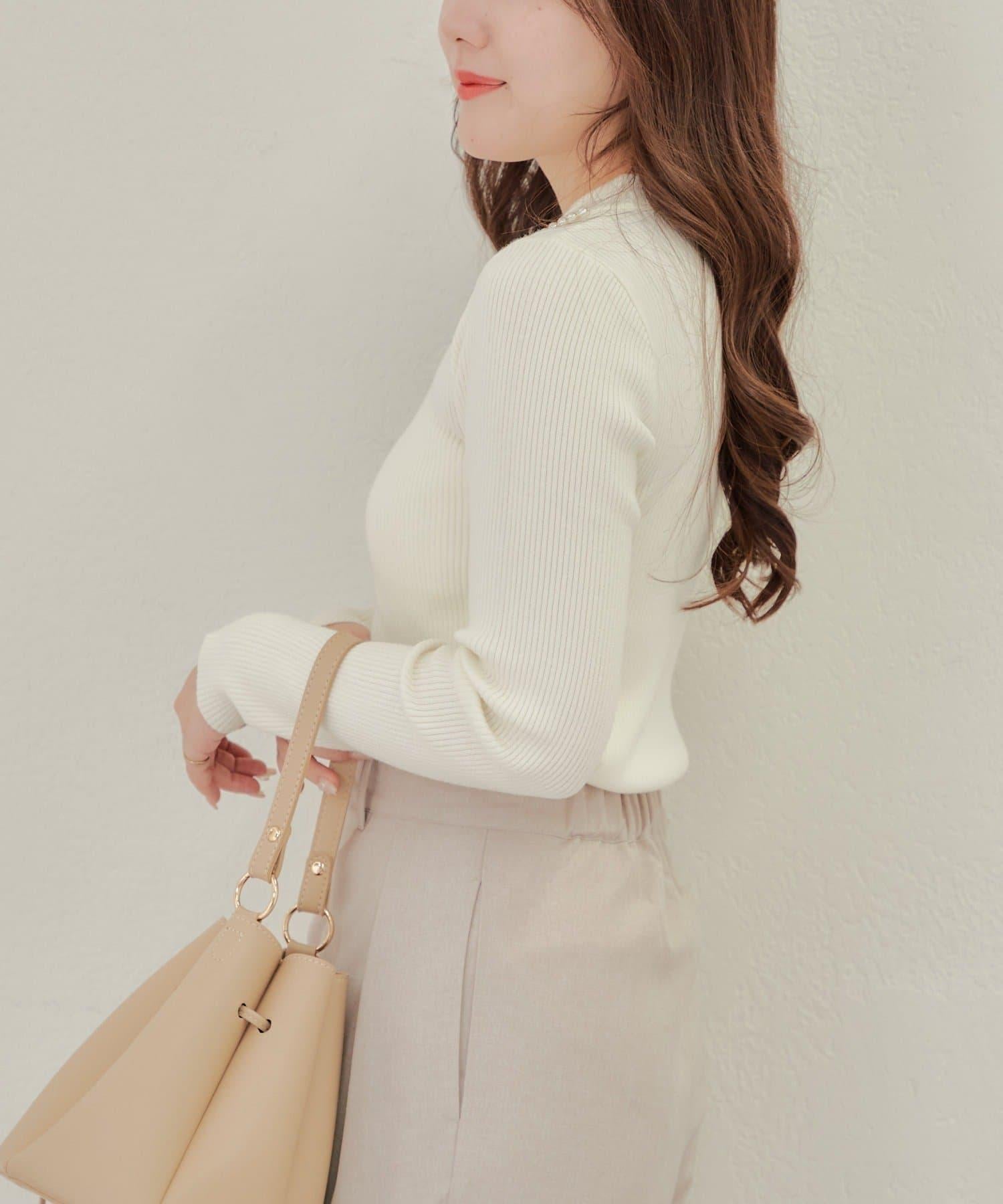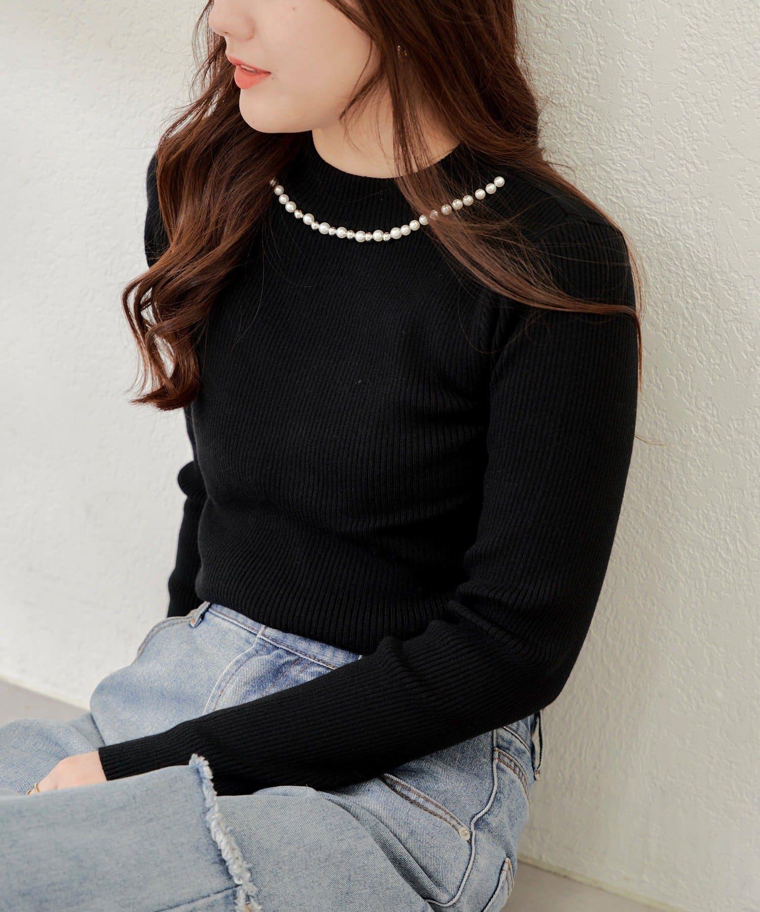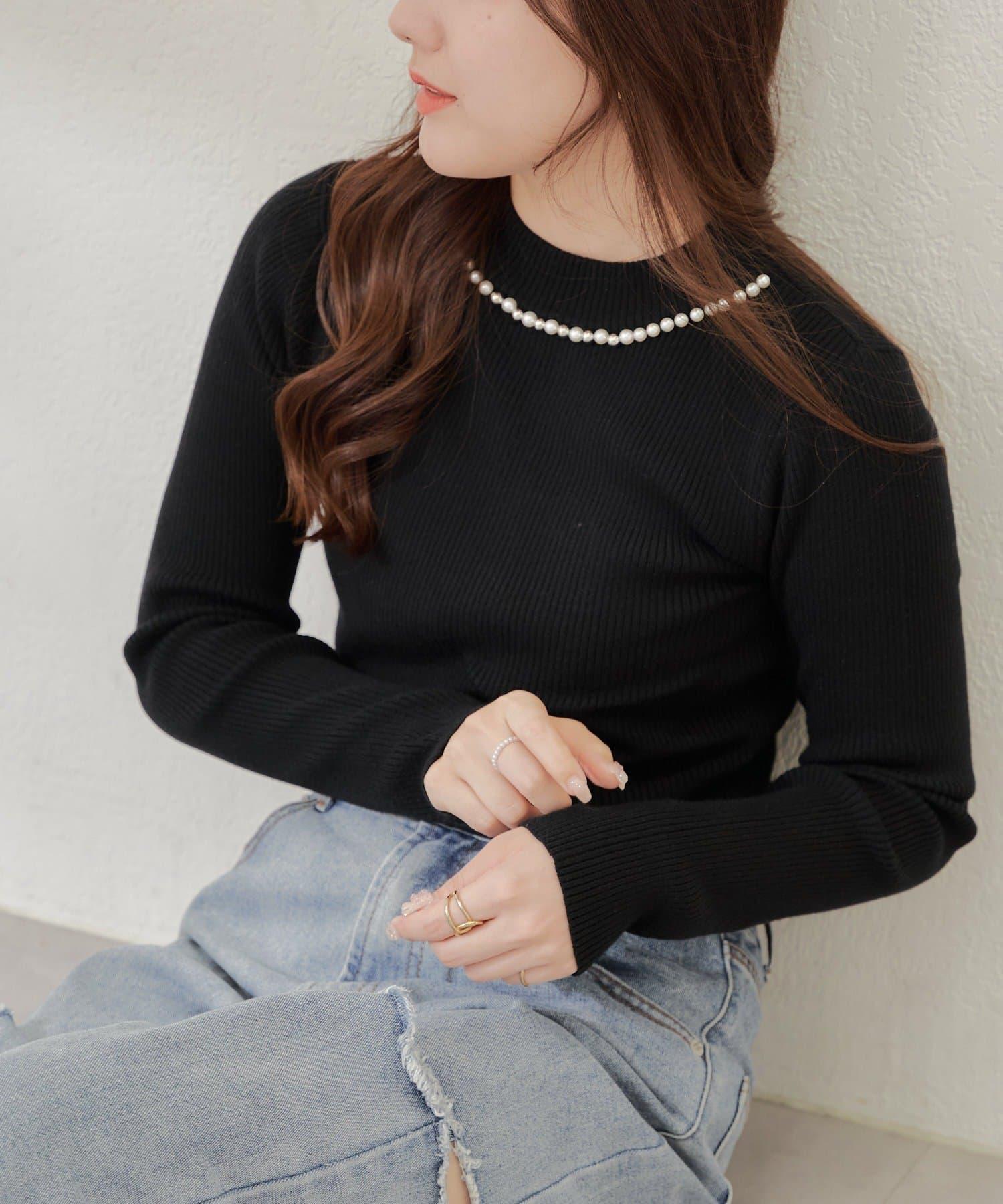 【RMAF】珍珠裝飾小高領羅紋針織衫