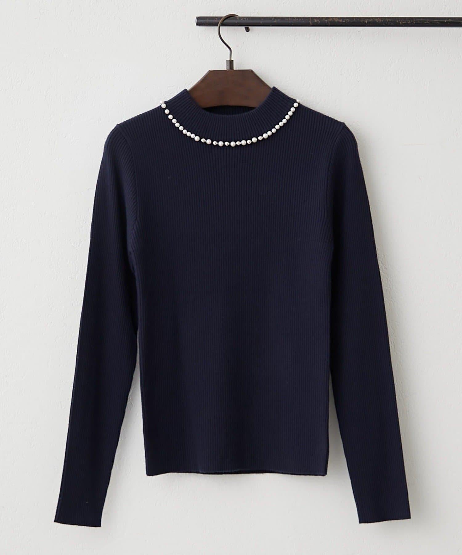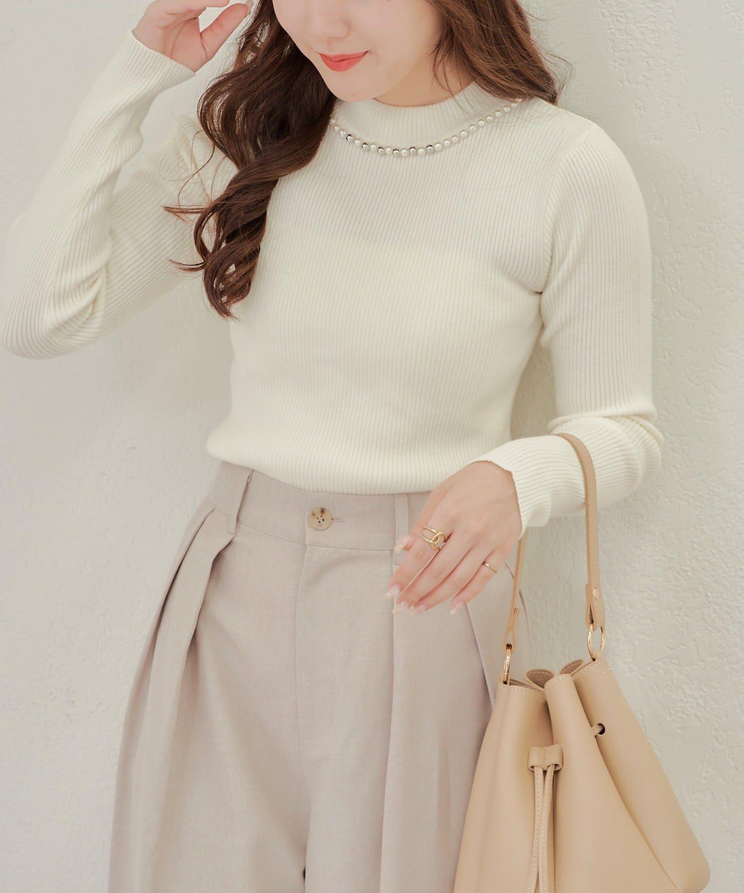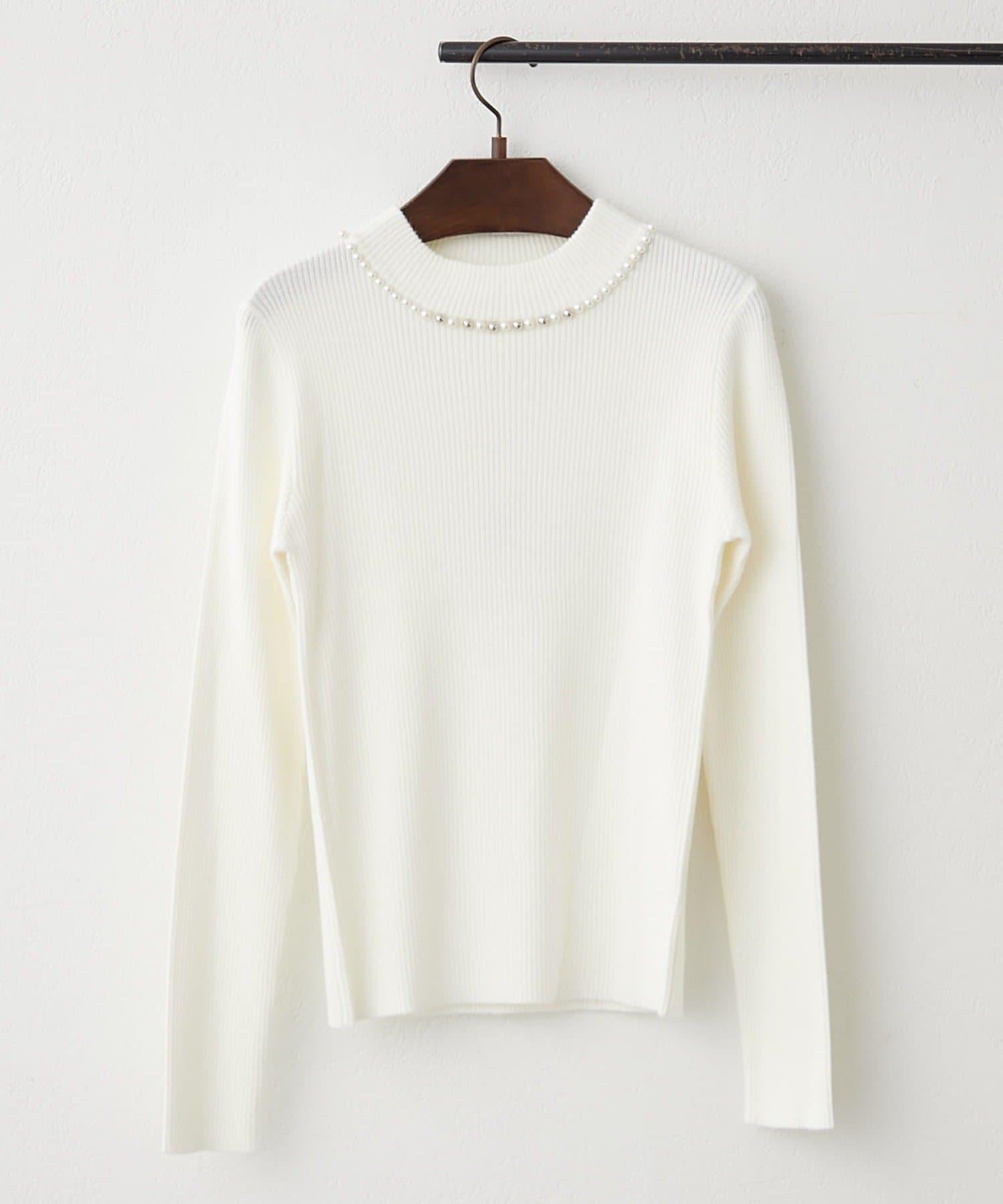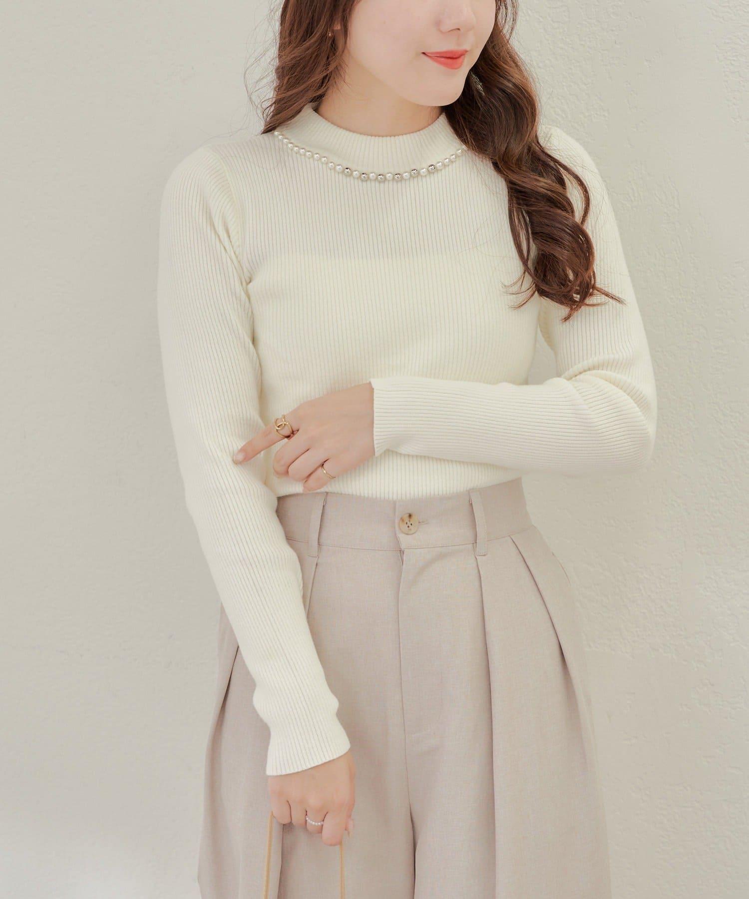 【RMAF】珍珠裝飾小高領羅紋針織衫