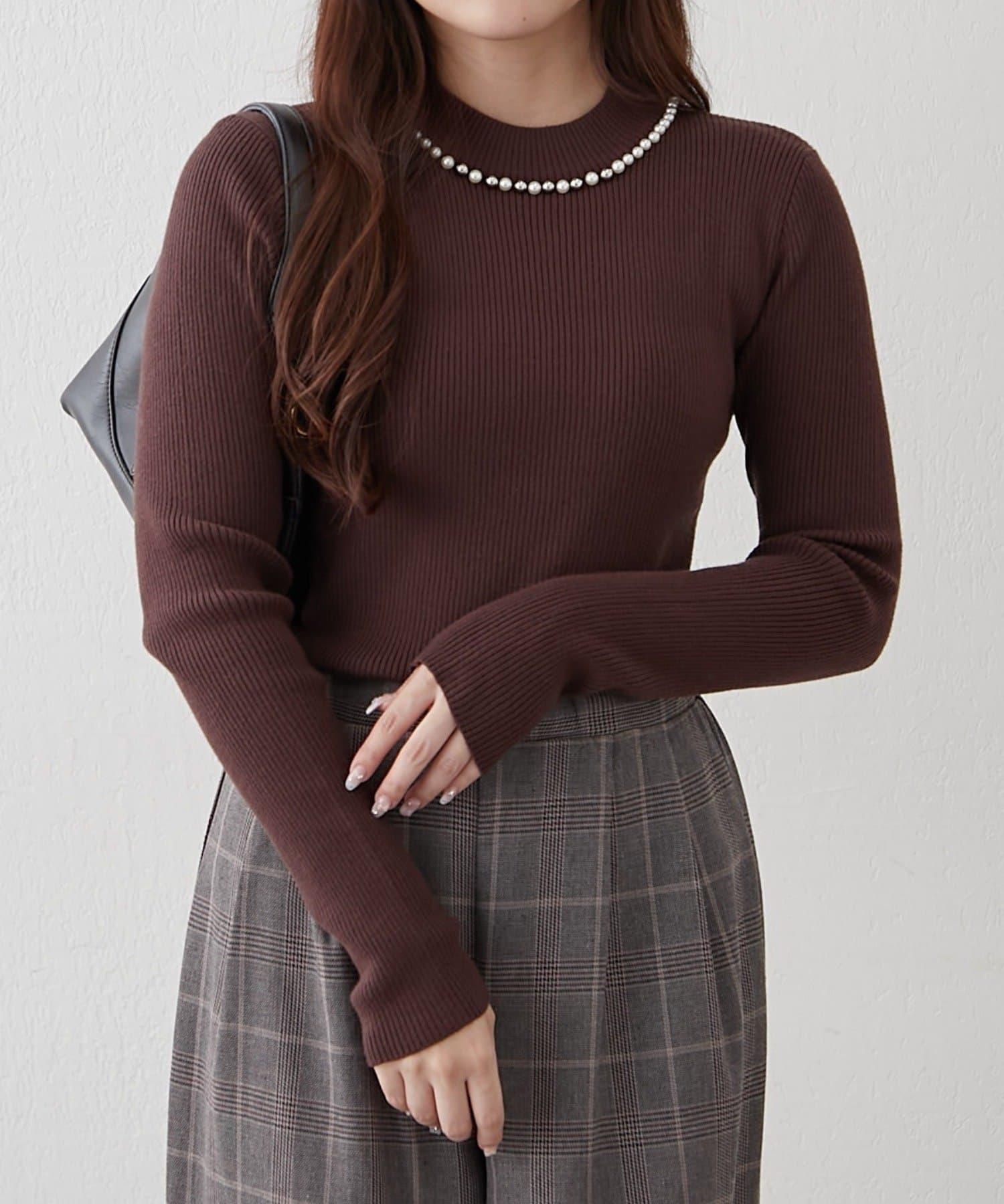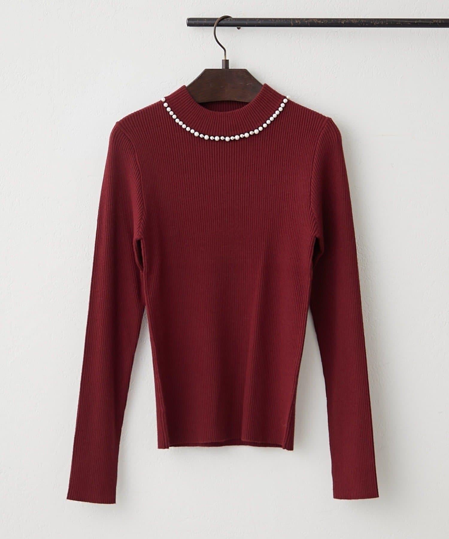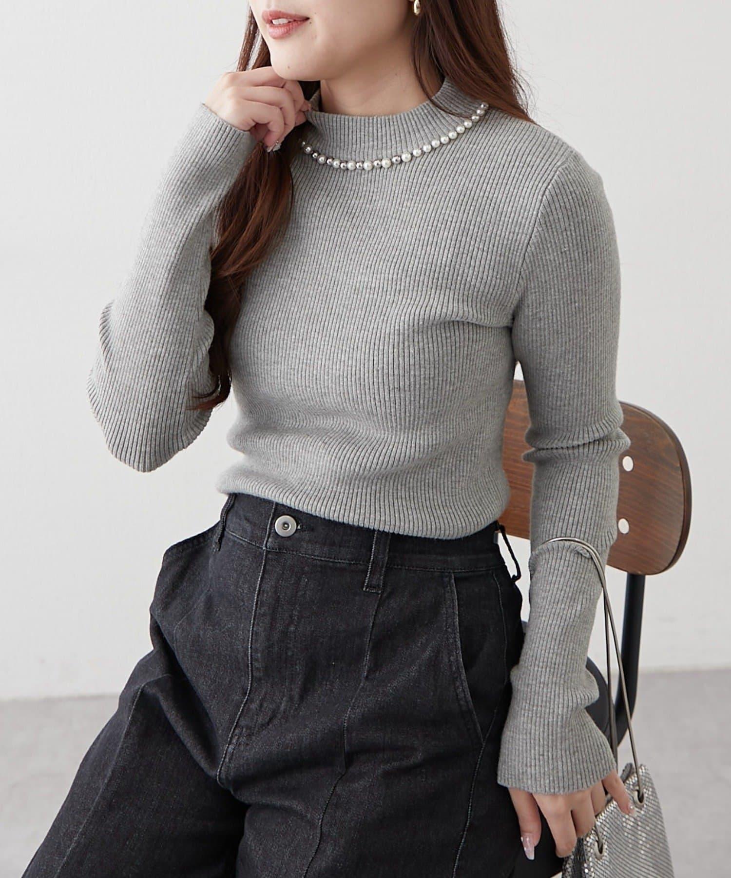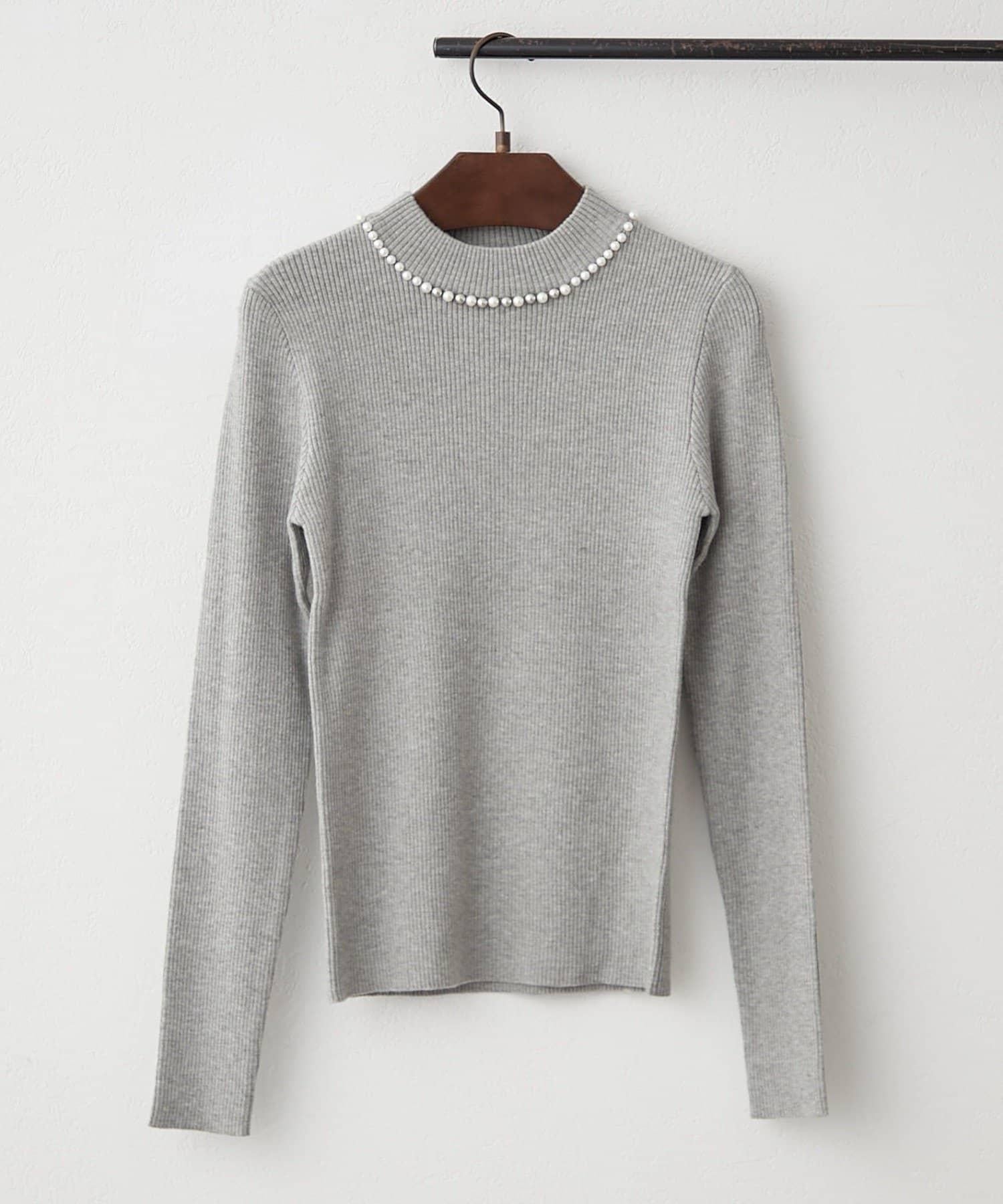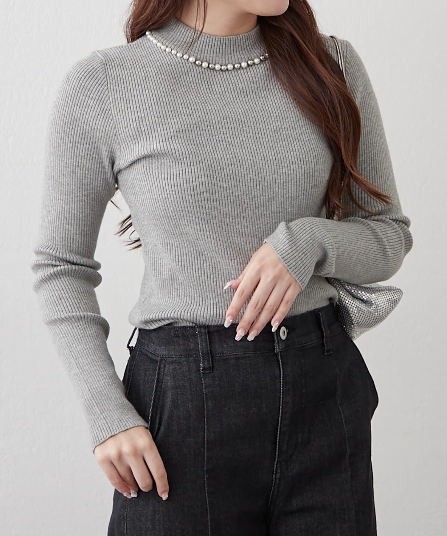 【RMAF】珍珠裝飾小高領羅紋針織衫
