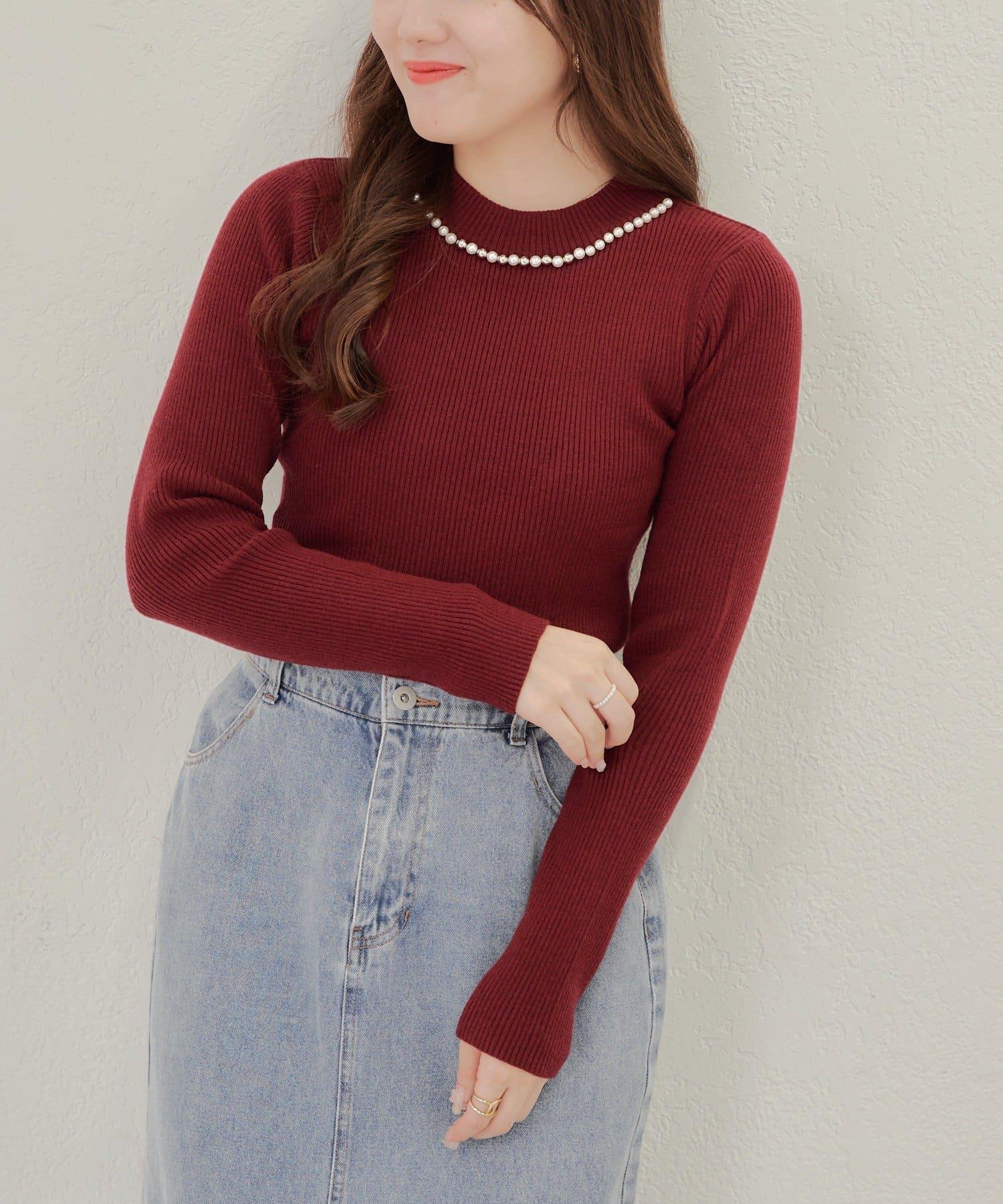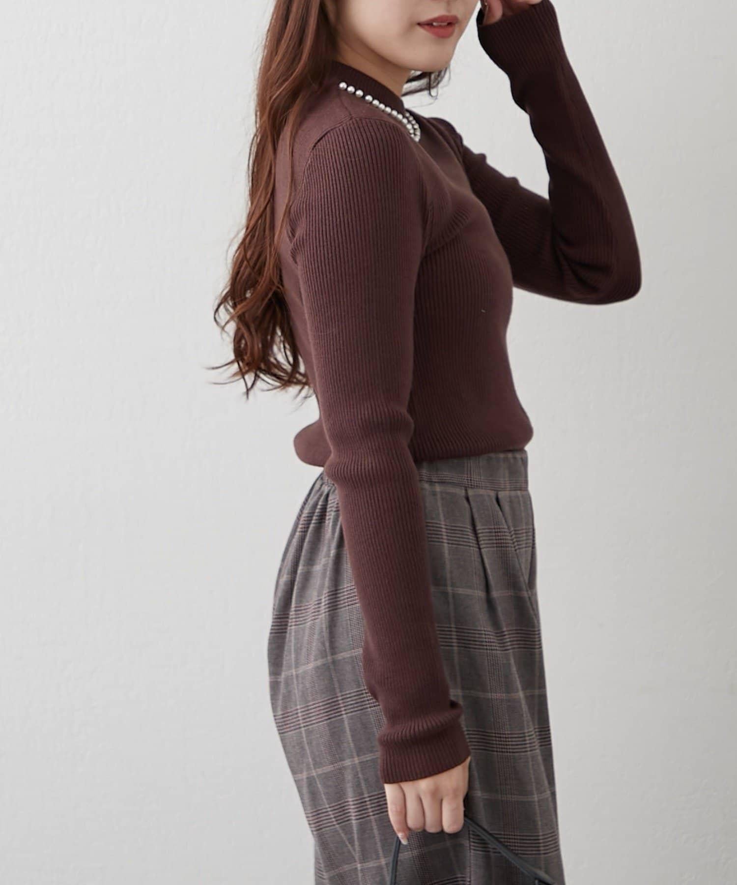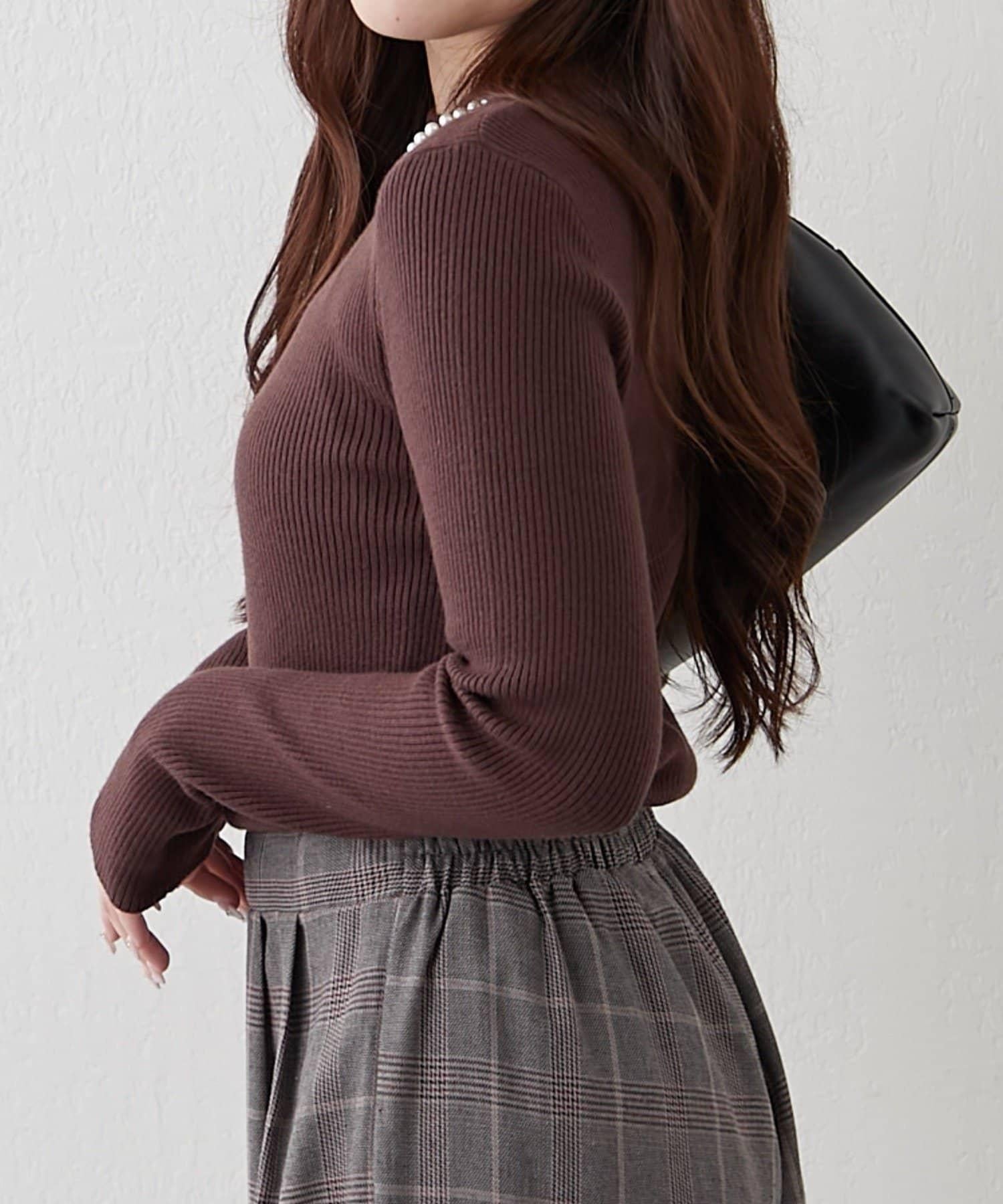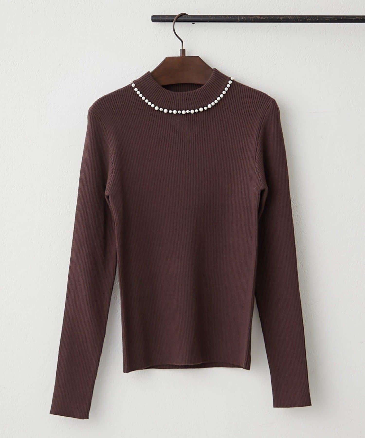 【RMAF】珍珠裝飾小高領羅紋針織衫