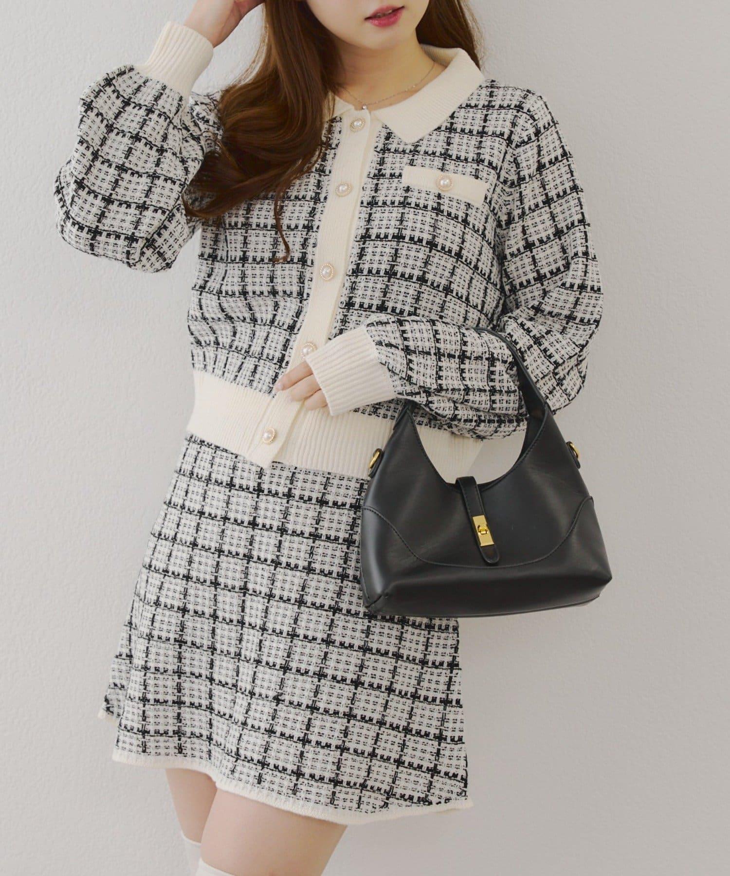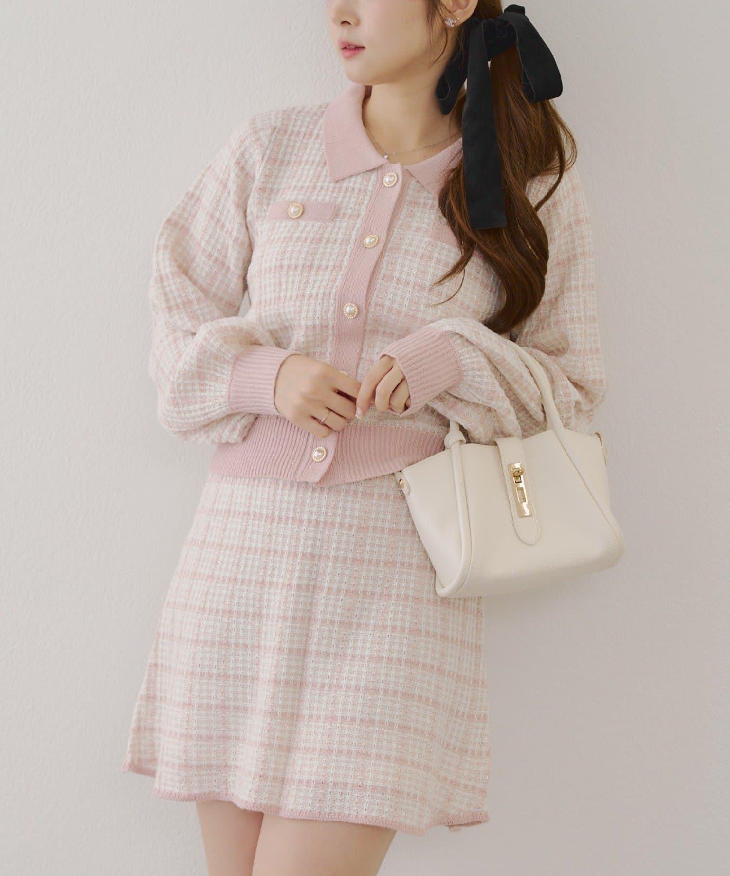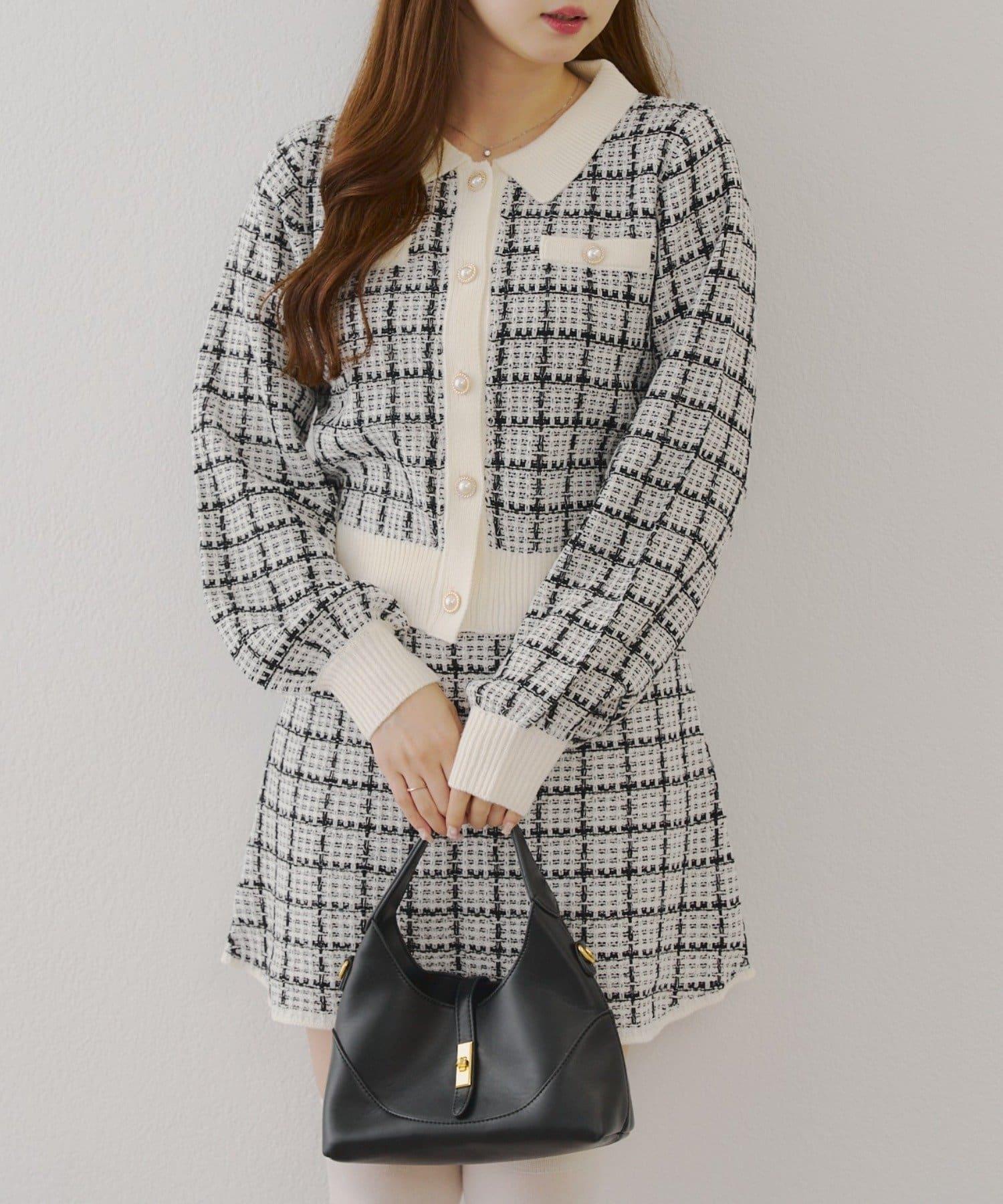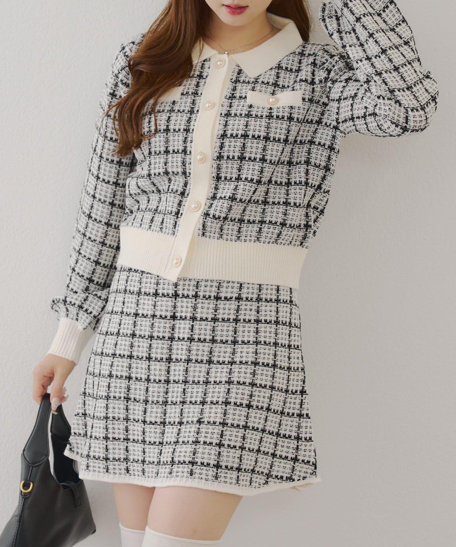 可愛的針織開衫和迷你裙套裝,採用優雅的斜紋軟呢面料。