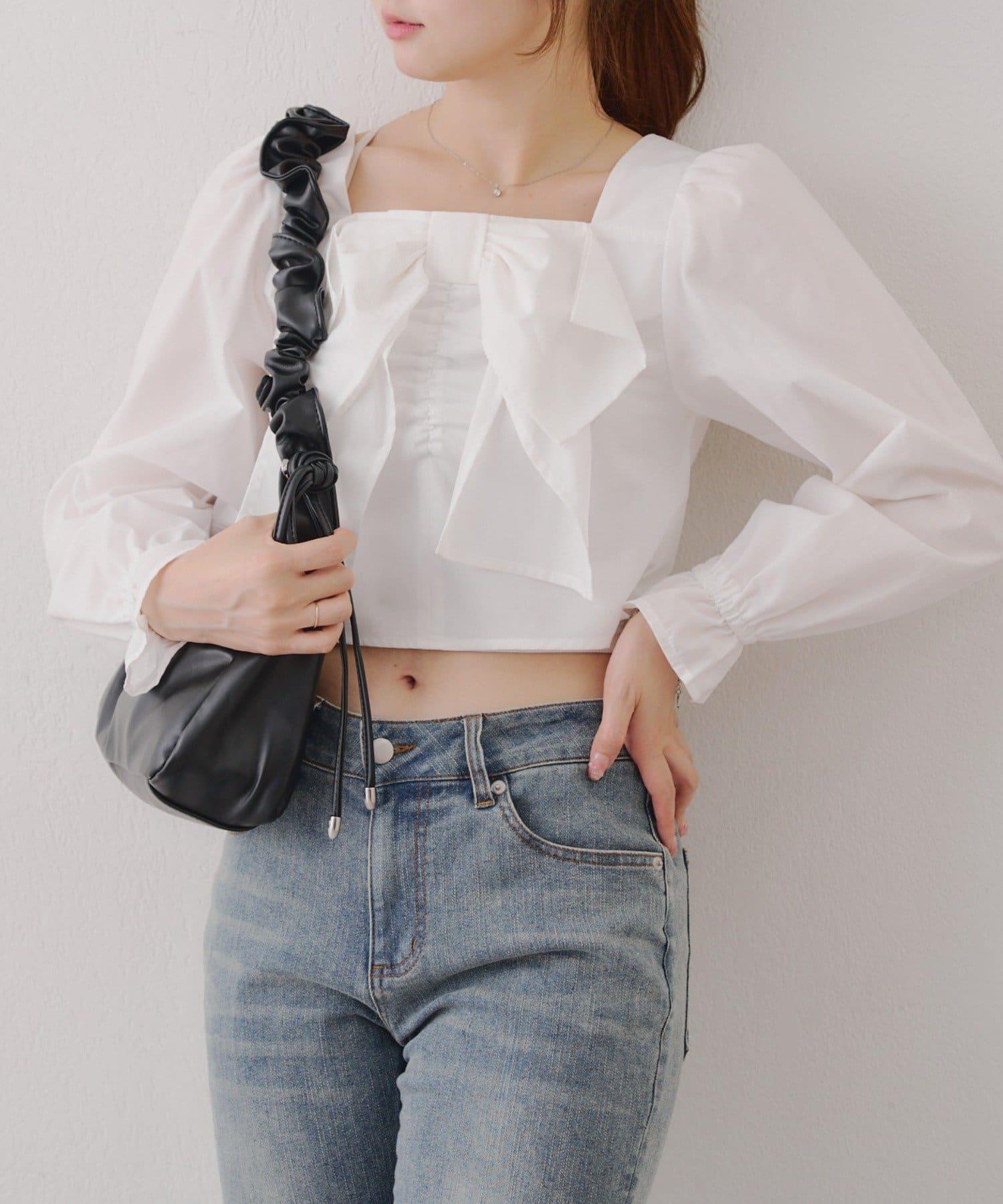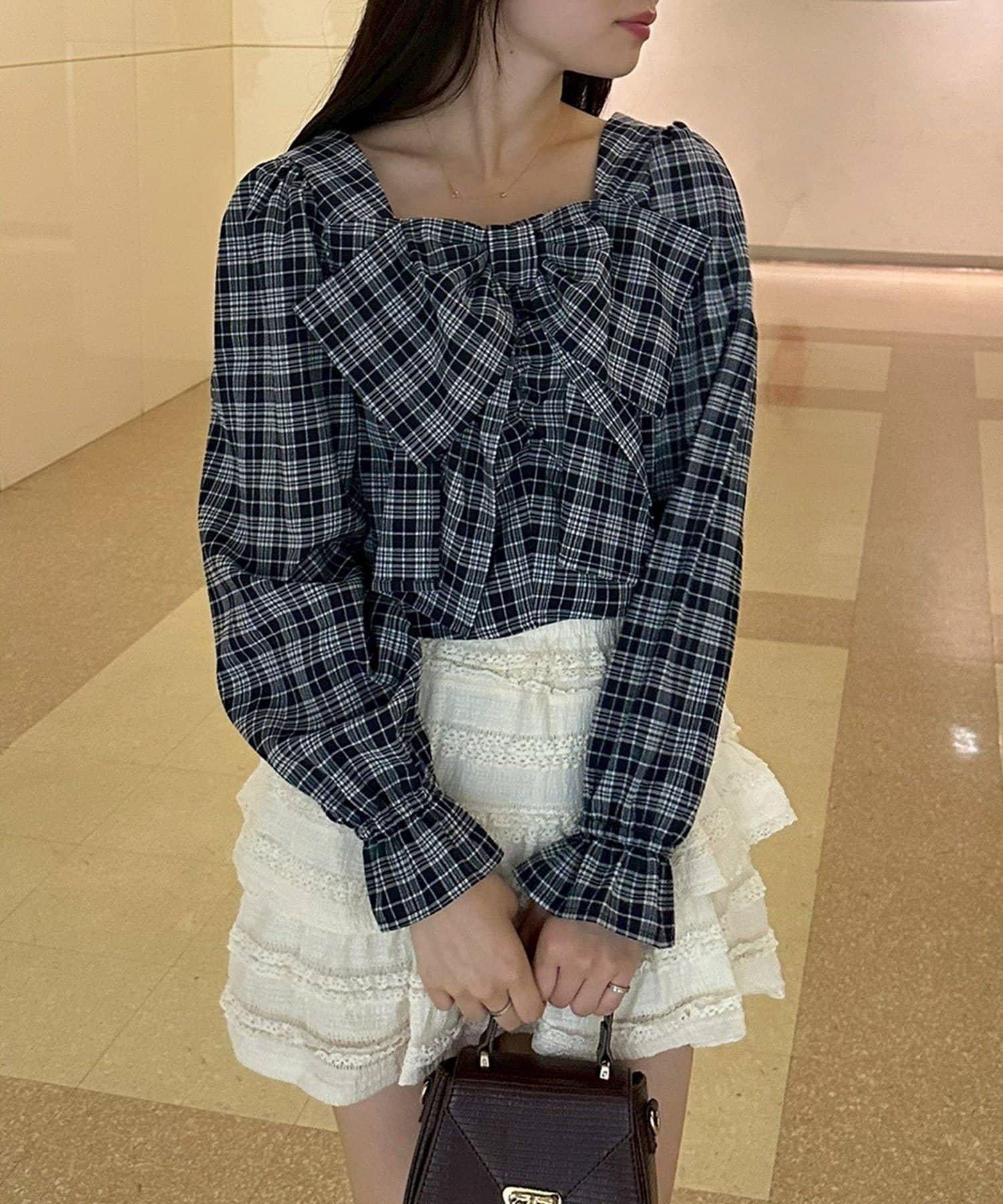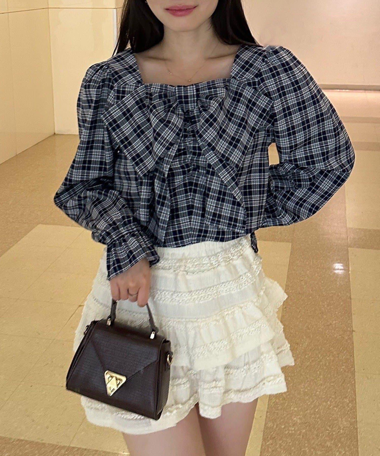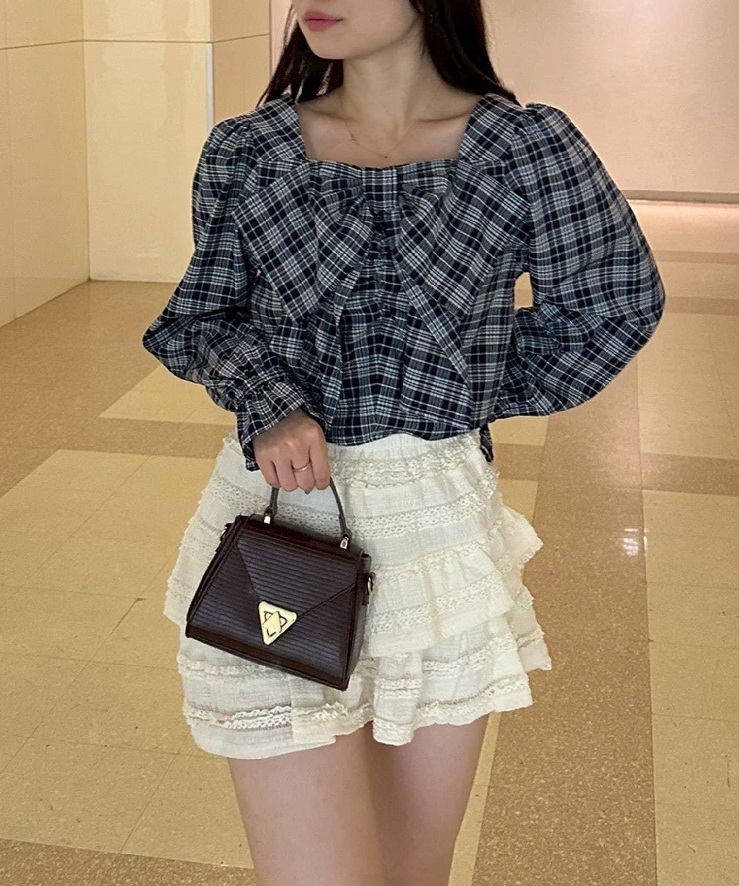 方形領口的上衣,將肩部線條展現得淋漓盡致。
