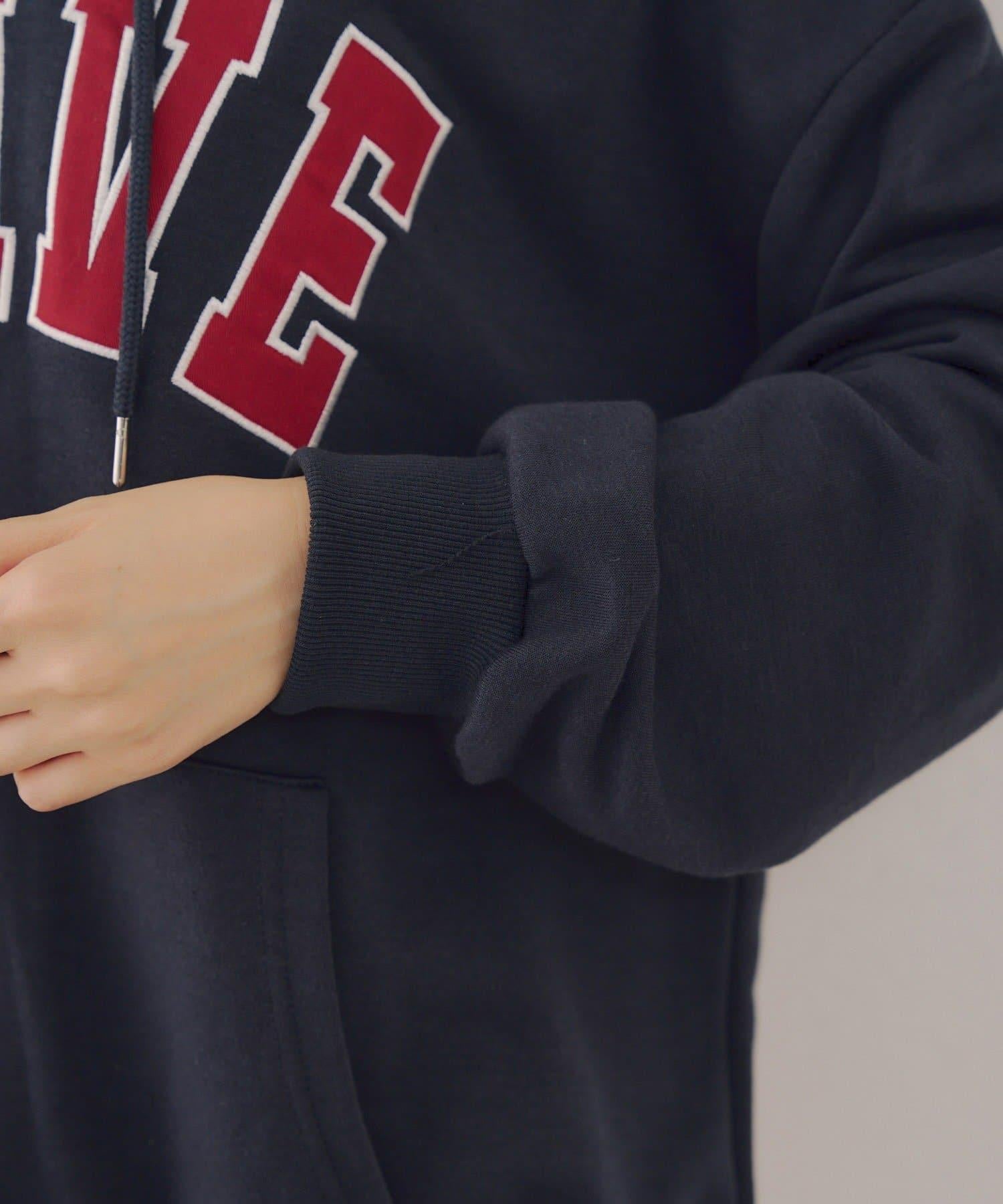 這款大號派克大衣上的英文字母嵌花十分搶眼。