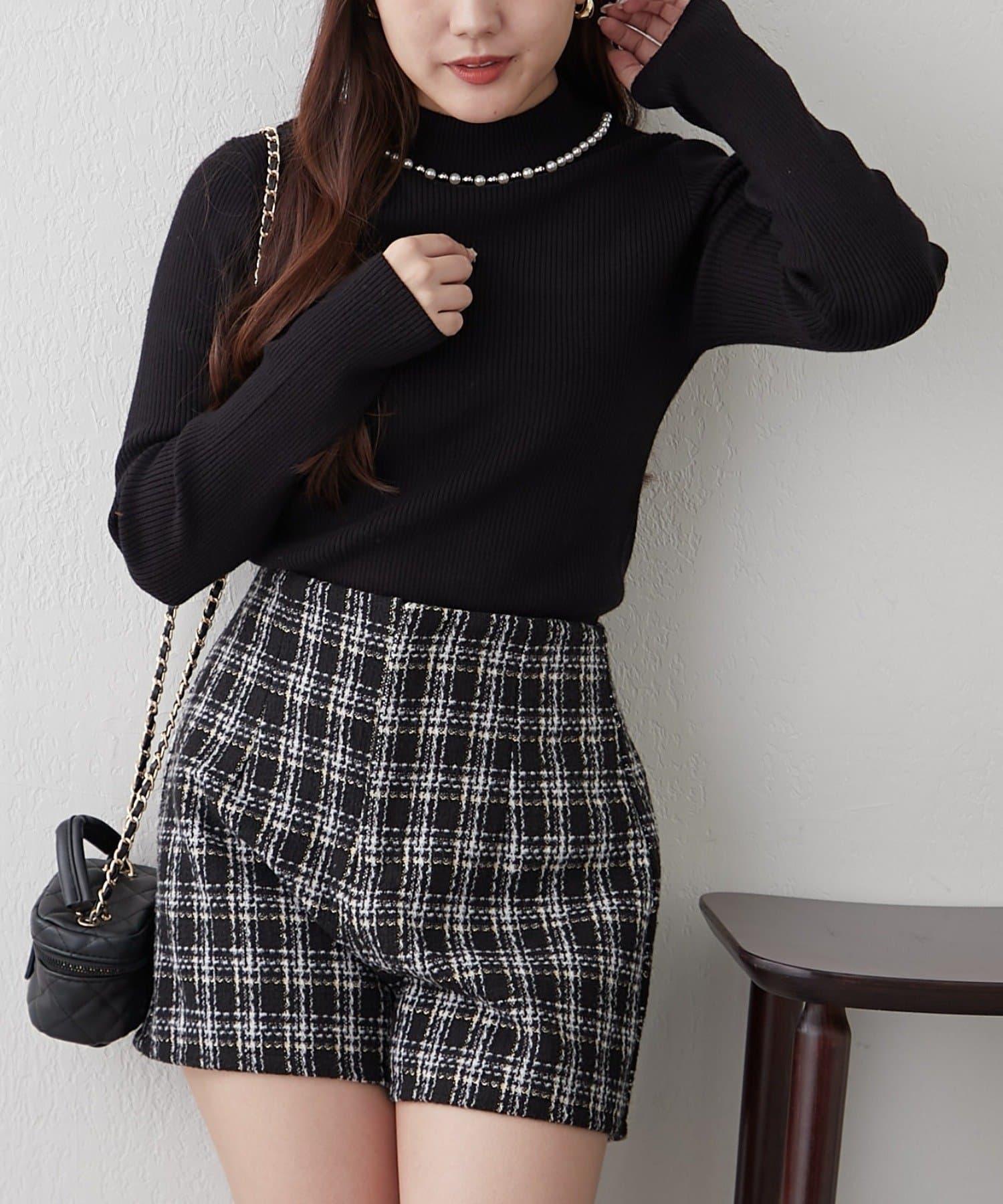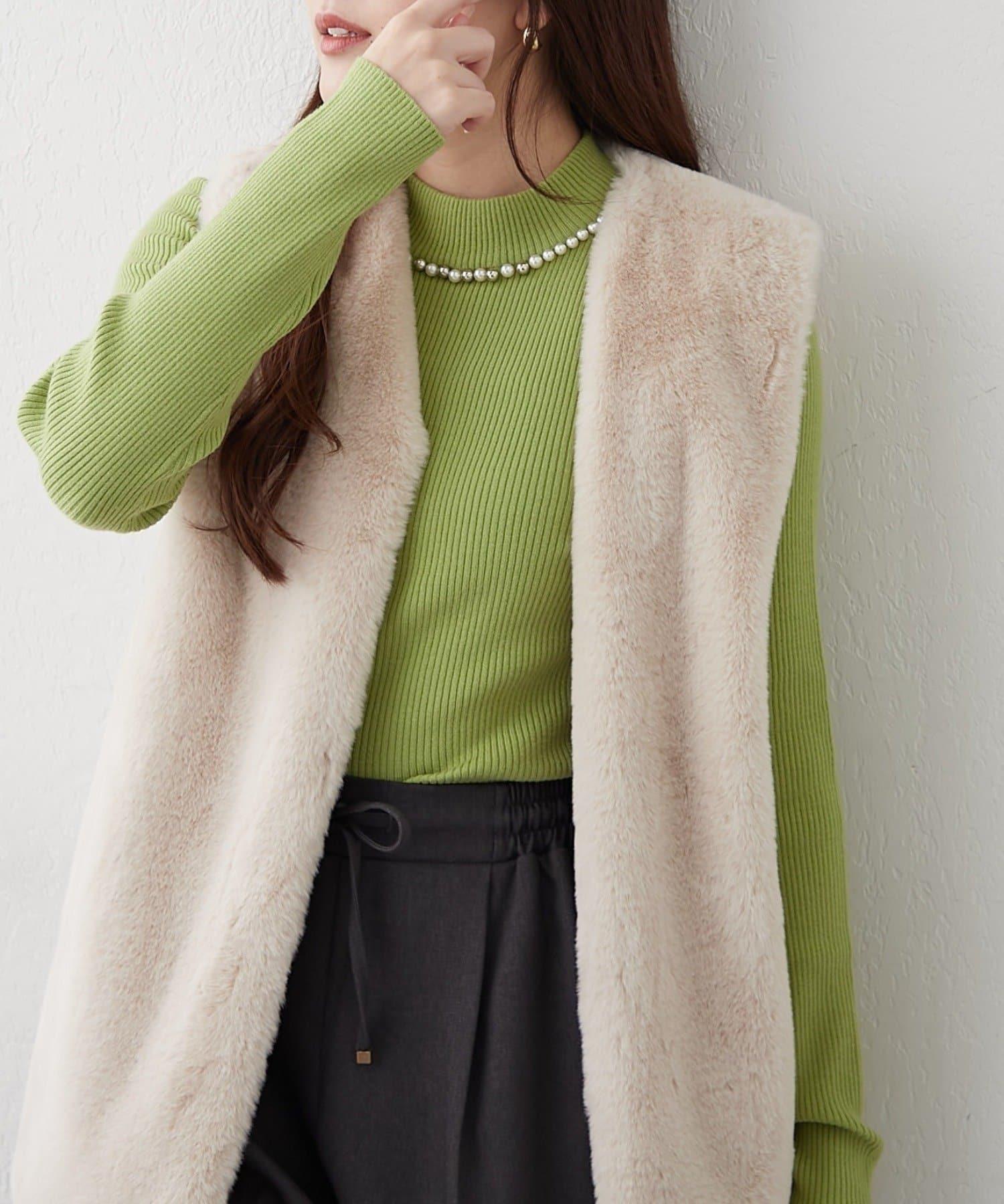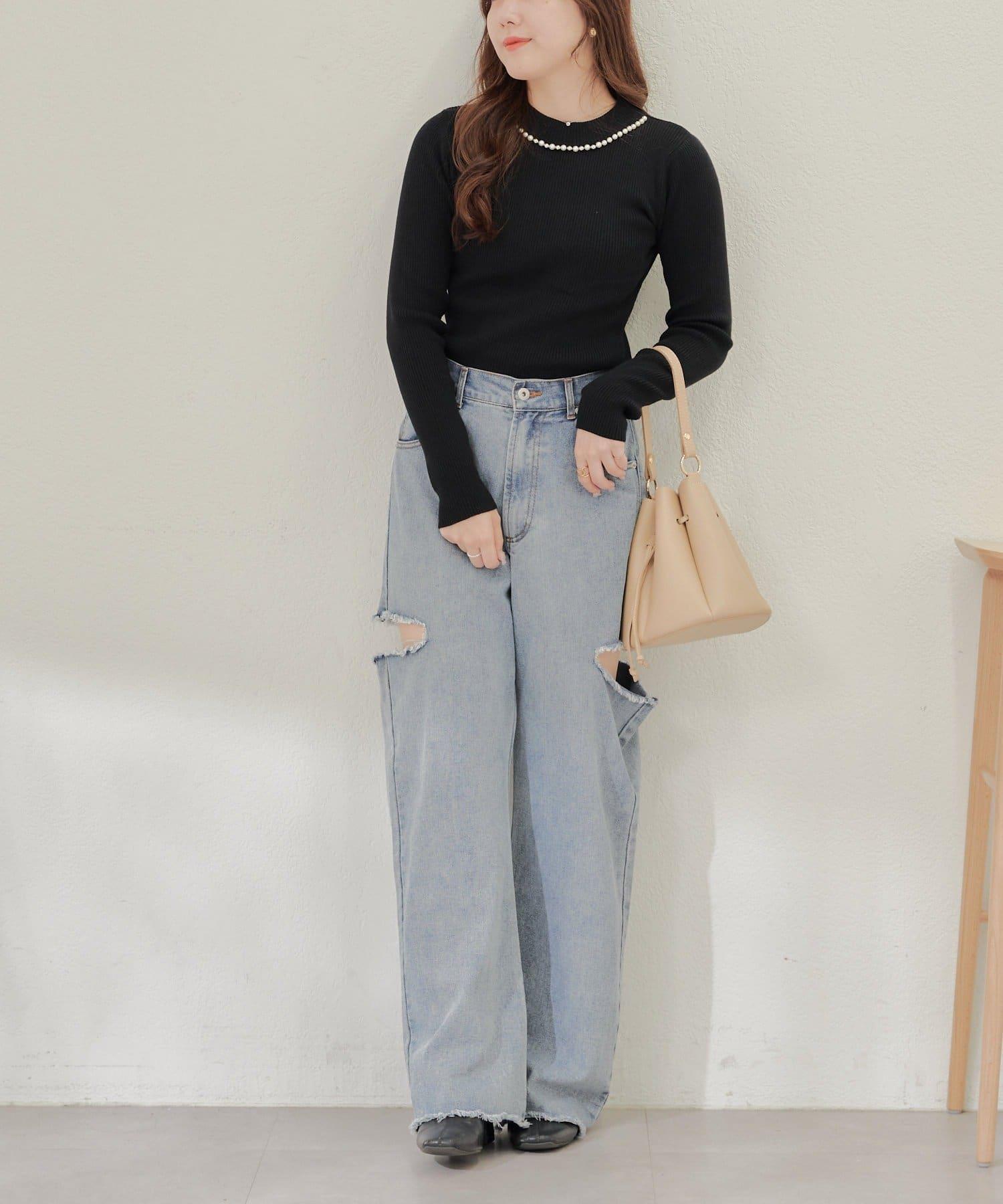 【RMAF】珍珠裝飾小高領羅紋針織衫