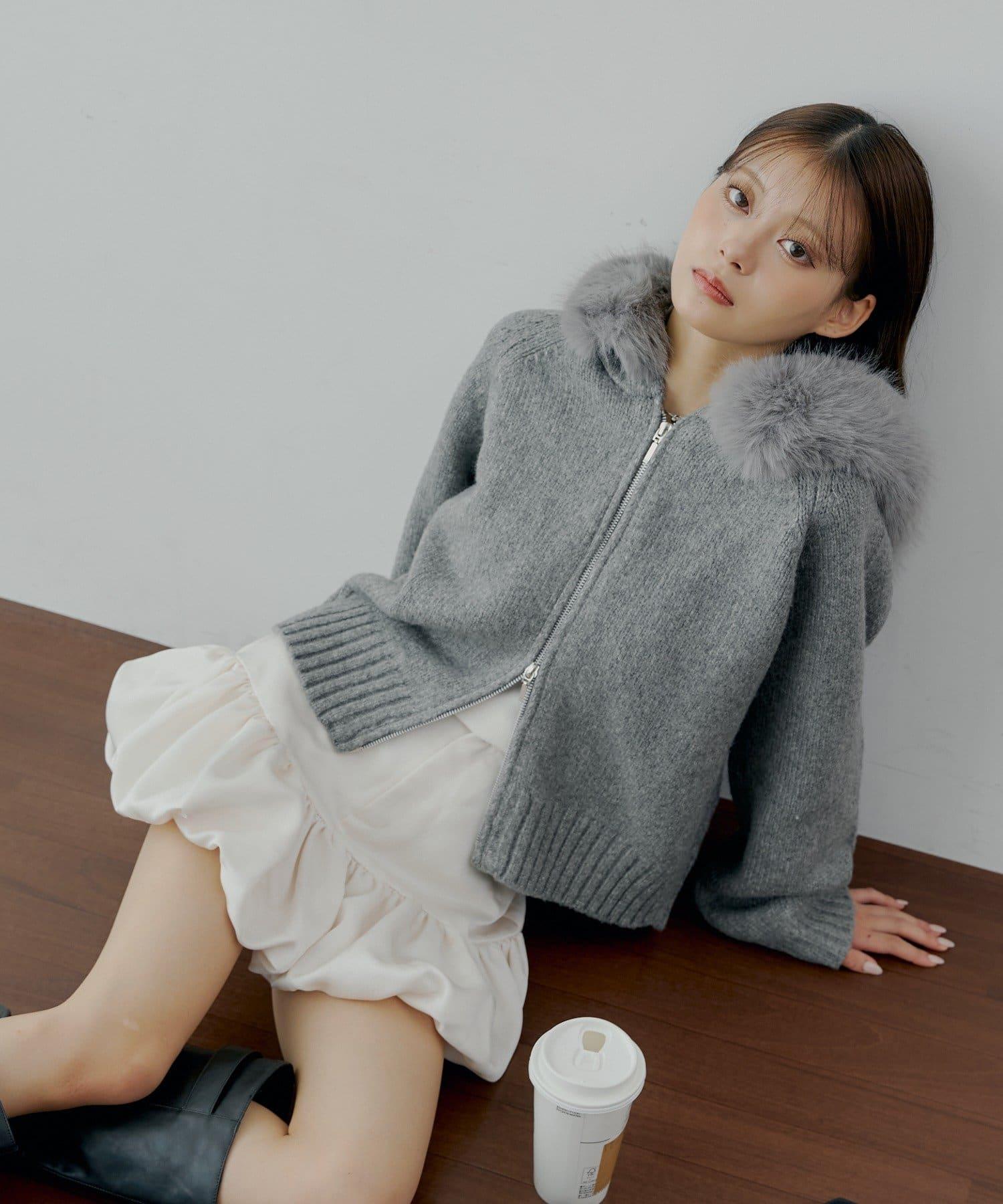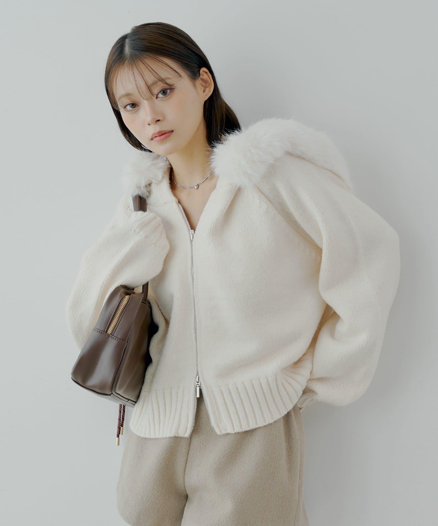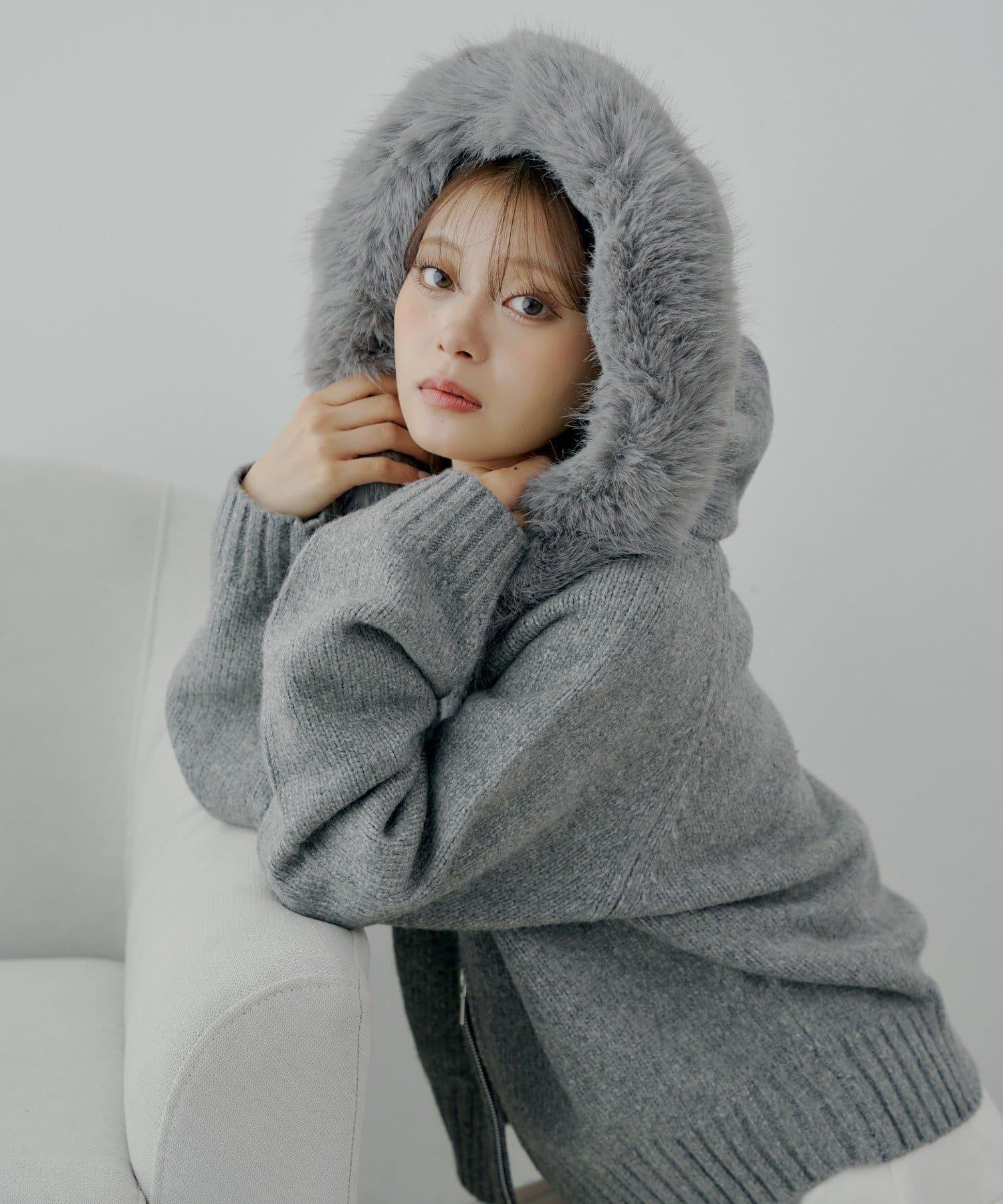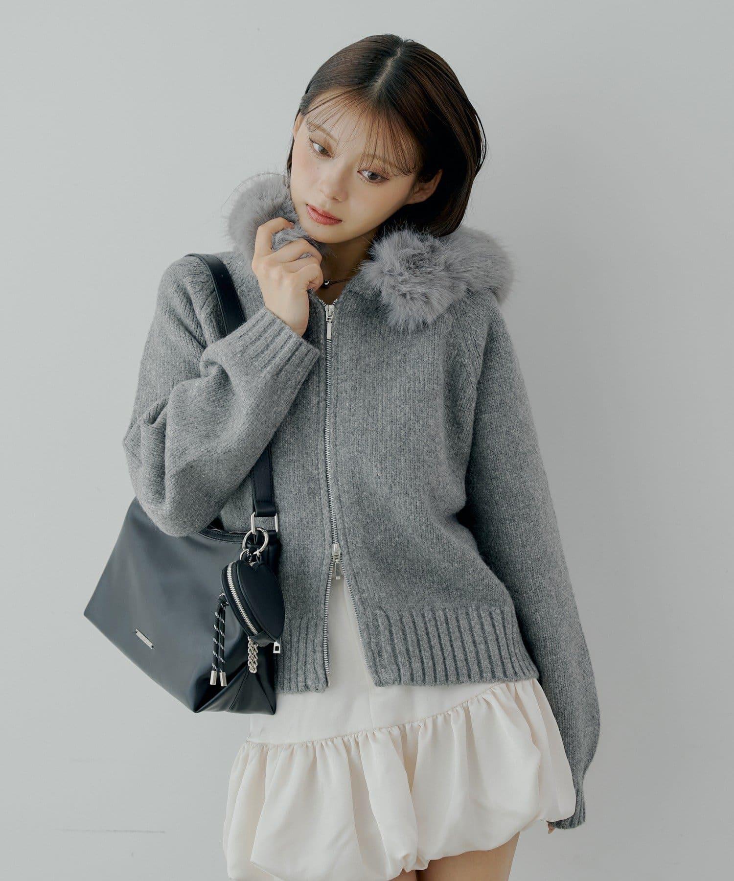 寬鬆 W 型拉鍊針織開衫,配以蓬鬆毛皮,雙向設計。