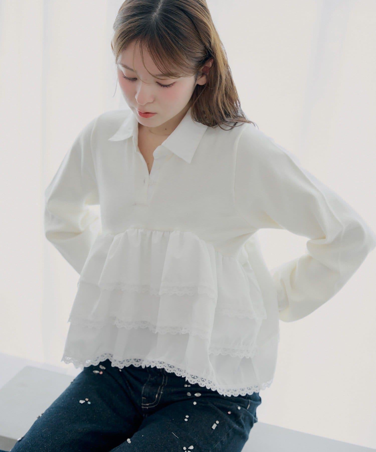 【SALON by Chico】蕾絲層疊荷葉邊翻領針織衫