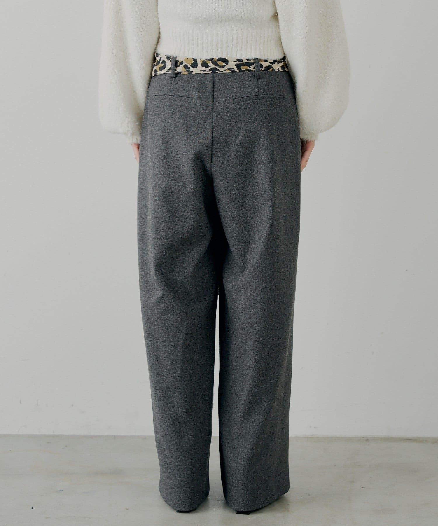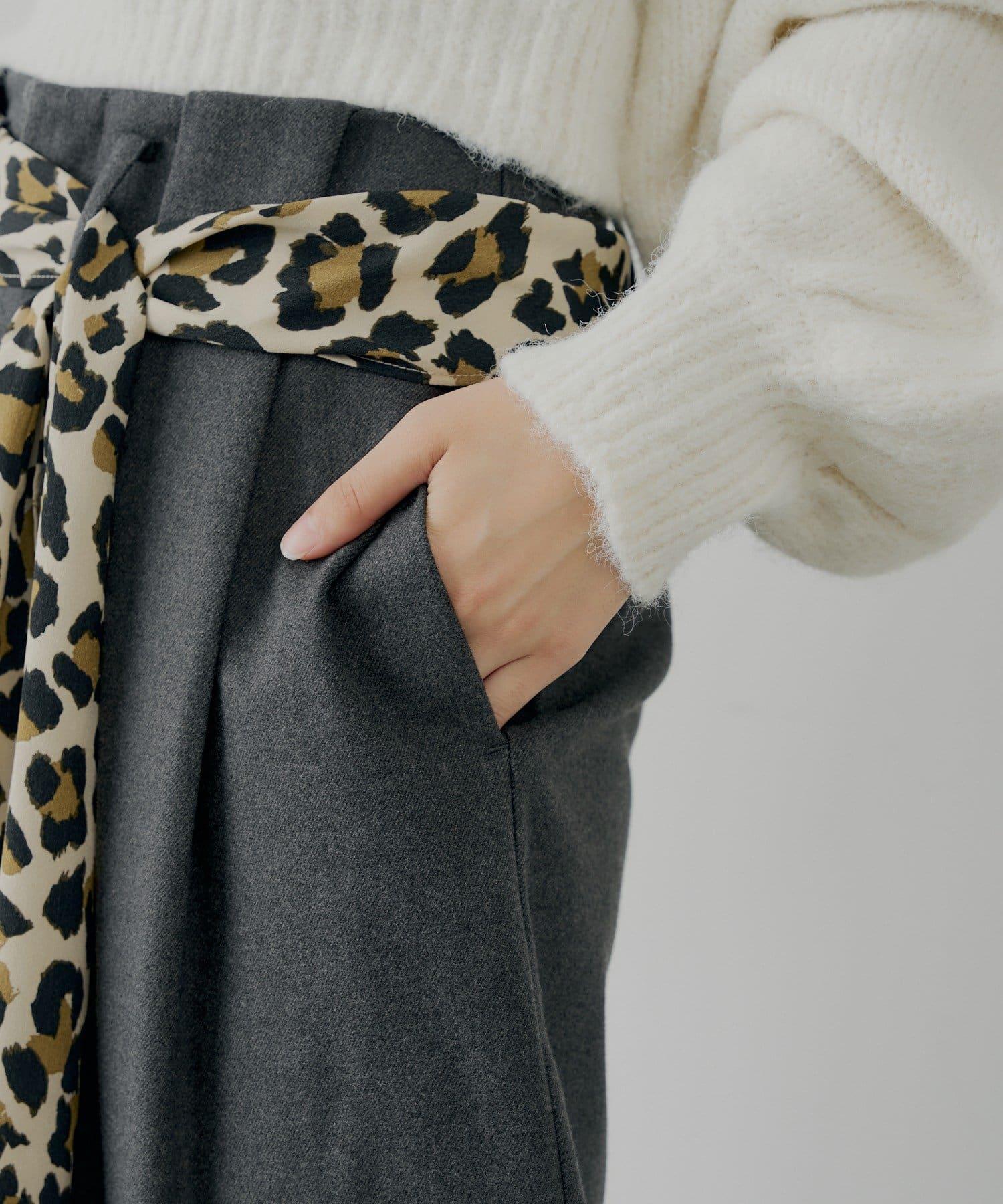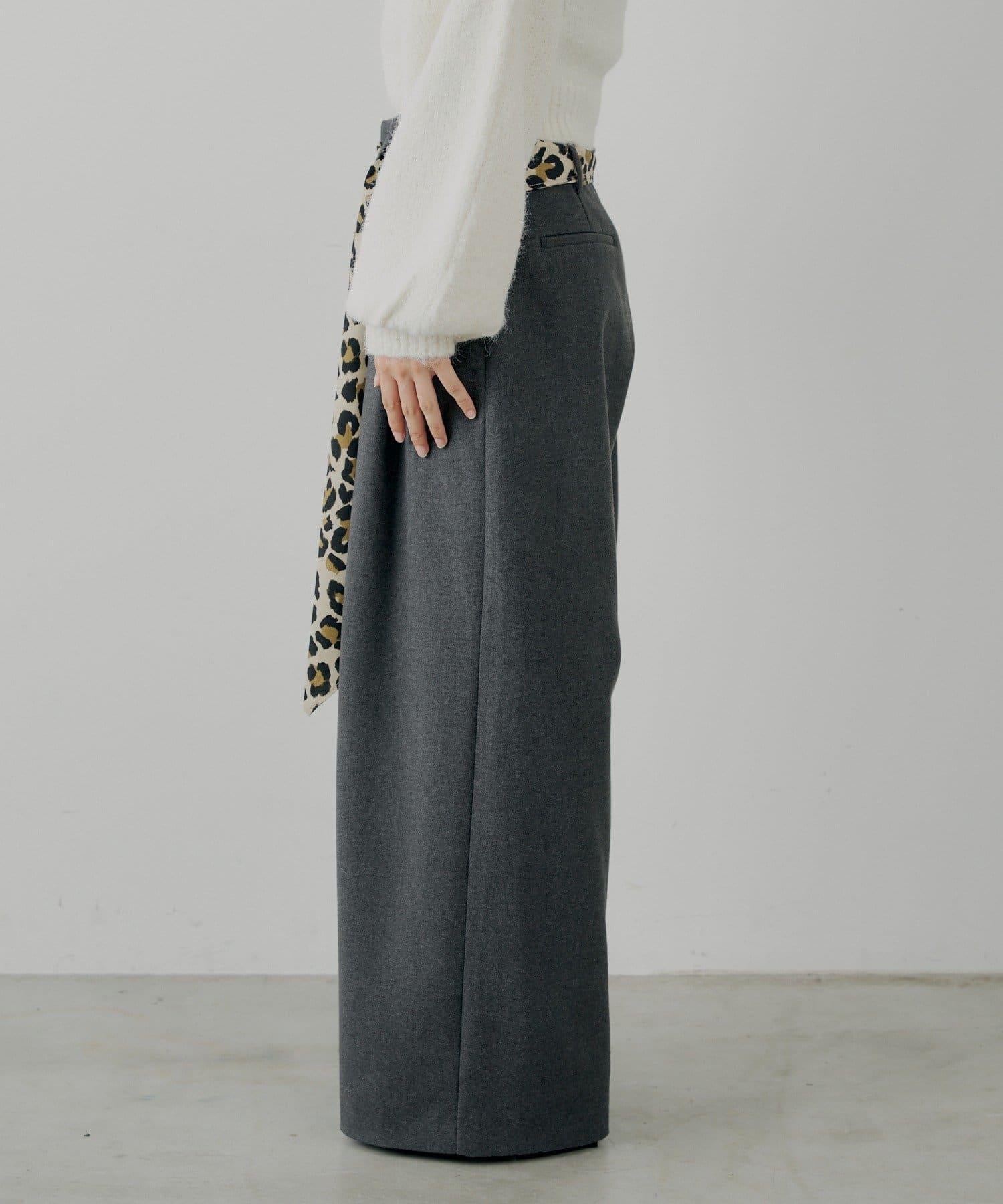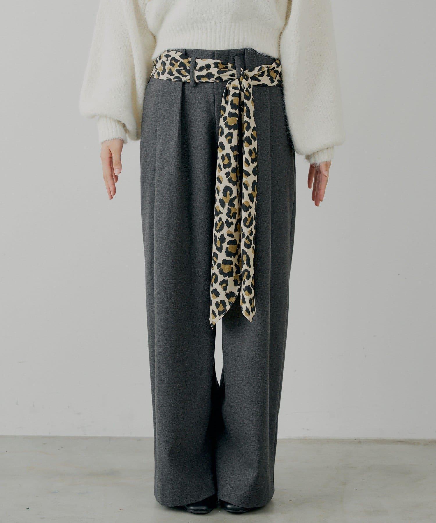 雙襉羊毛休閒褲,配圍巾腰帶。