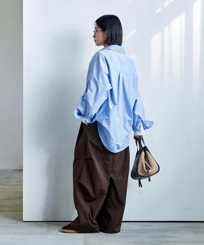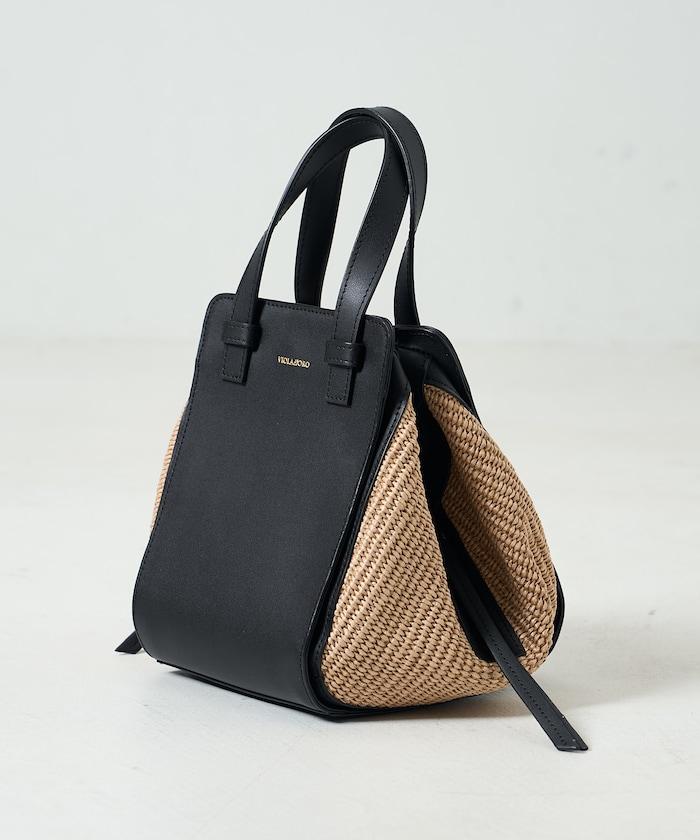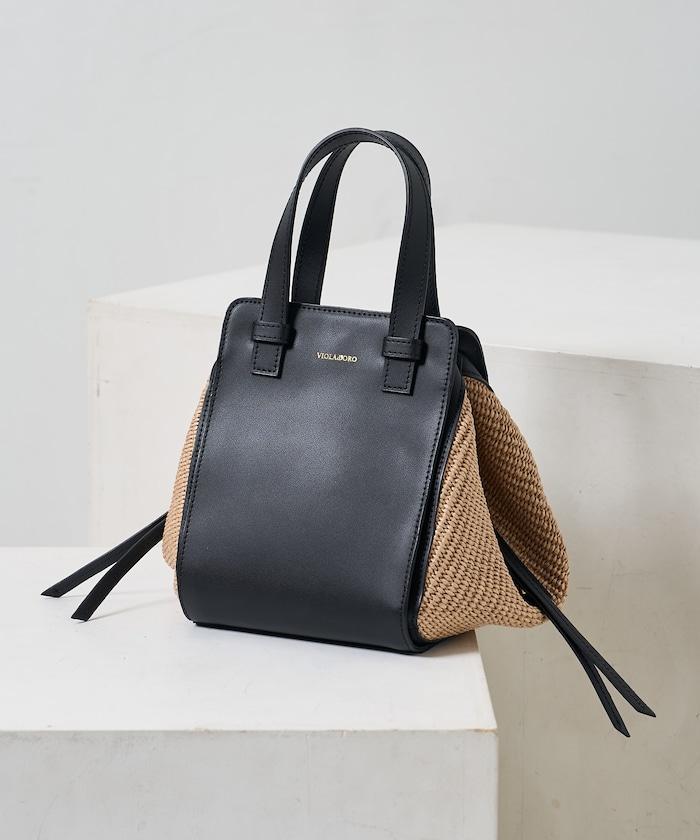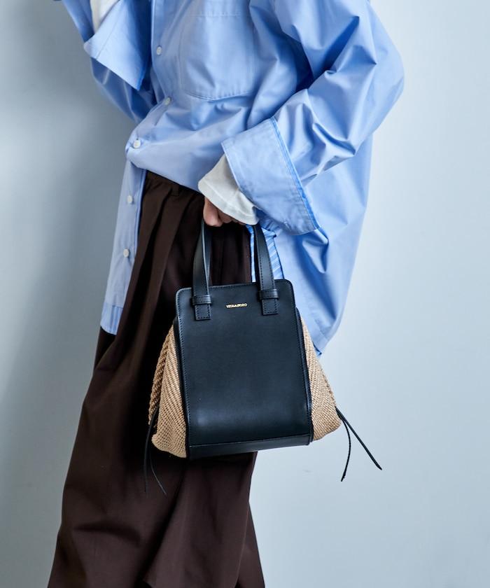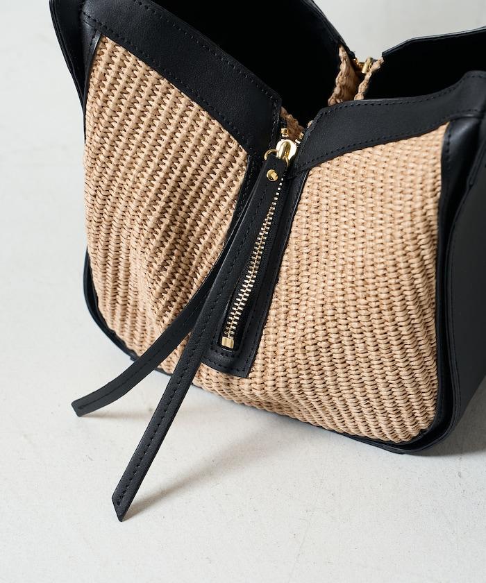 側邊的酒椰纖維材料為容易顯得厚重的皮質手袋增添了輕盈感。