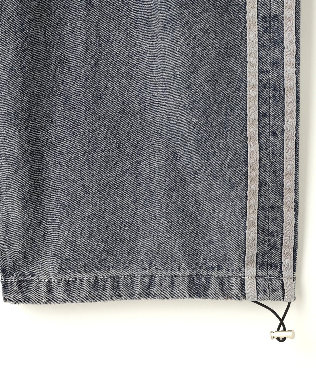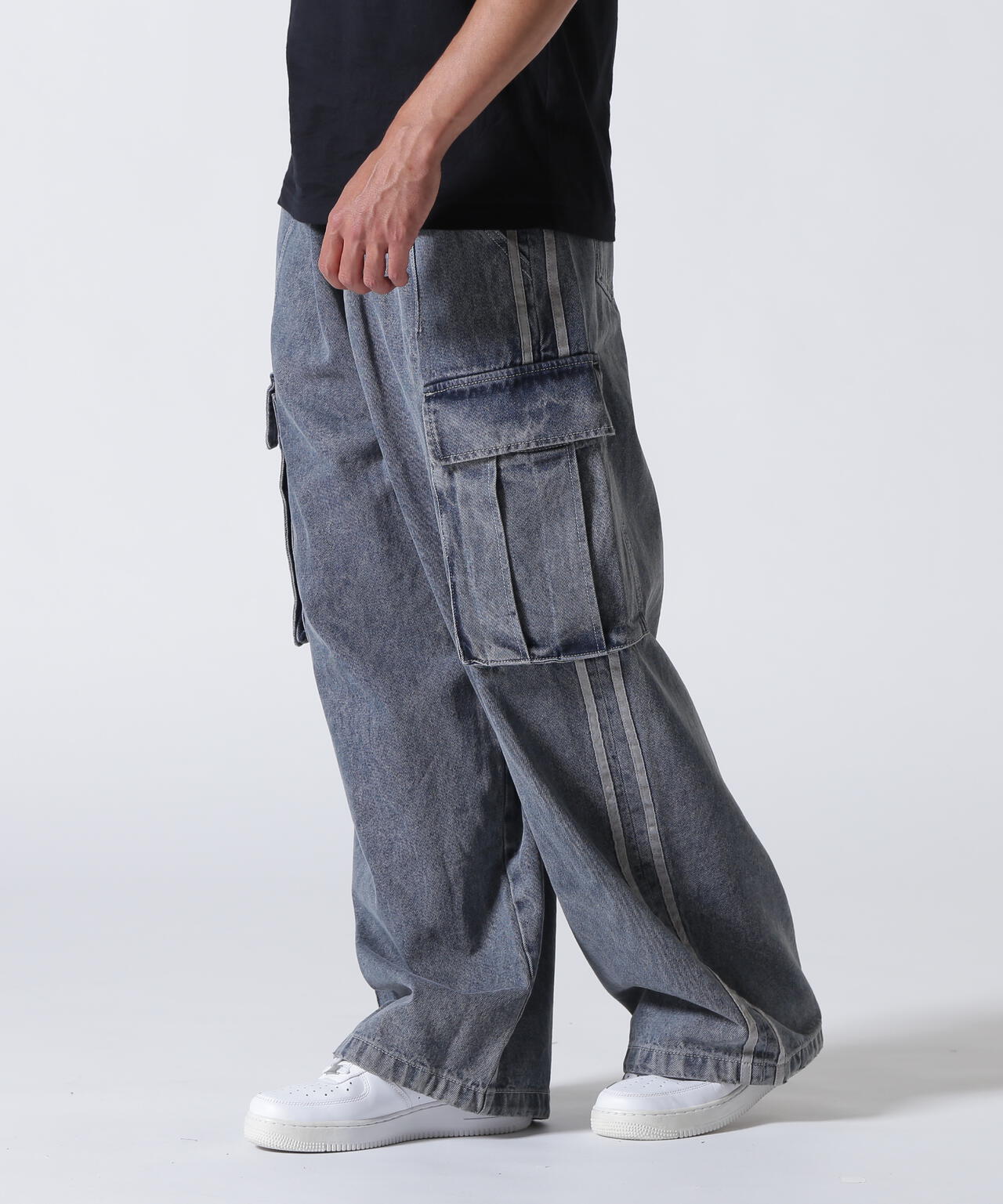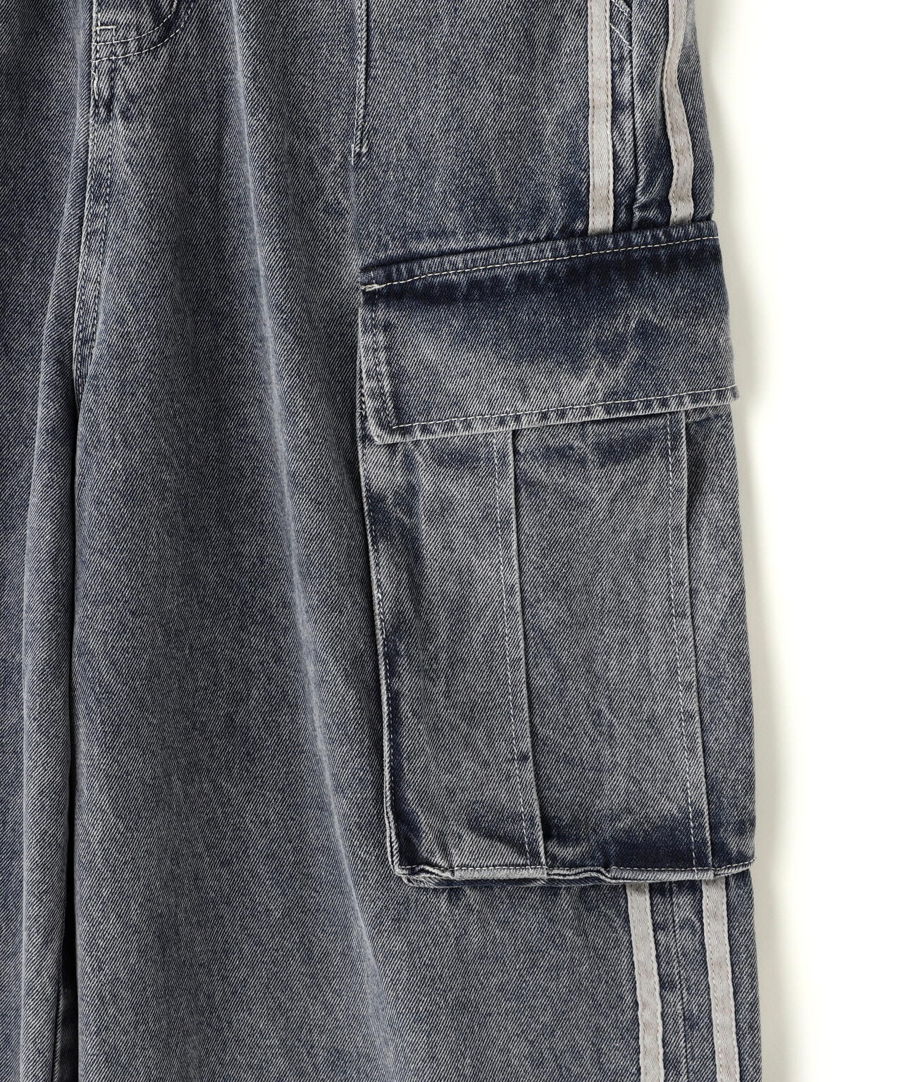 寬鬆牛仔長褲,側袋和側線裝飾。