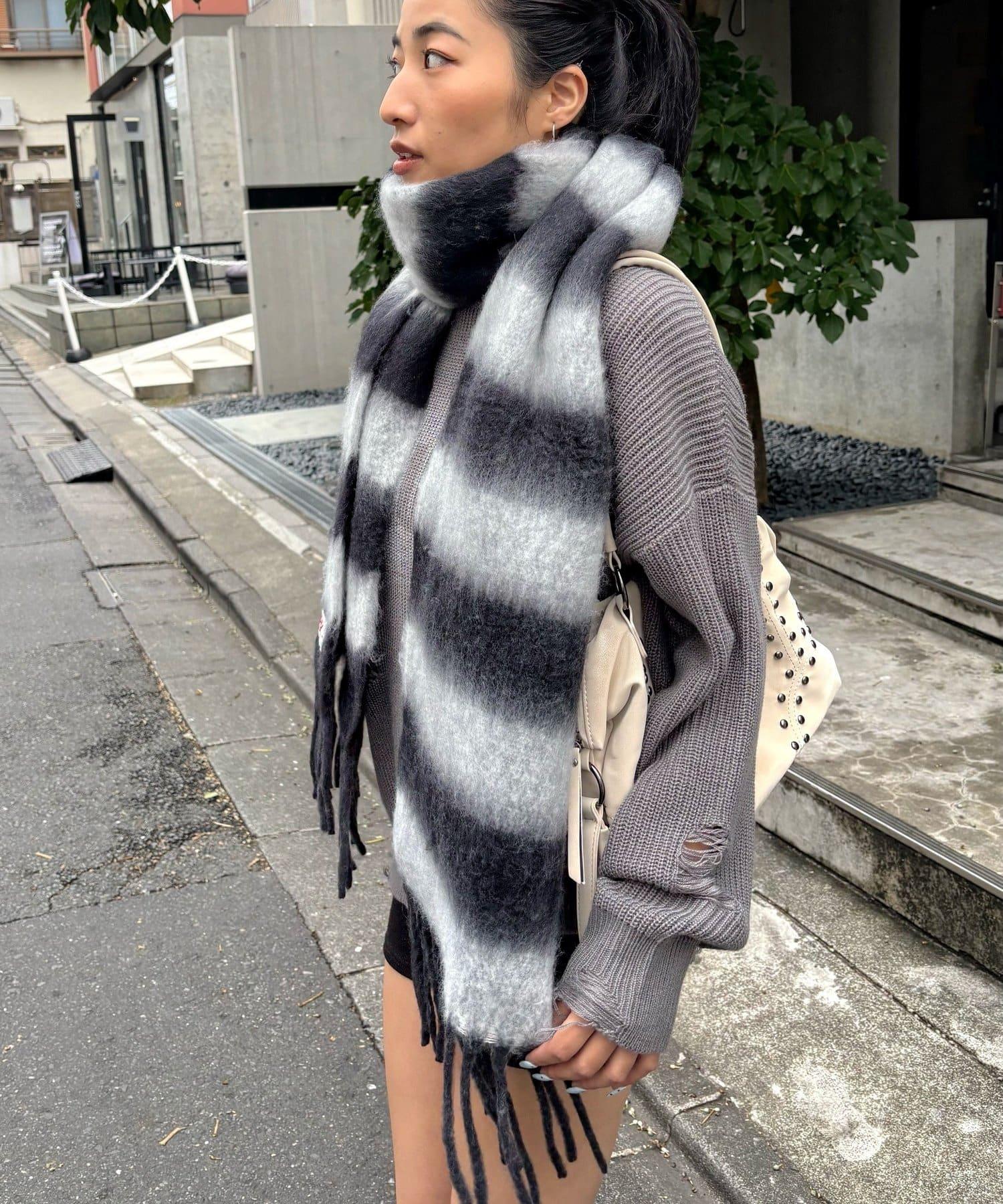 這款條紋圍巾的材質柔軟蓬鬆,是搭配造型的完美選擇。